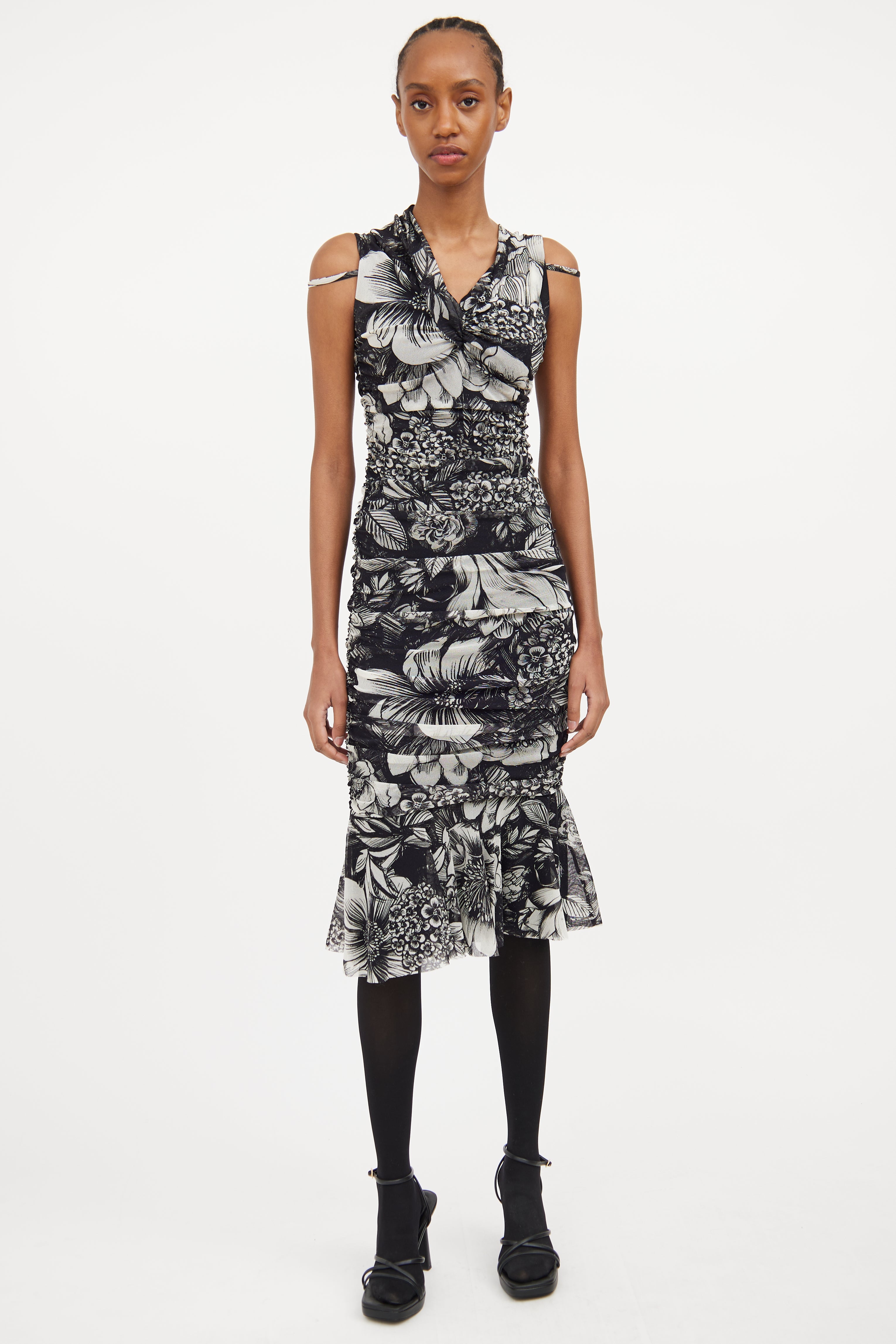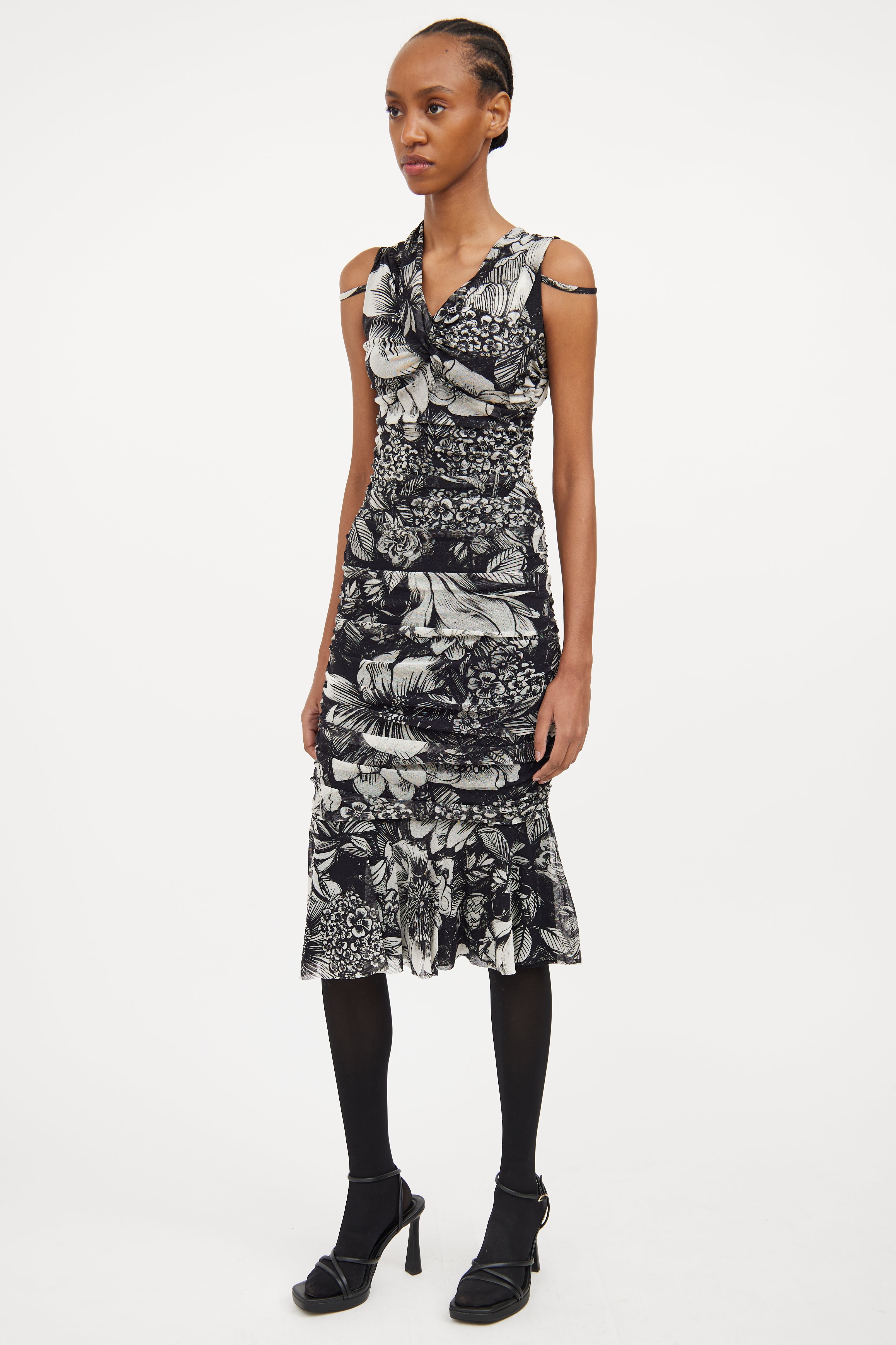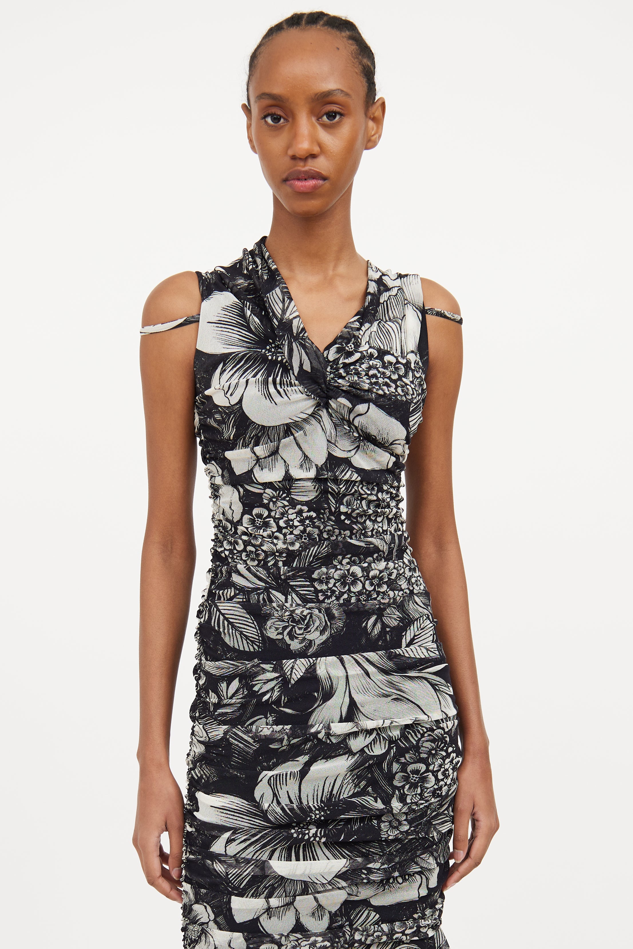 Pre-owned Fuzzi black mesh dress featuring a white floral pattern throughout, V-neckline, sleeveless styling, ruched detailing at sides, and flared hem. Lined.