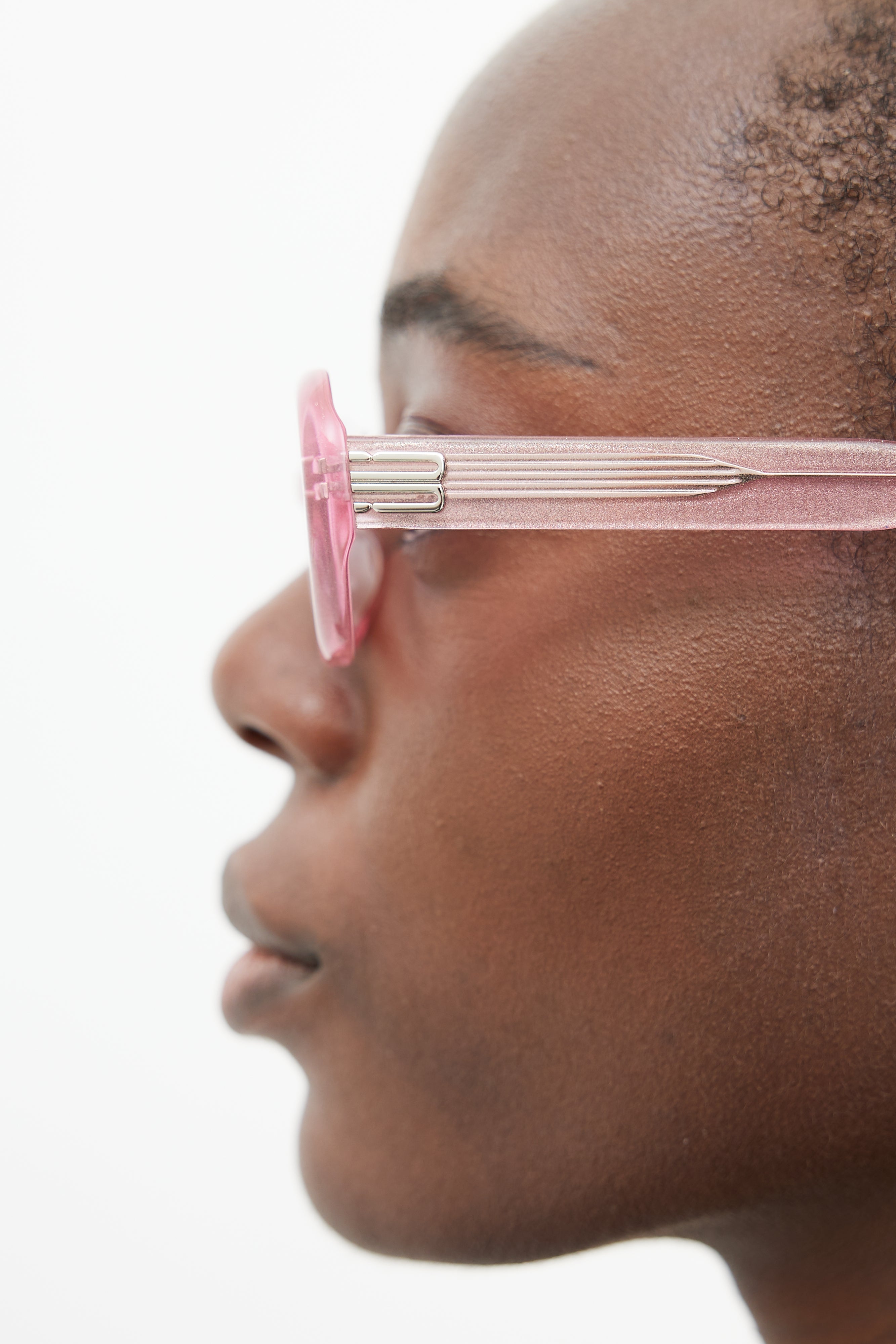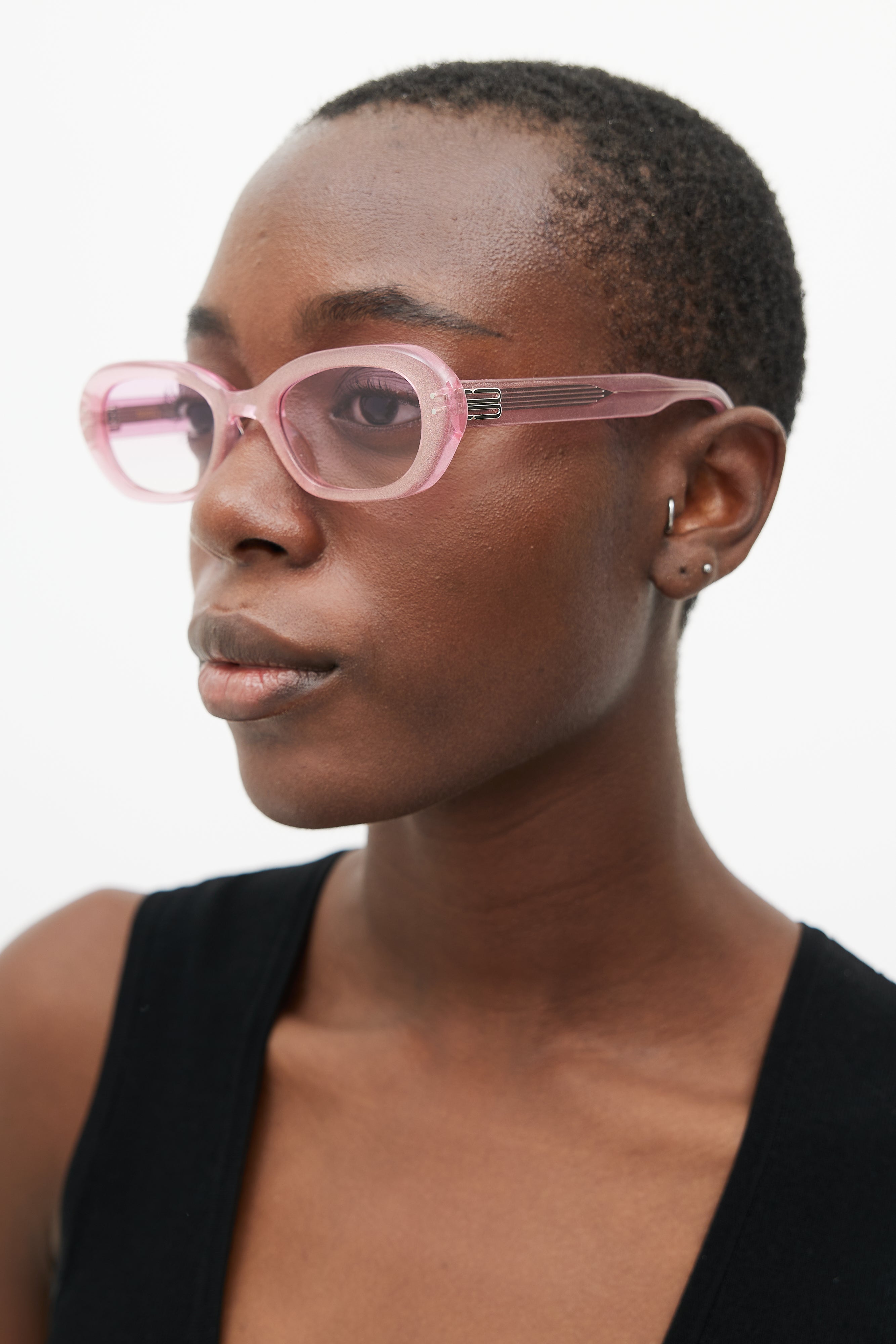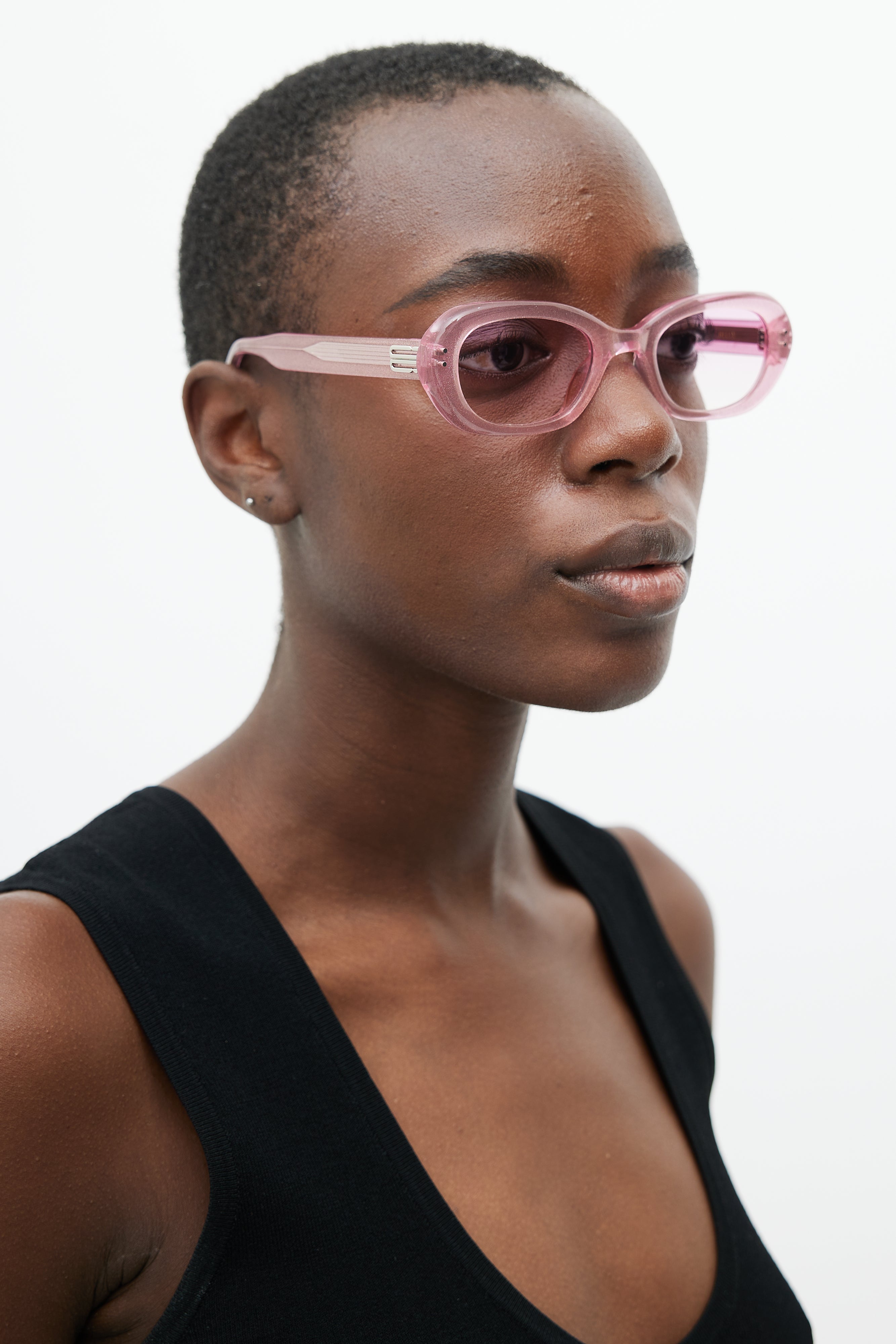 Pre-owned Gentle Monster pink Helix sunglasses featuring oval frame, nose saddle bridge, tonal lens, and gold tone logo at temple. Comes with original case and box.