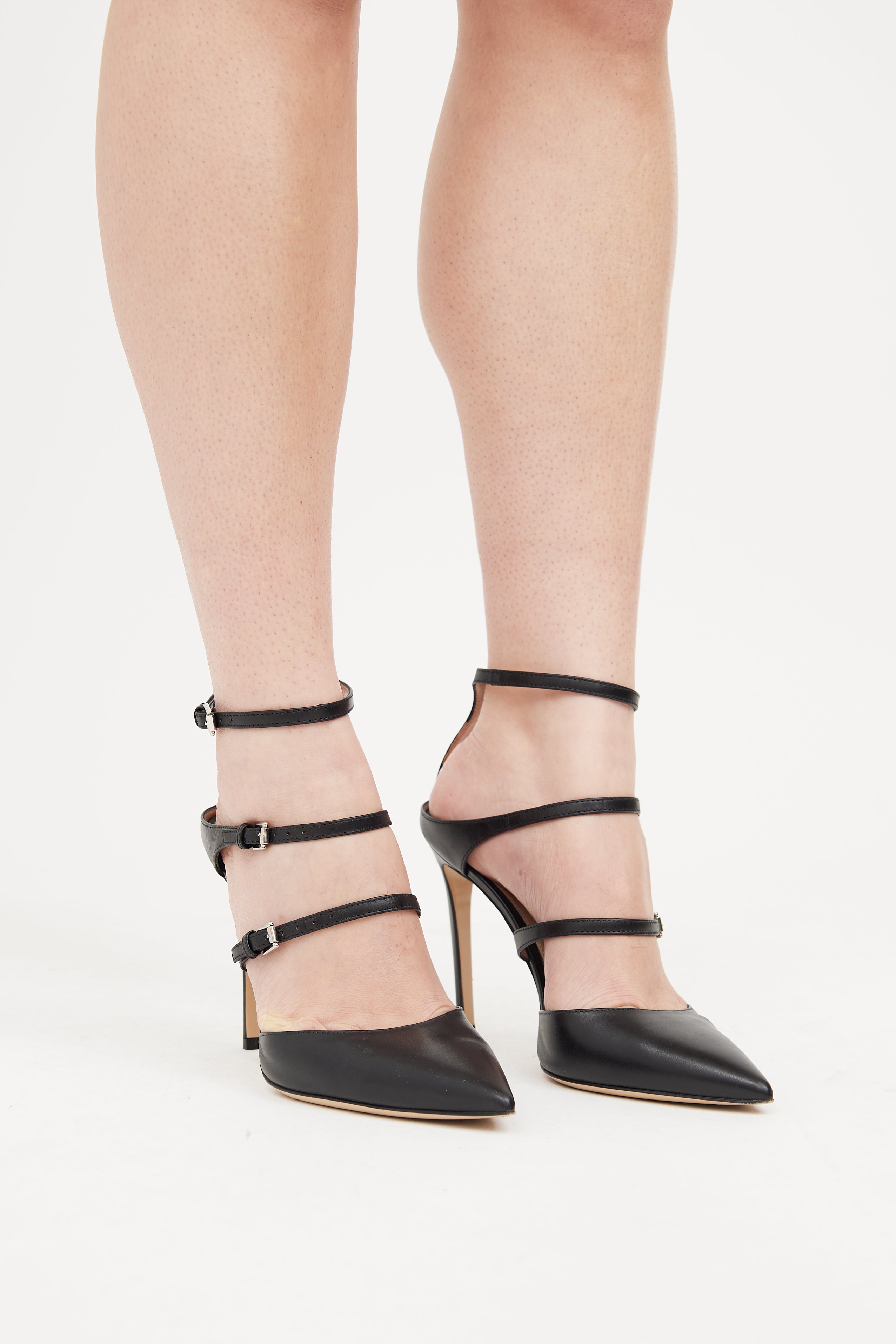 Pre-owned Gianvito Rossie black Carey pumps featuring pointed toe, three adjustable straps on upper with silver tone buckle and covered stiletto heel.