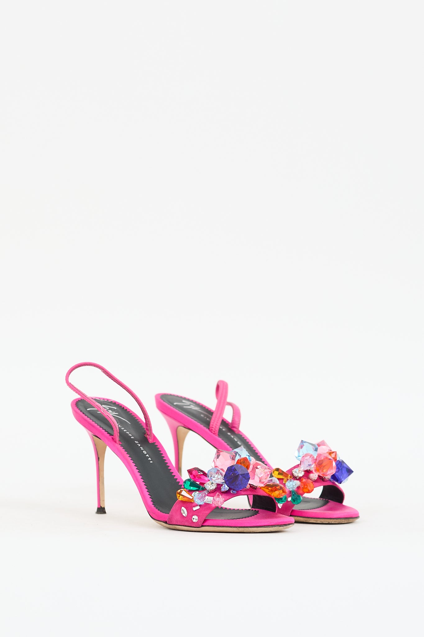 Pre-owned Giuseppe Zanotti fuchsia heels featuring an open rounded toe, satin upper, strap across vamp with multicolour crystal embellishments, elasticized slingback strap, thin leather covered continental heel, and leather insole and outsole. Comes with original dust bag.