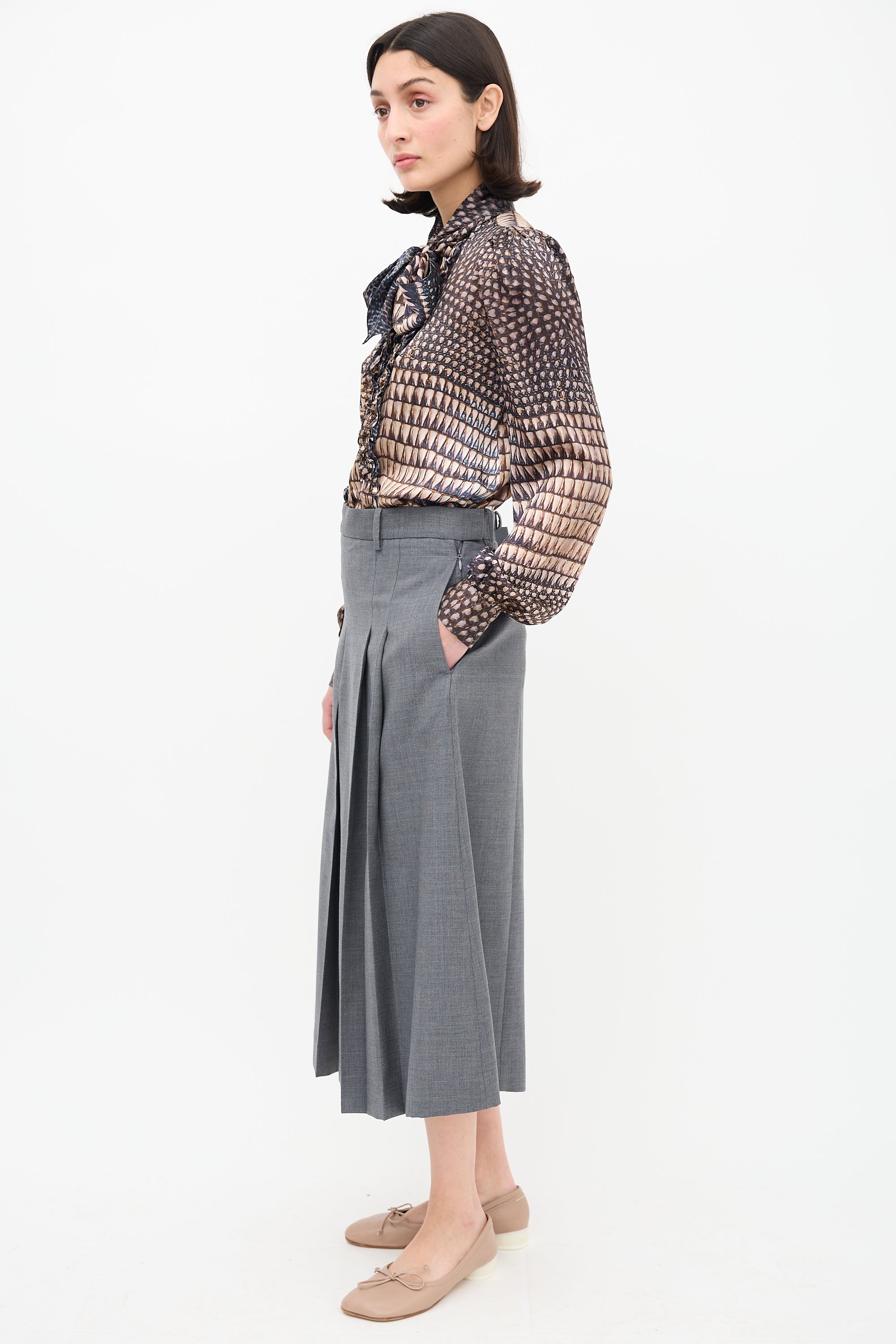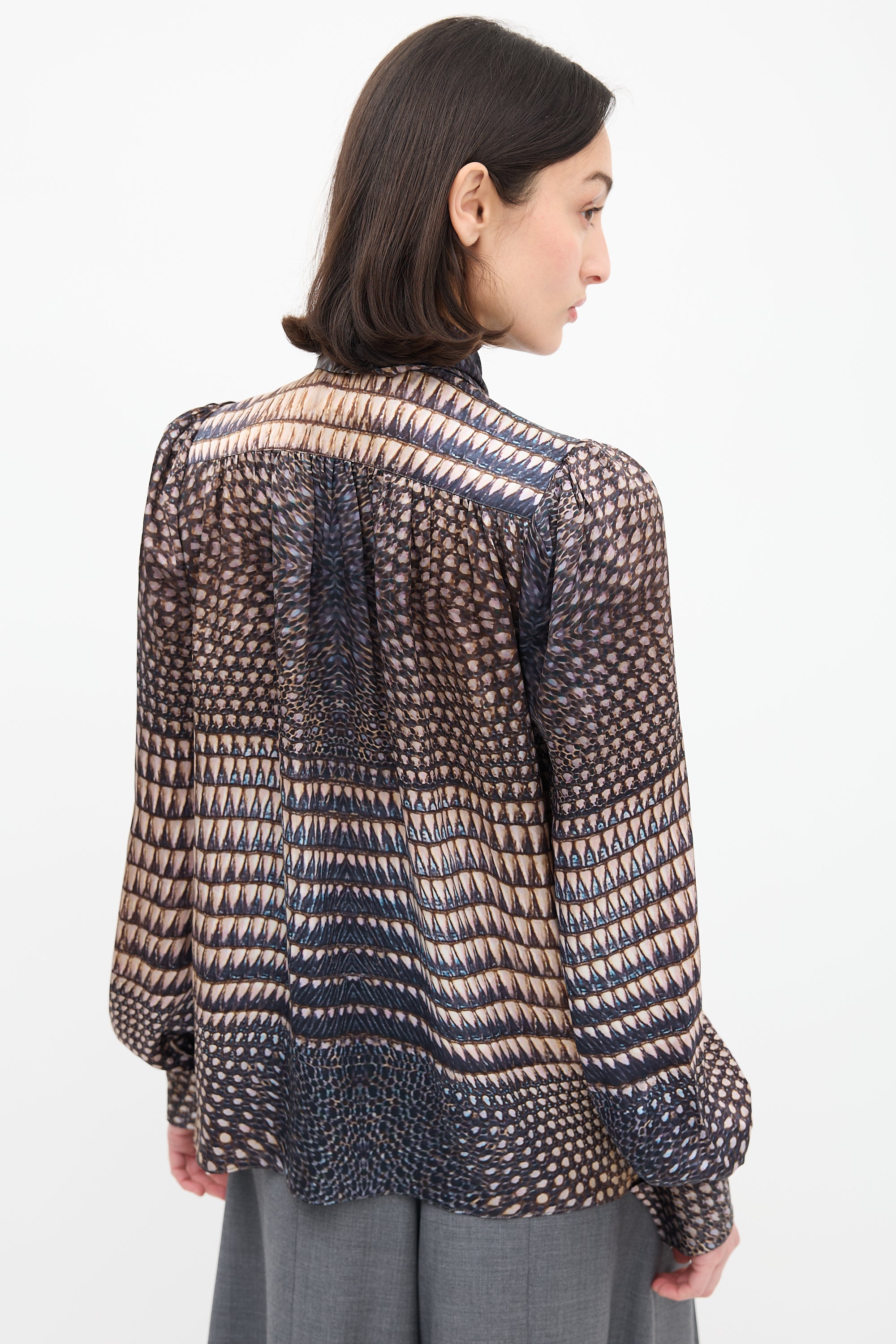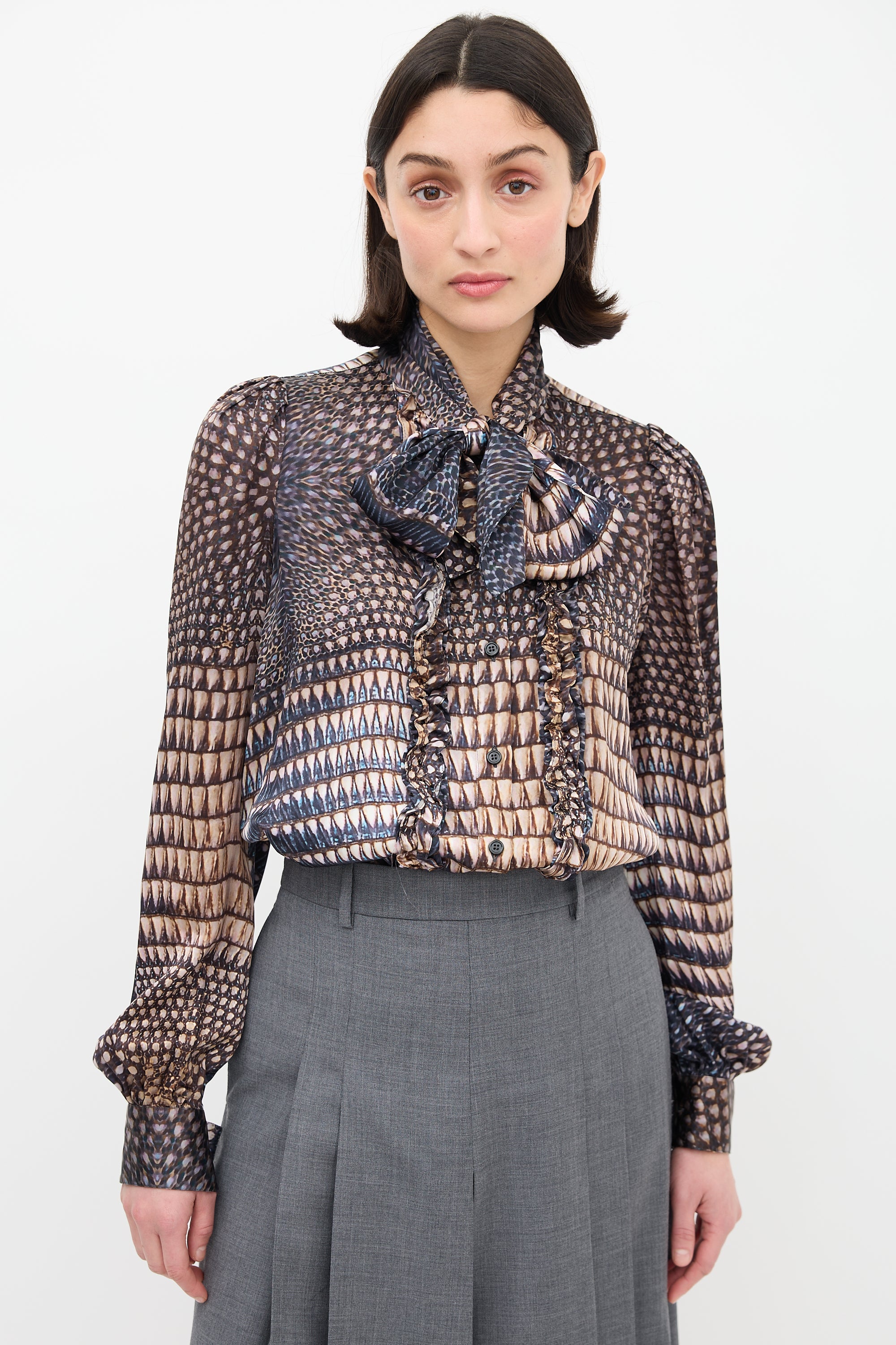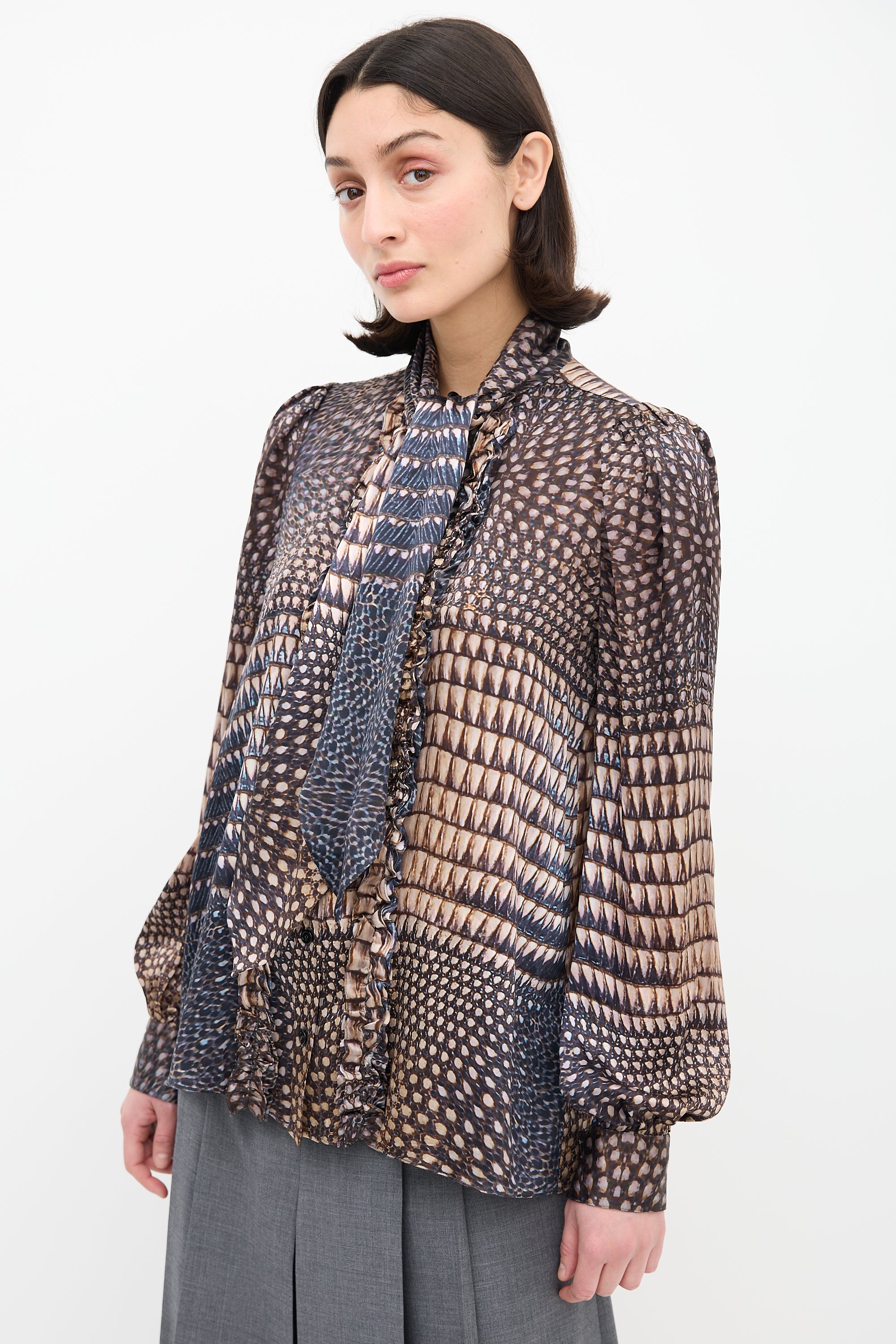 Pre-owned Givenchy beige and navy silk shirt featuring snakeskin print throughout, tie neck, button up front with ruffle paneling, and buttoned cuffs.