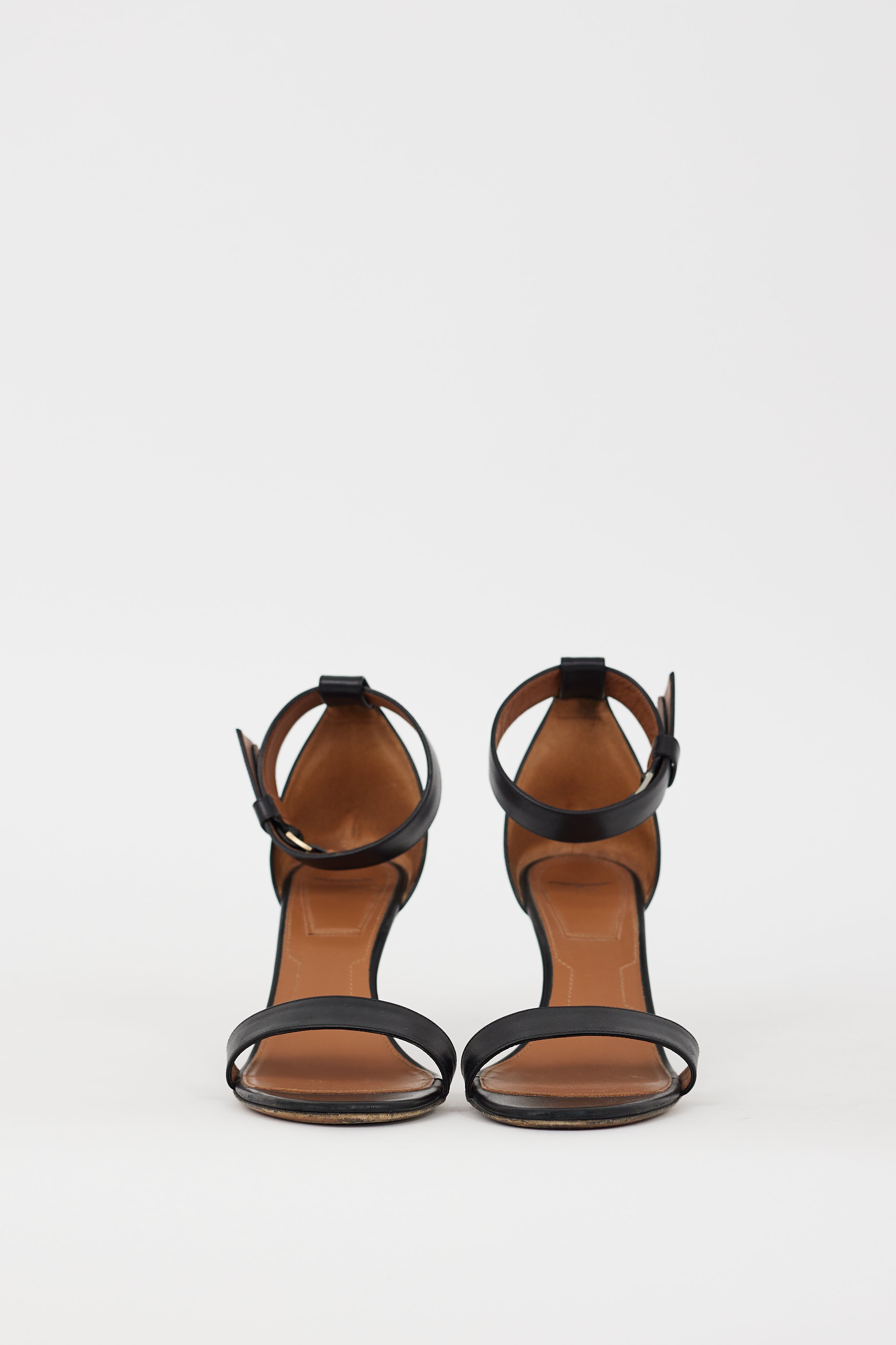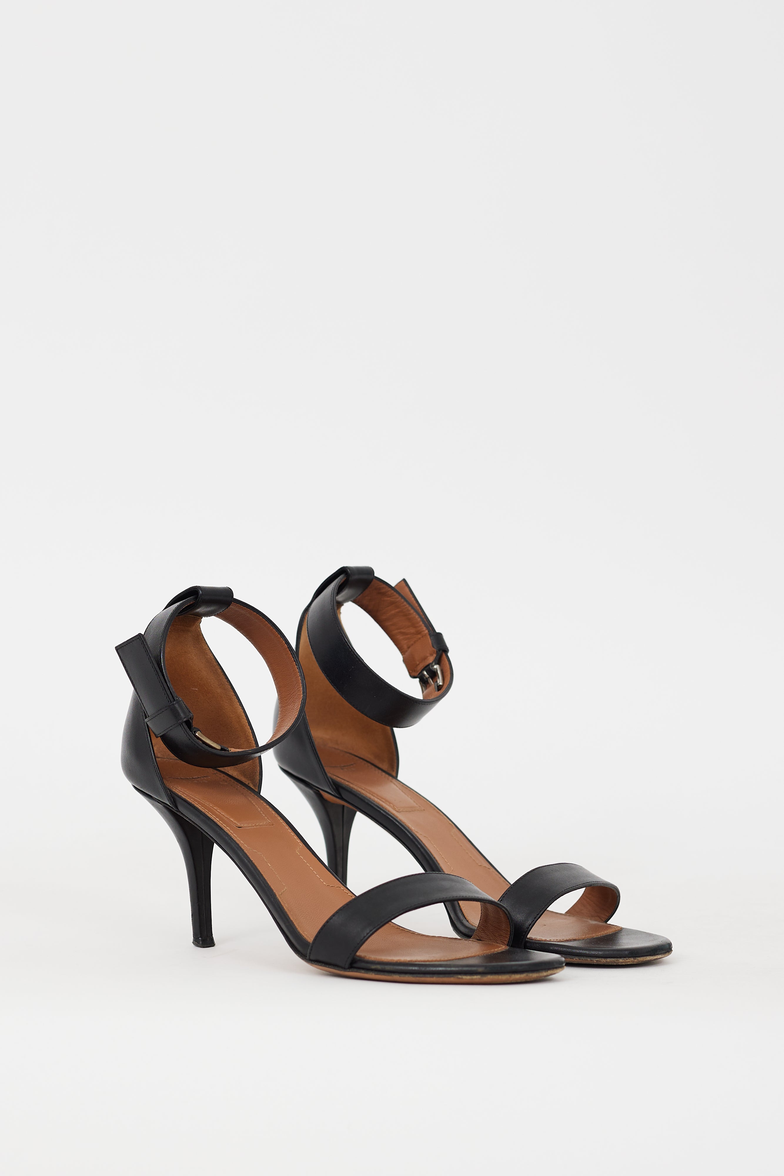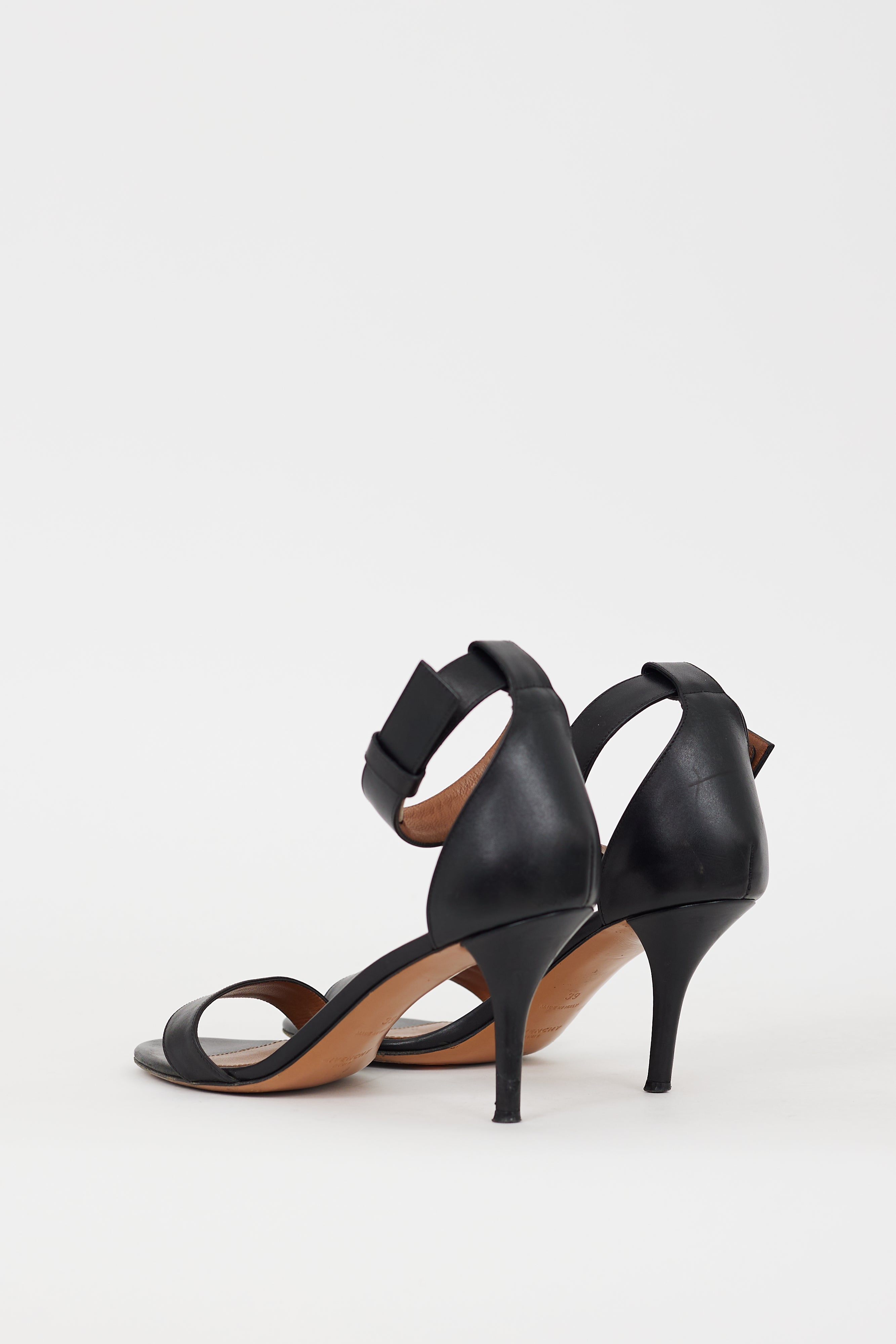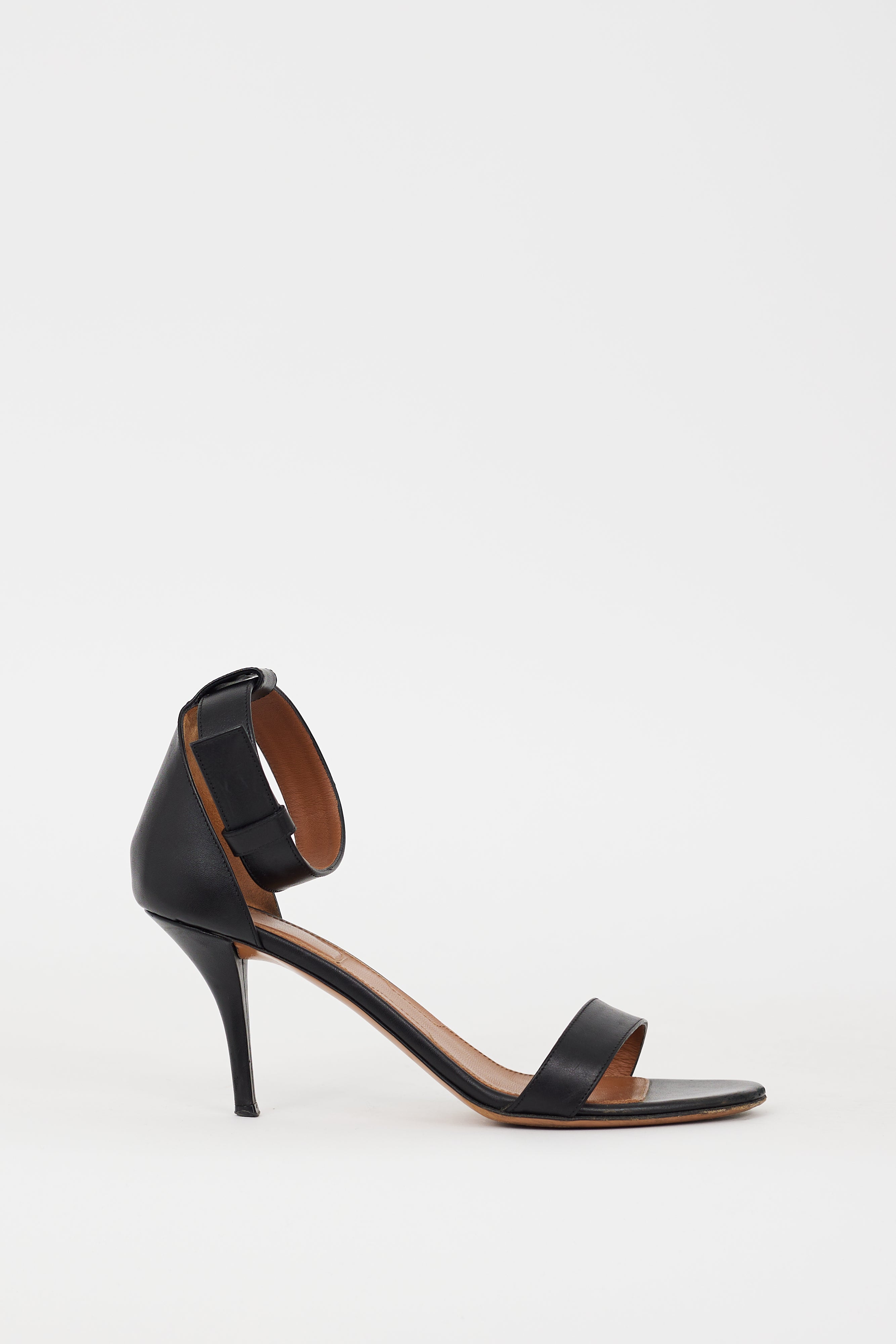 Pre-owned Givenchy black leather Infinity heels featuring open rounded toe, adjustable ankle strap, and covered heel. Comes with original dust bag.