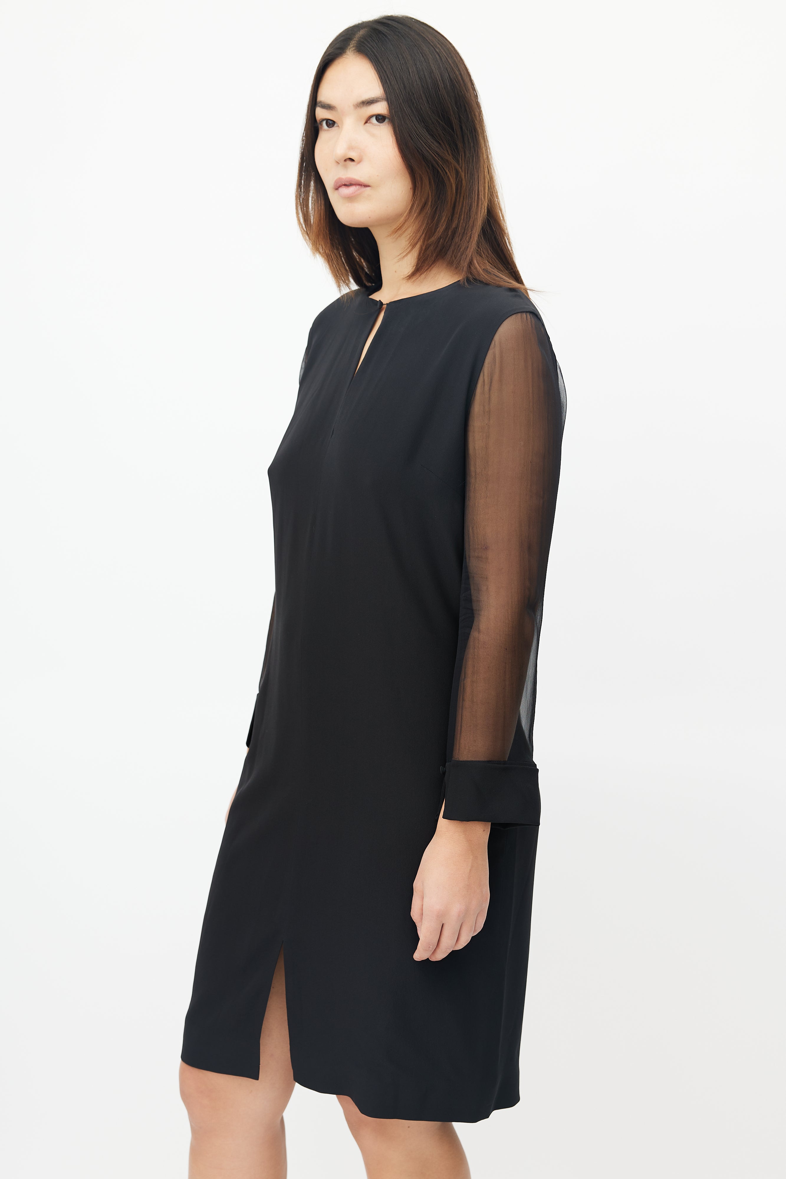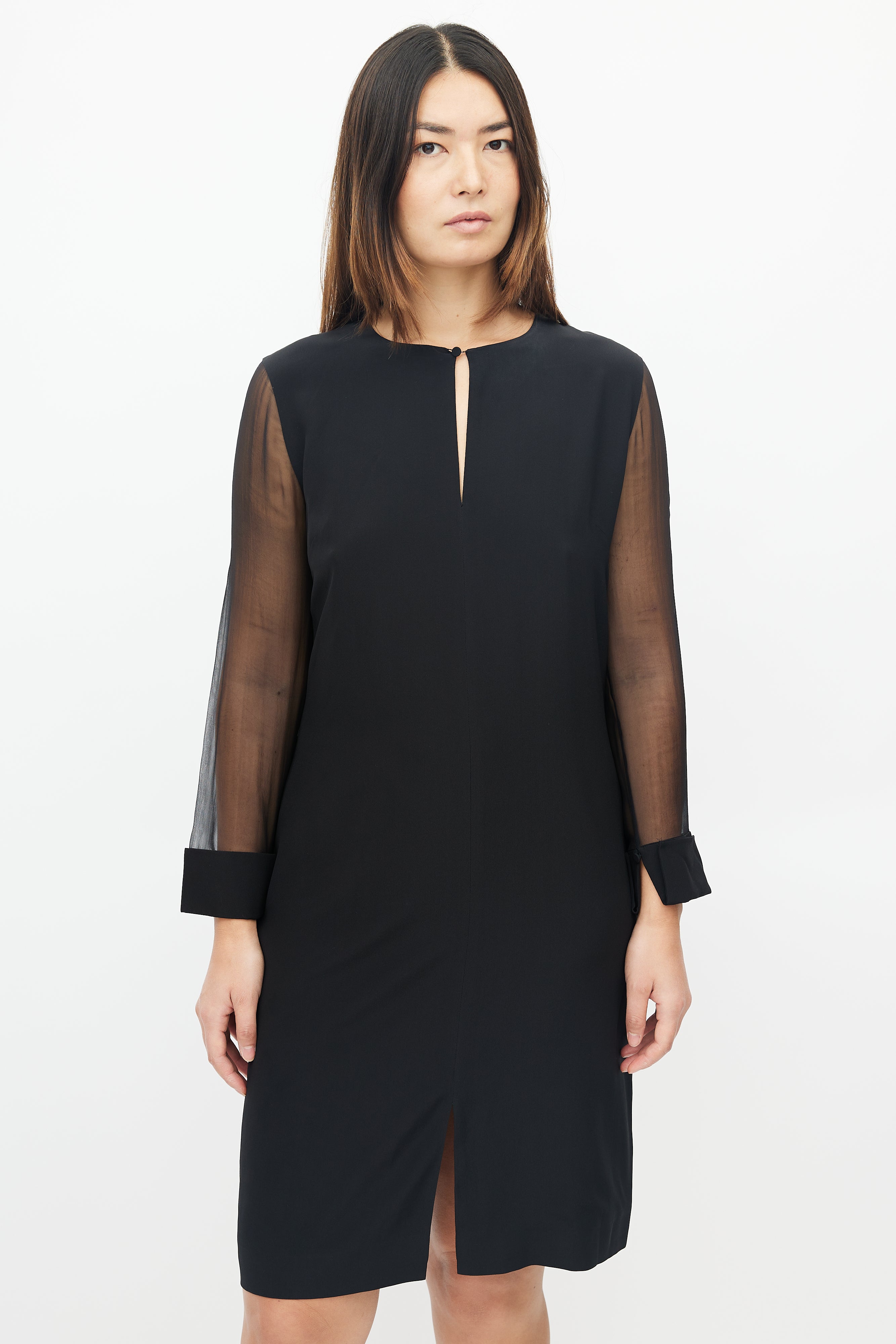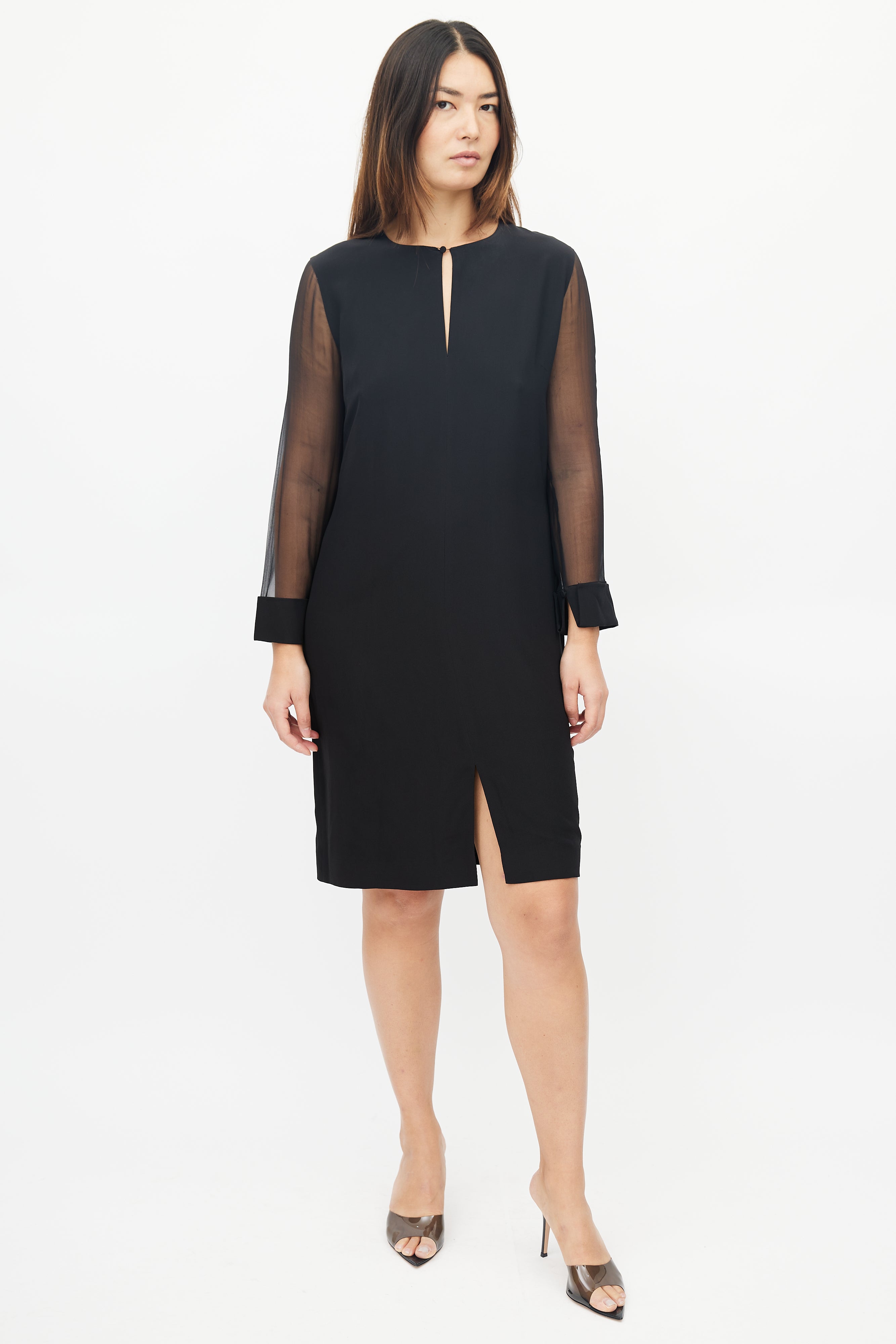 Pre-owned Givenchy black dress featuring keyhole neckline, concealed zip closure at back, and sheer long sleeves.