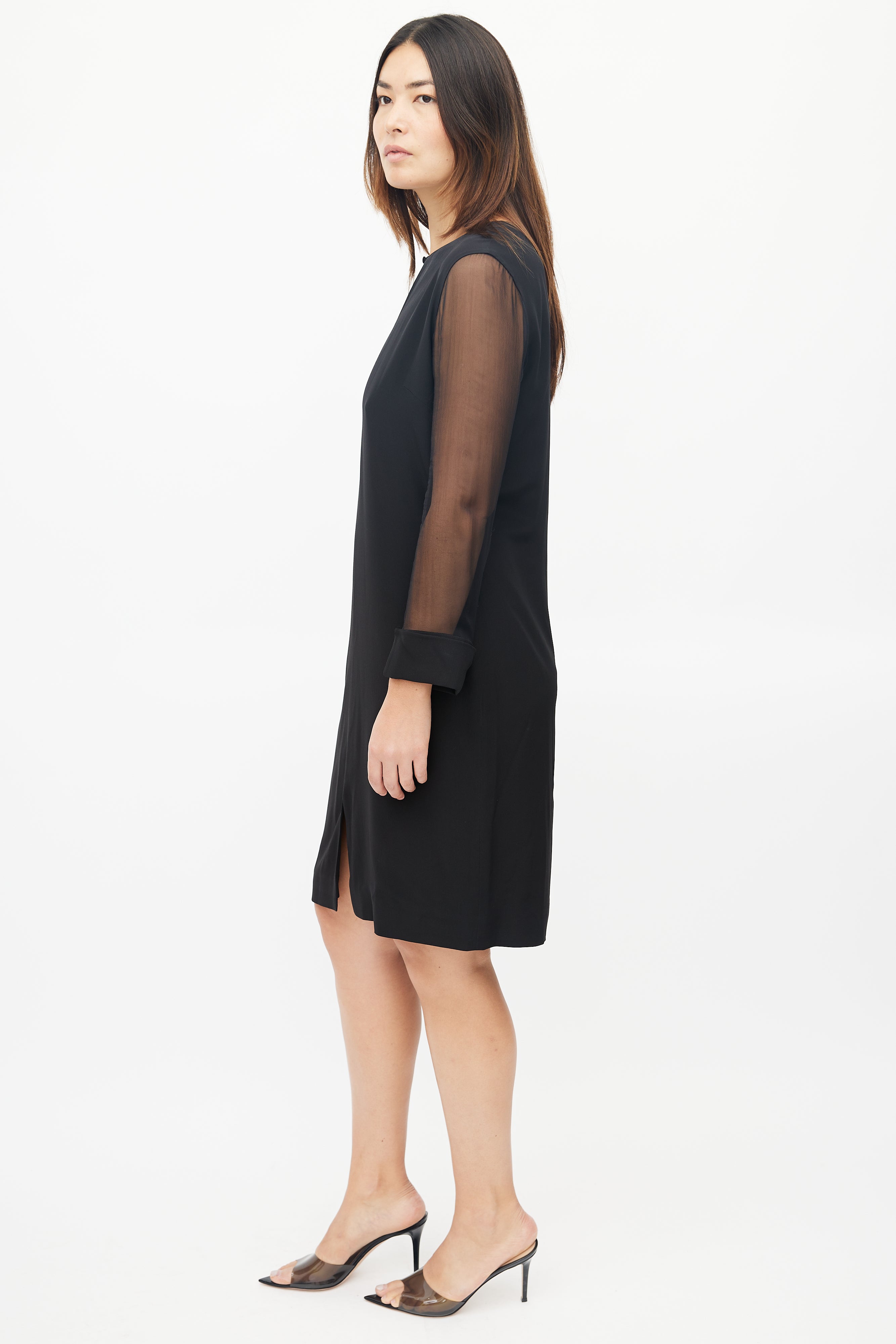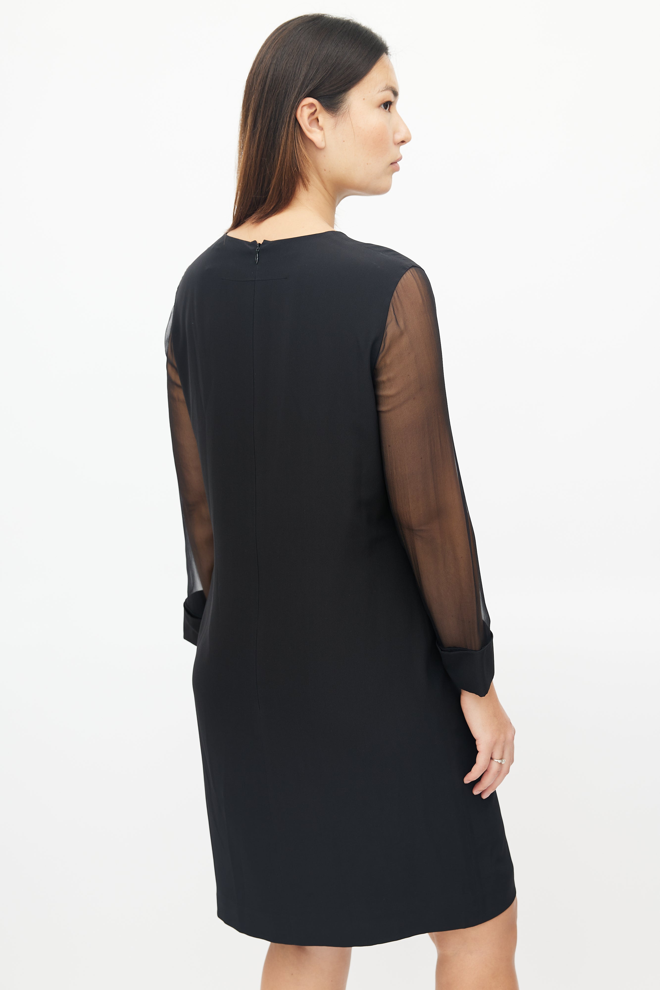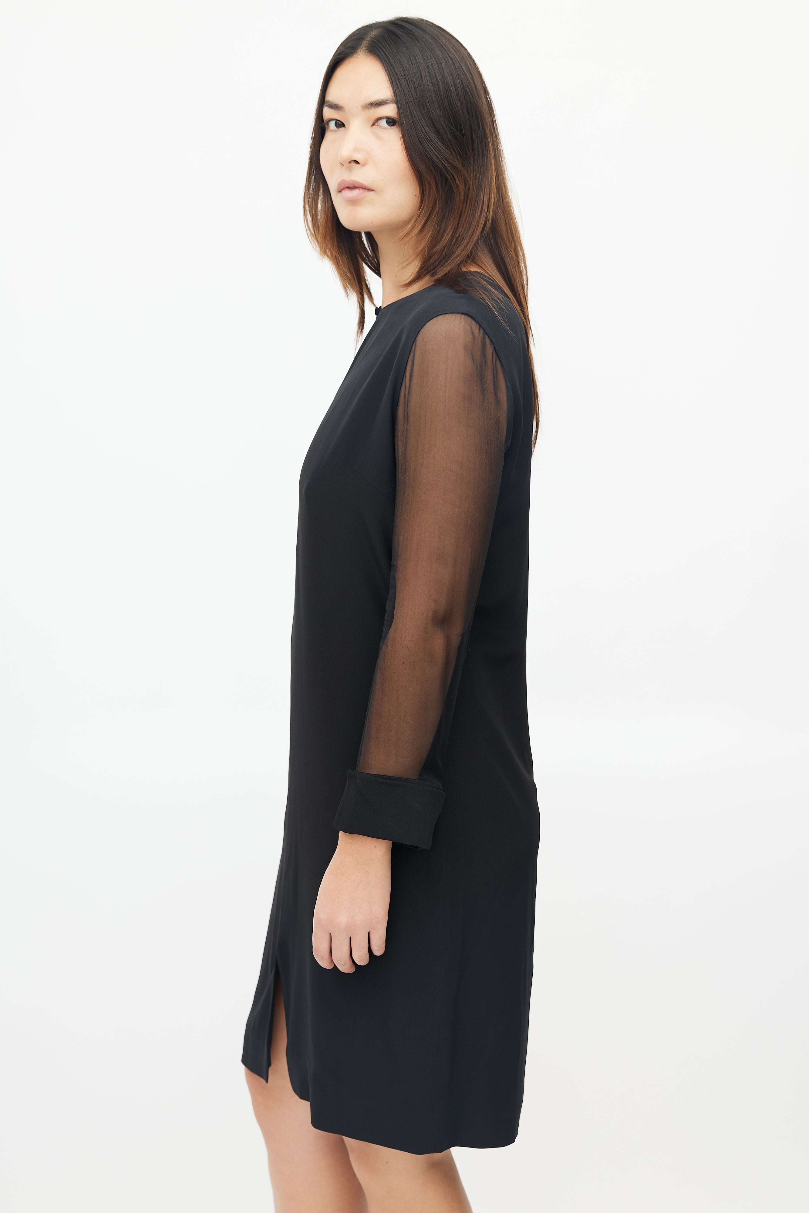 Pre-owned Givenchy black dress featuring keyhole neckline, concealed zip closure at back, and sheer long sleeves.