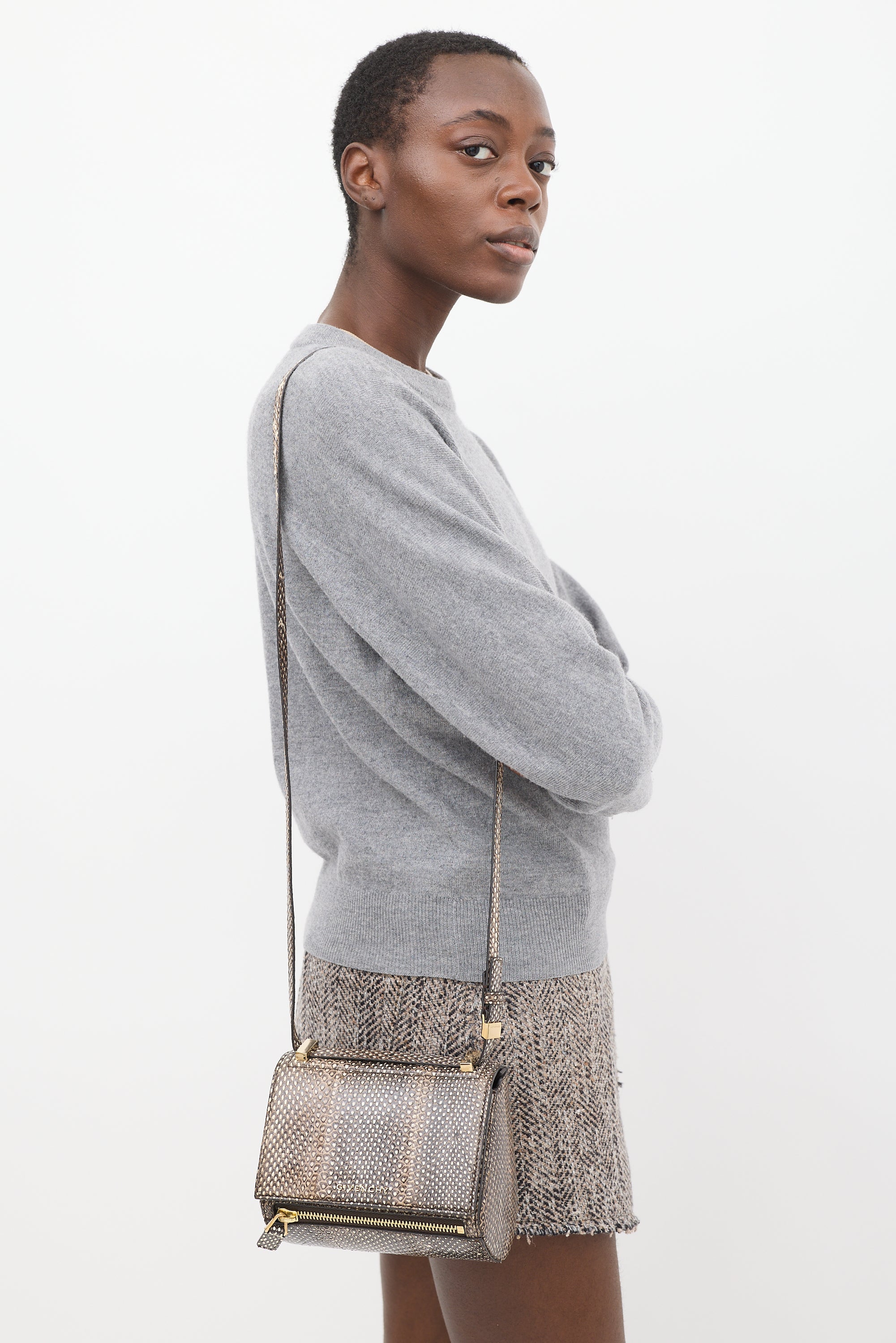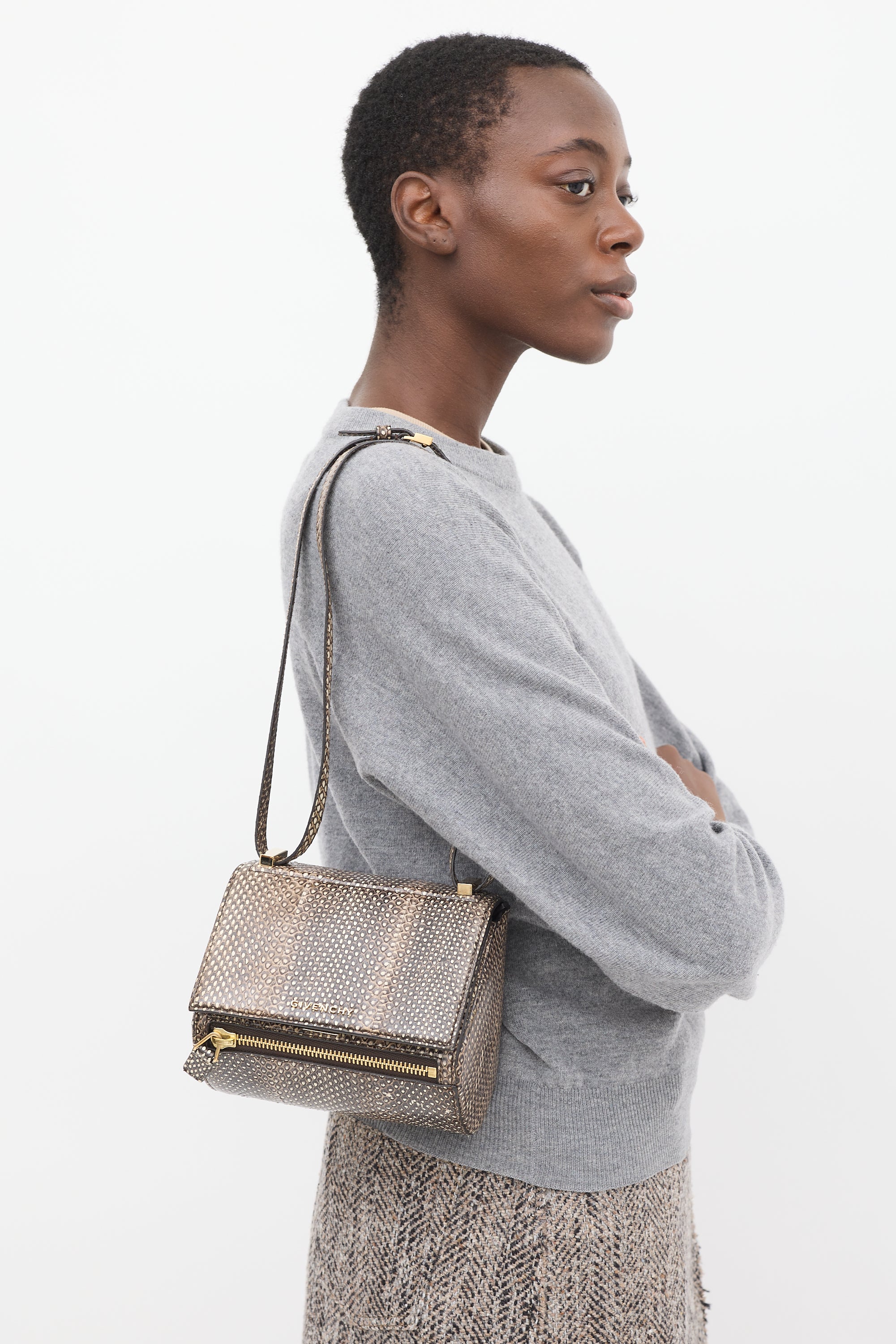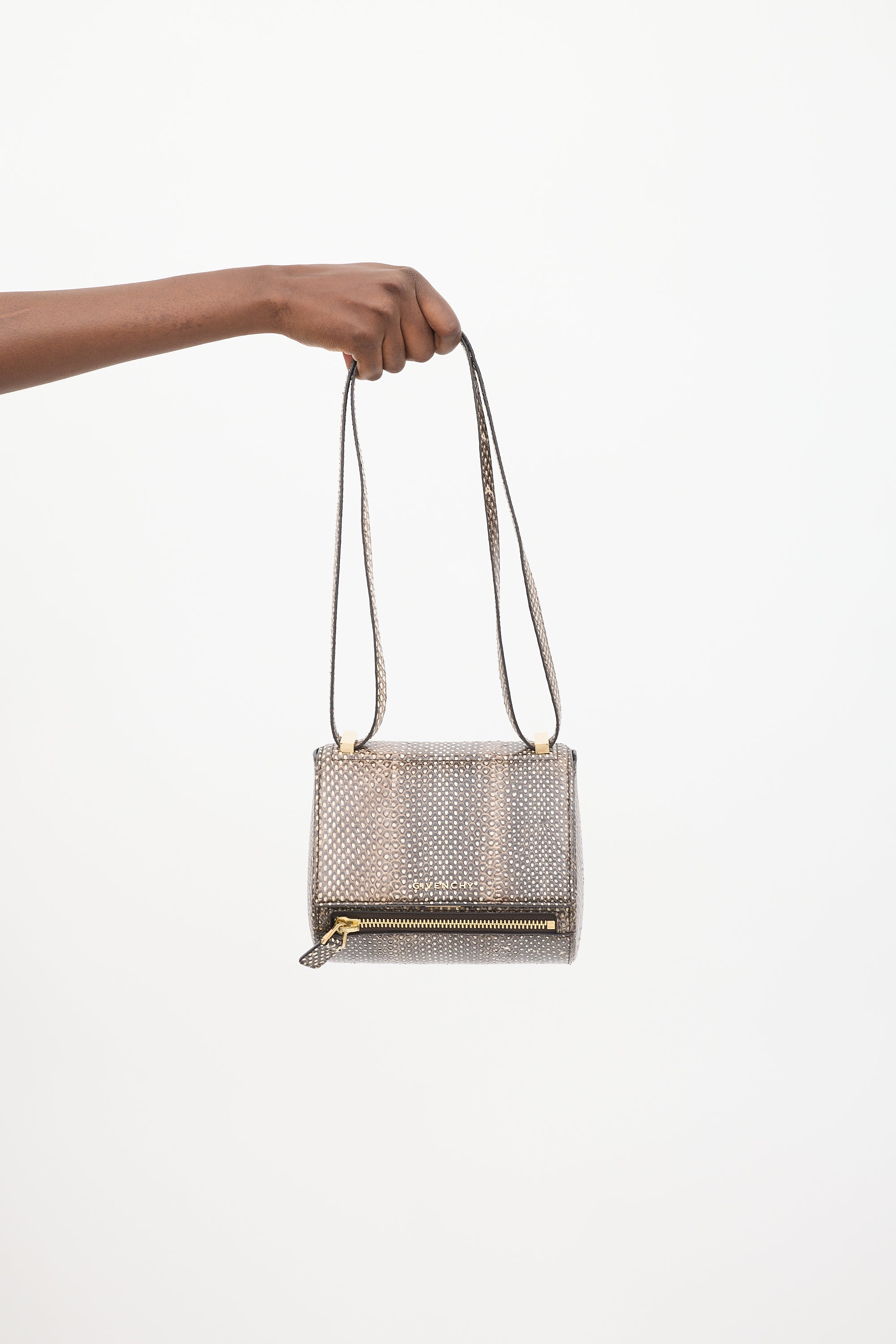 Pre-owned Givenchy brown python leather mini Pandora Box crossbody bag featuring tonal stitching, pale gold tone hardware, structured body, adjustable shoulder strap, one front exterior zip pocket, front flap with logo hardware, push lock closure, and one lined main compartment with single zip pocket. Comes with original dust bag.