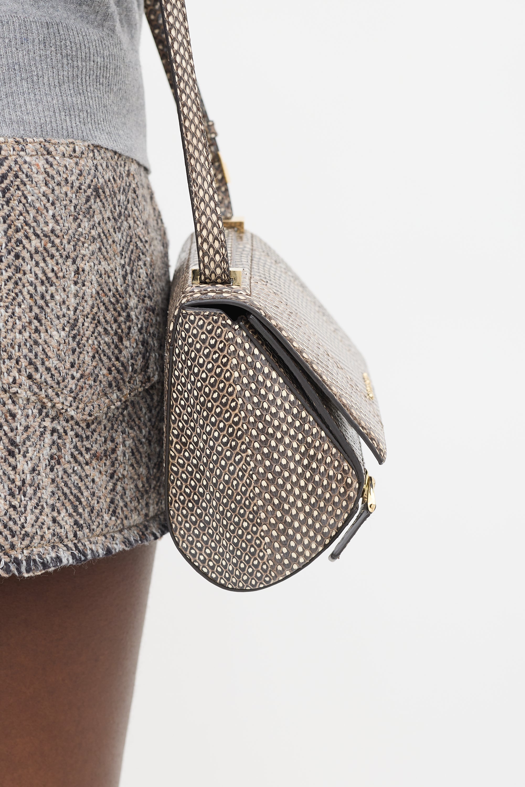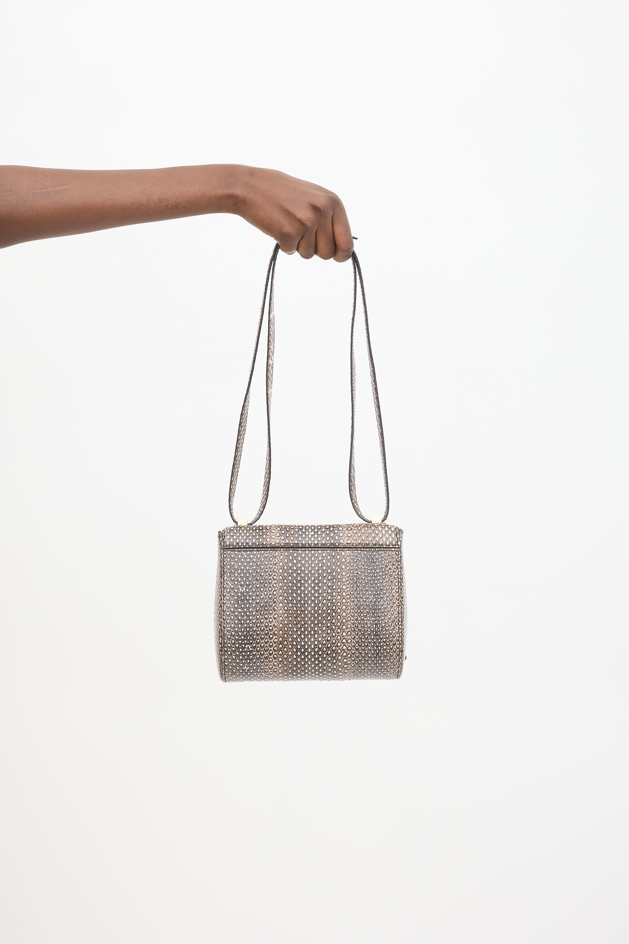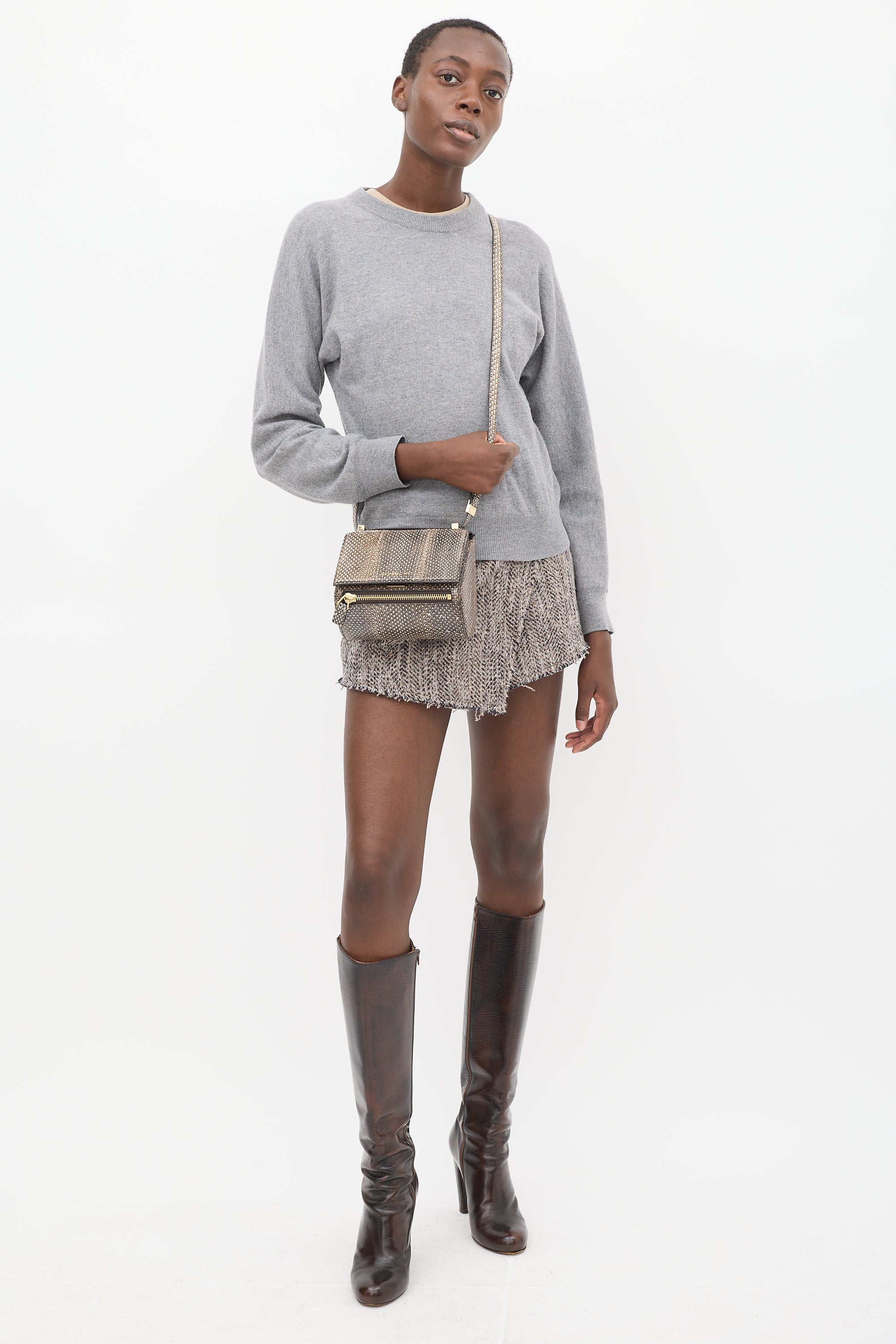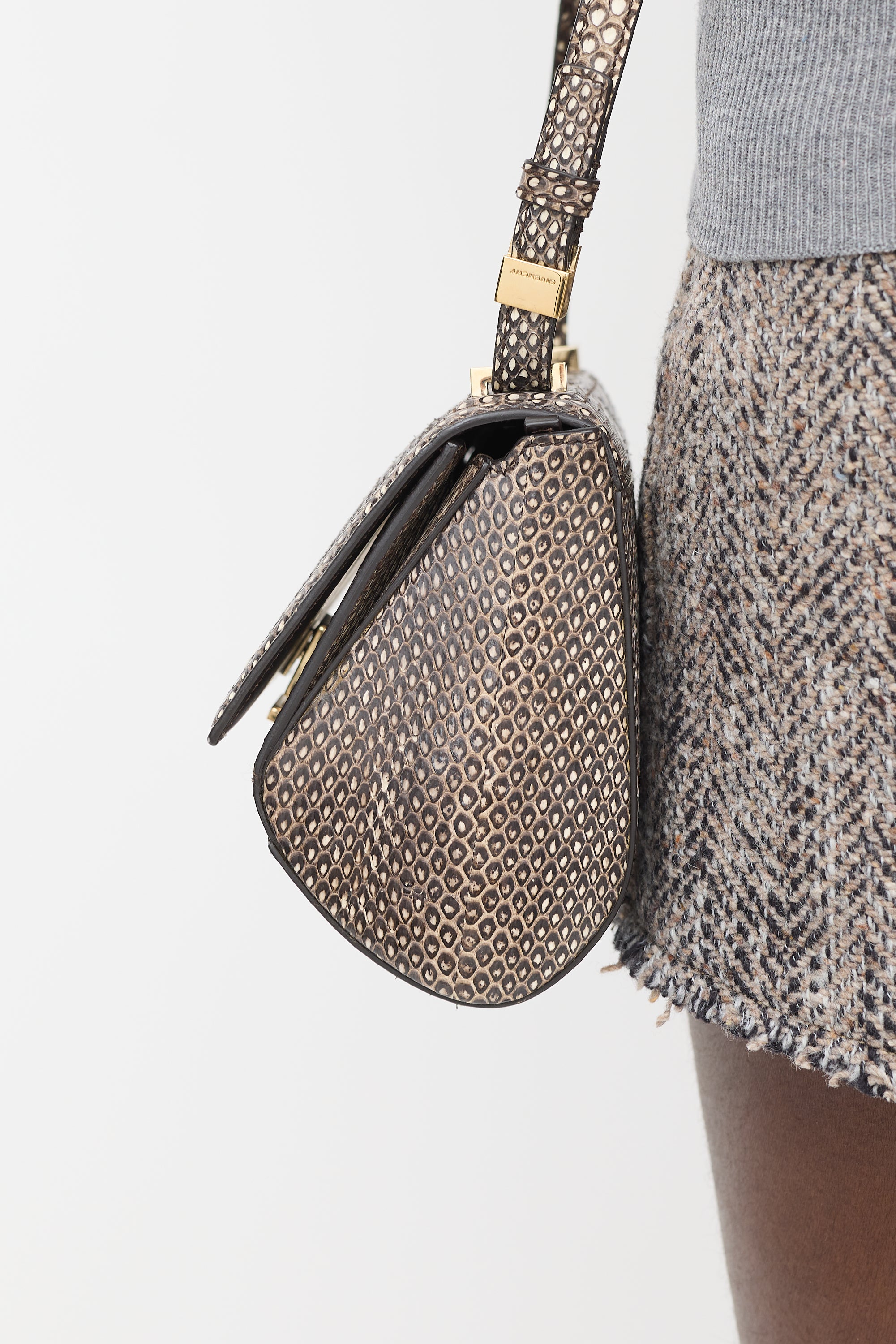 Pre-owned Givenchy brown python leather mini Pandora Box crossbody bag featuring tonal stitching, pale gold tone hardware, structured body, adjustable shoulder strap, one front exterior zip pocket, front flap with logo hardware, push lock closure, and one lined main compartment with single zip pocket. Comes with original dust bag.