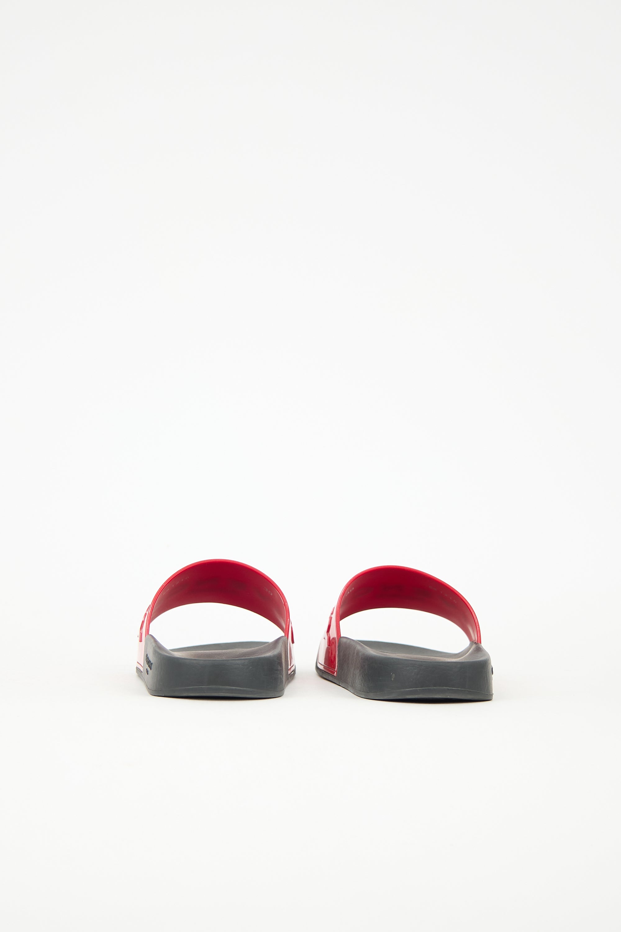 Pre-owned Givenchy red rubber slides featuring open rounded toe and debossed logo at front. Includes original dust bag.