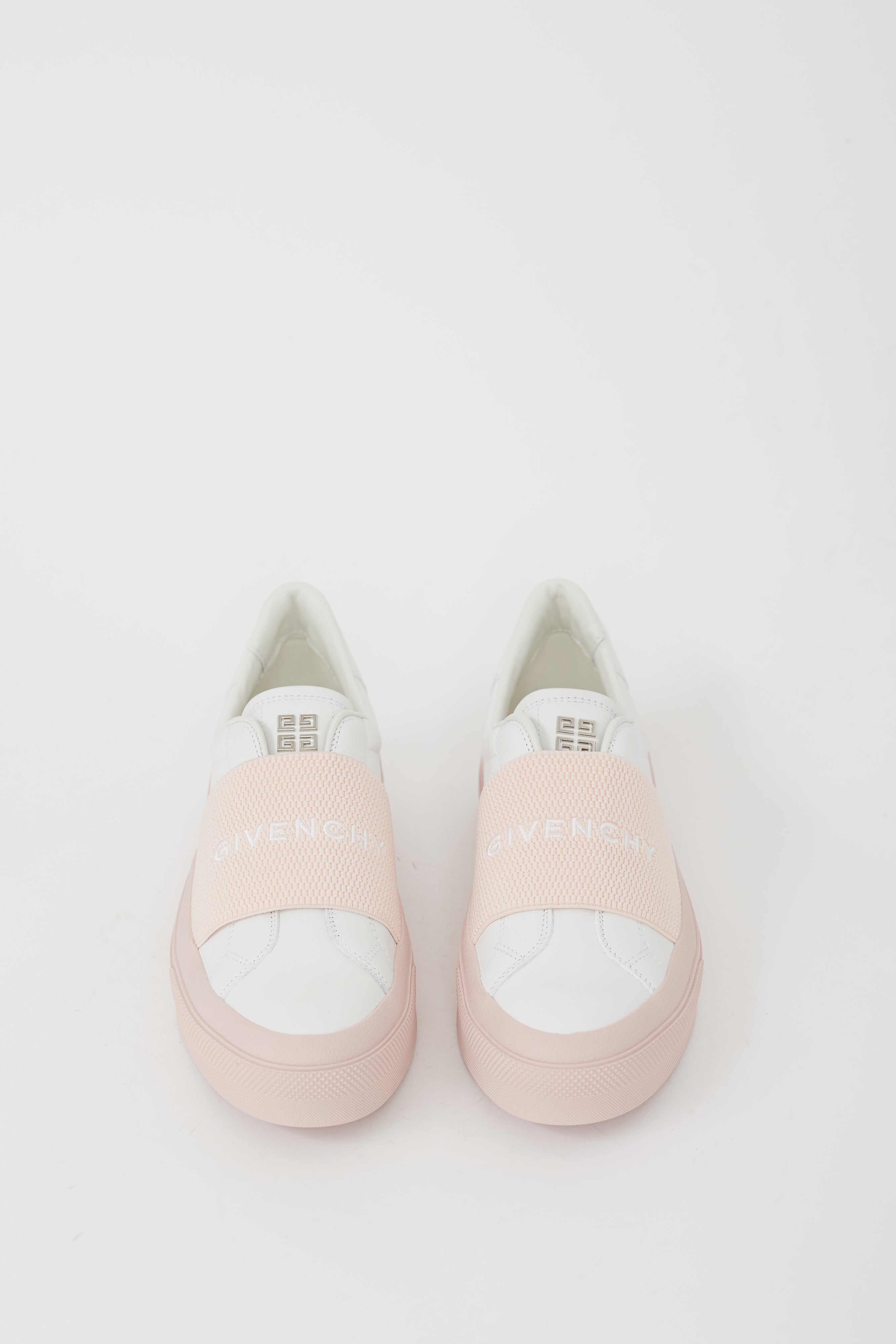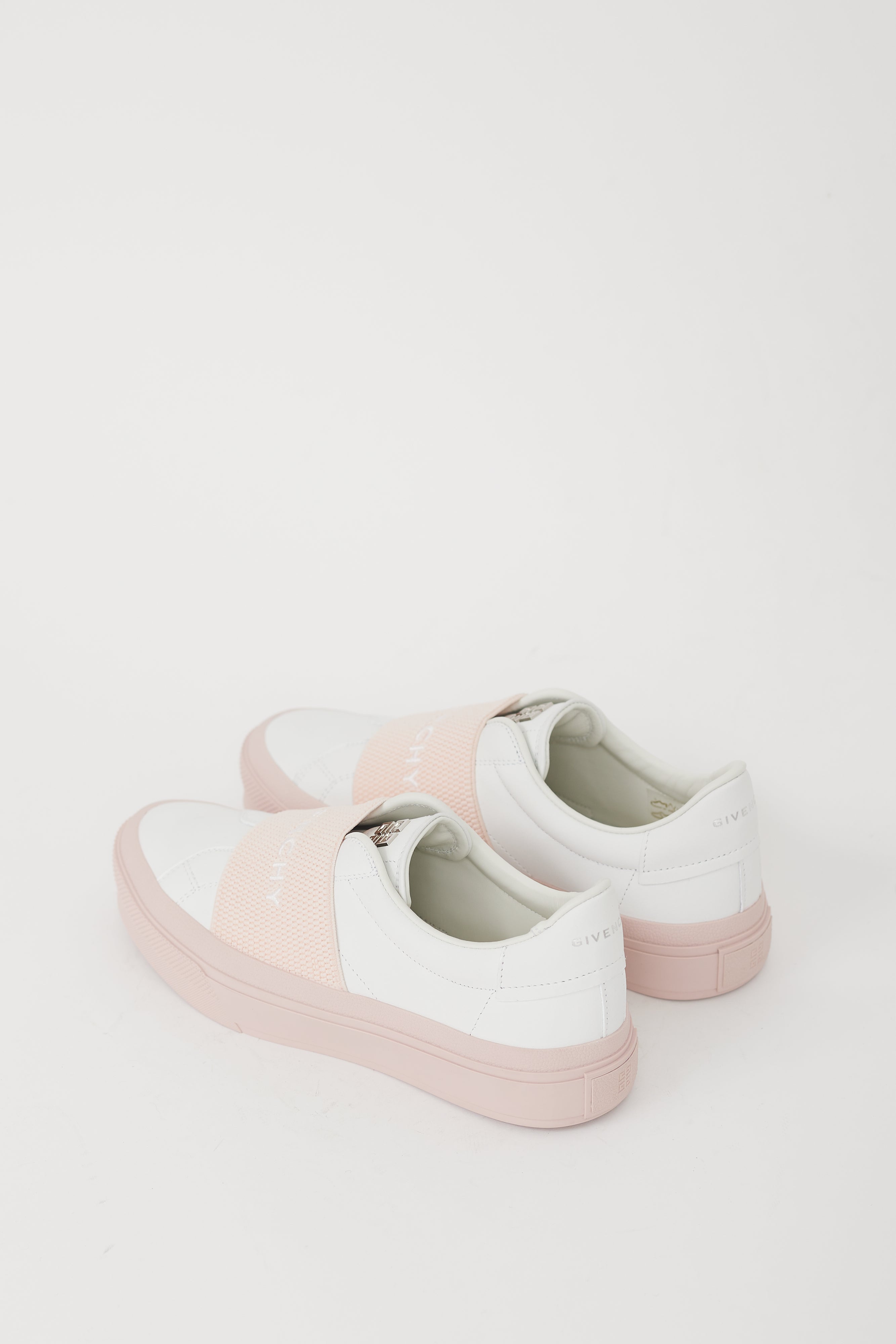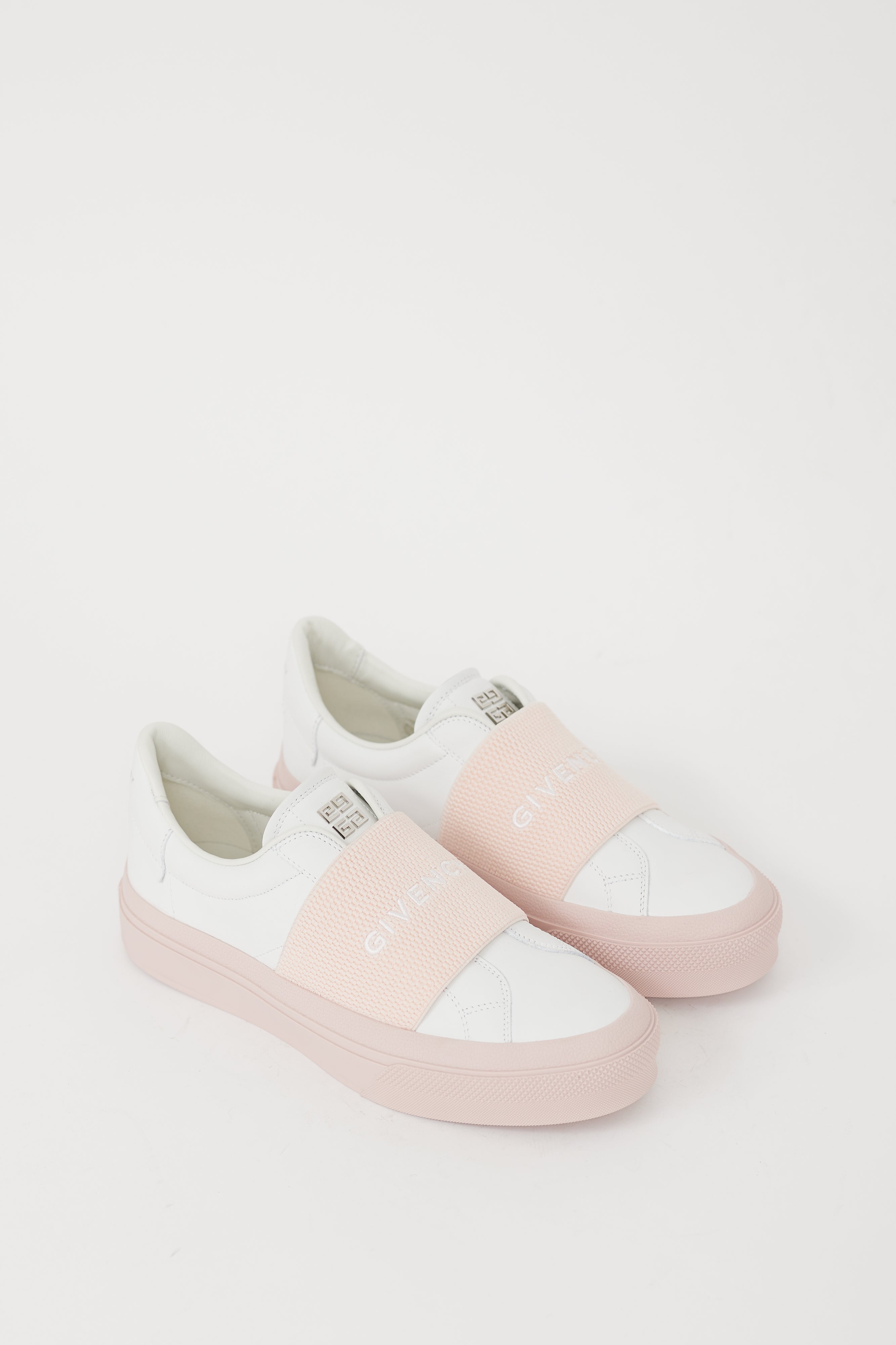Givenchy white and pink leather City Sport sneakers featuring rounded toe, wide textured elastic band with embroidered logo at vamp, silver logo at tongue, silver stamped logo at back, tonal stitching throughout, and slip on entry. Comes with box and dustbag.