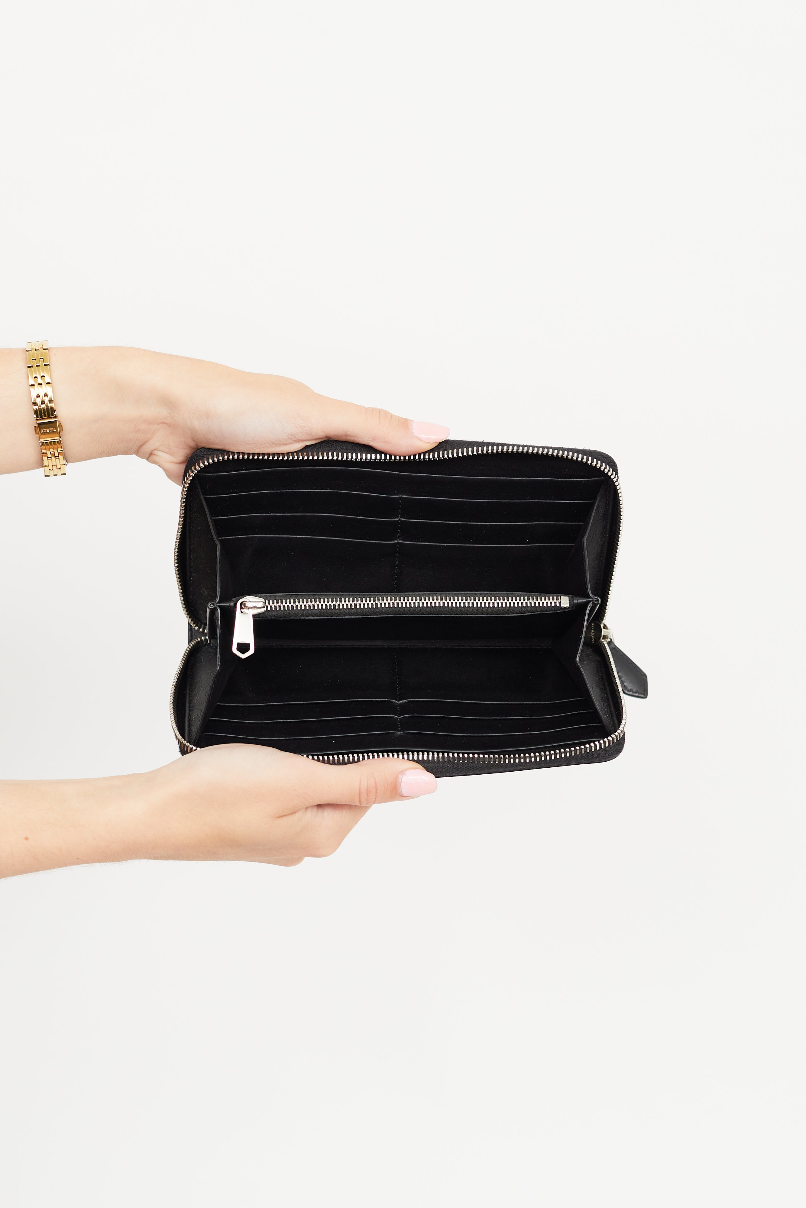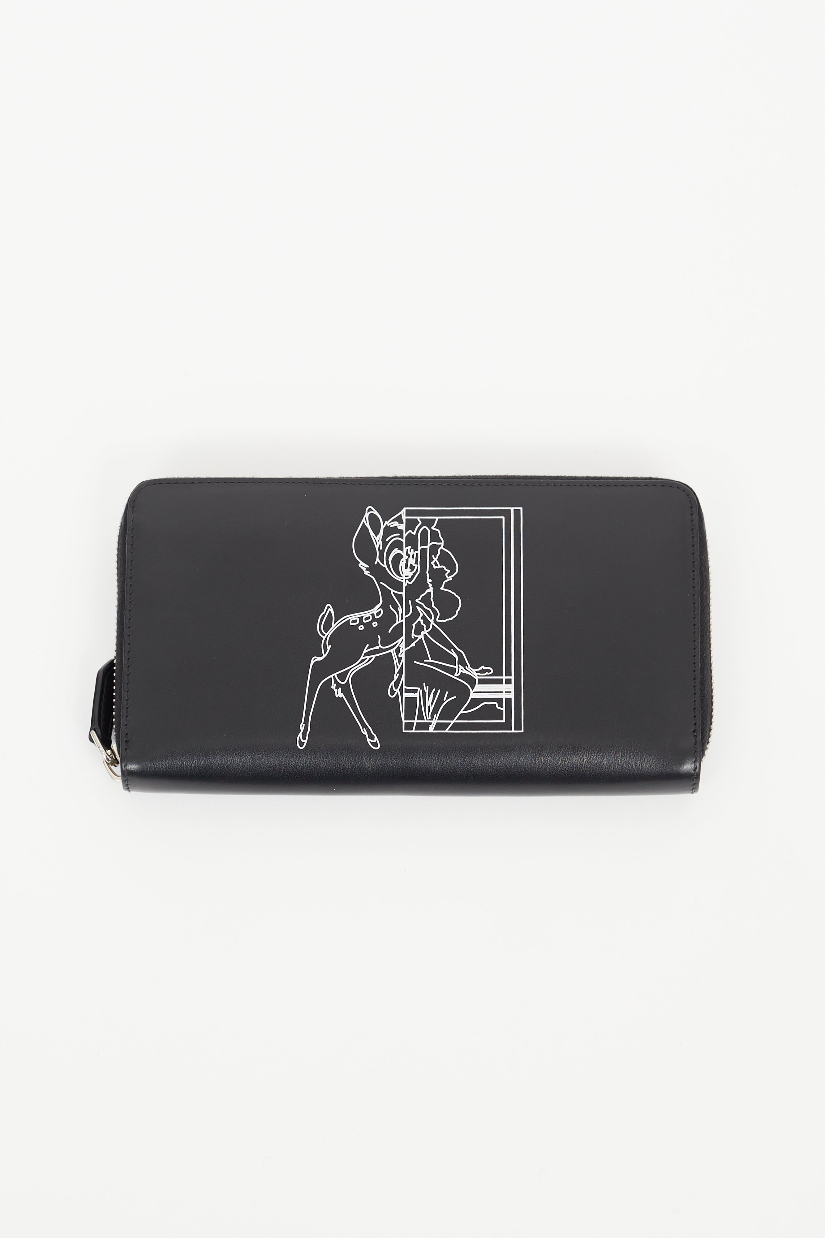 Pre-owned Givenchy x Disney black wallet featuring white Bambi print at face, zip closure, embossed logo at back, two main compartment, one zip pocket, two slip pockets, and multiple card slots. Comes with original dust bag and box.