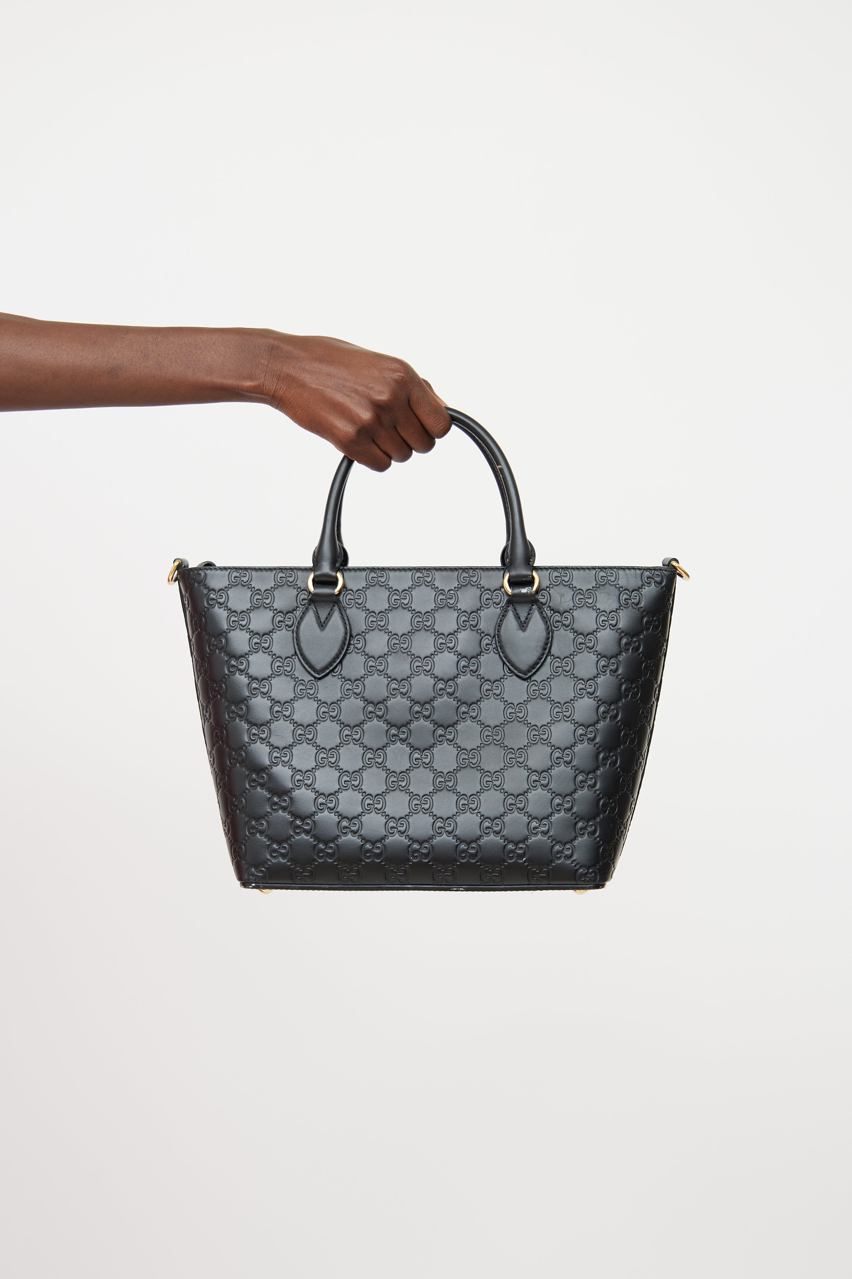 Pre-owned Gucci black Guccissima zip tote bag featuring dual rolled top handles, adjustable removeable shoulder strap, gold tone hardware, monogram print throughout, protective feet on bottom and zip closure top. Suede lined main compartment, two card slots and one zip pocket.