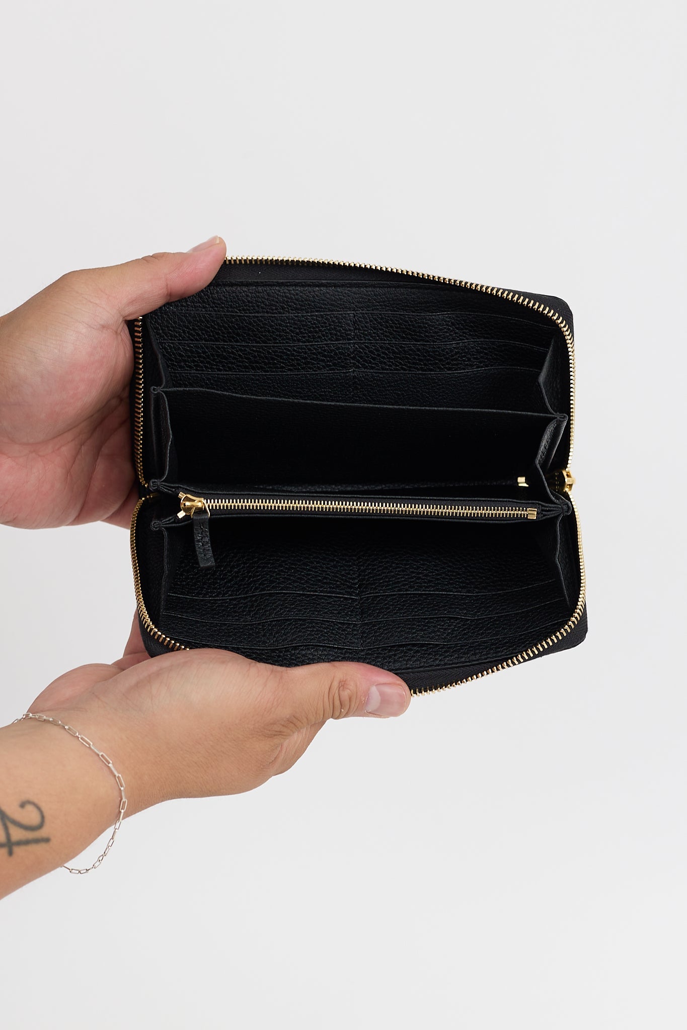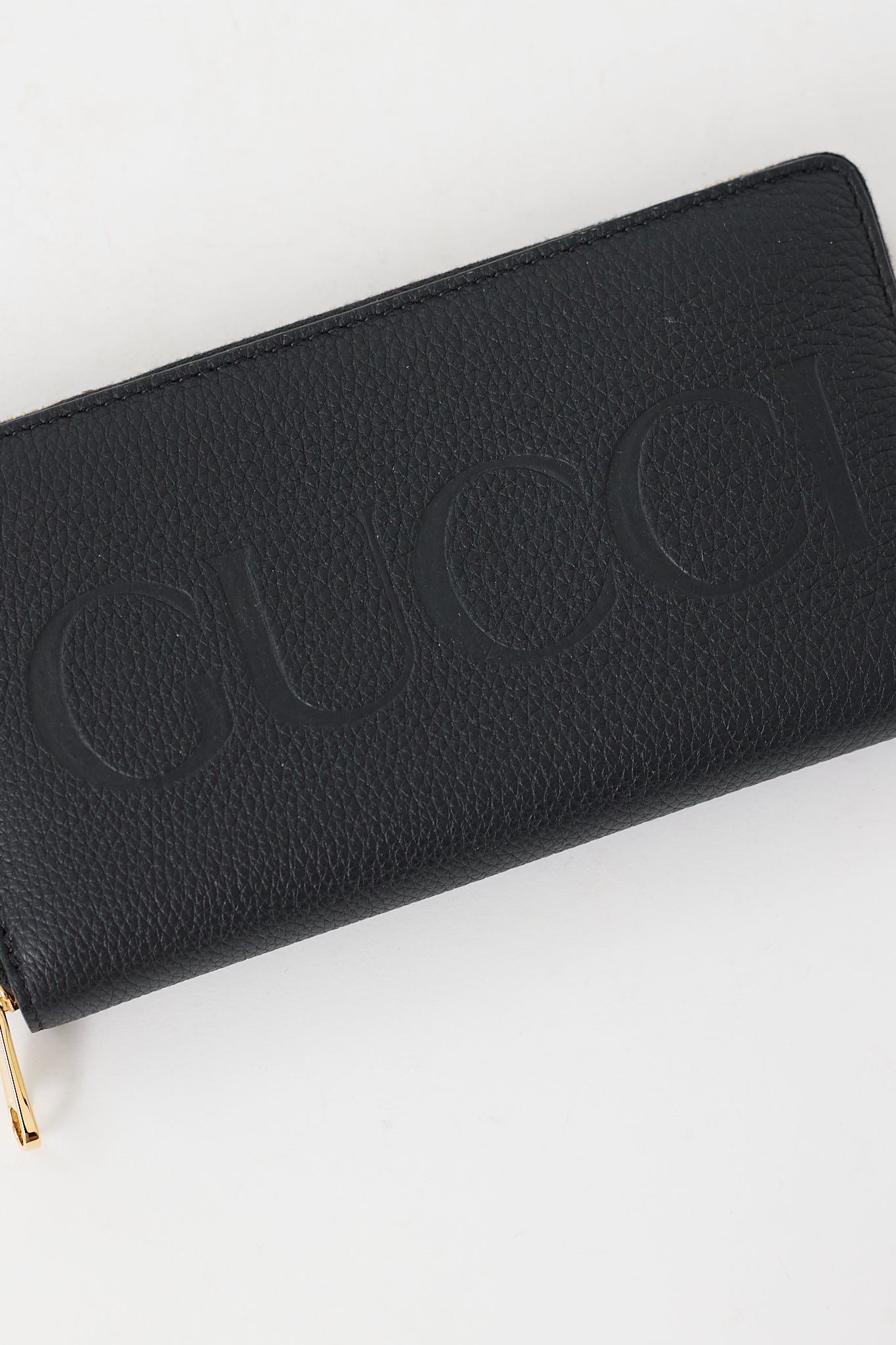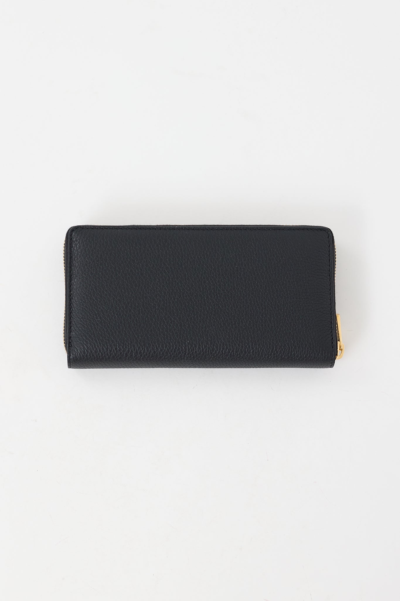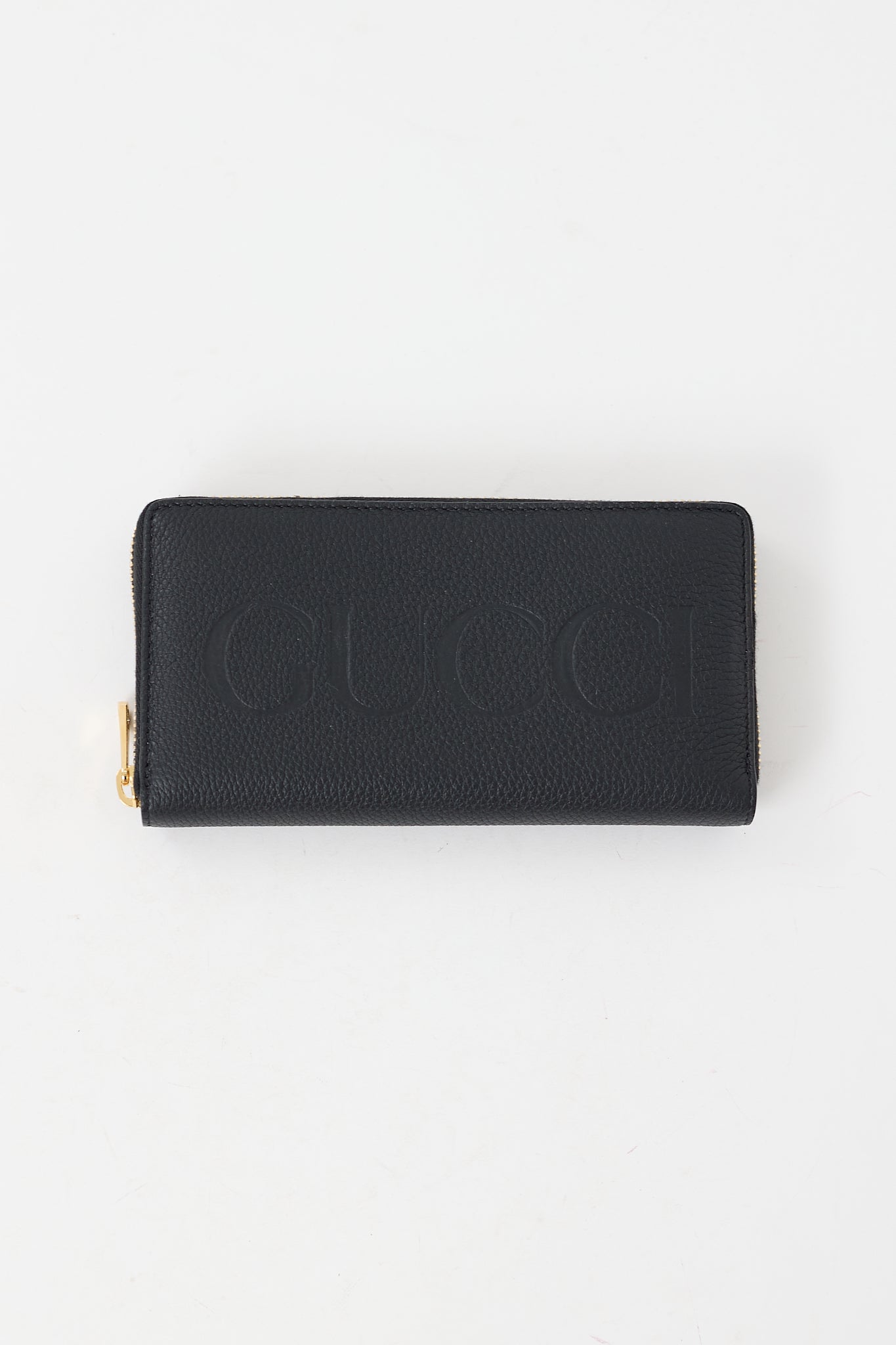 Pre-owned Gucci black continental wallet featuring debossed logo at front, all around zip closure, three main compartments, one zip pocket, and 12 card slots. Comes with original dust bag and box.