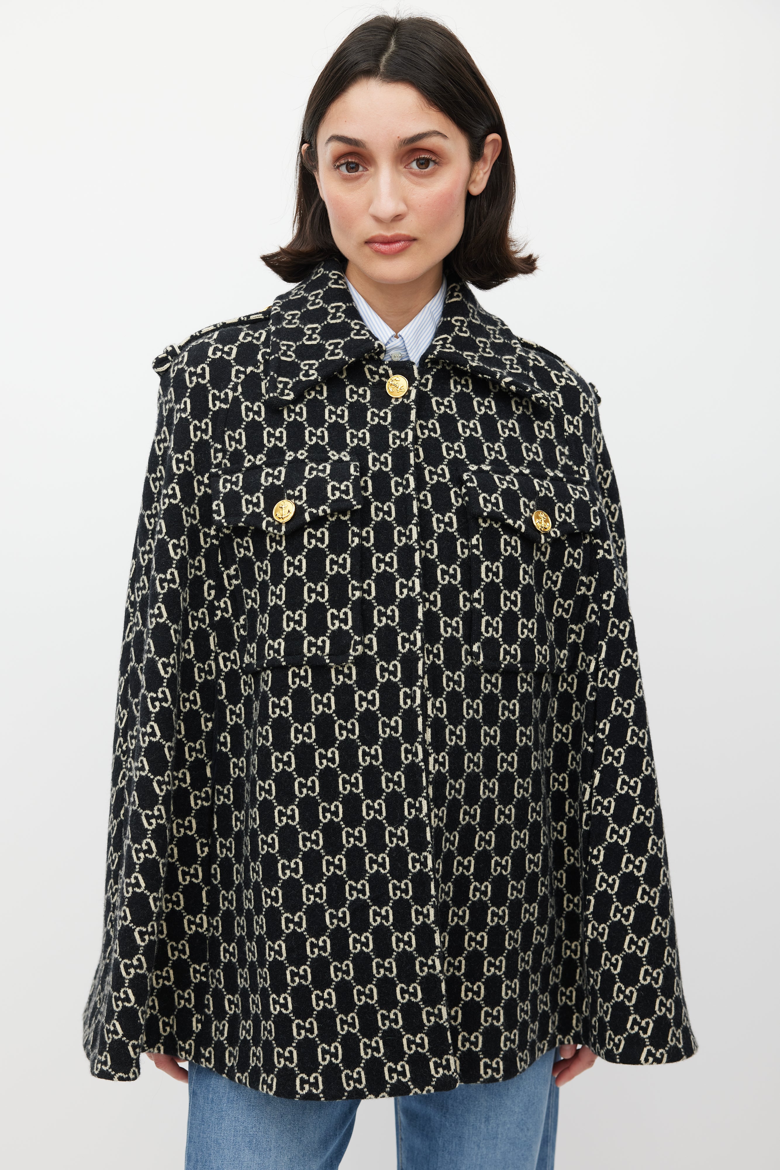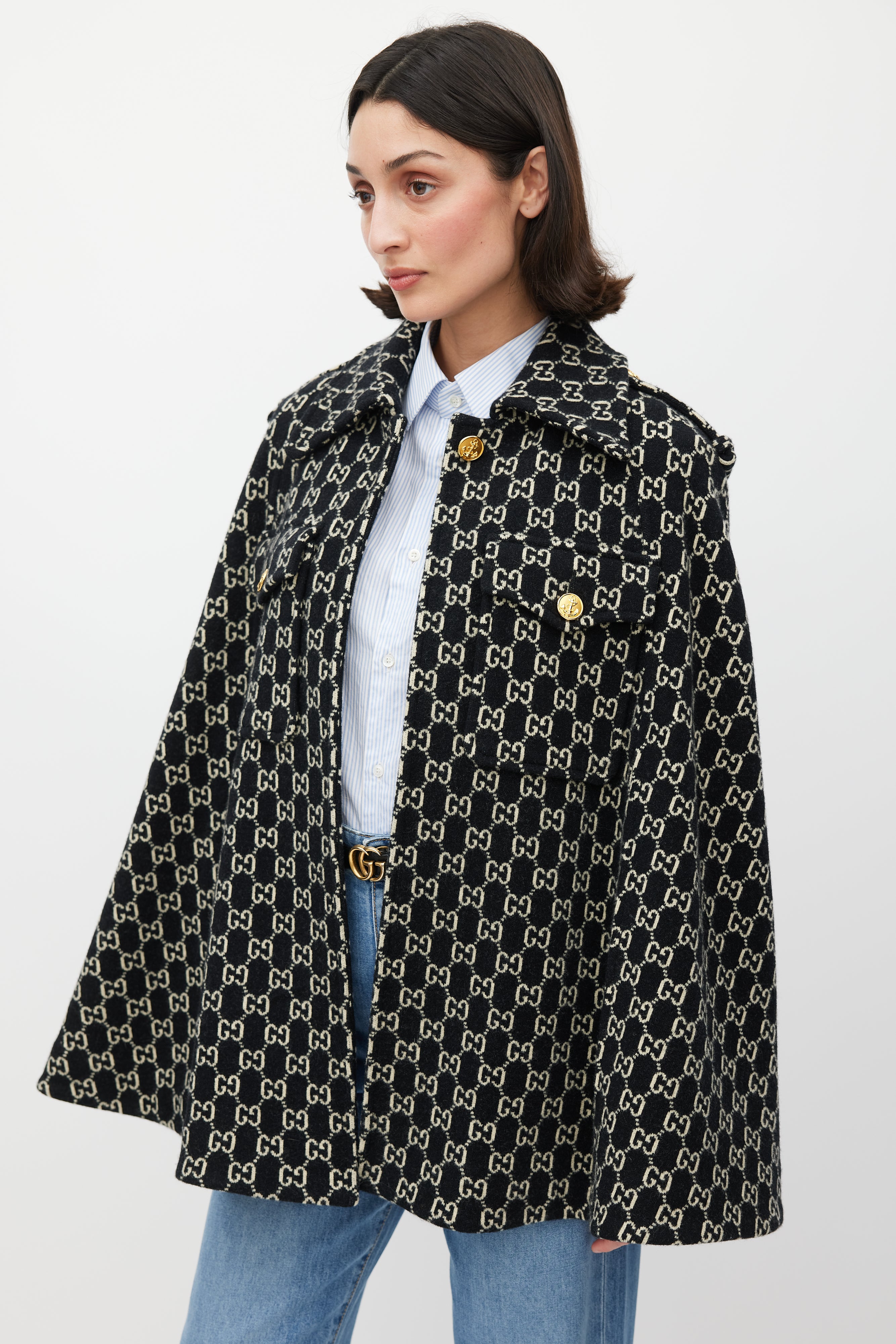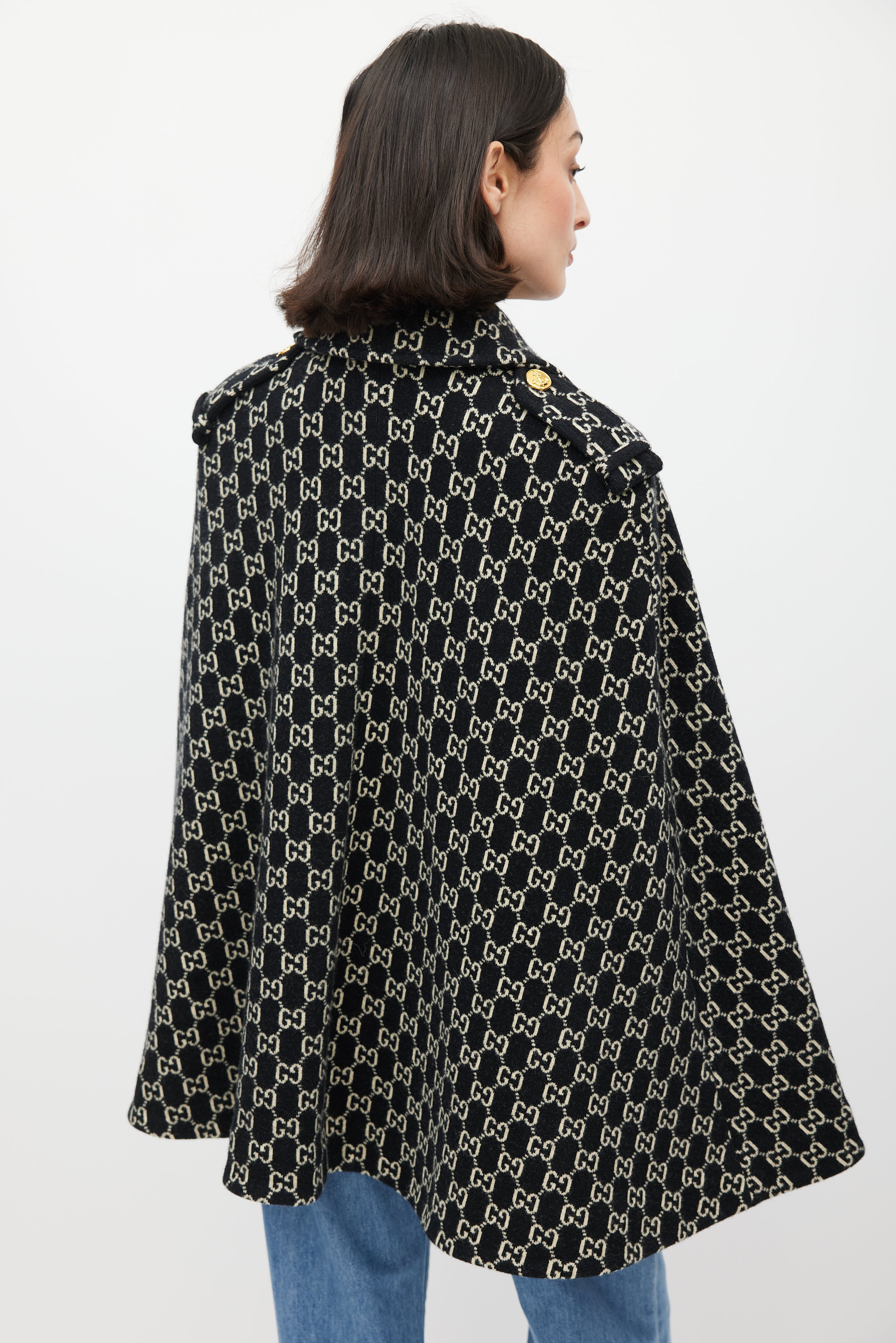 Pre-owned Gucci black wool cape featuring a white GG monogram pattern throughout, pointed collar, epaulets at shoulder, two flap pockets at chest, gold tone hardware, two slits at side, and button closure.