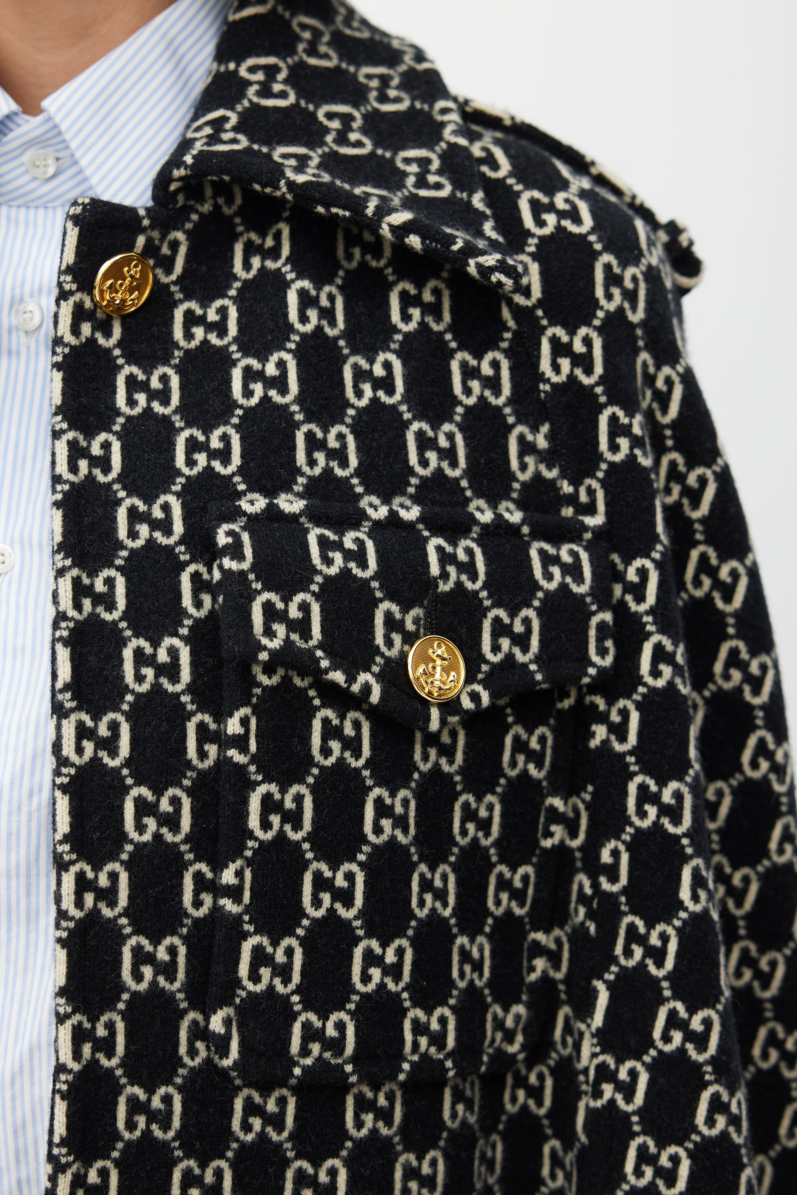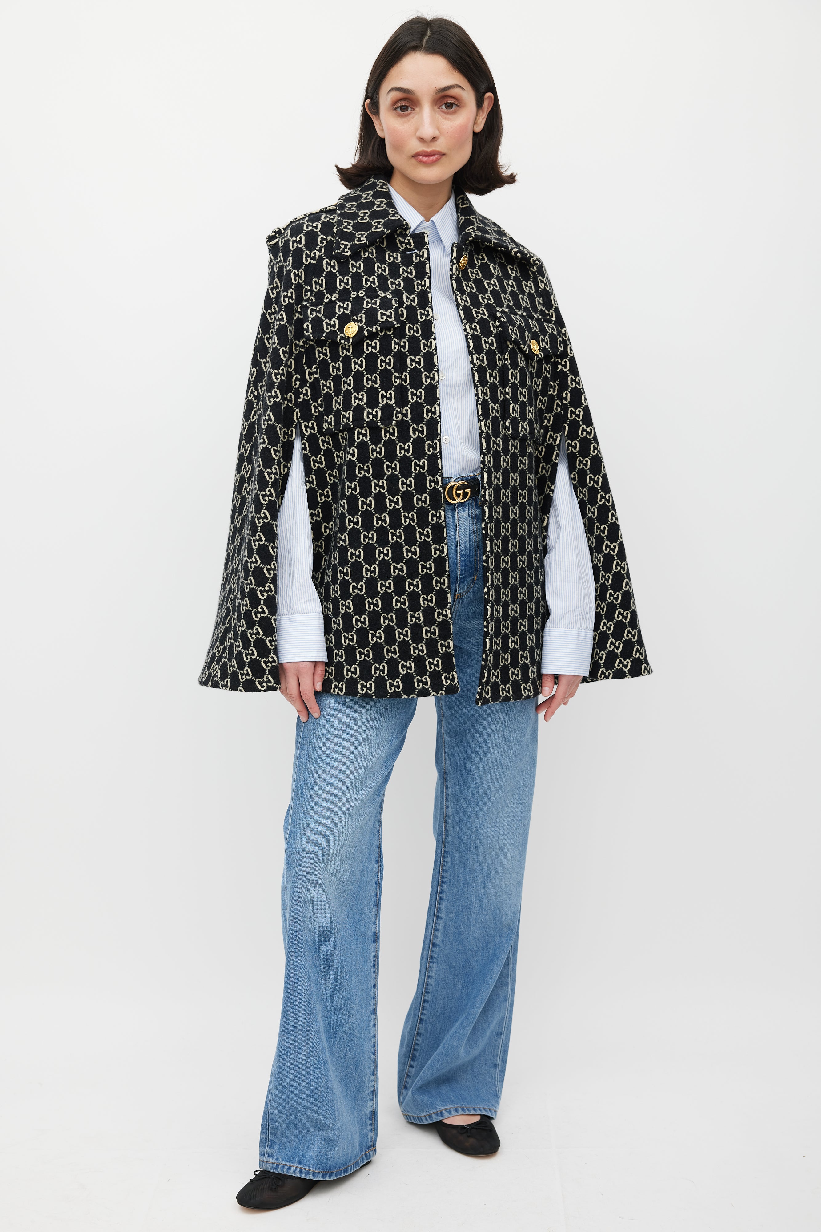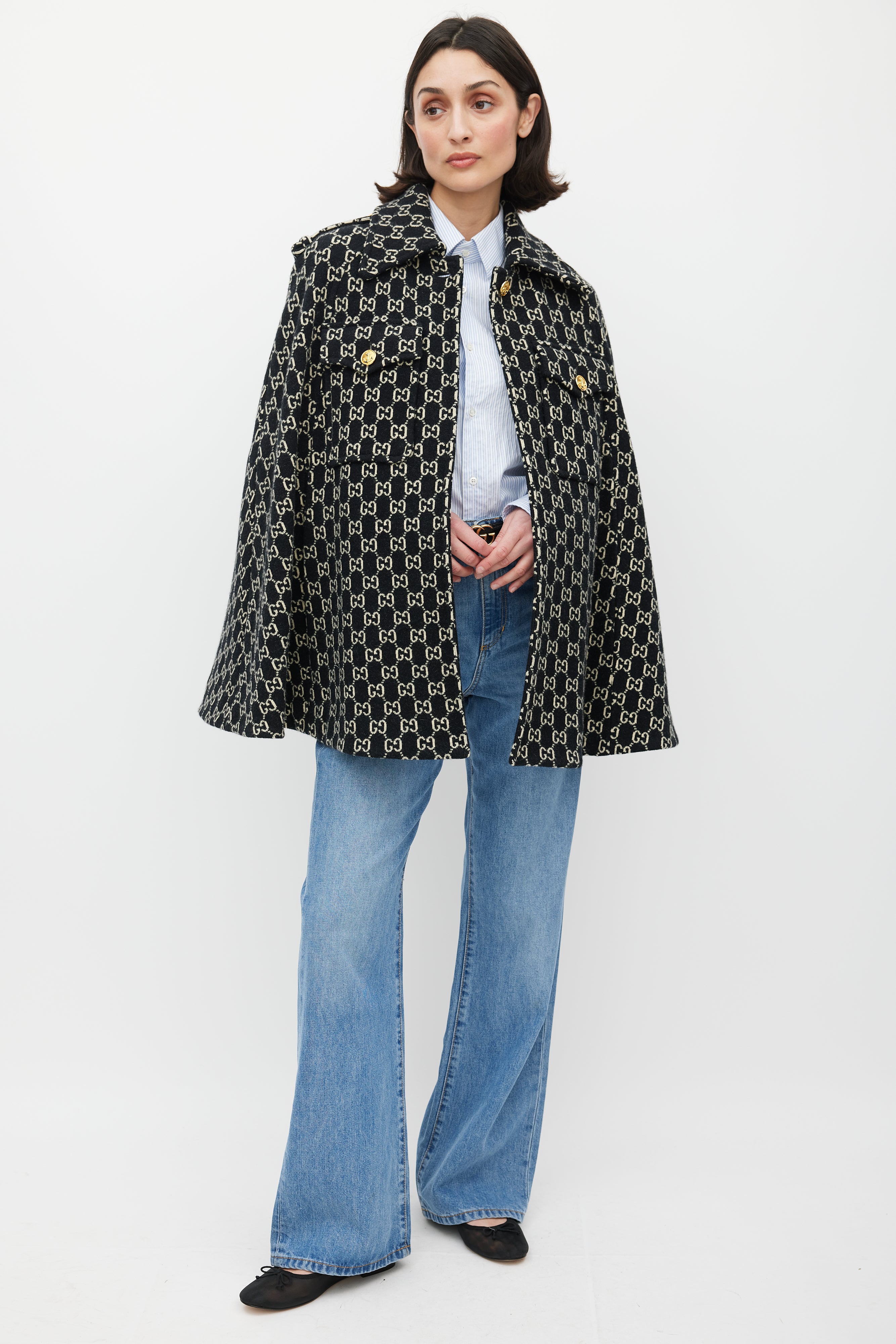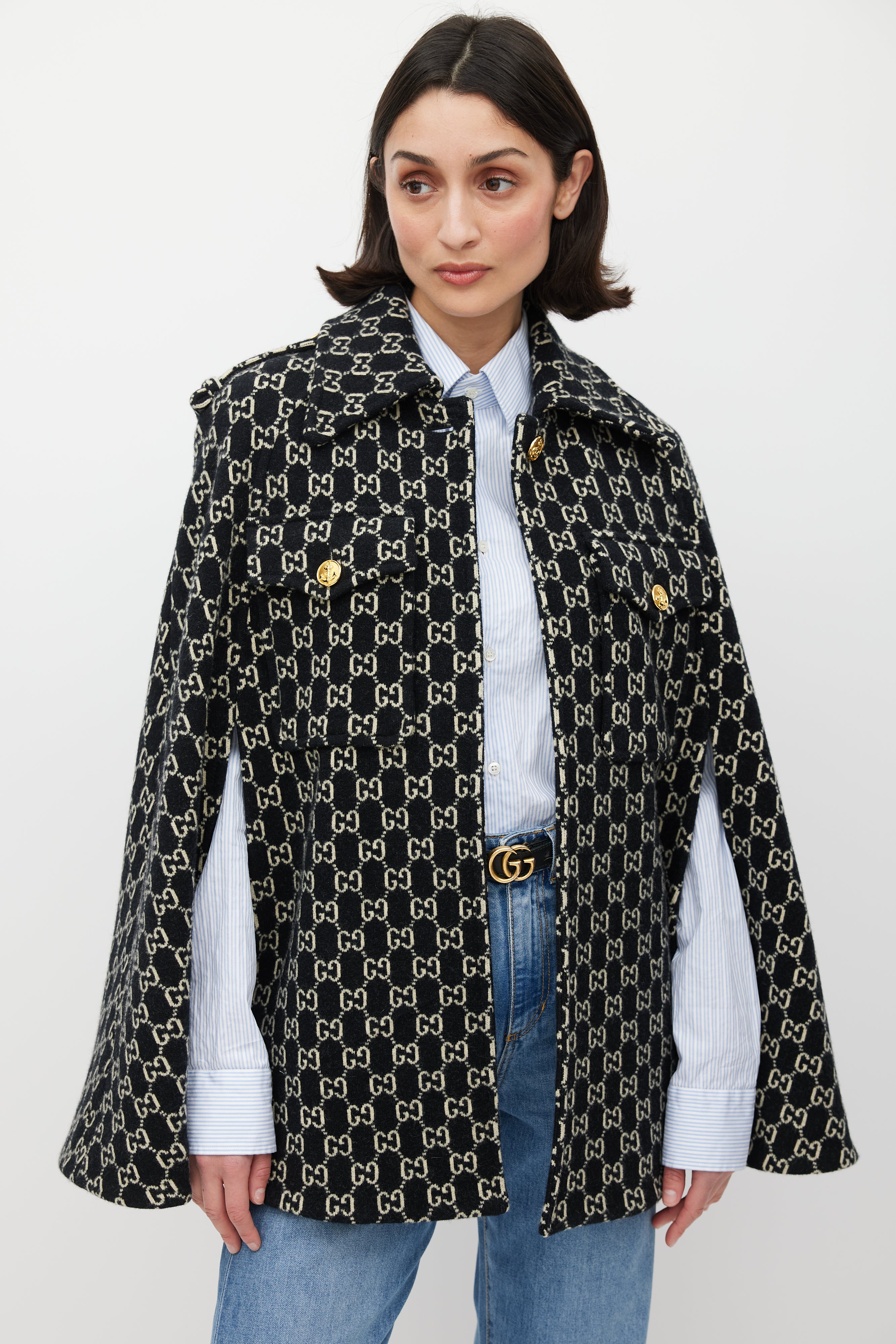 Pre-owned Gucci black wool cape featuring a white GG monogram pattern throughout, pointed collar, epaulets at shoulder, two flap pockets at chest, gold tone hardware, two slits at side, and button closure.