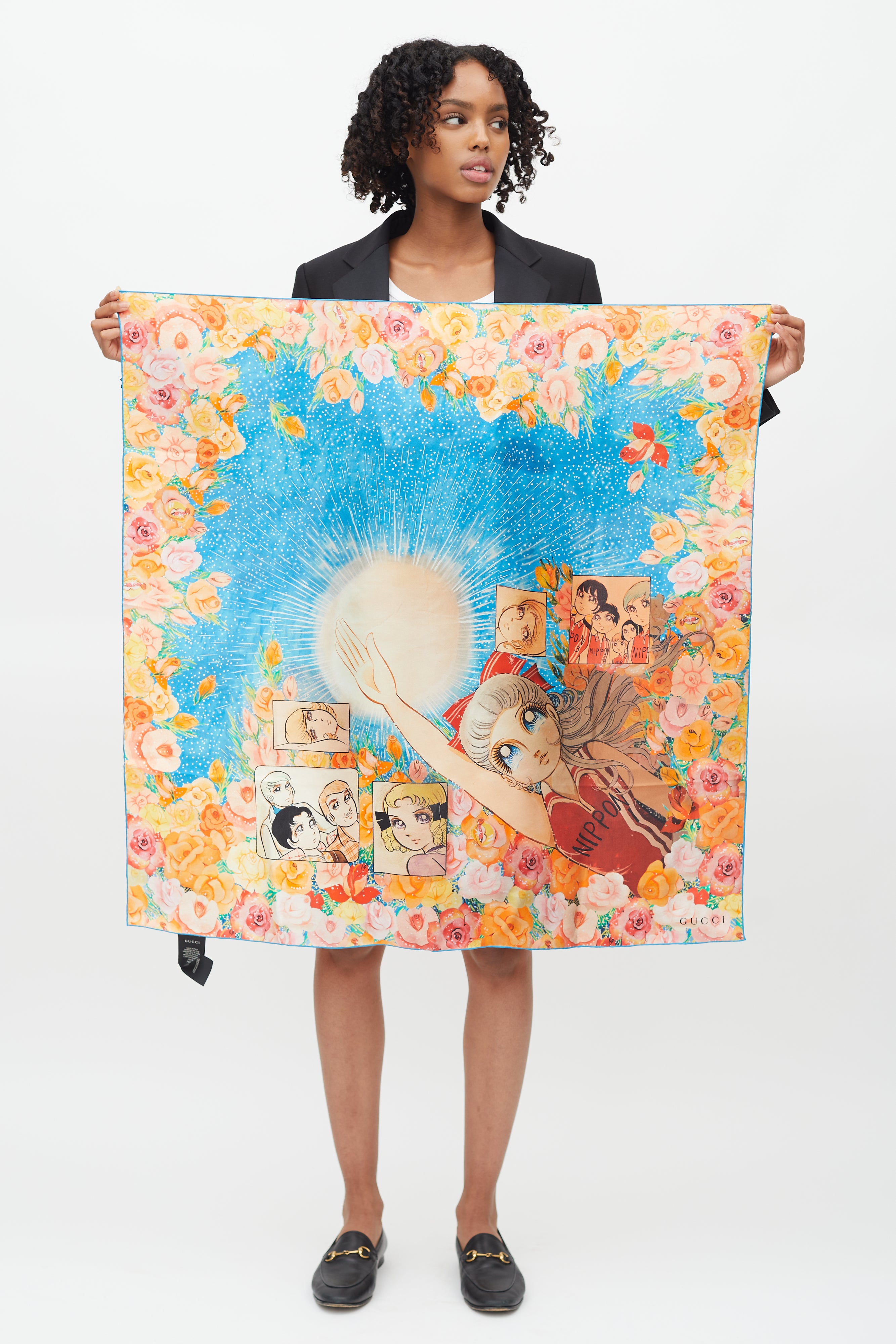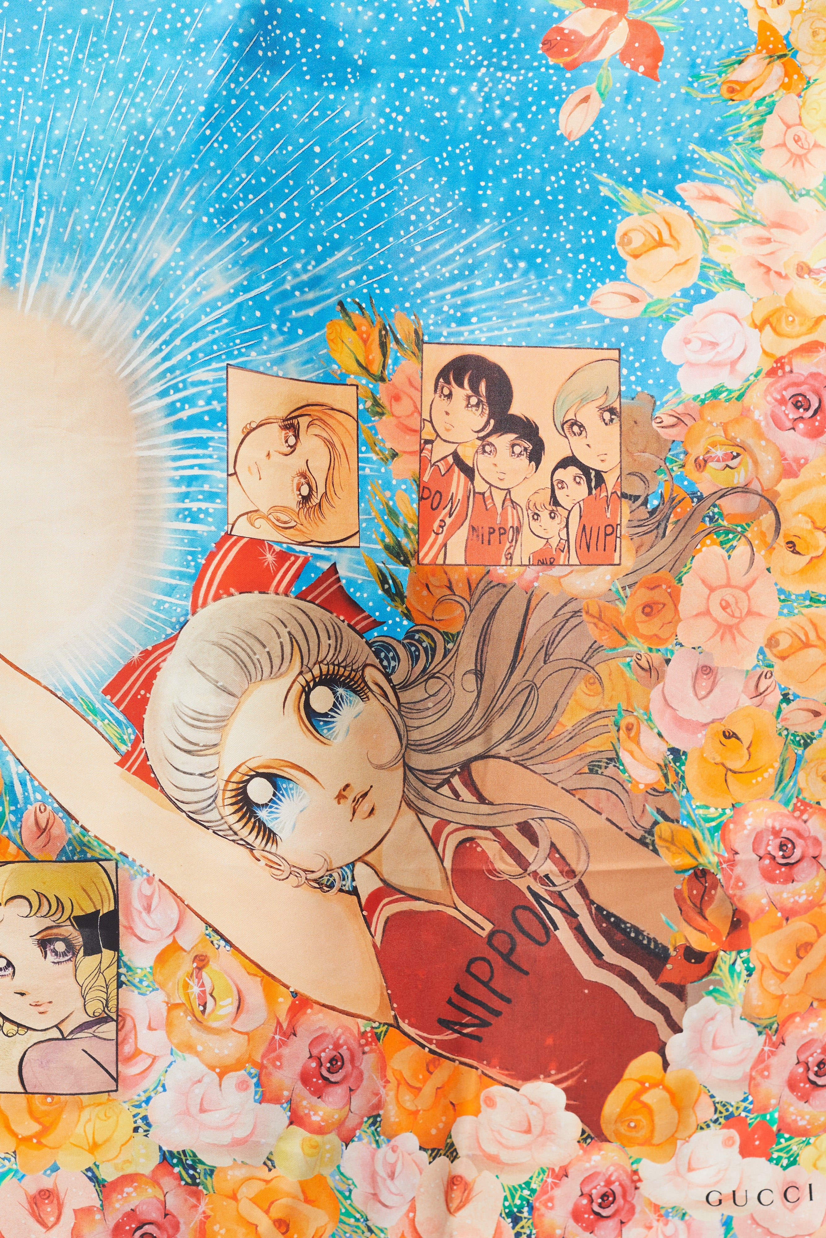 Pre-owned Gucci blue and multicolour scarf featuring blue hand rolled trim edges, Viva! Volleyball manga print, floral print, and black printed logo at corner.
