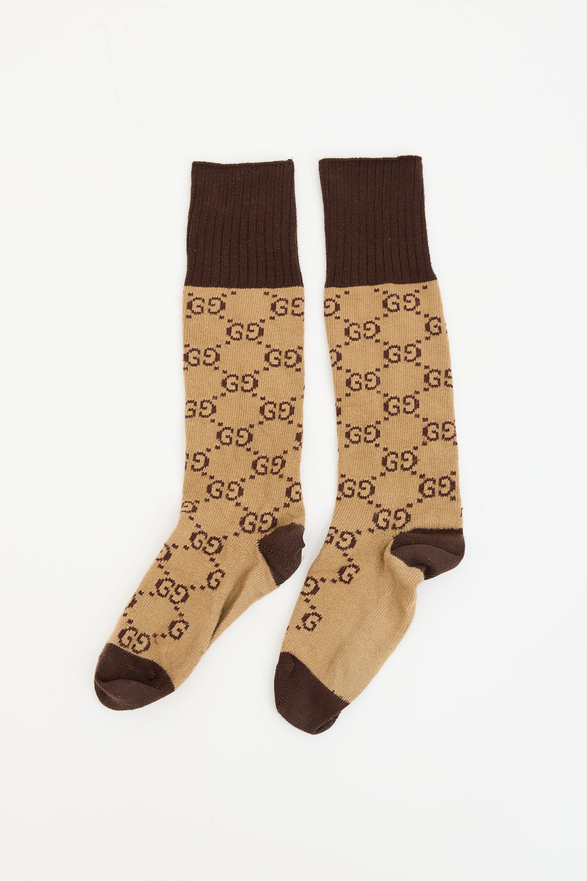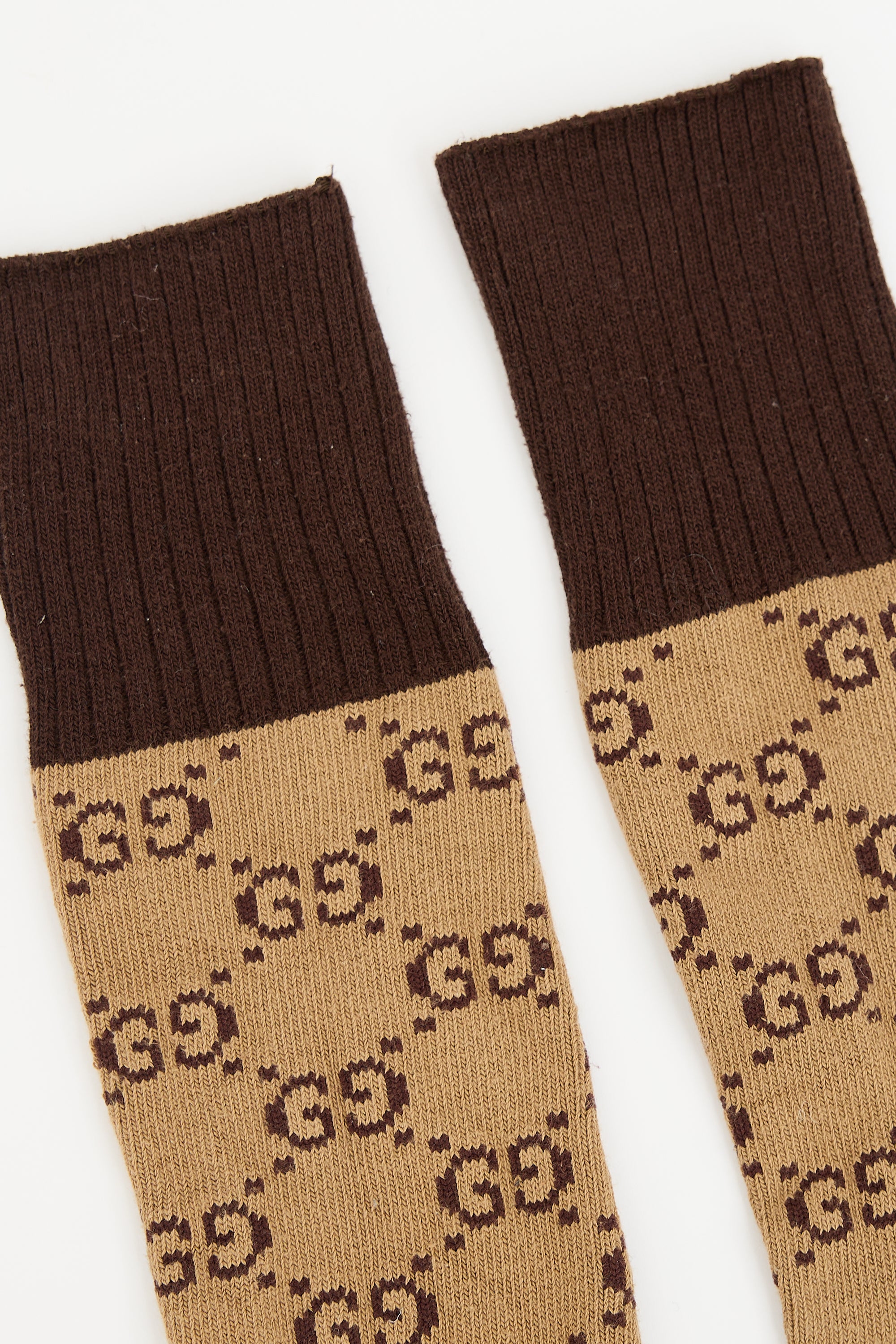 Pre-owned Gucci brown crew socks featuring dark brown ribbed cuffs and GG monogram pattern.