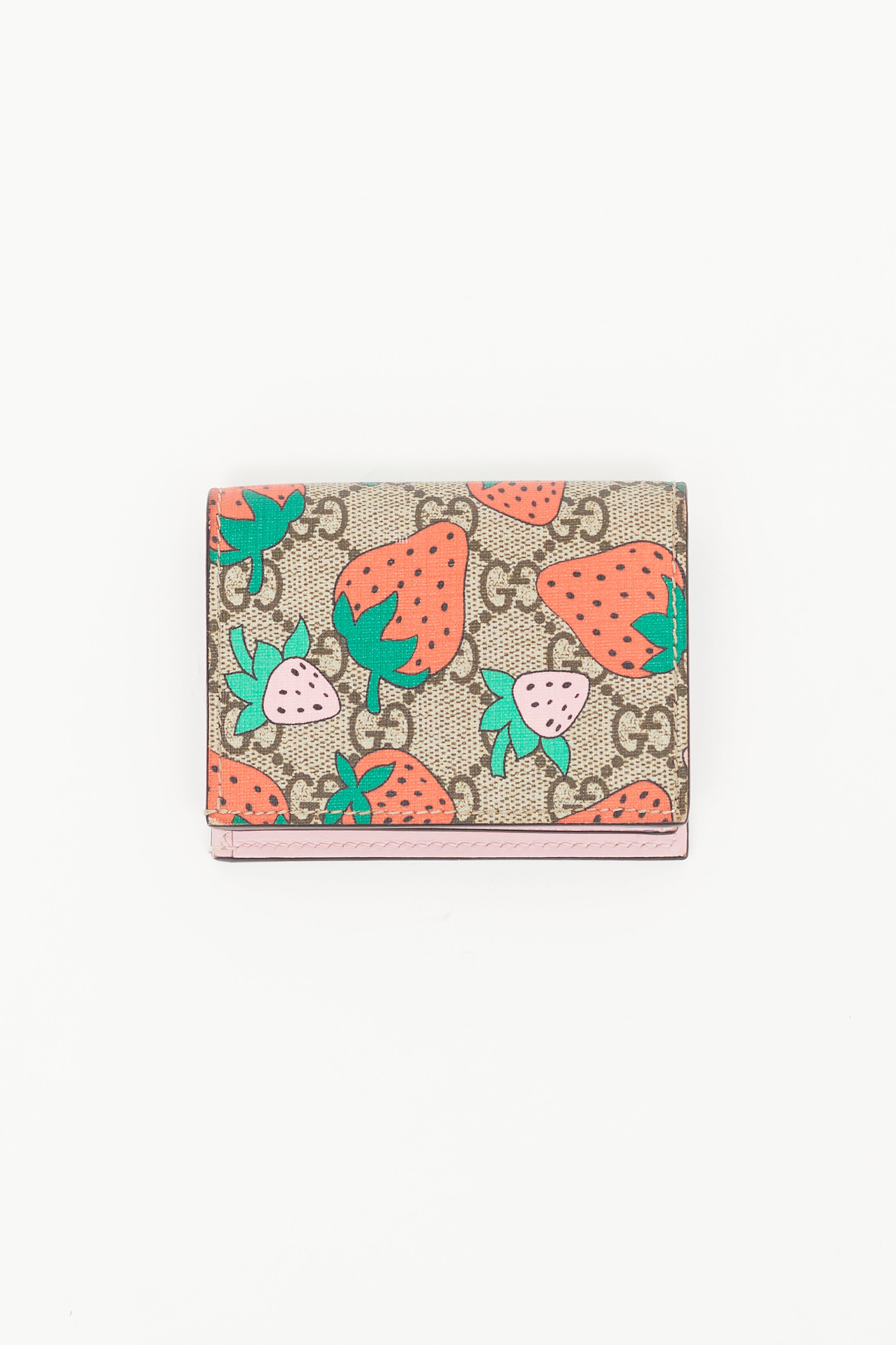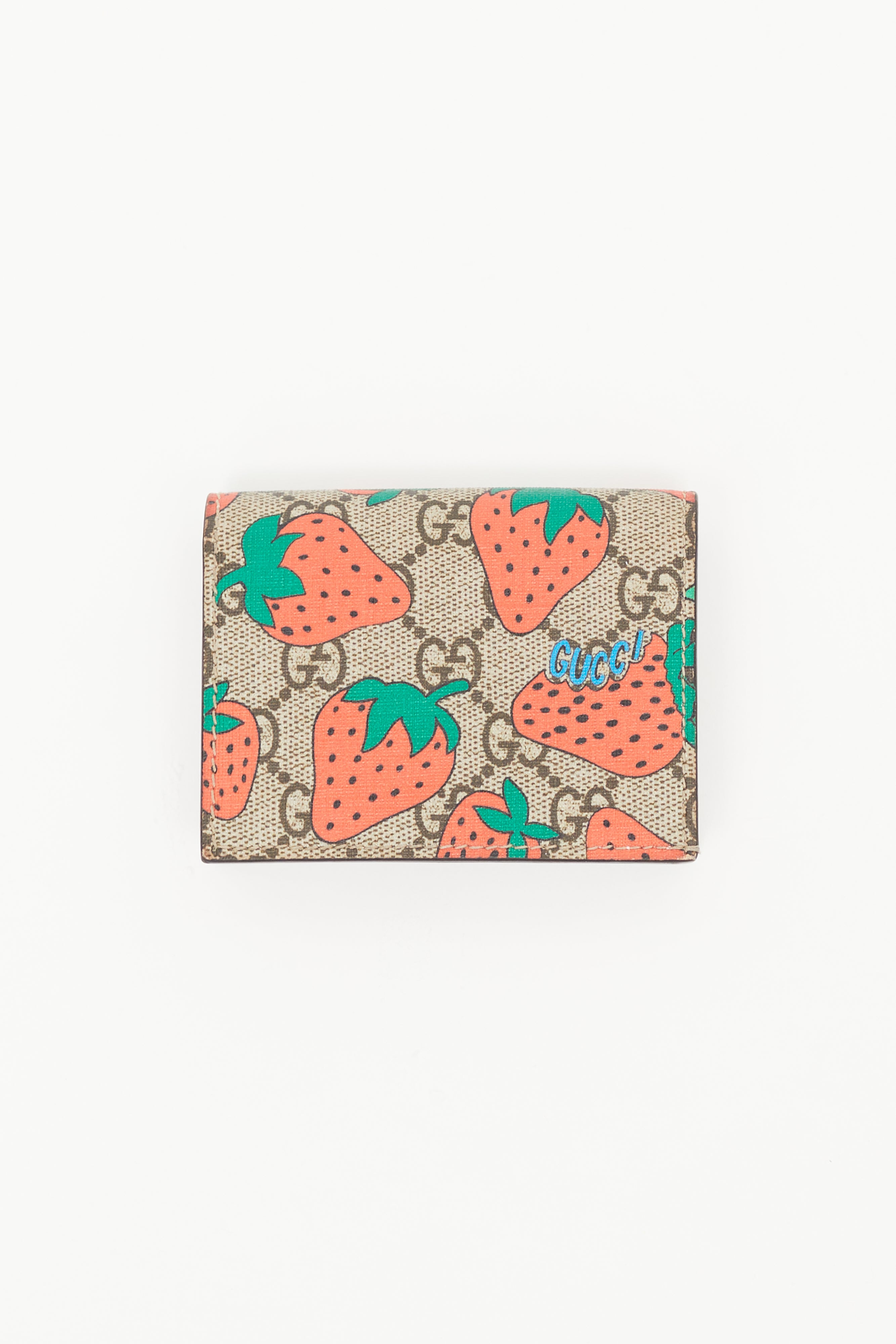 Pre-owned Gucci wallet featuring GG Supreme canvas exterior with strawberry graphics, snap closure, five card slots, one slip pocket and one zip pocket. Comes with original box and dust bag.