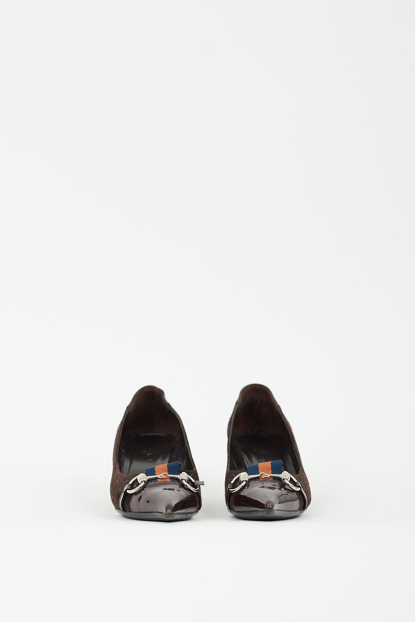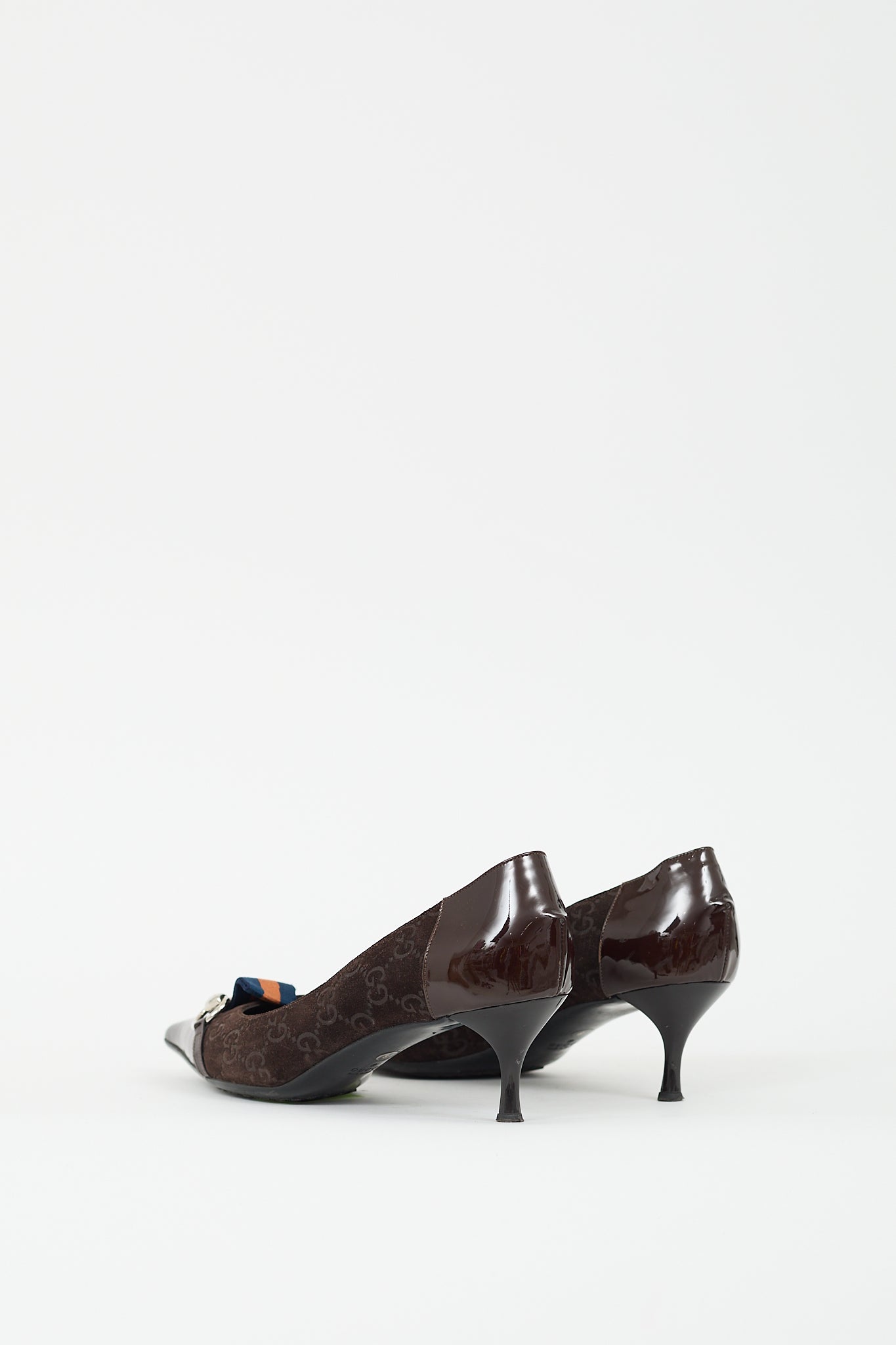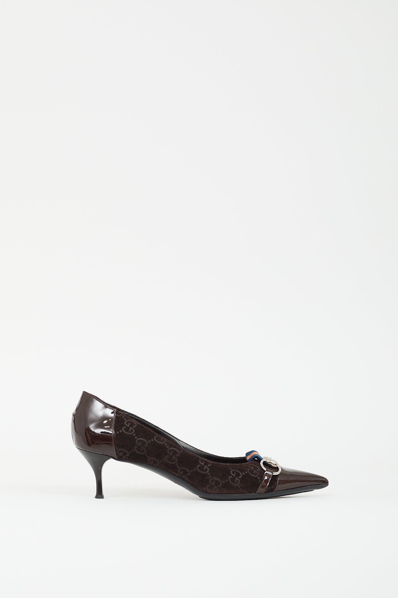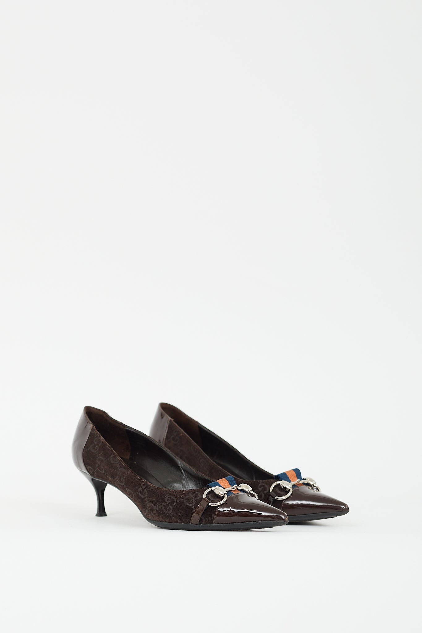 Pre-owned Gucci brown pumps featuring a pointed toe, suede upper with debossed GG monogram throughout, patent leather toe and counter panelling, silver tone signature Horsebit hardware and blue and orange Web stripe detail at vamp, and short covered continental heel.
