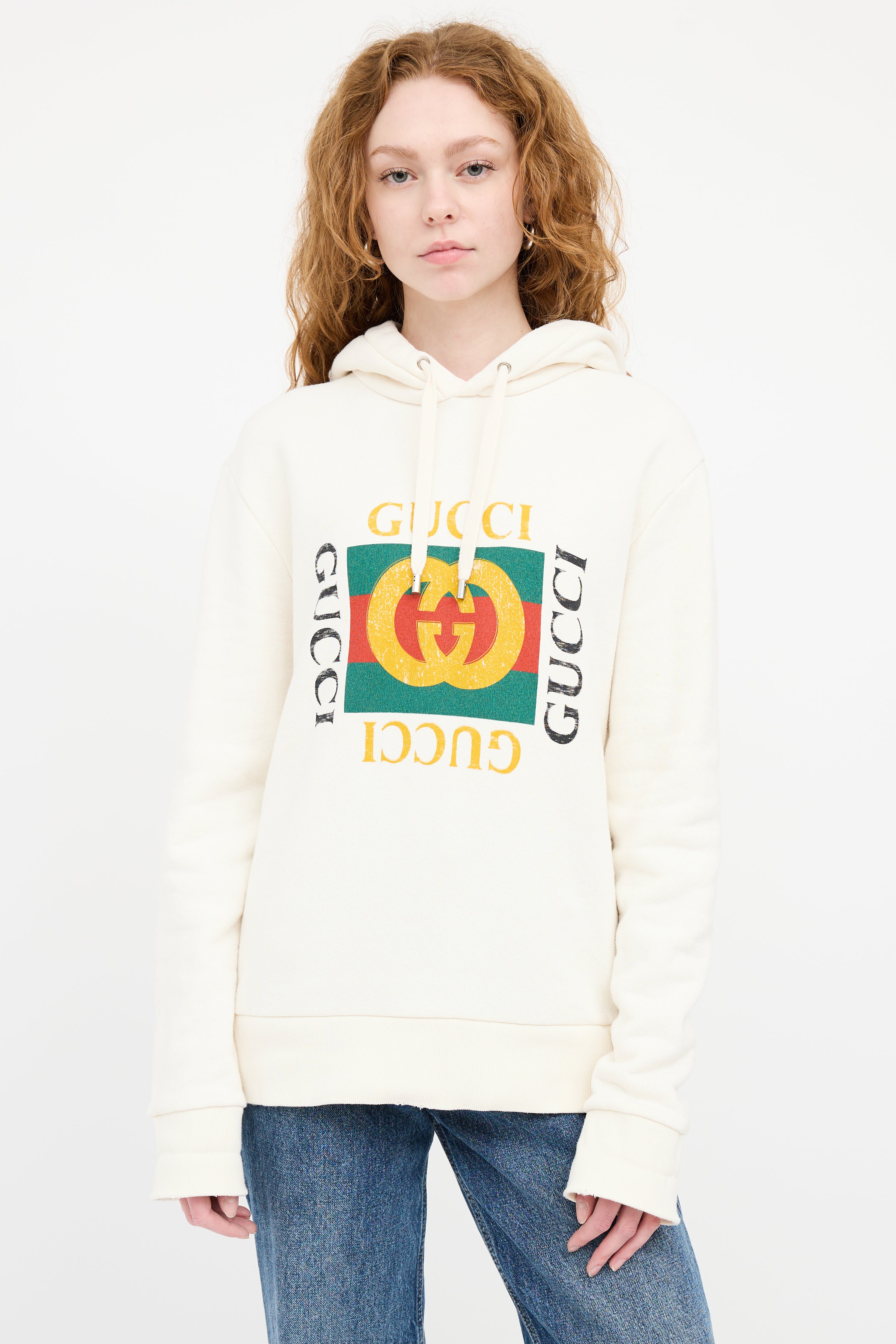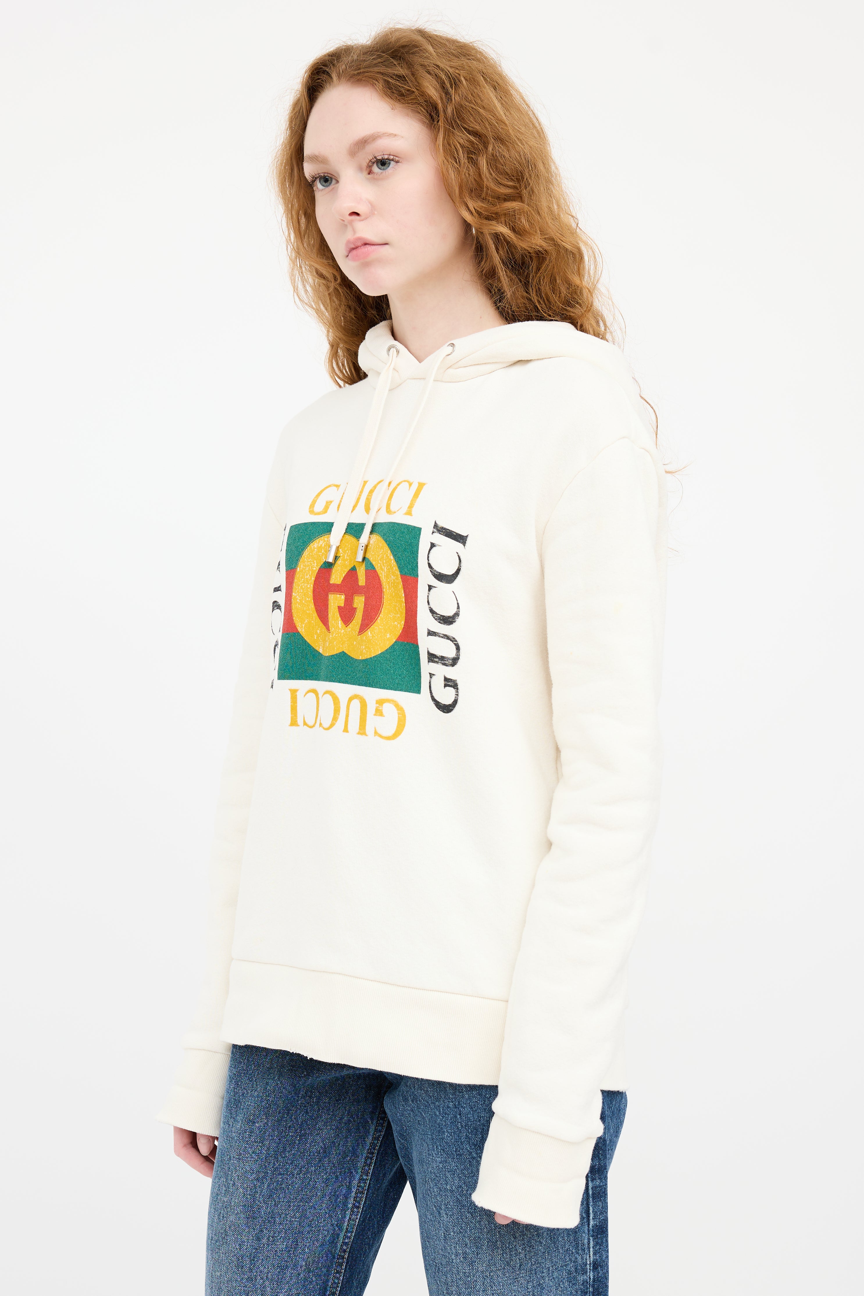 Pre-owned Gucci cream hoodie featuring a drawstring hood, red, green and yellow GG logo at chest, long sleeves, intentional distressing, and ribbed hem.