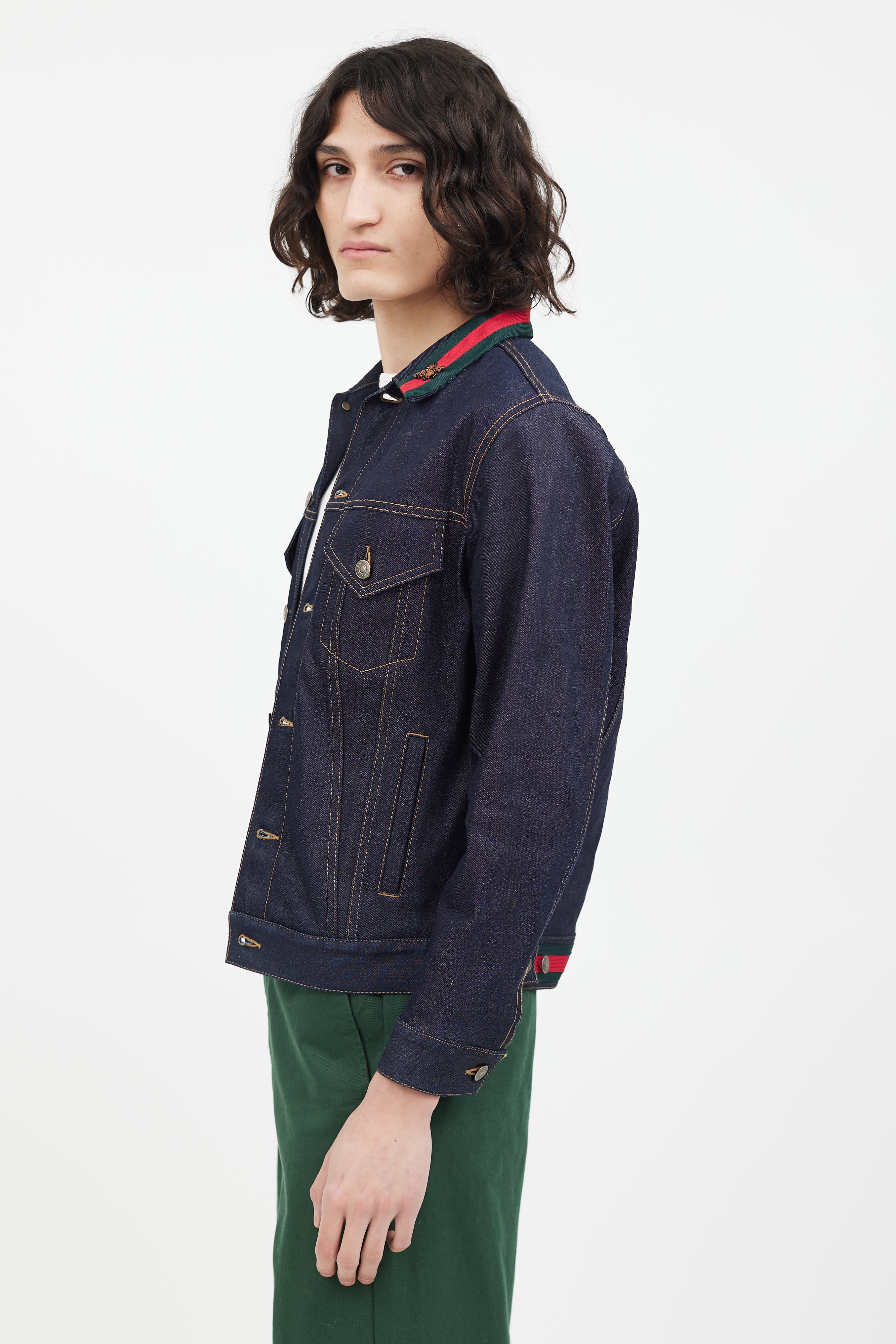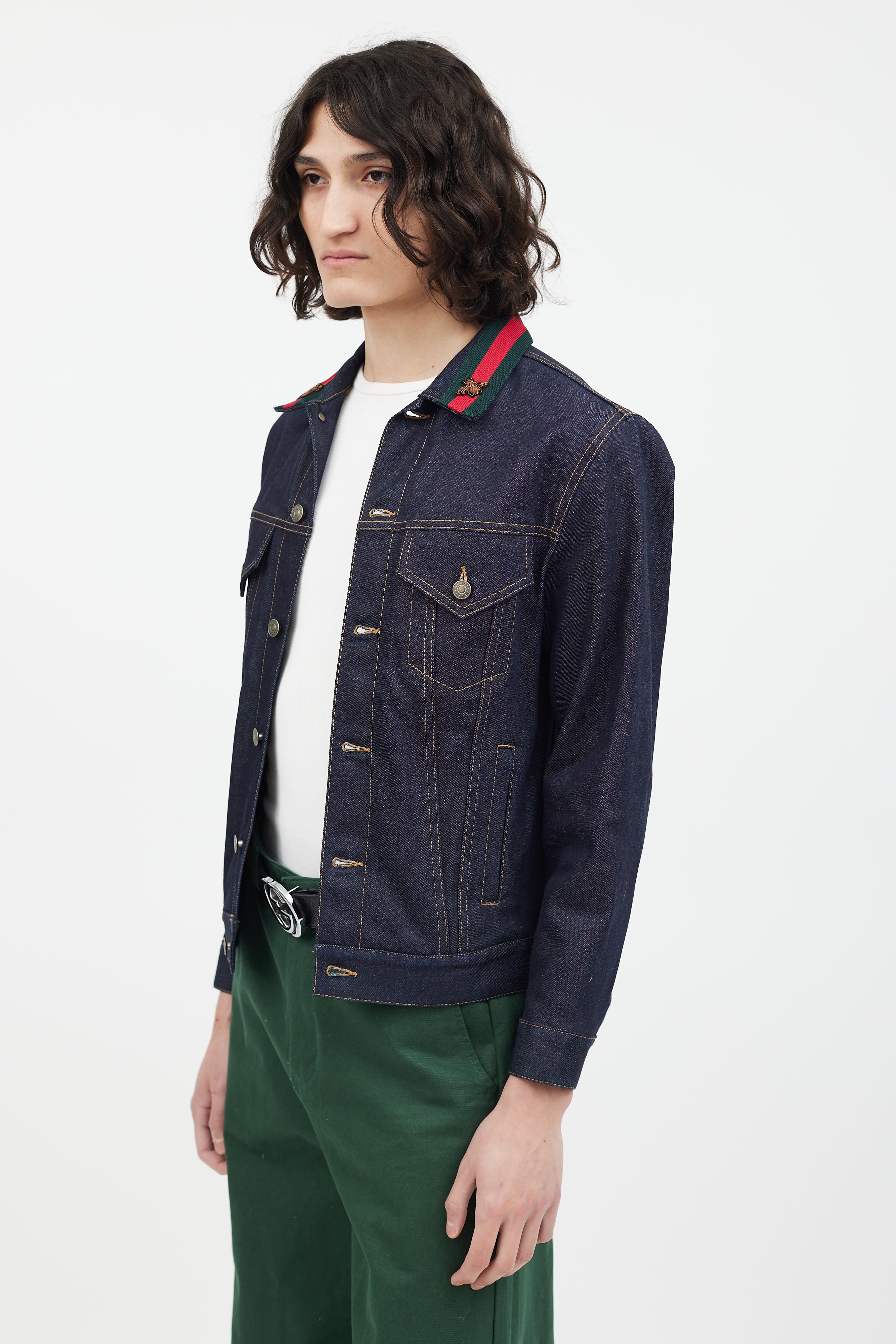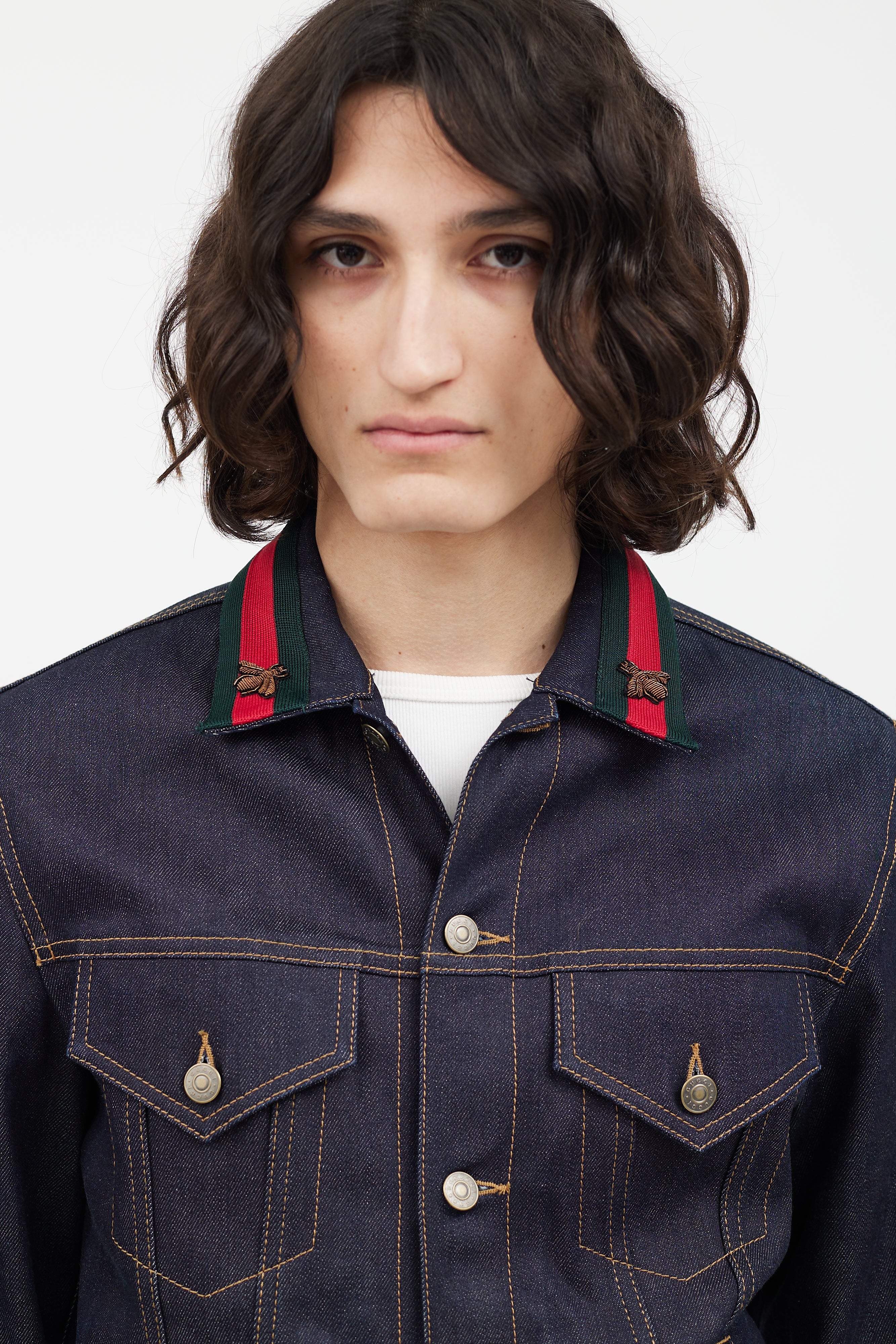 Pre-owned Gucci dark wash denim jacket featuring button up front, two chest pockets, two slash pockets at hips, classic collar with signature webbed stripe, contrast stitching, bronze tone bee embellishment at collar, blue and yellow plaid lining at body, and polkadot printed lining at sleeves.