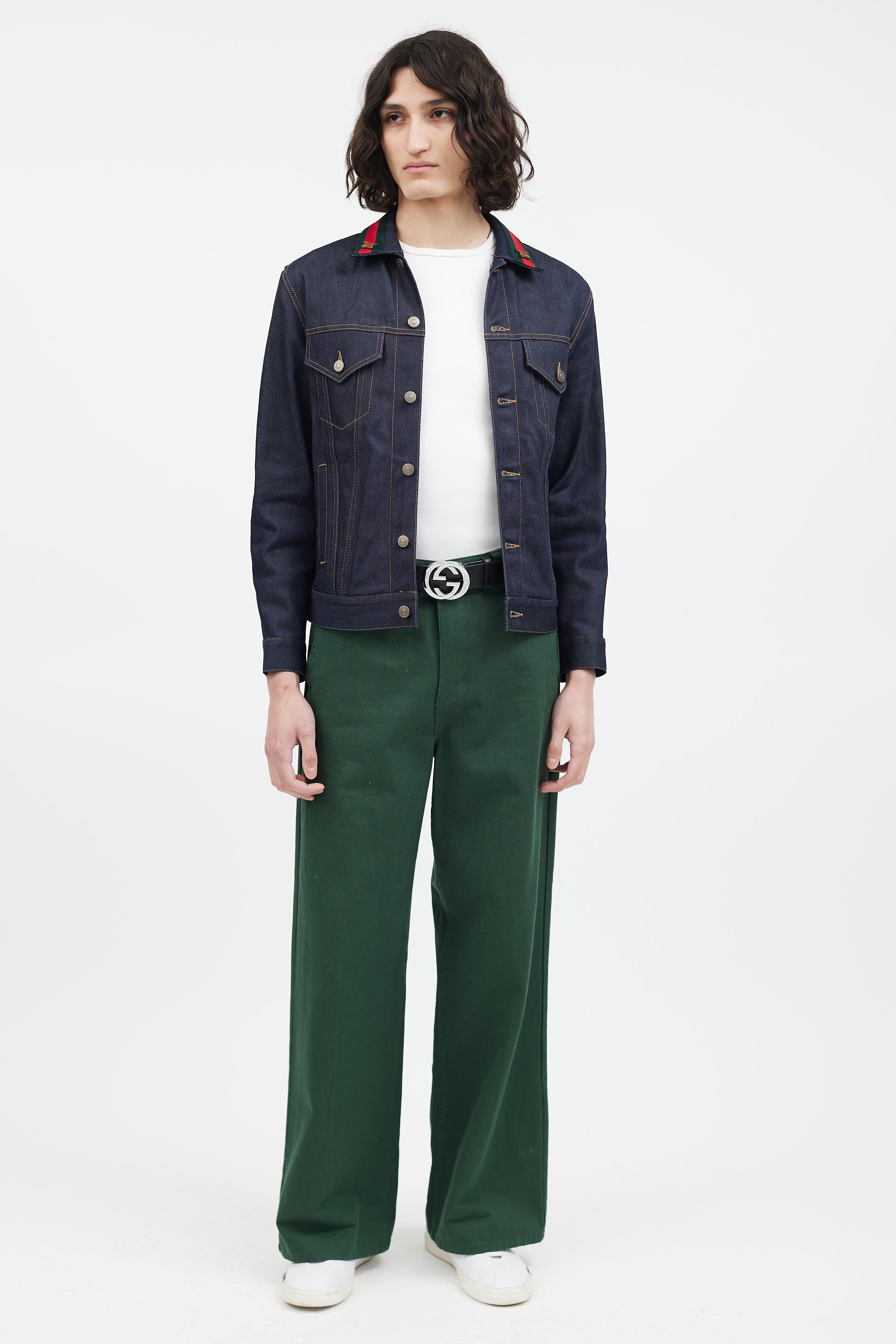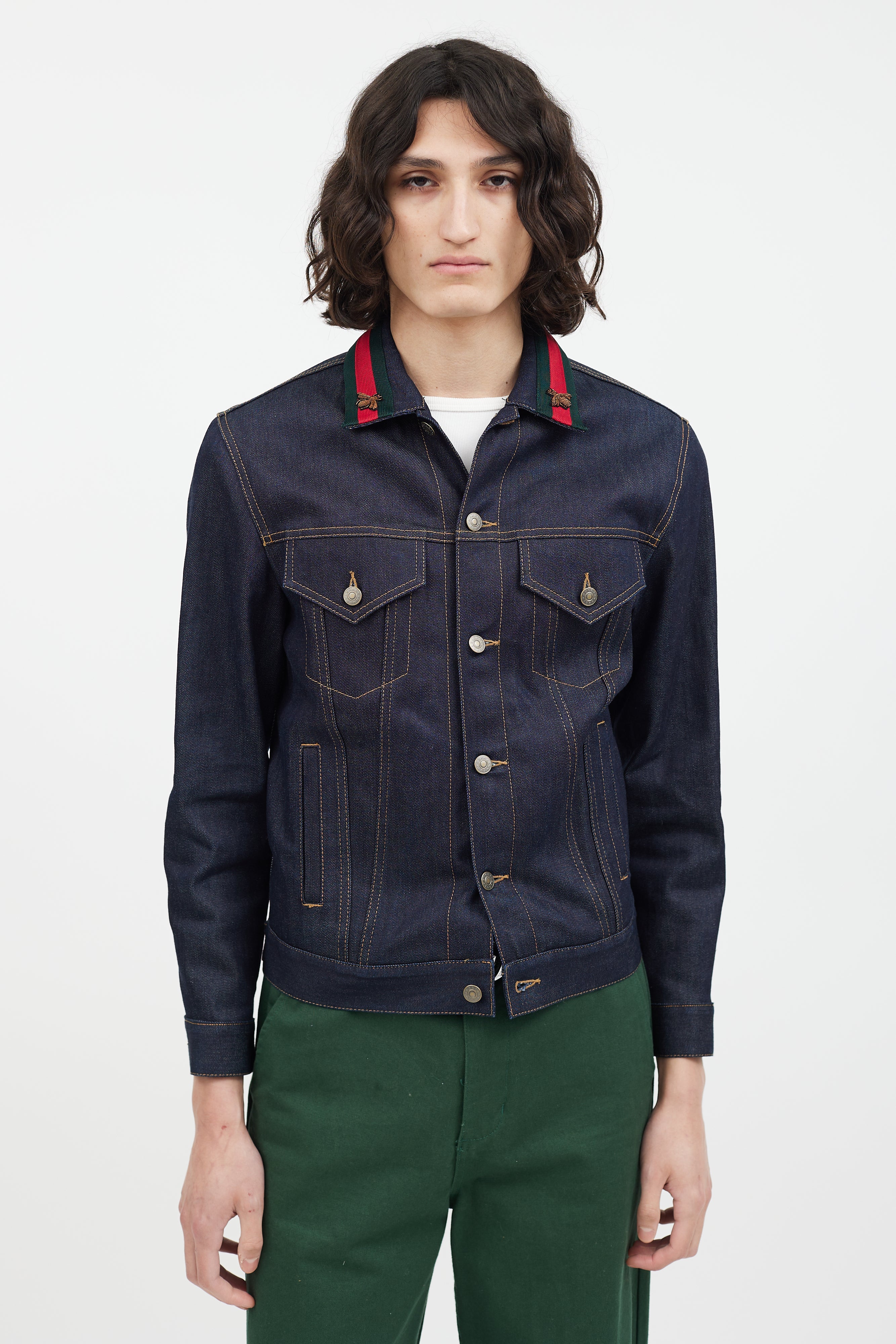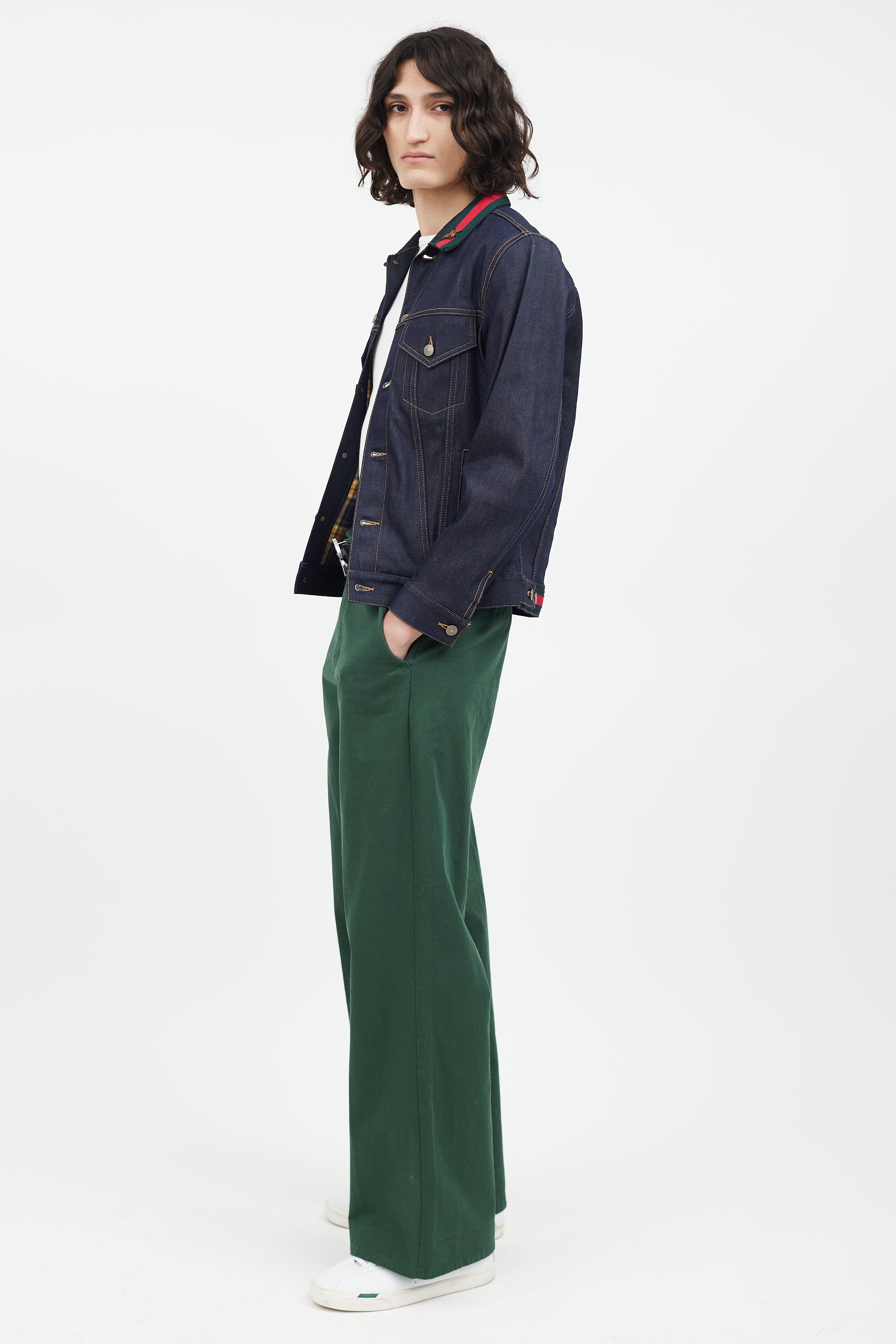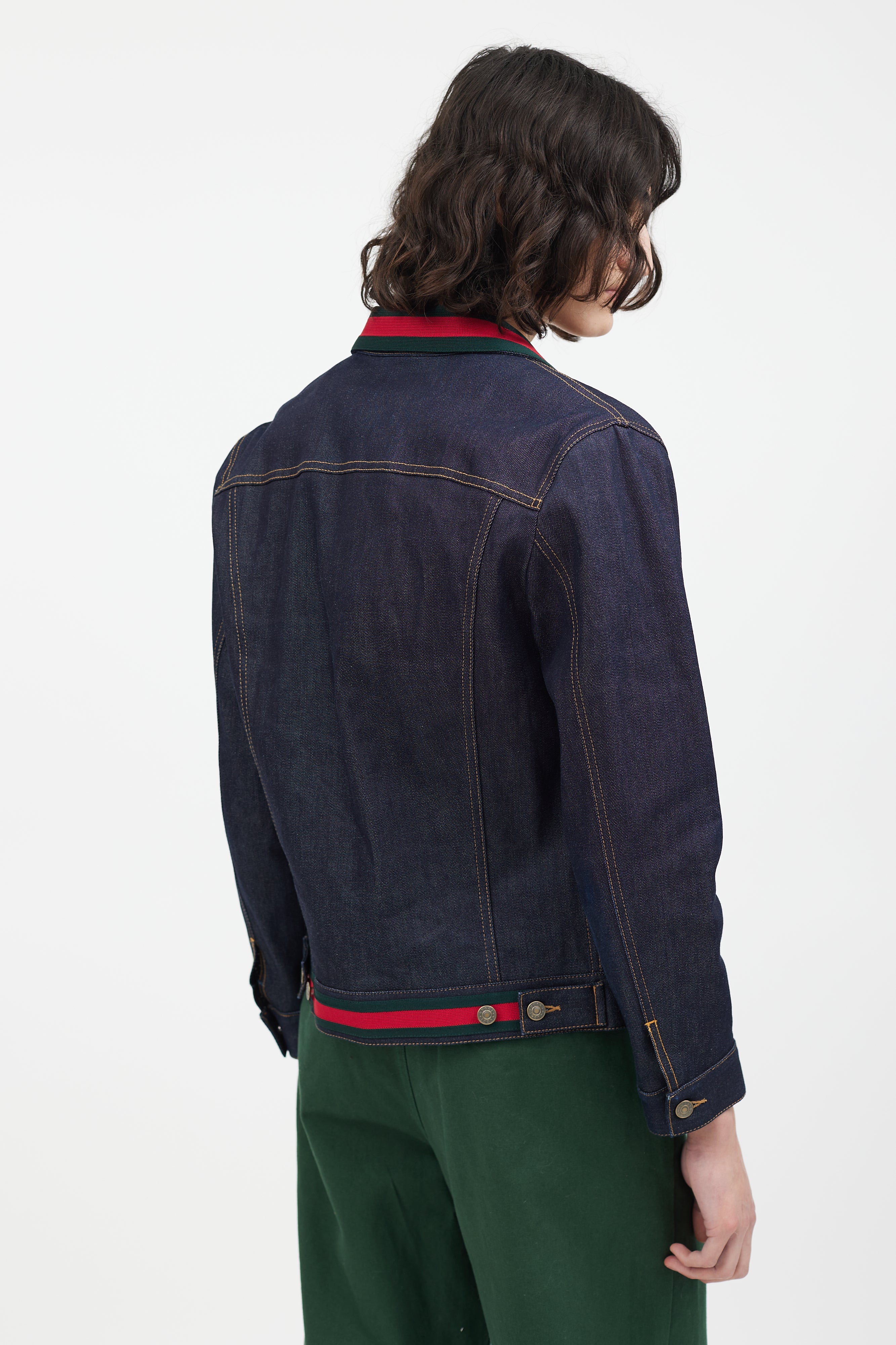 Pre-owned Gucci dark wash denim jacket featuring button up front, two chest pockets, two slash pockets at hips, classic collar with signature webbed stripe, contrast stitching, bronze tone bee embellishment at collar, blue and yellow plaid lining at body, and polkadot printed lining at sleeves.