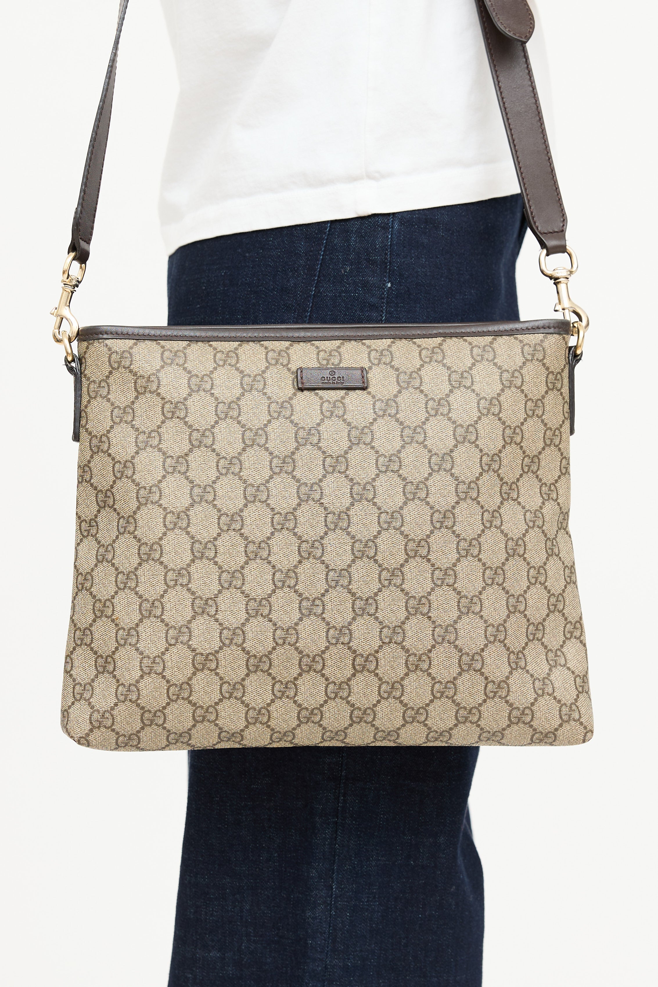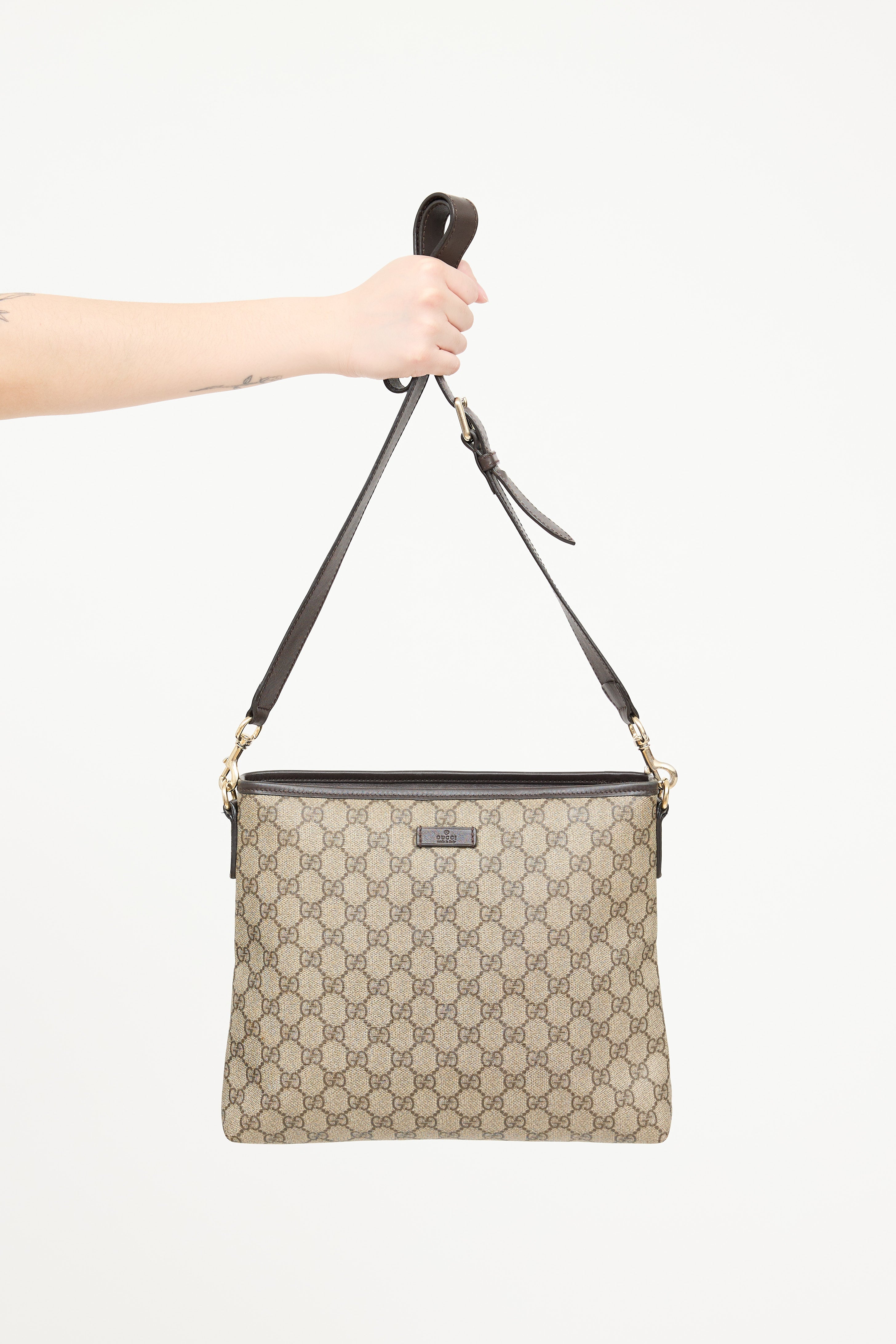 Pre-owned Gucci beige and brown GG Supreme messenger bag featuring GG supreme monogram, adjustable shoulder strap, exterior back slip pocket, zip closure, one main compartment with two slip pockets and one zip pockets.