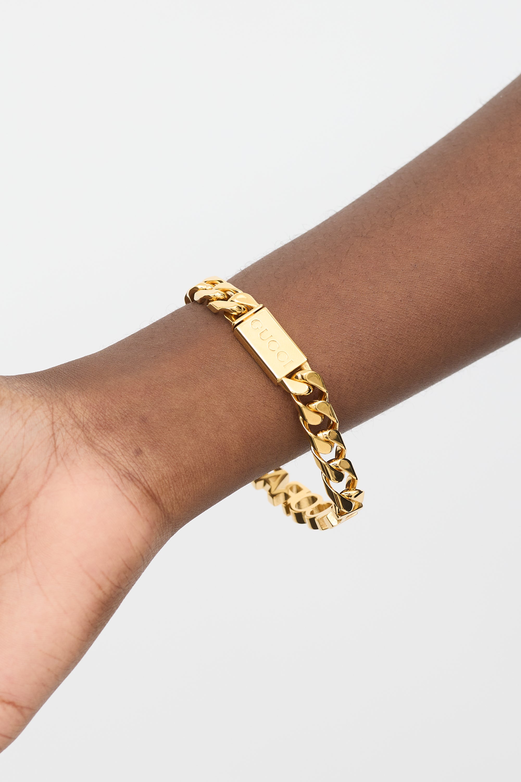 Pre-owned Gucci gold tone bracelet featuring Cuban chain link, "ANCORA" and "AH" lettering, and catch clasp closure with debossed logo. Stamped with "GUCCI", "made in Italy, and "B" in box.