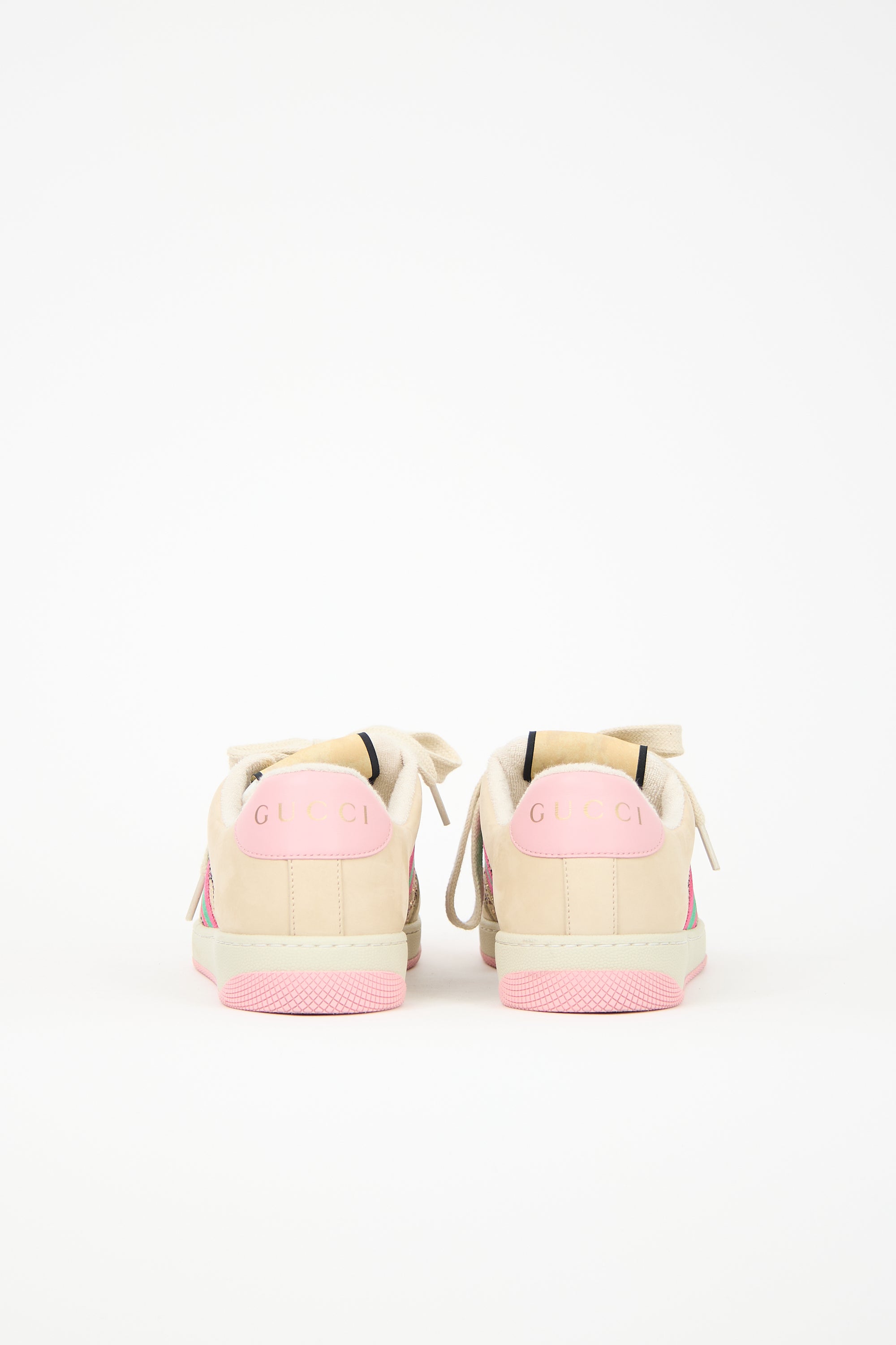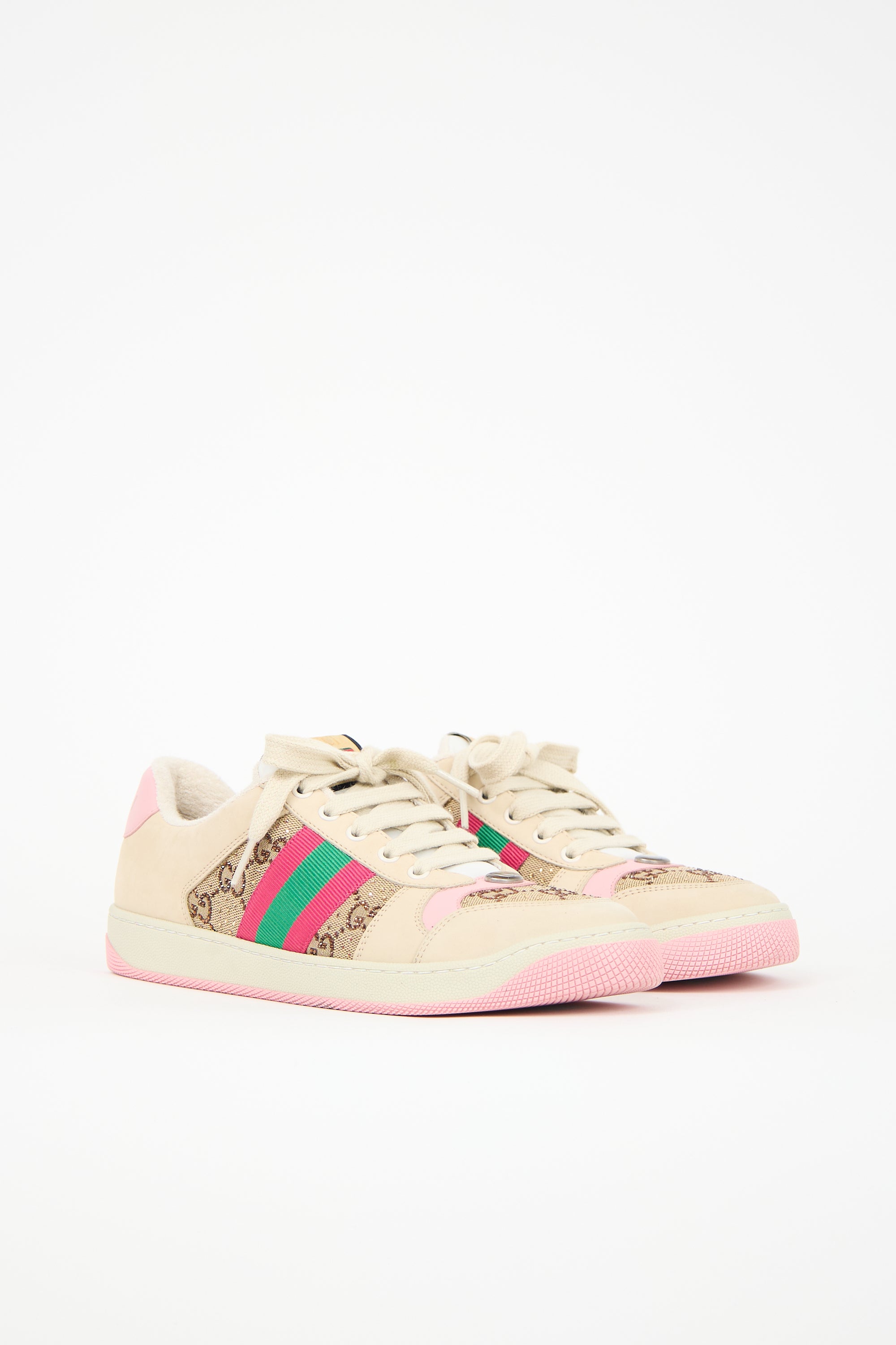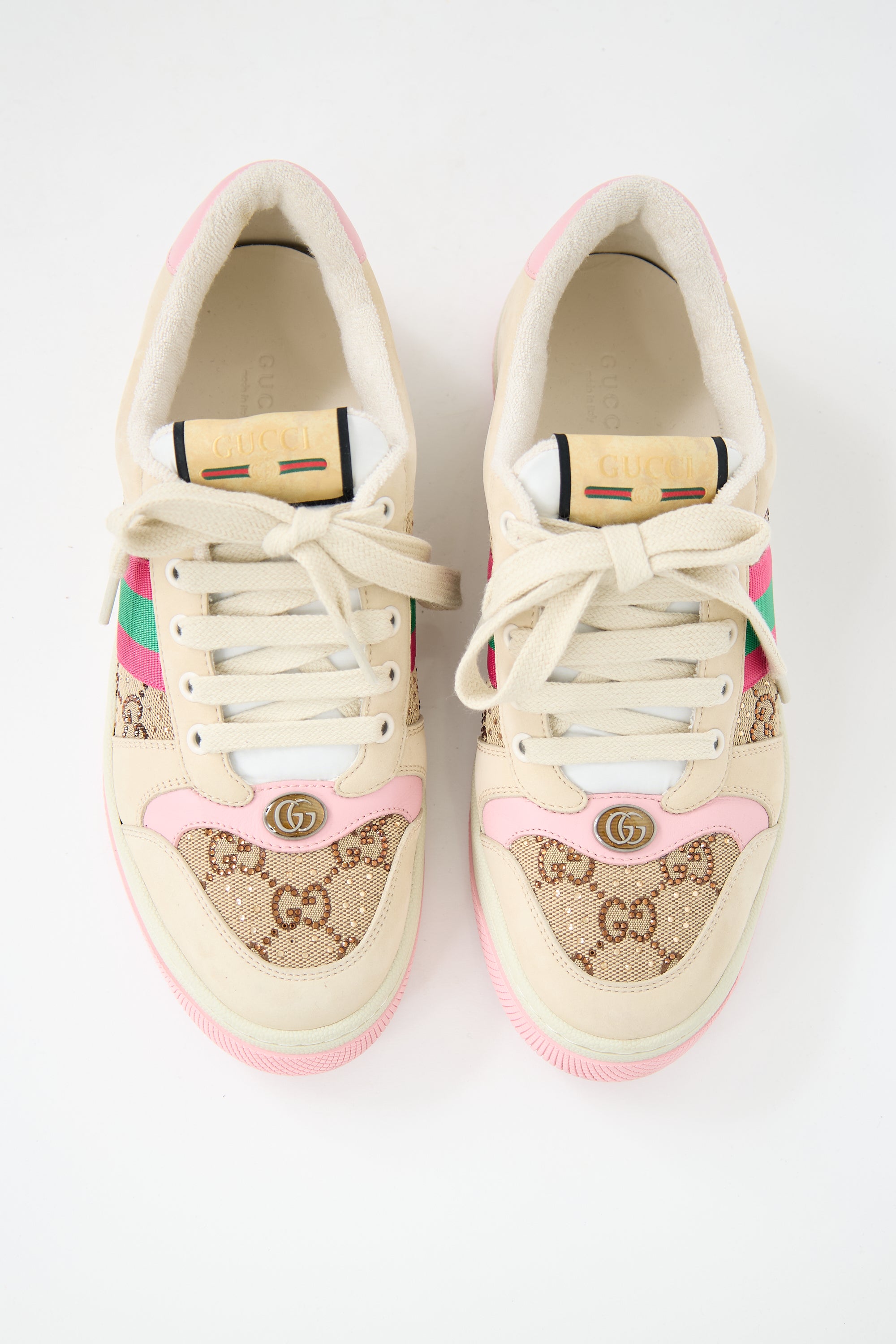 Pre-owned Gucci beige and multicolour leather and textile Screener sneakers featuring rounded toe, sequin monogram upper, lace up front, logo tab at tongue, and stamped logo at counter.