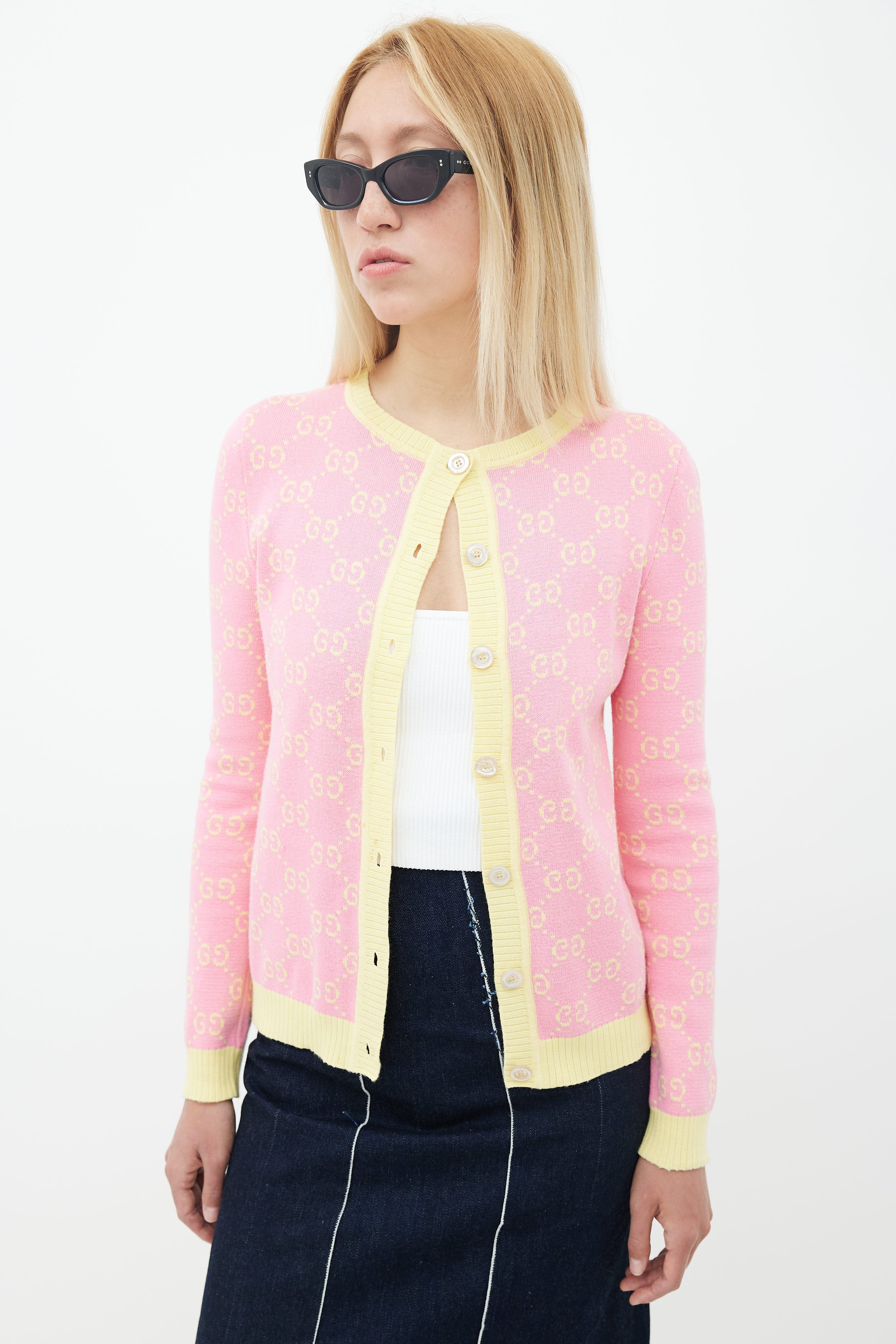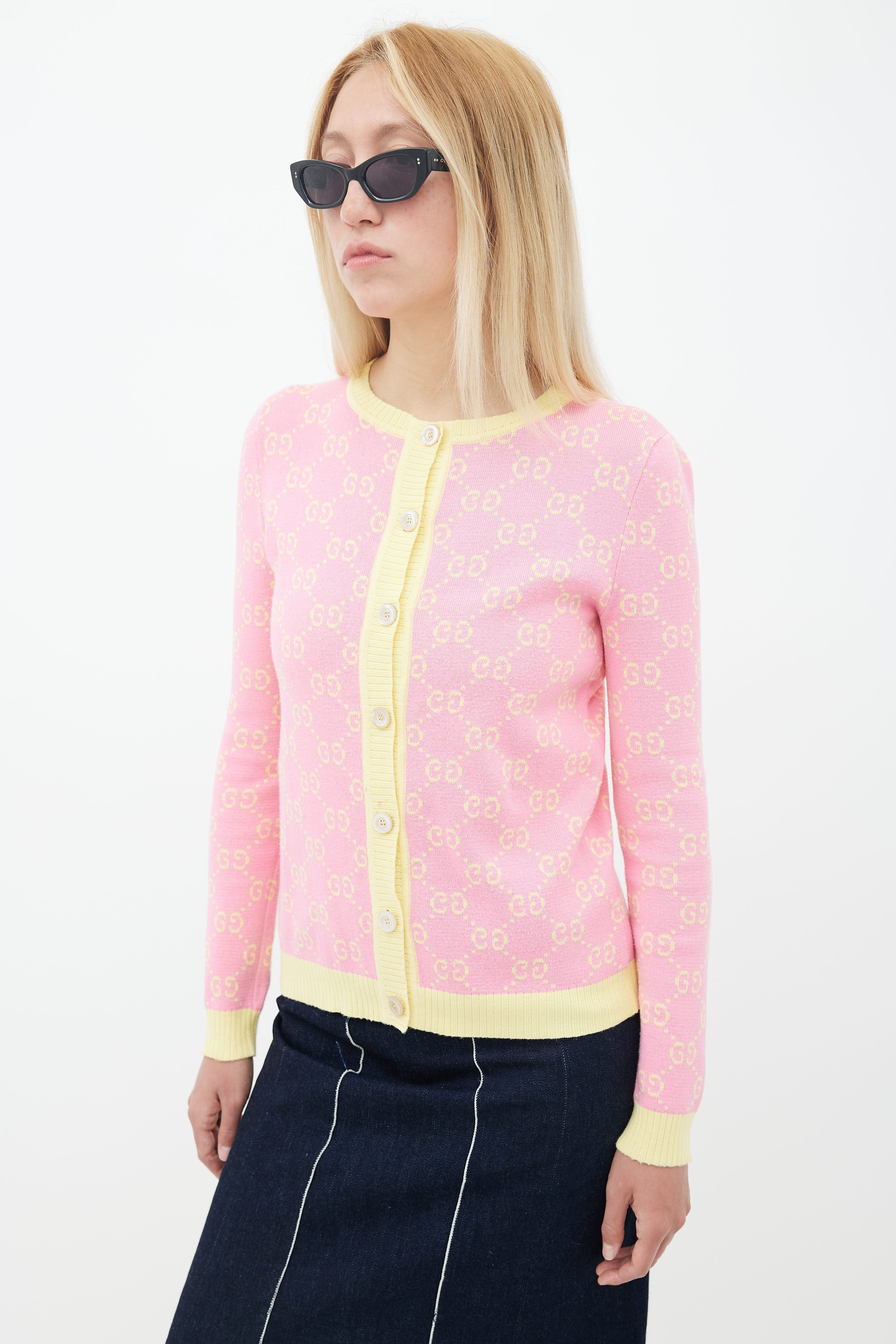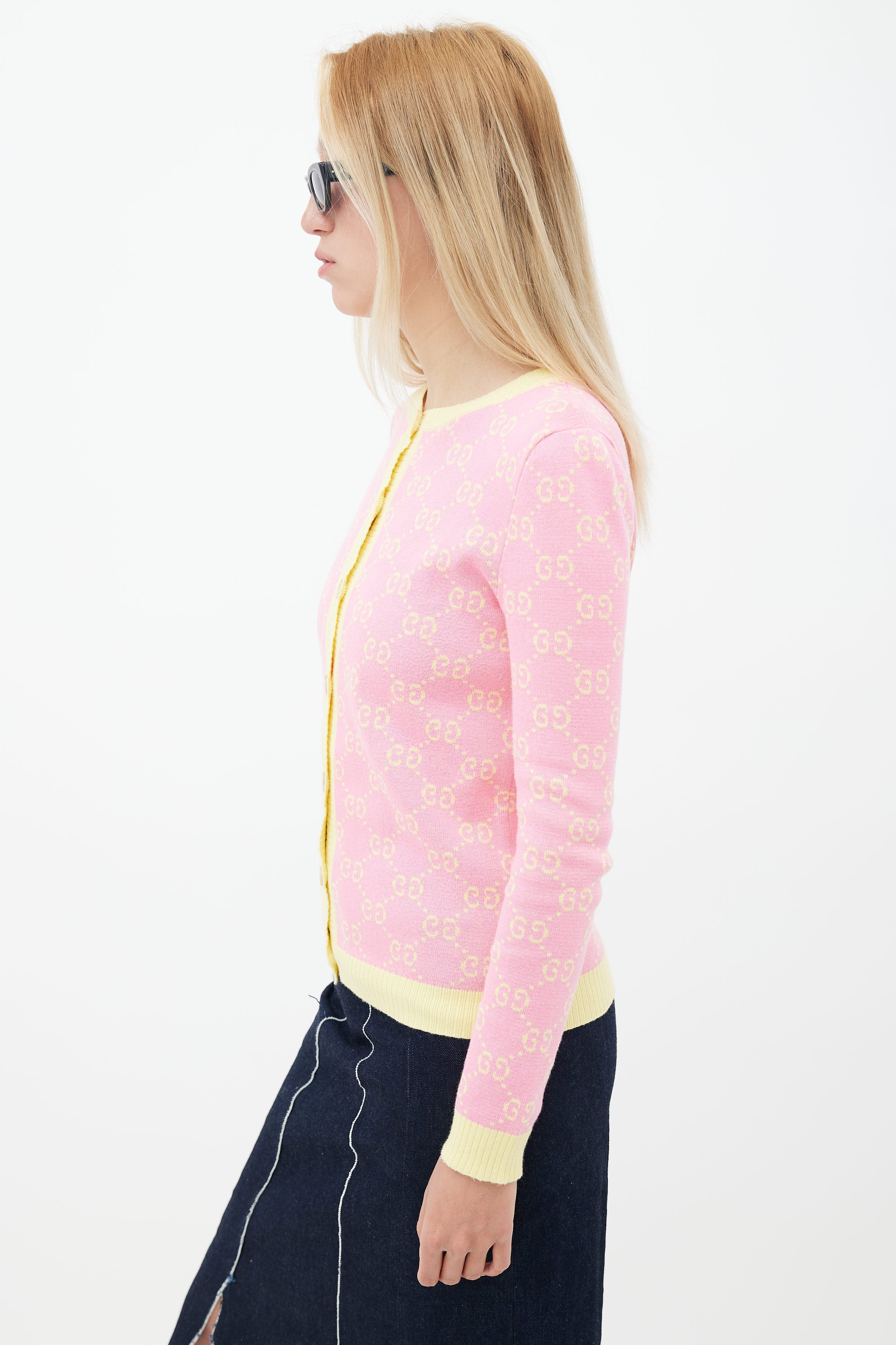 Pre-owned Gucci pink and yellow knit cardigan featuring signature GG Guccissima monogram throughout, crew neckline, ribbed collar, hem and cuffs, and button up closure at front.