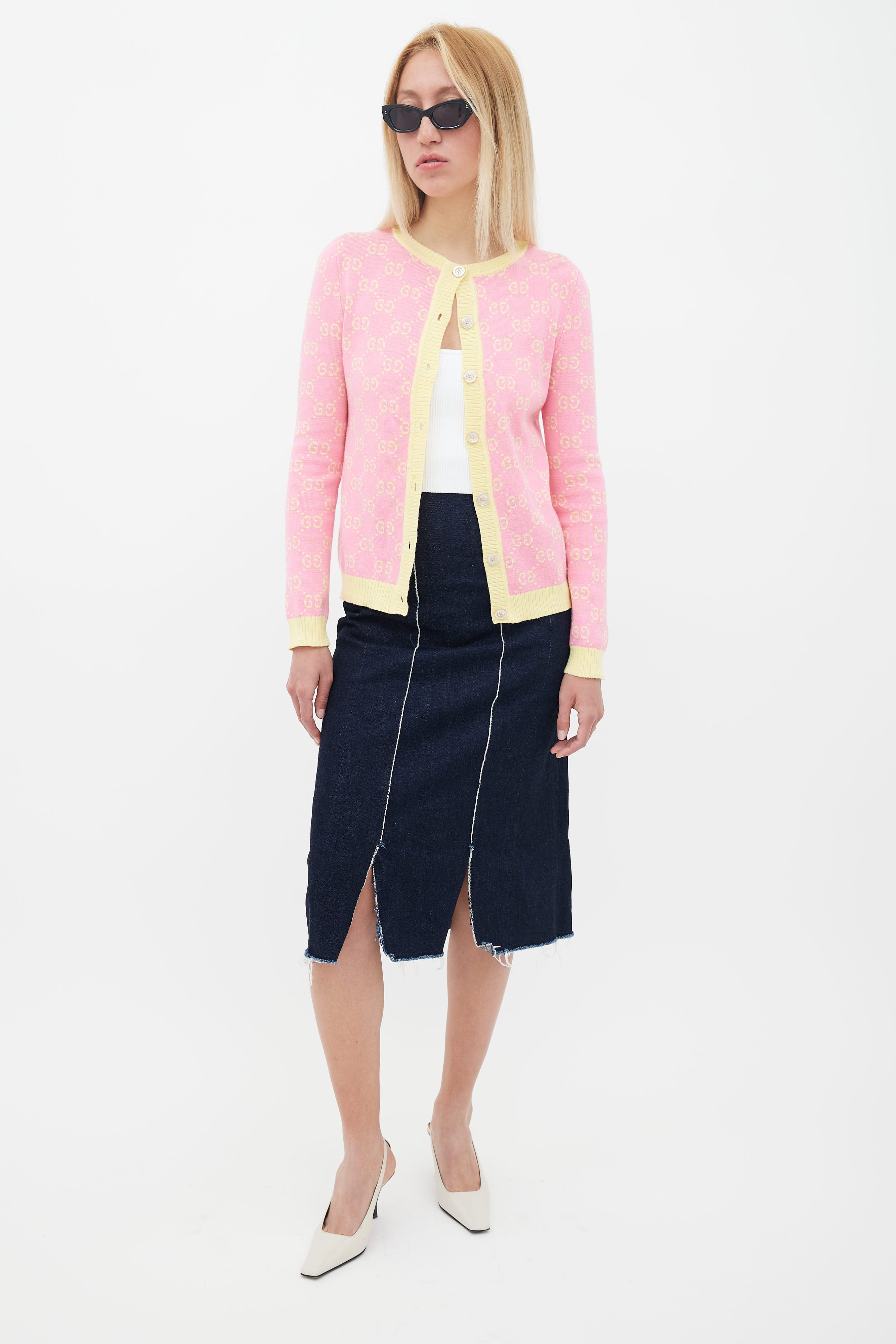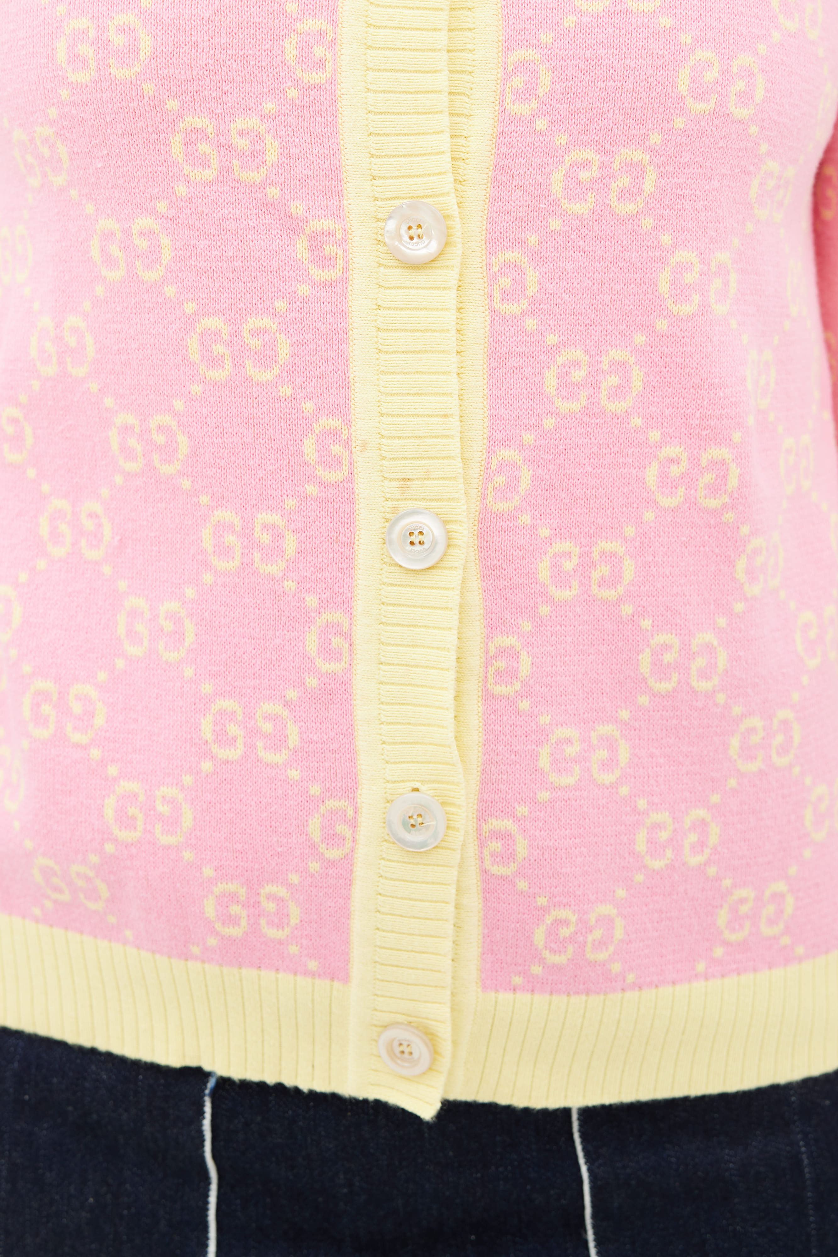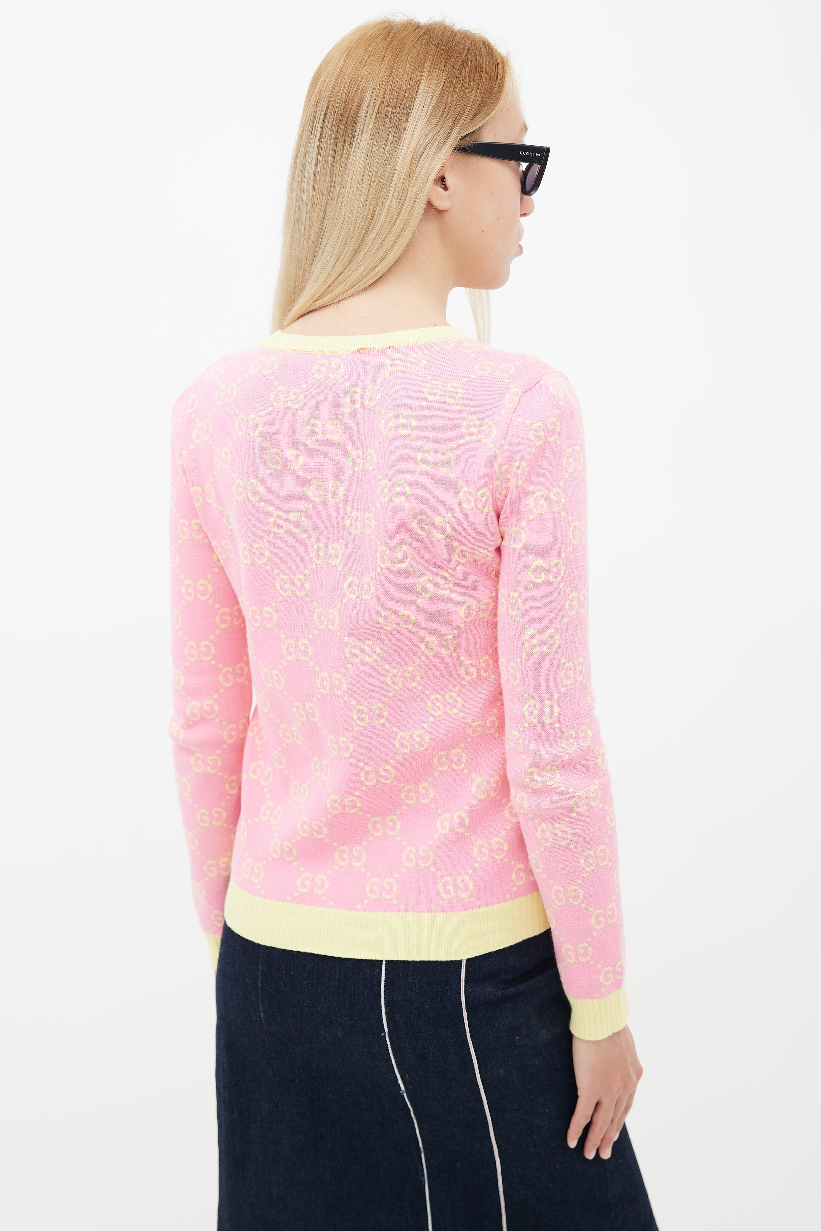 Pre-owned Gucci pink and yellow knit cardigan featuring signature GG Guccissima monogram throughout, crew neckline, ribbed collar, hem and cuffs, and button up closure at front.