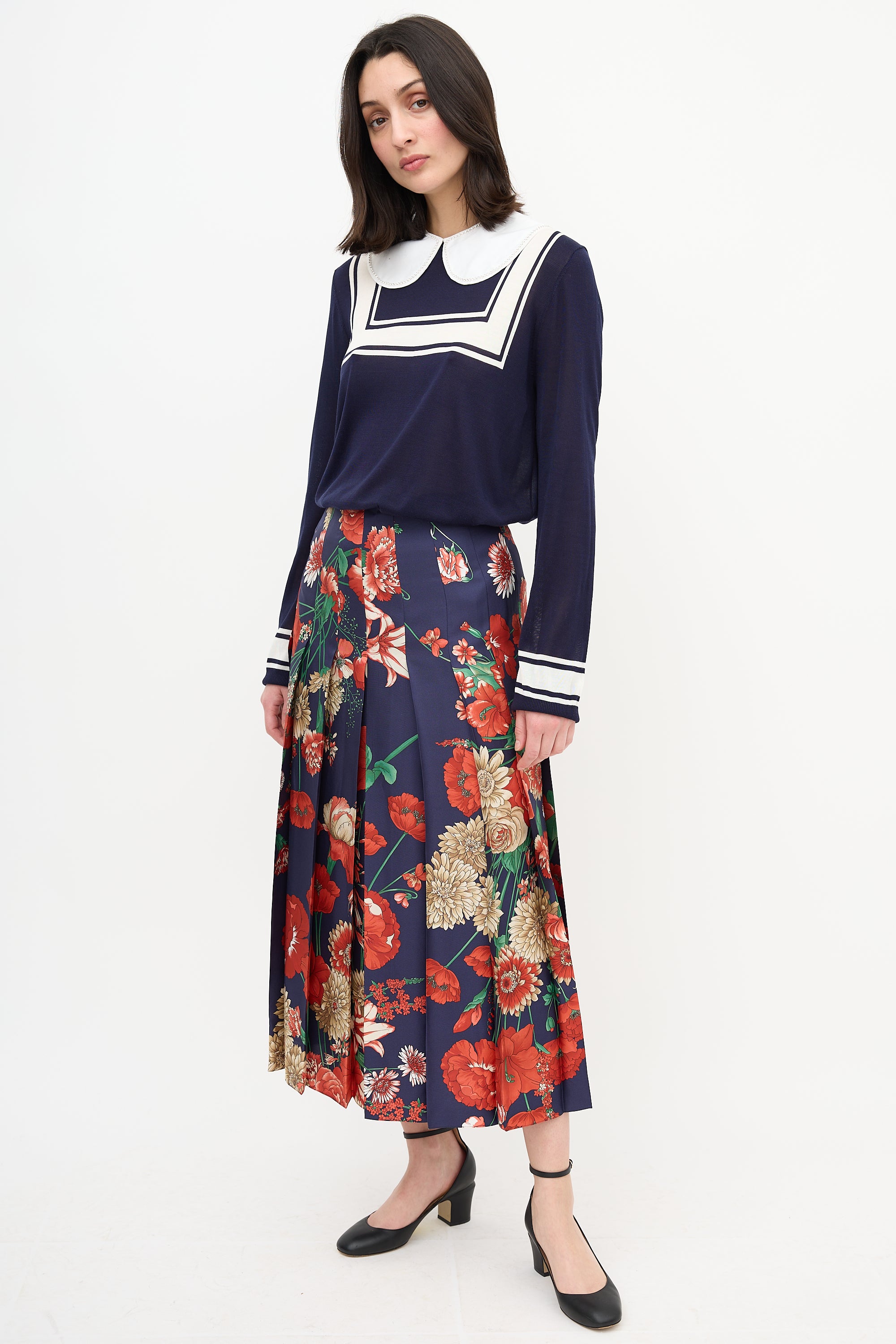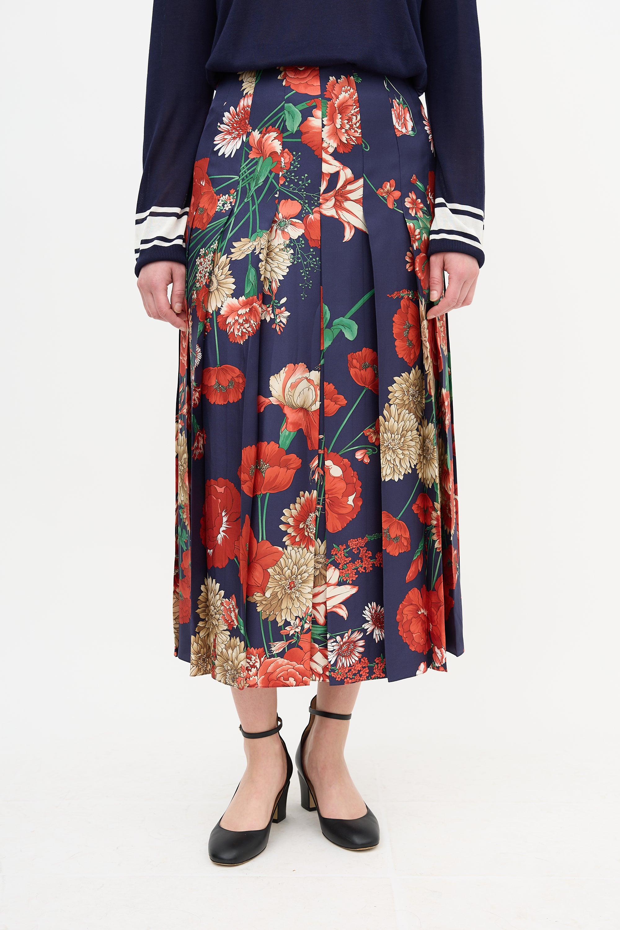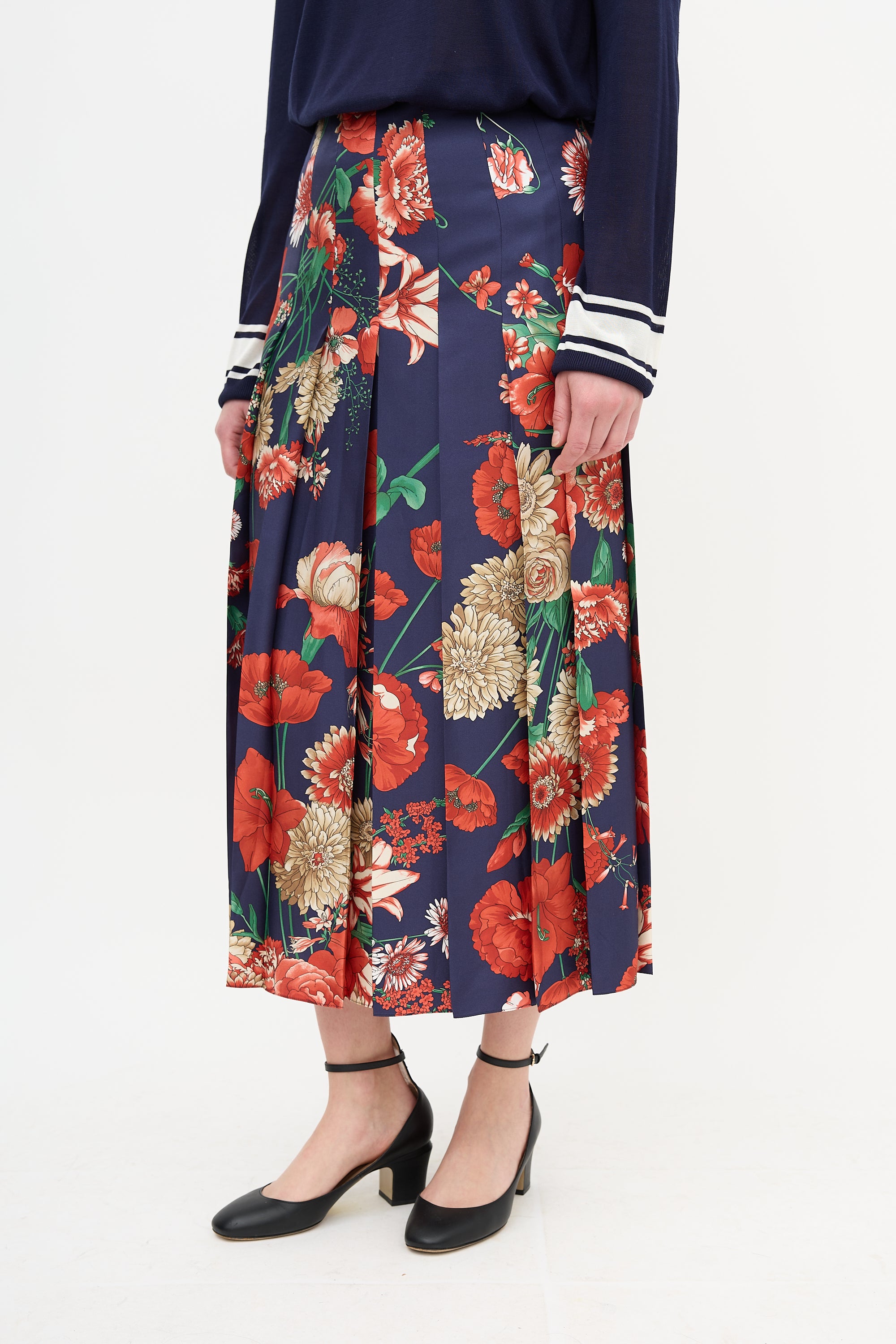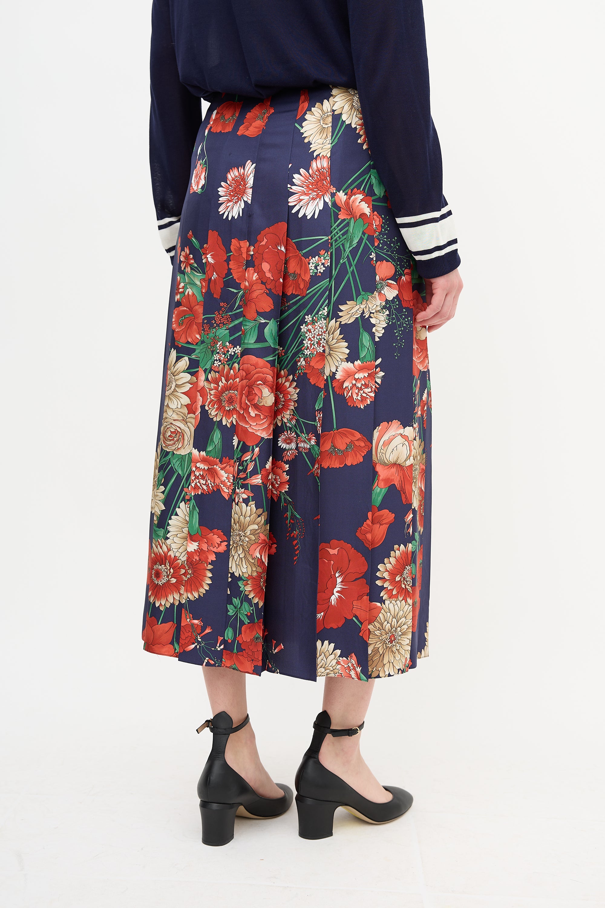 Pre-owned Gucci Pre-Fall 2018 navy and multicolour silk midi skirt featuring a back zip closure with hook fastening, pleating throughout, and a floral print.