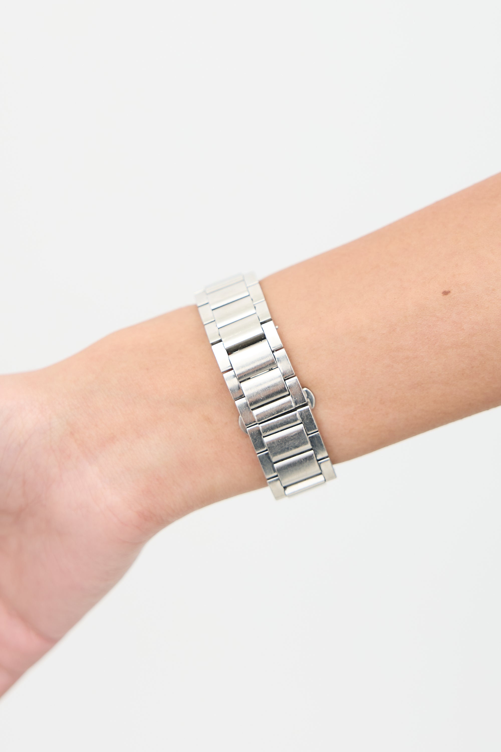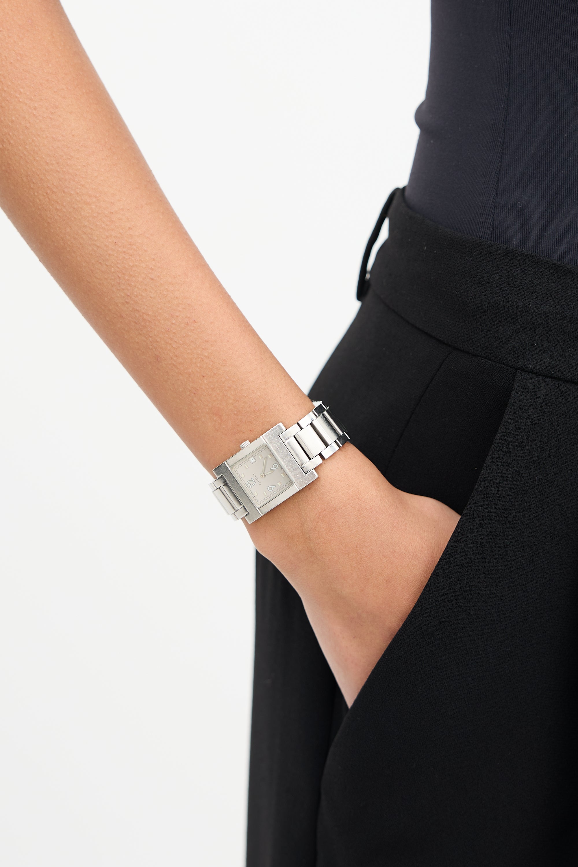 Pre-owned Gucci silver tone stainless steel 7700L wristwatch featuring a 25mm wide square case, silver tone dial with black logo and white markers and hands, date display at 3 o'clock, three row watch band, and deployant clasp closure.