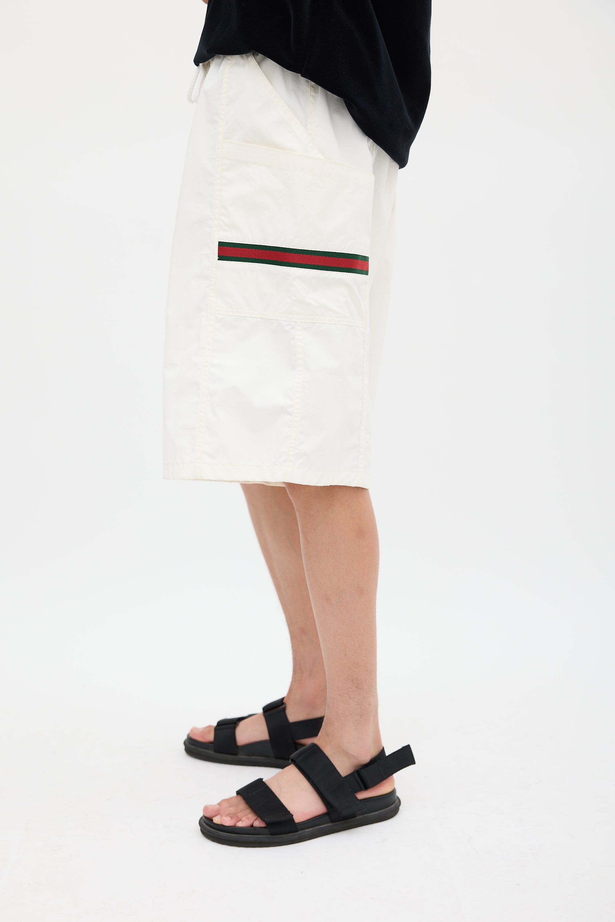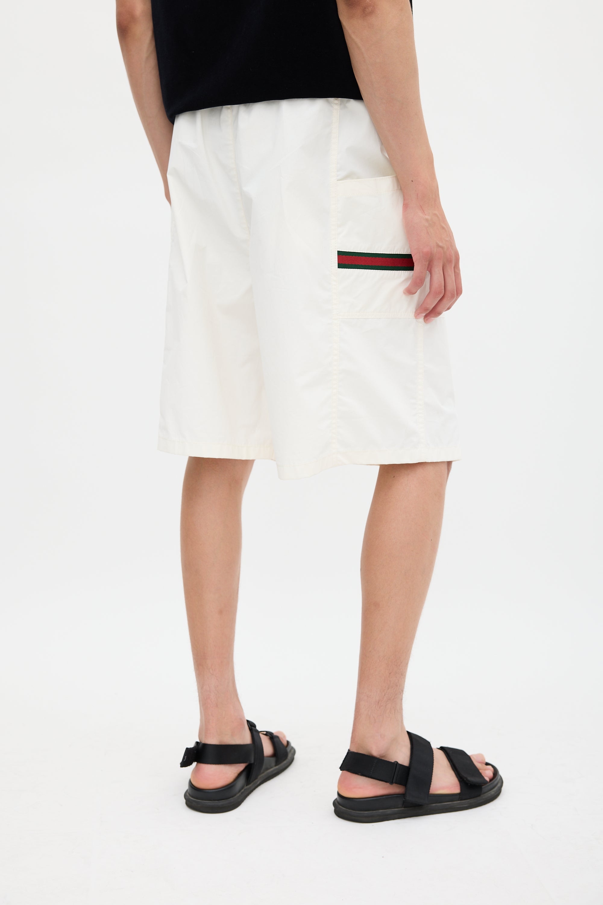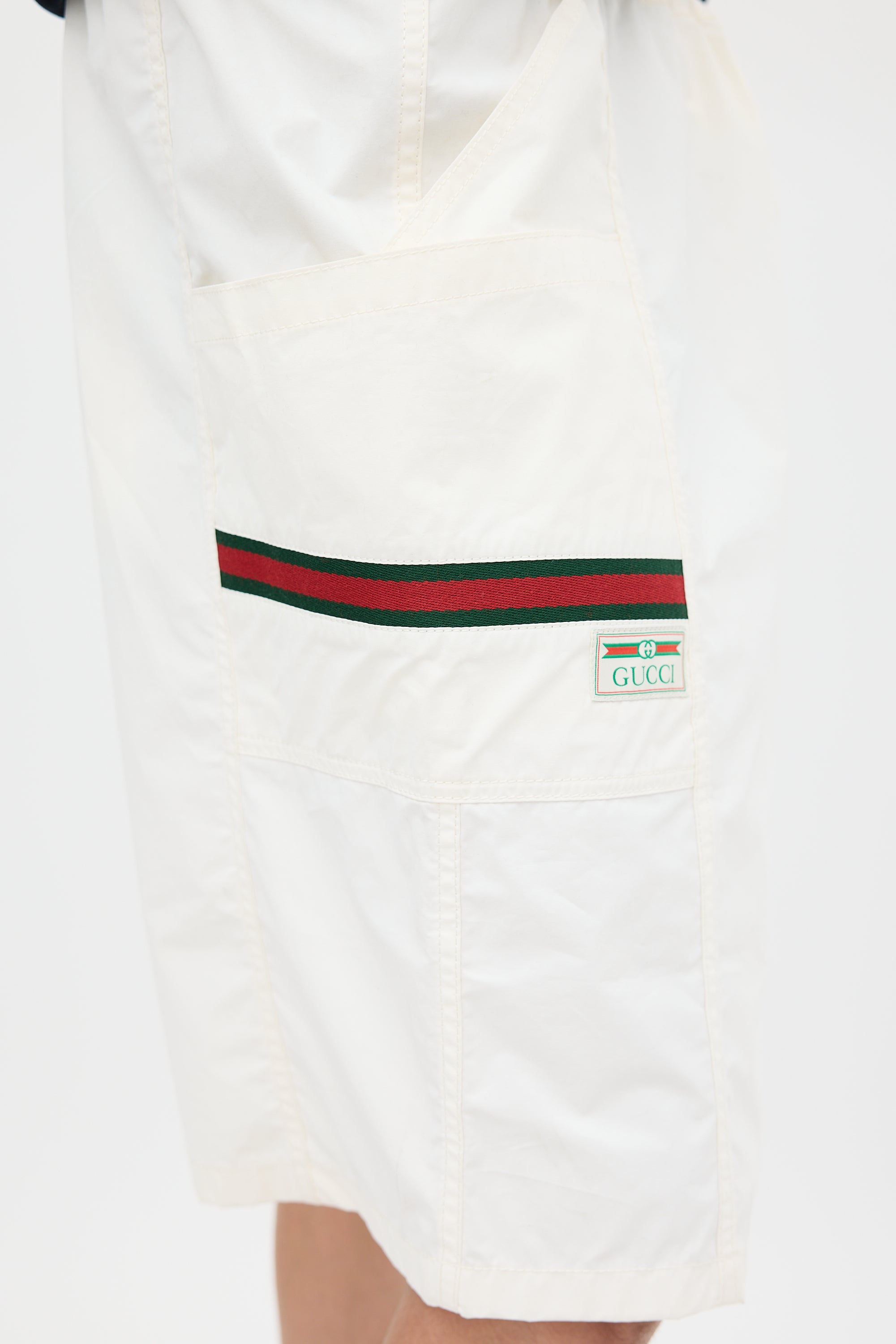 Pre-owned Gucci white cotton canvas shorts feauting a drawstring waist, two front slip pockets, two side patch pockets with signature red and green Web stripe, and logo label at right patch pocket. Clipped to fit model.