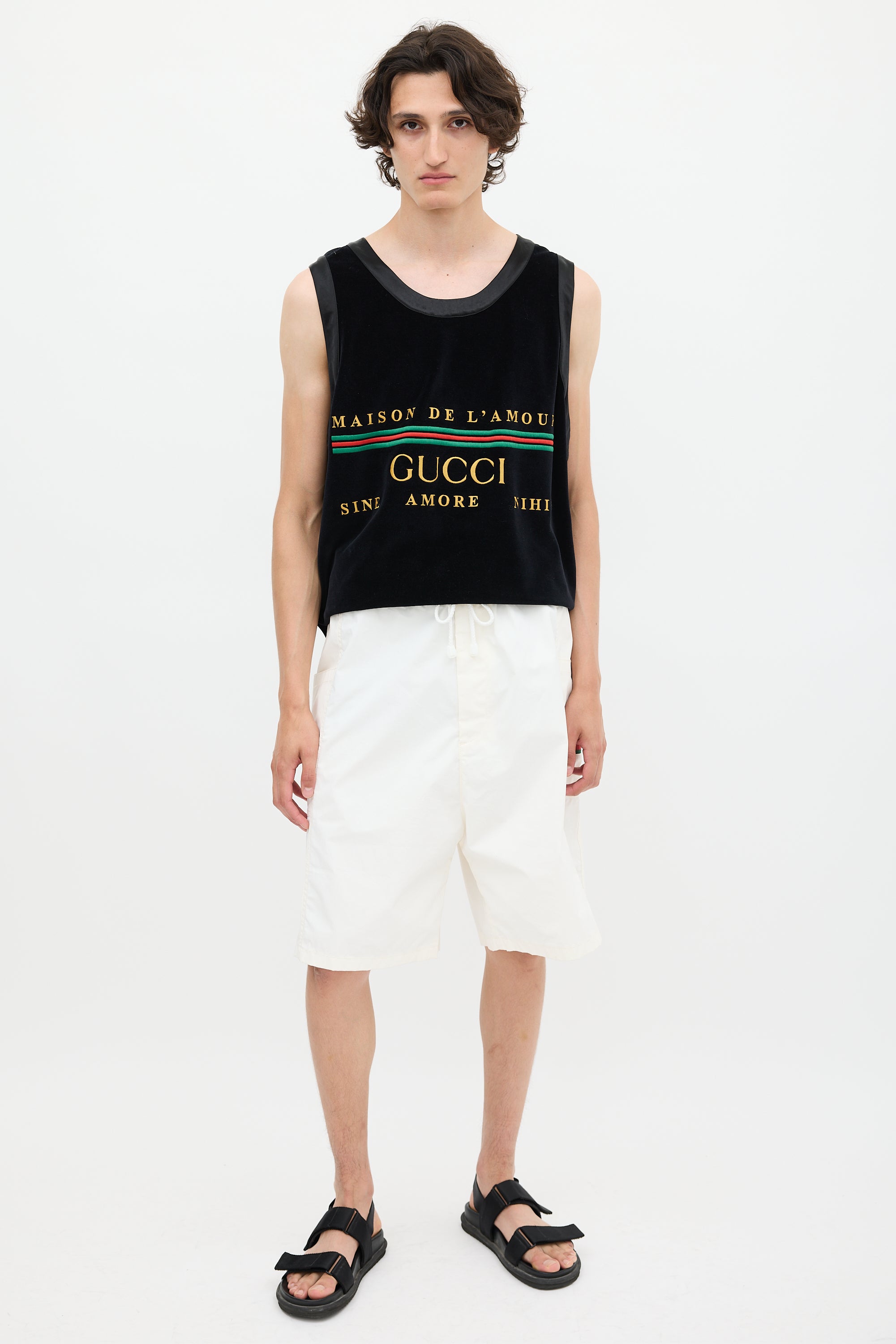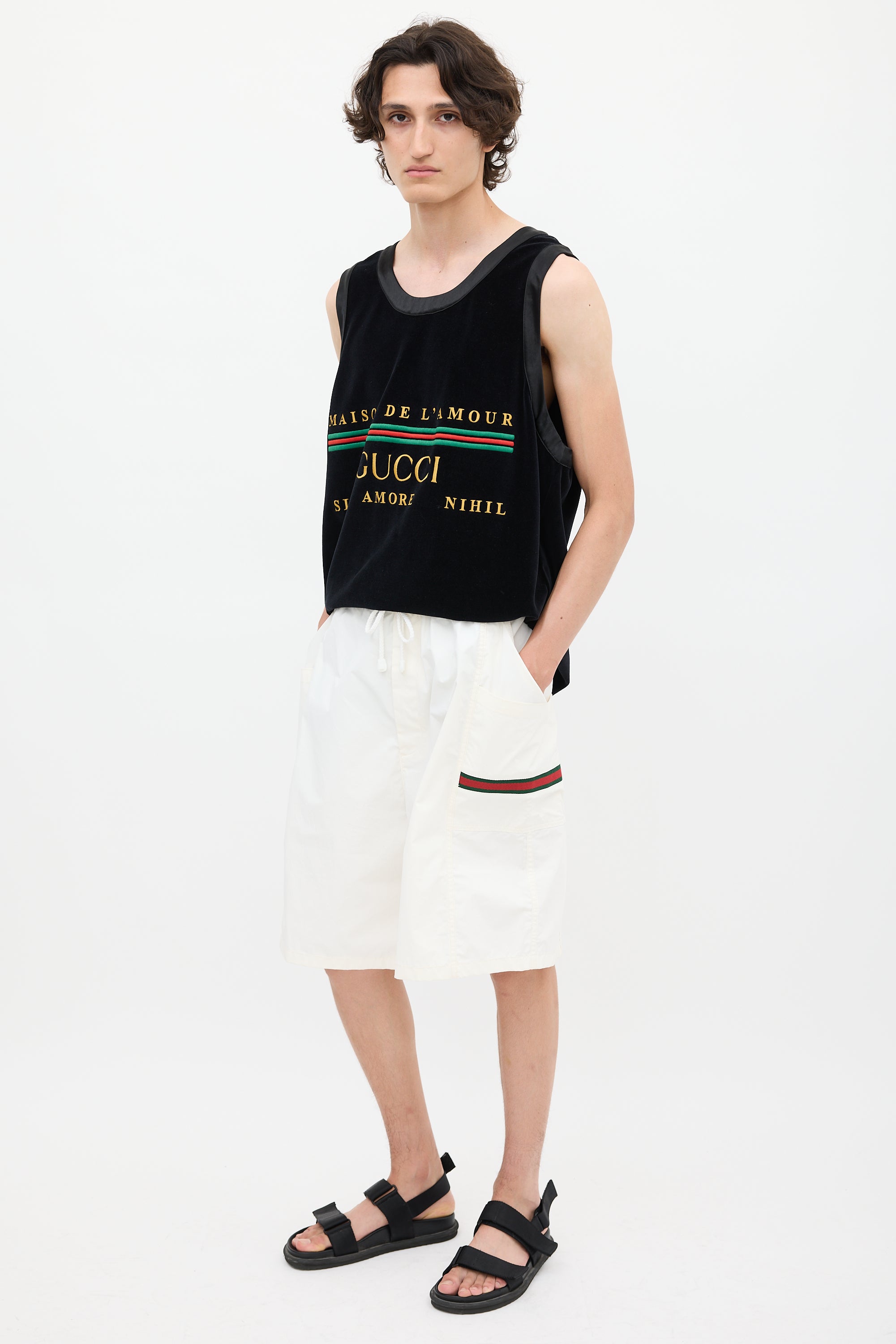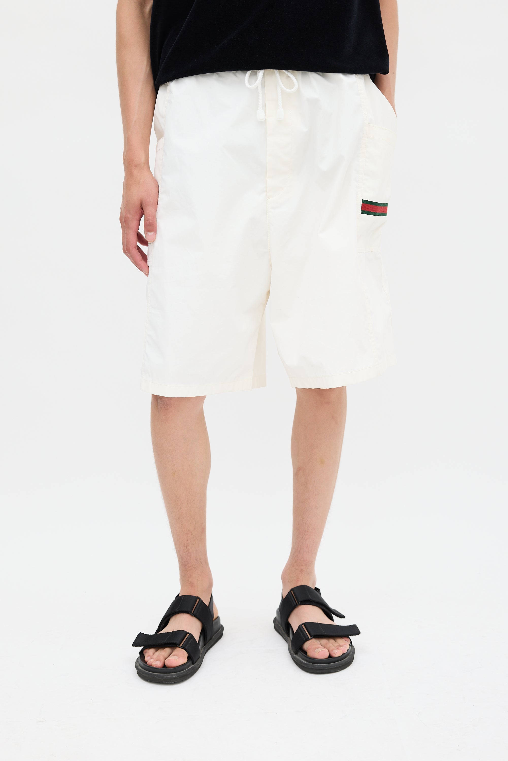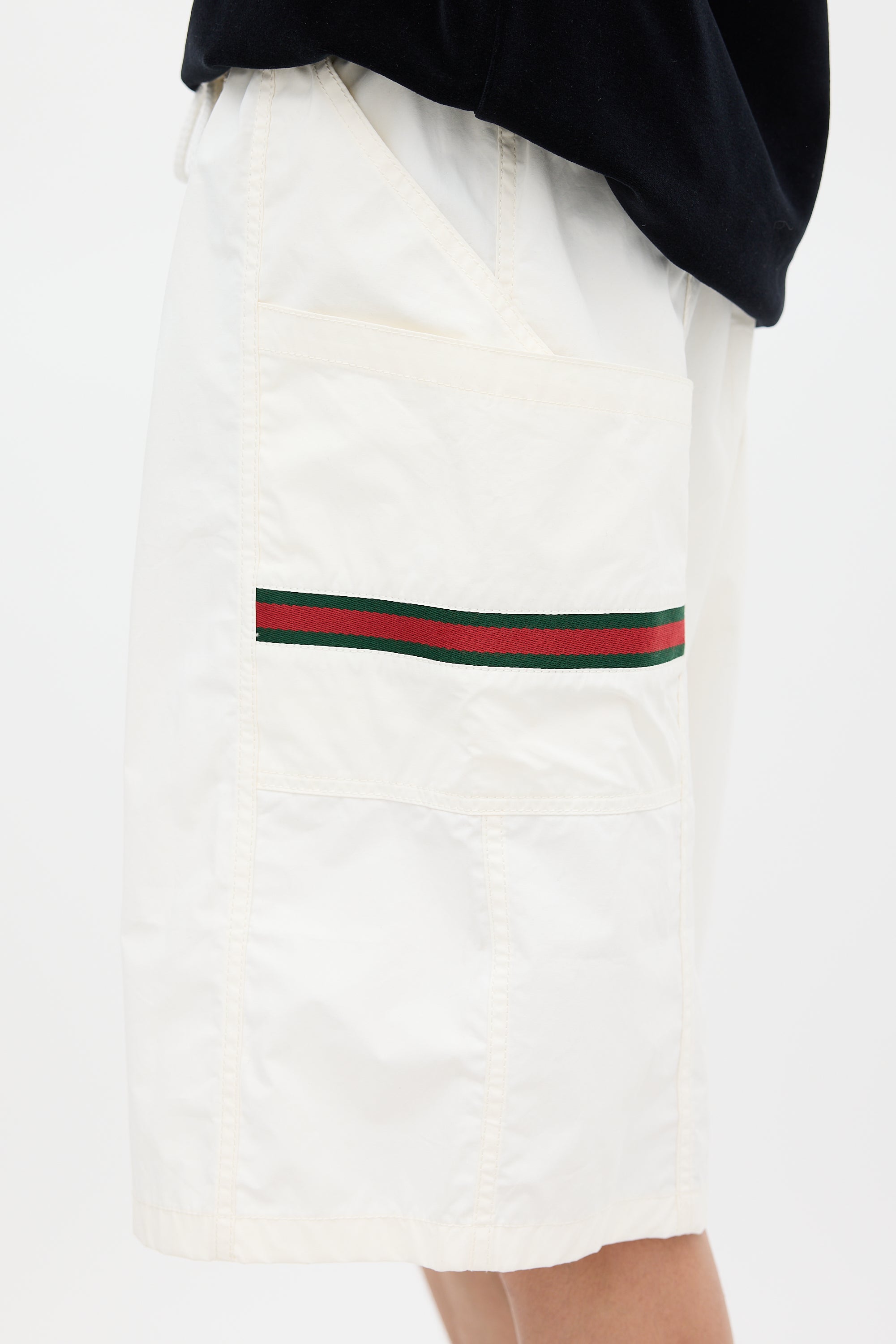 Pre-owned Gucci white cotton canvas shorts feauting a drawstring waist, two front slip pockets, two side patch pockets with signature red and green Web stripe, and logo label at right patch pocket. Clipped to fit model.