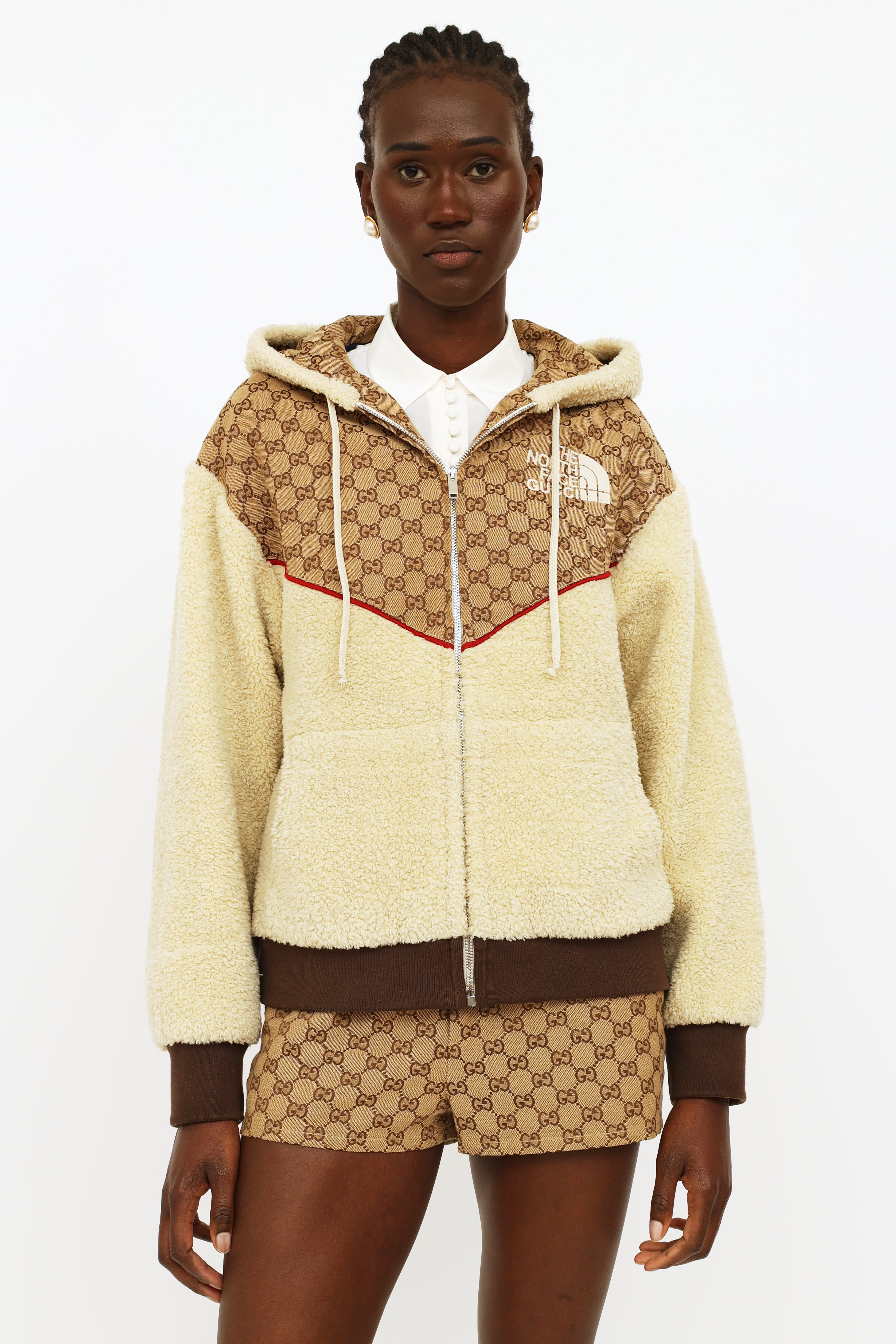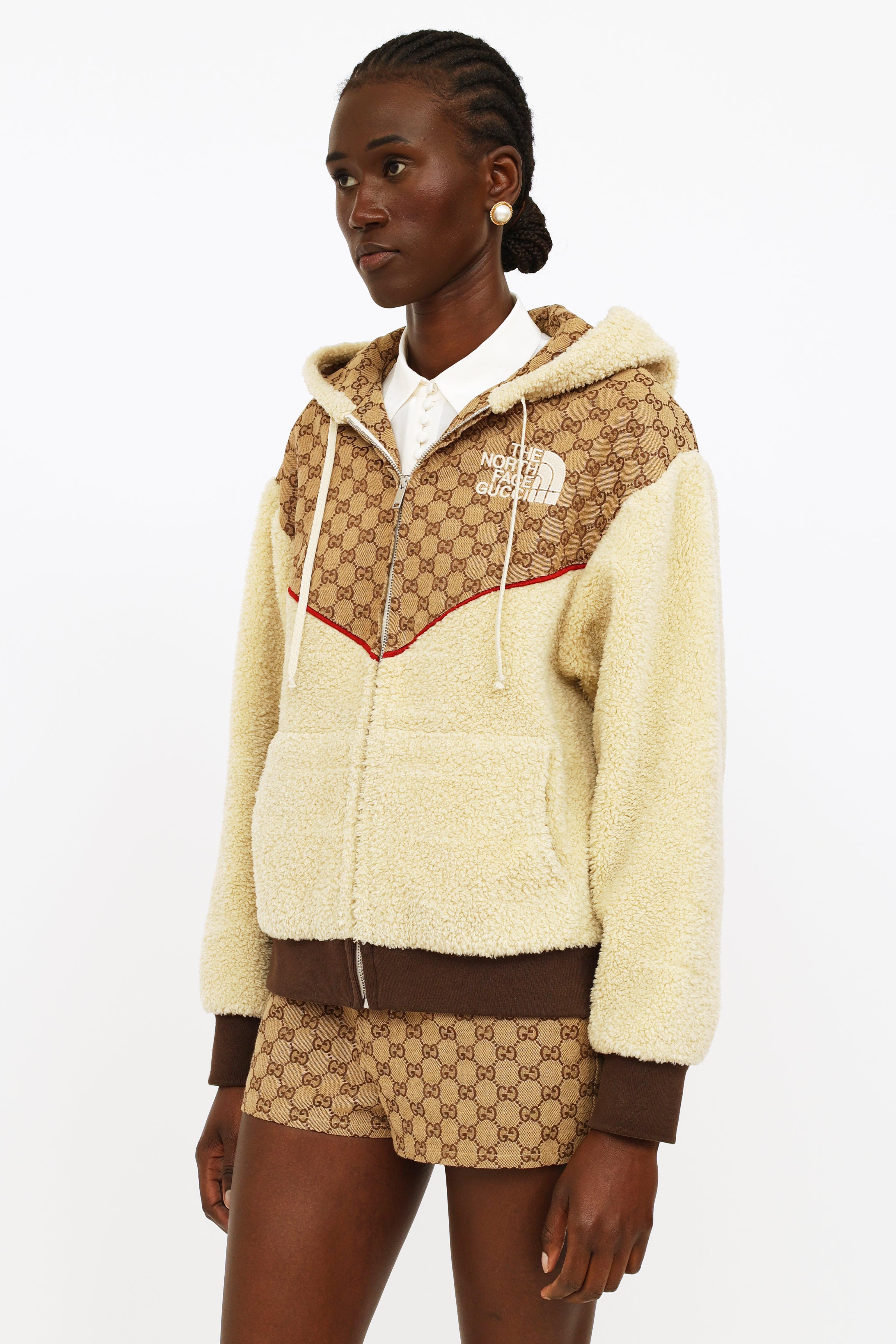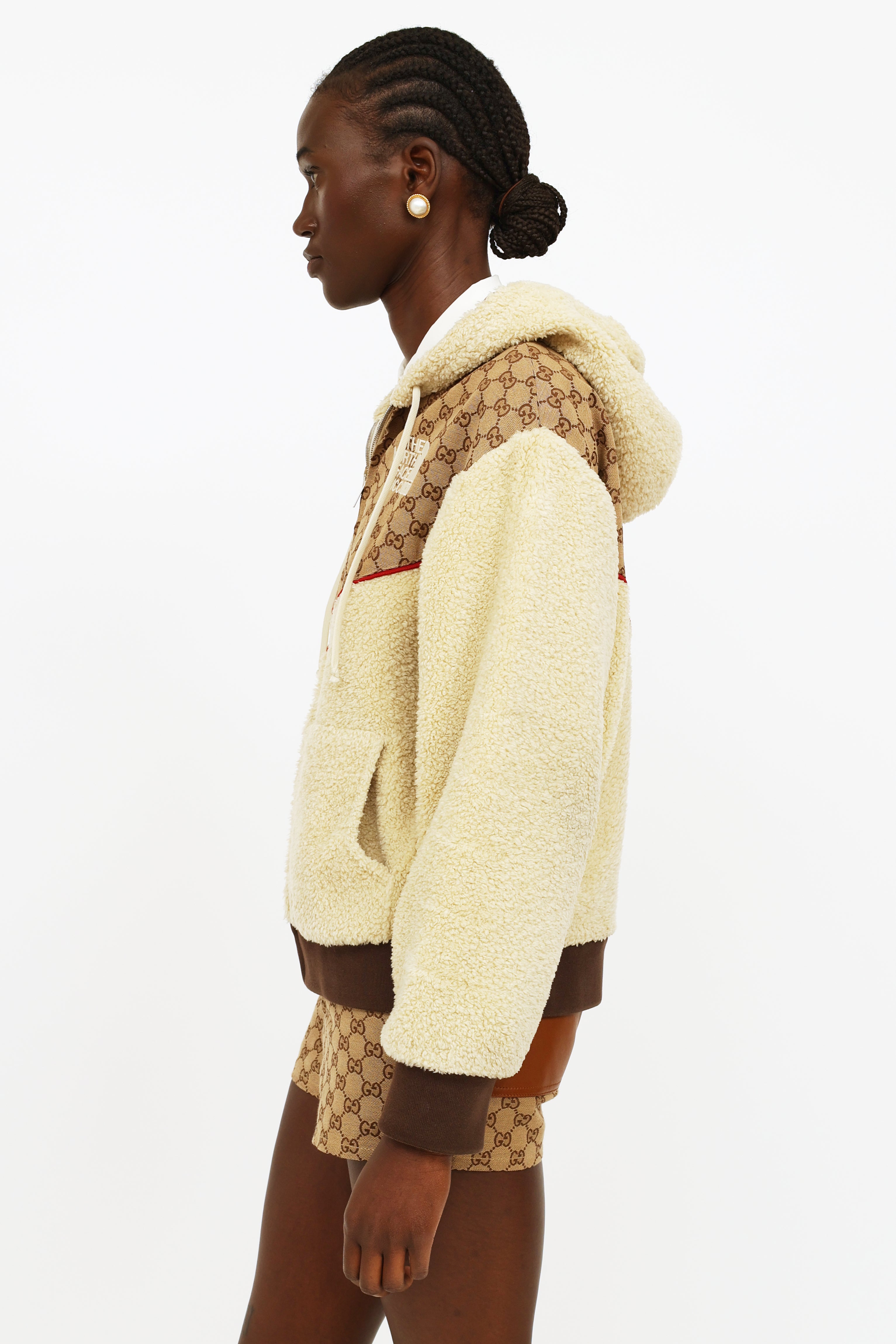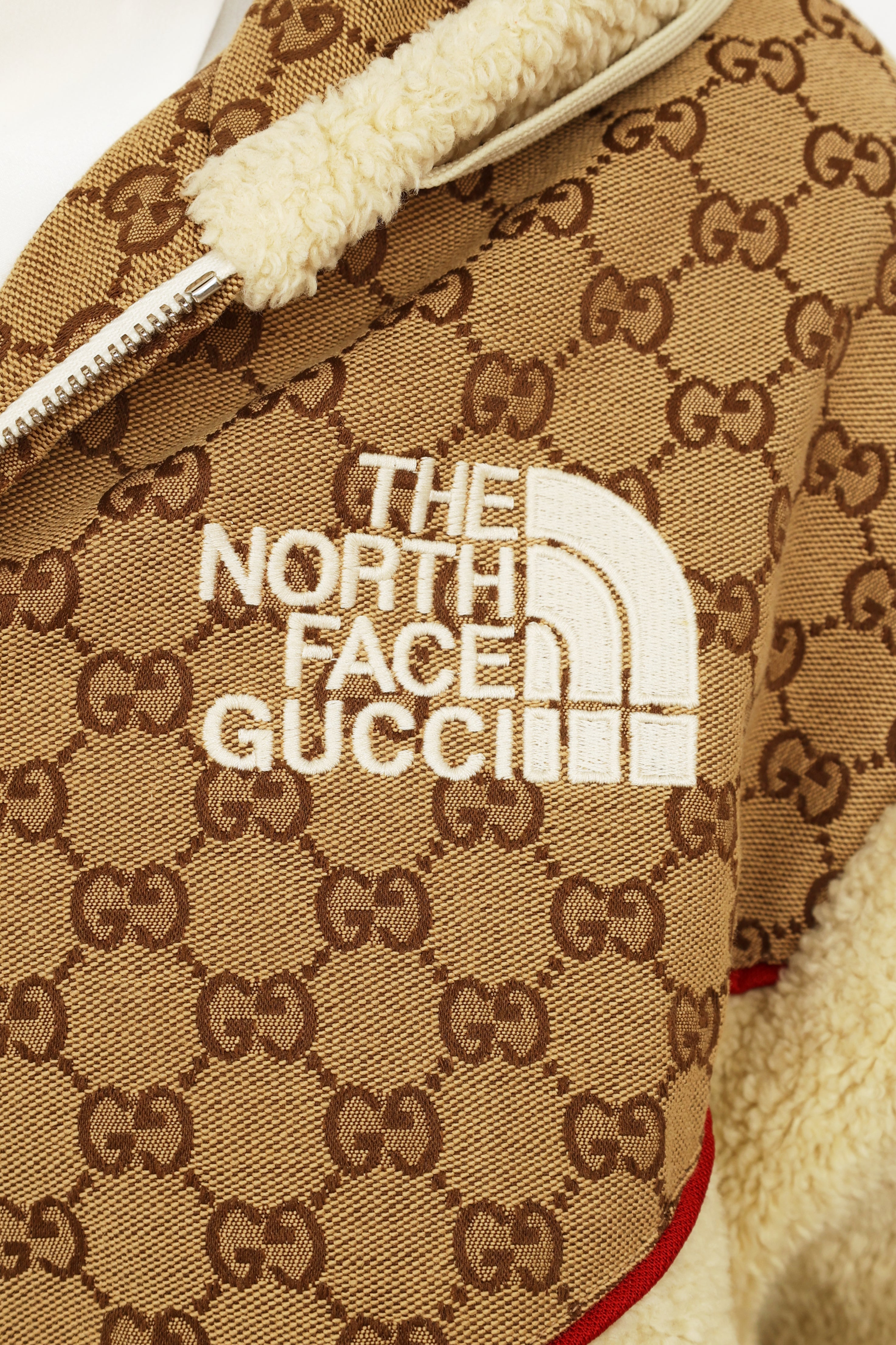 Gucci x TNF GG canvas shearling jacket featuring cream shearling with ebony GG canvas detailing and red trim, hood with a drawstring, full length sleeves with rib knit cuffs, zip closure at center front, dual pockets, rib knit waist band, The North Face Gucci logo embroidered on left chest, Western style yoke on back and fully line.