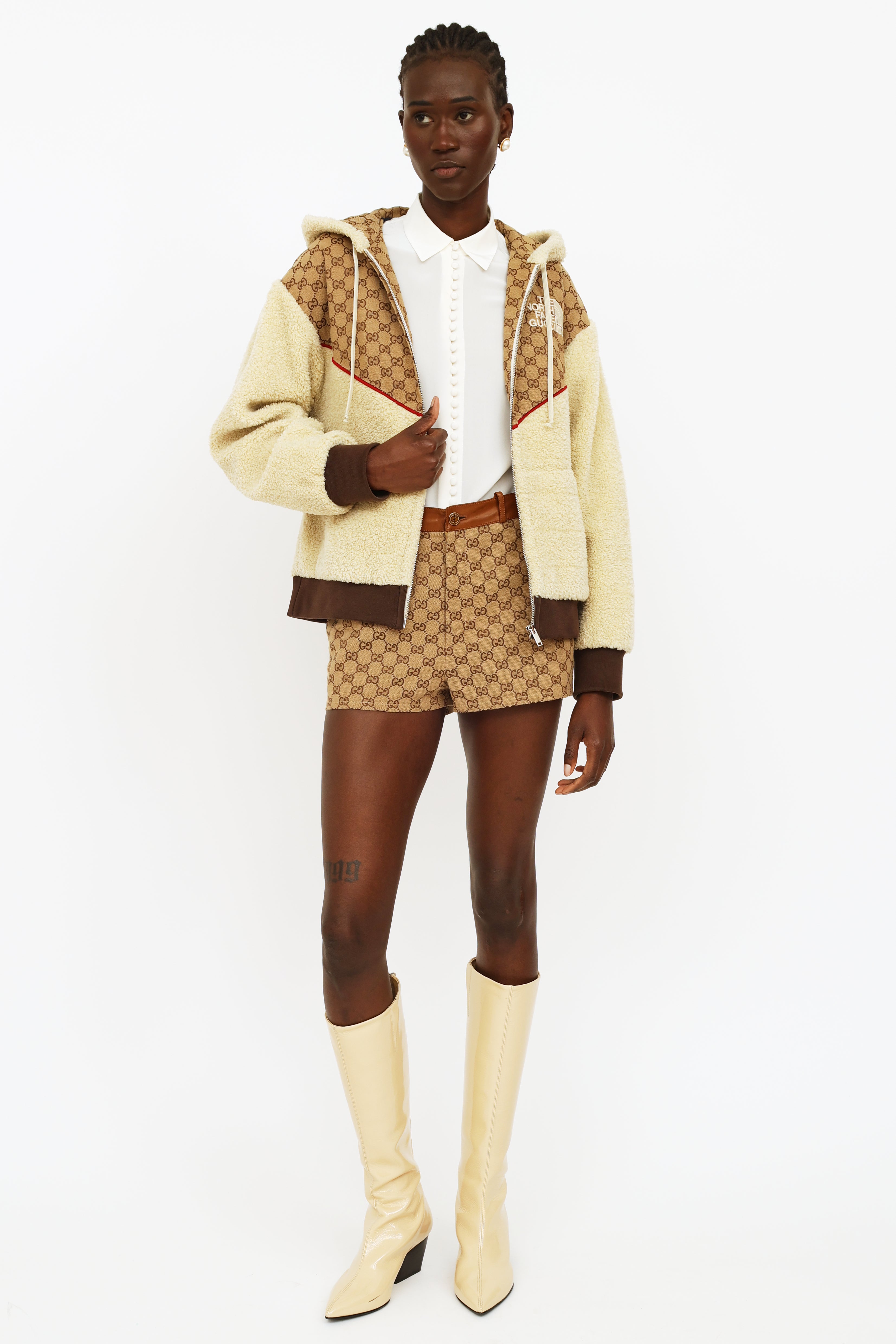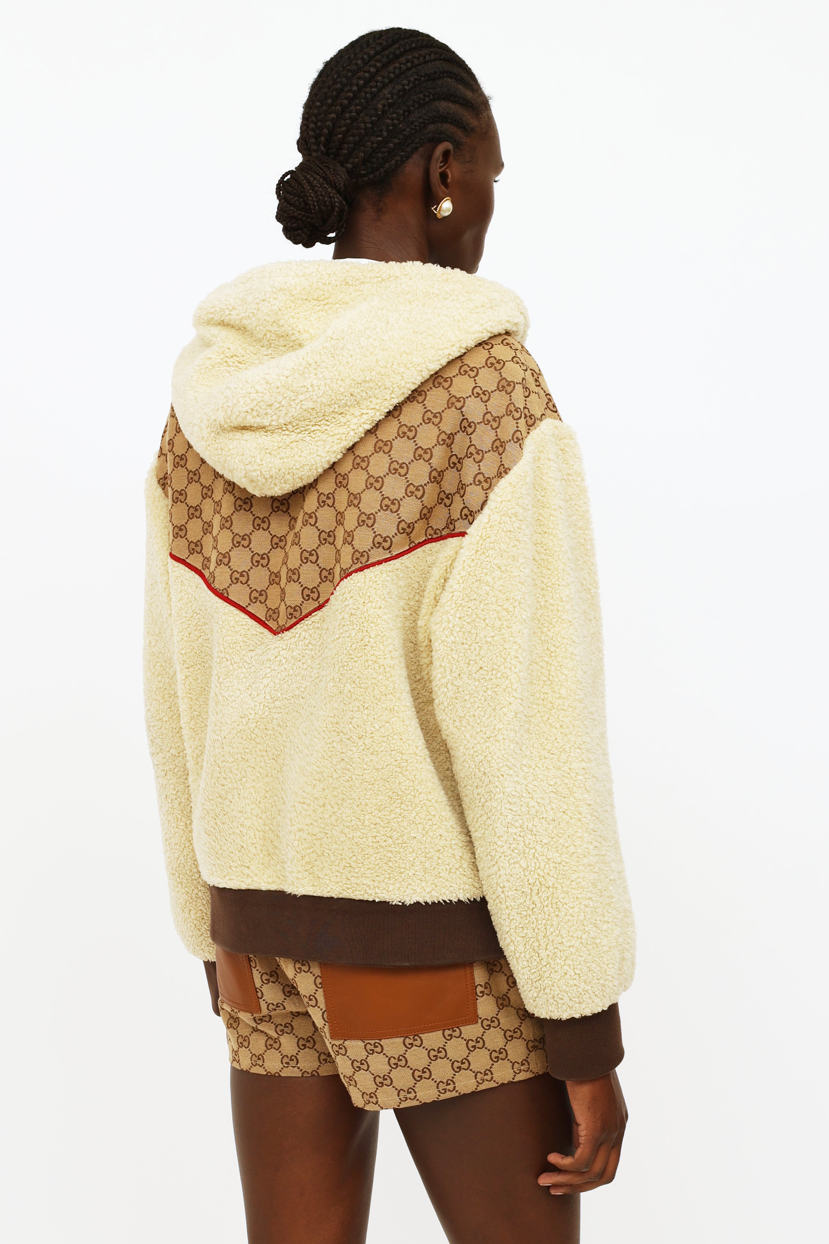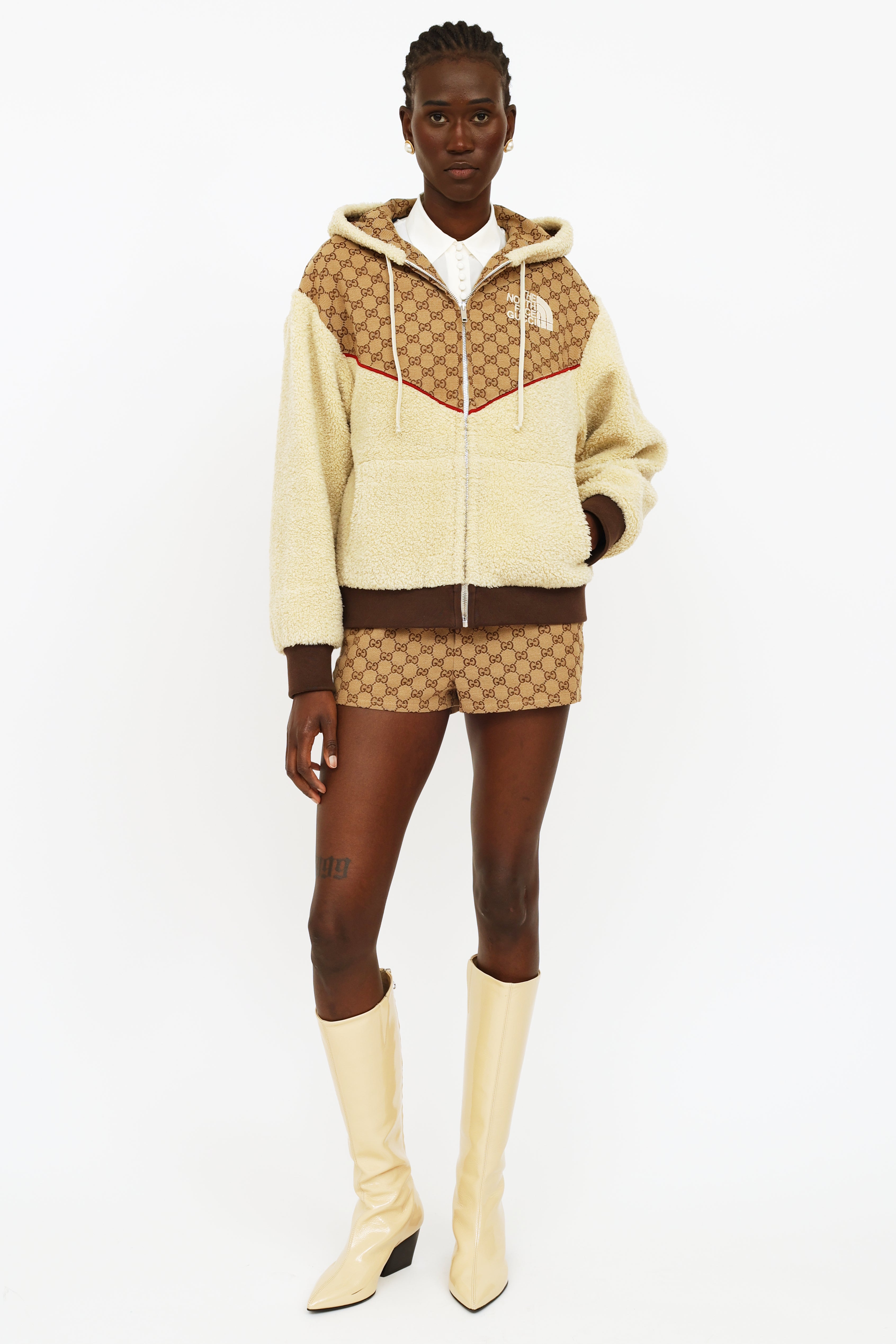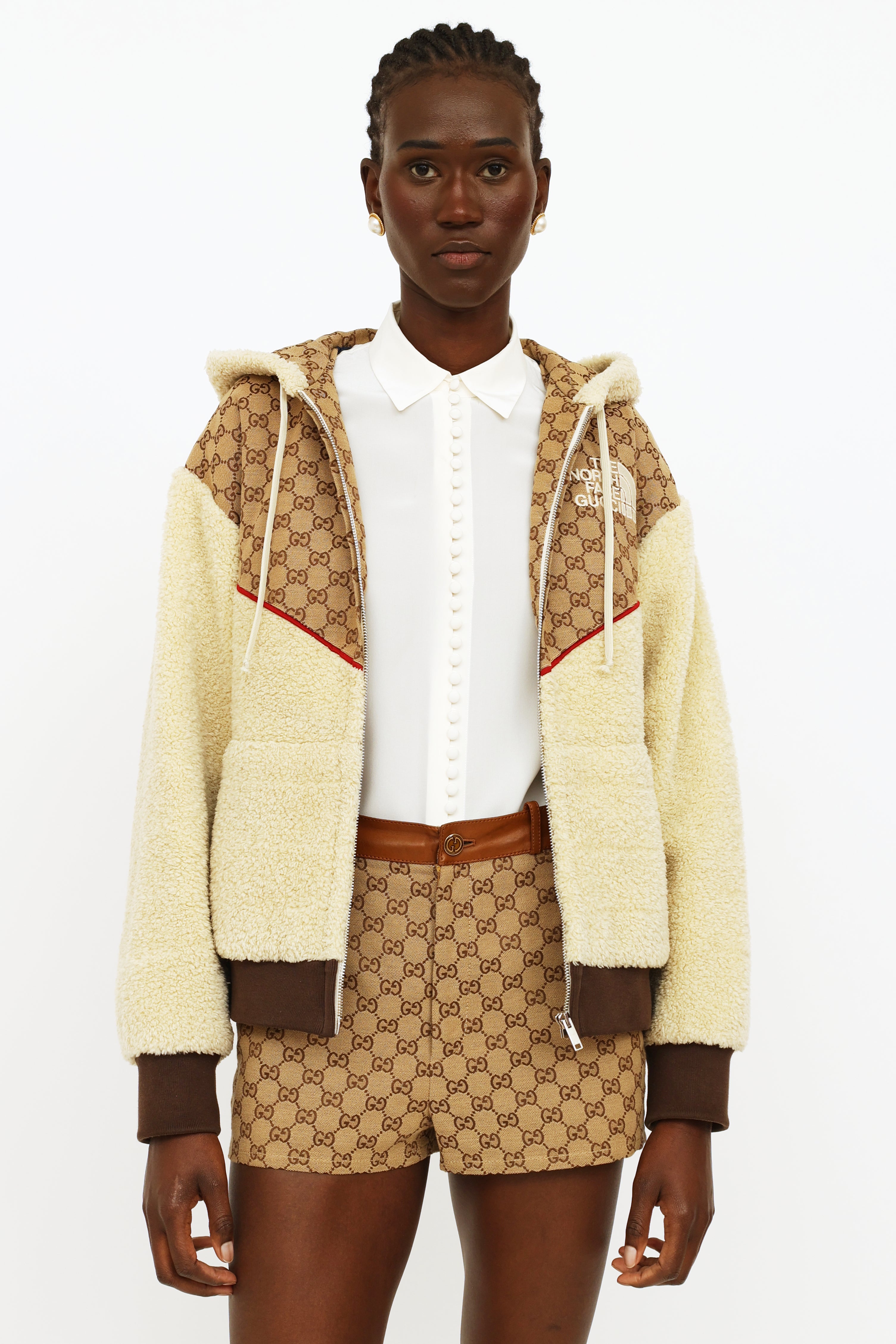 Gucci x TNF GG canvas shearling jacket featuring cream shearling with ebony GG canvas detailing and red trim, hood with a drawstring, full length sleeves with rib knit cuffs, zip closure at center front, dual pockets, rib knit waist band, The North Face Gucci logo embroidered on left chest, Western style yoke on back and fully line.