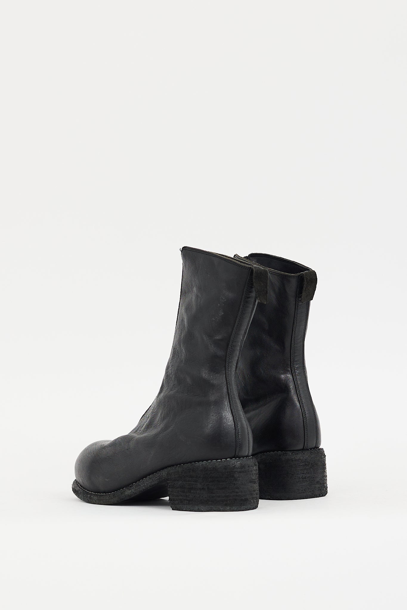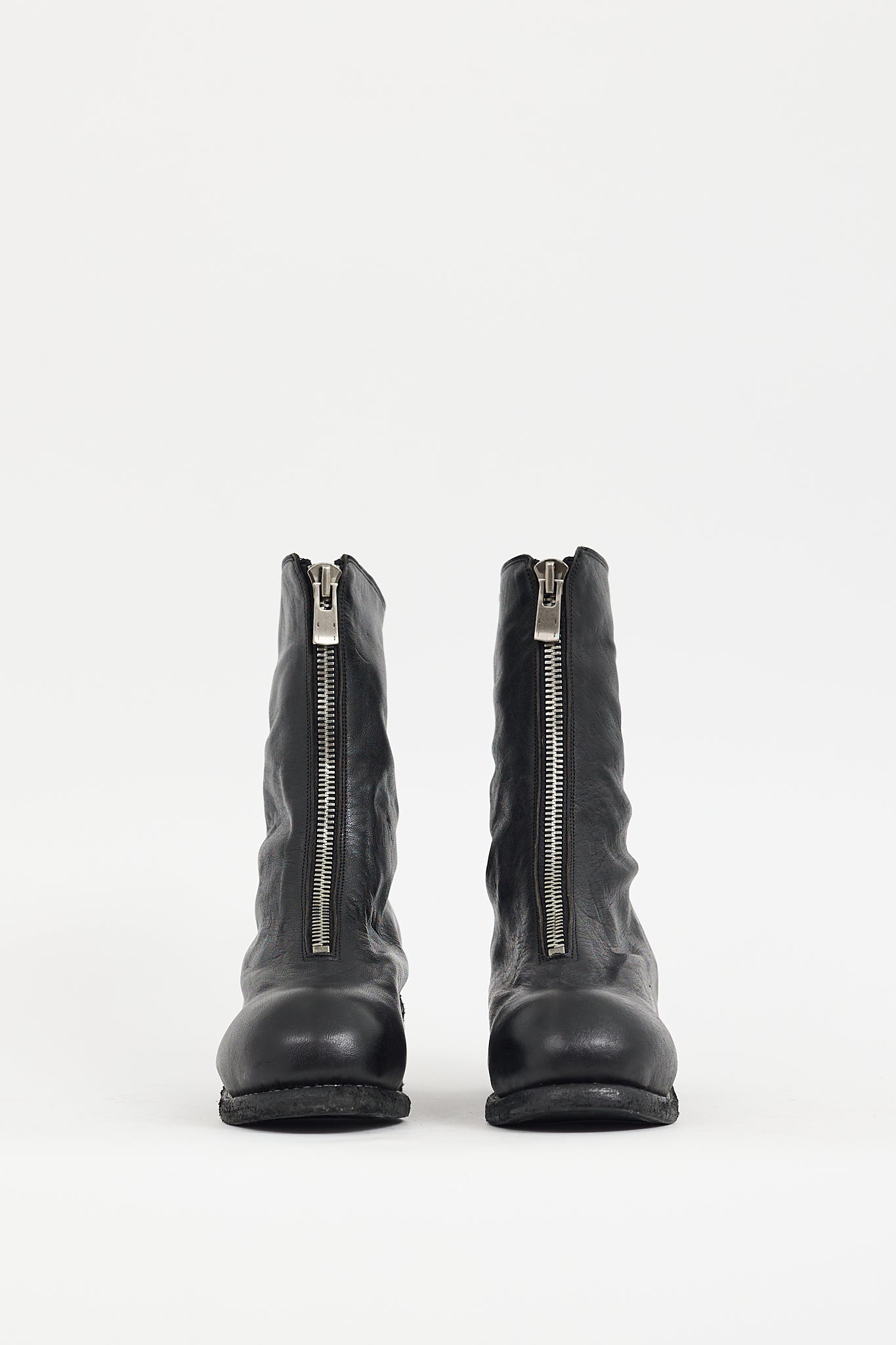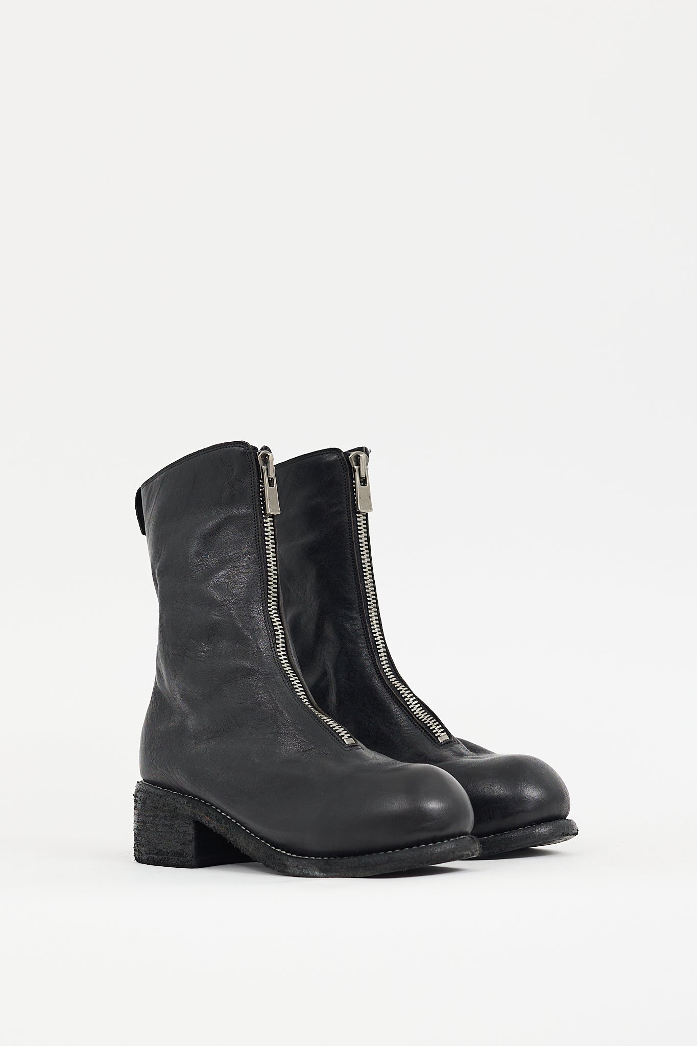 Pre-owned Guidi black leather PL1 boots featuring rounded toe, silver tone zip up front, pull on entry, pull tab at back, and stacked block heel.