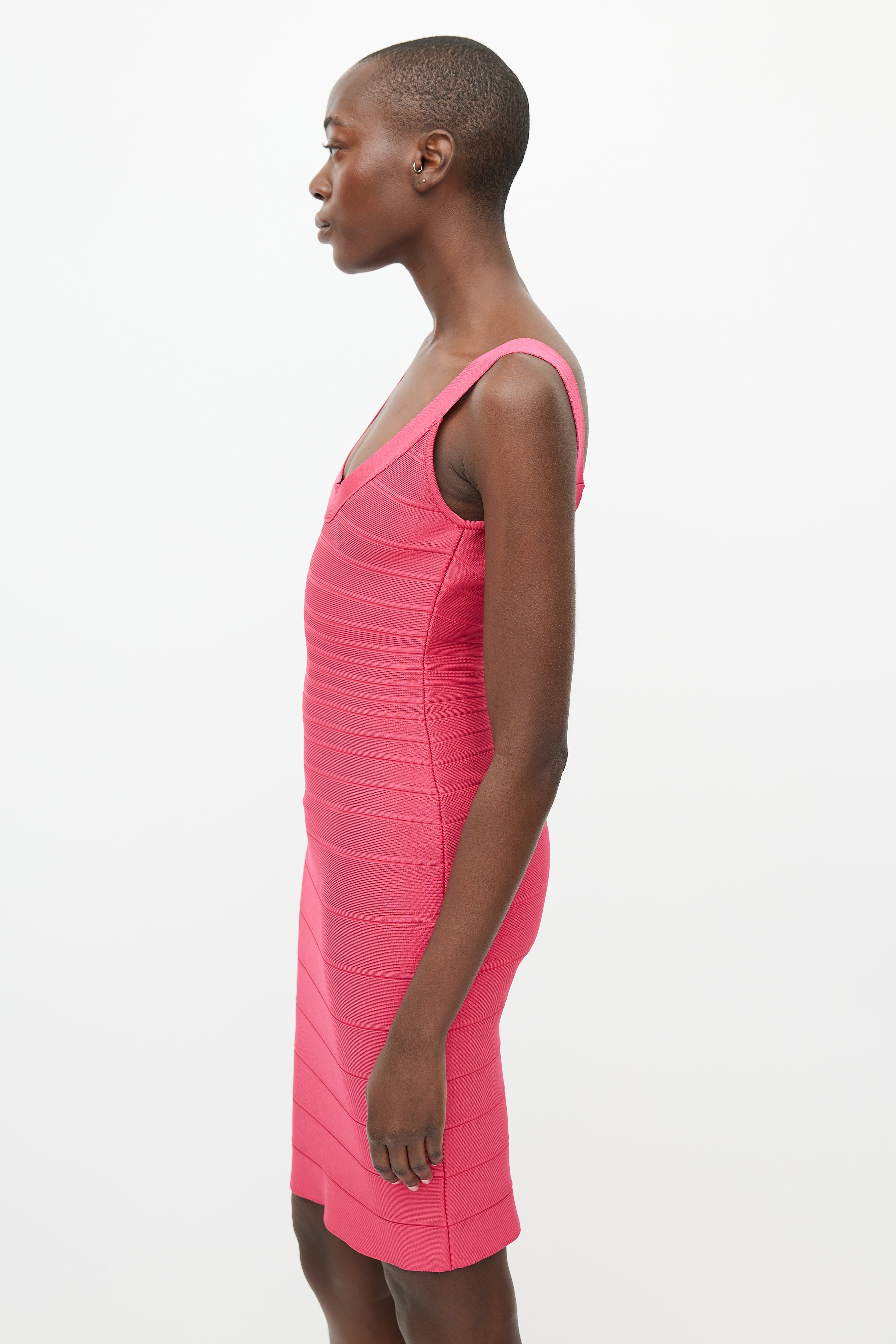 Pre-owned Hervé Léger fuchsia Sydney Bandage dress featuring scoop neckline, ribbed knit, concealed zip closure at back, and bodycon fit.