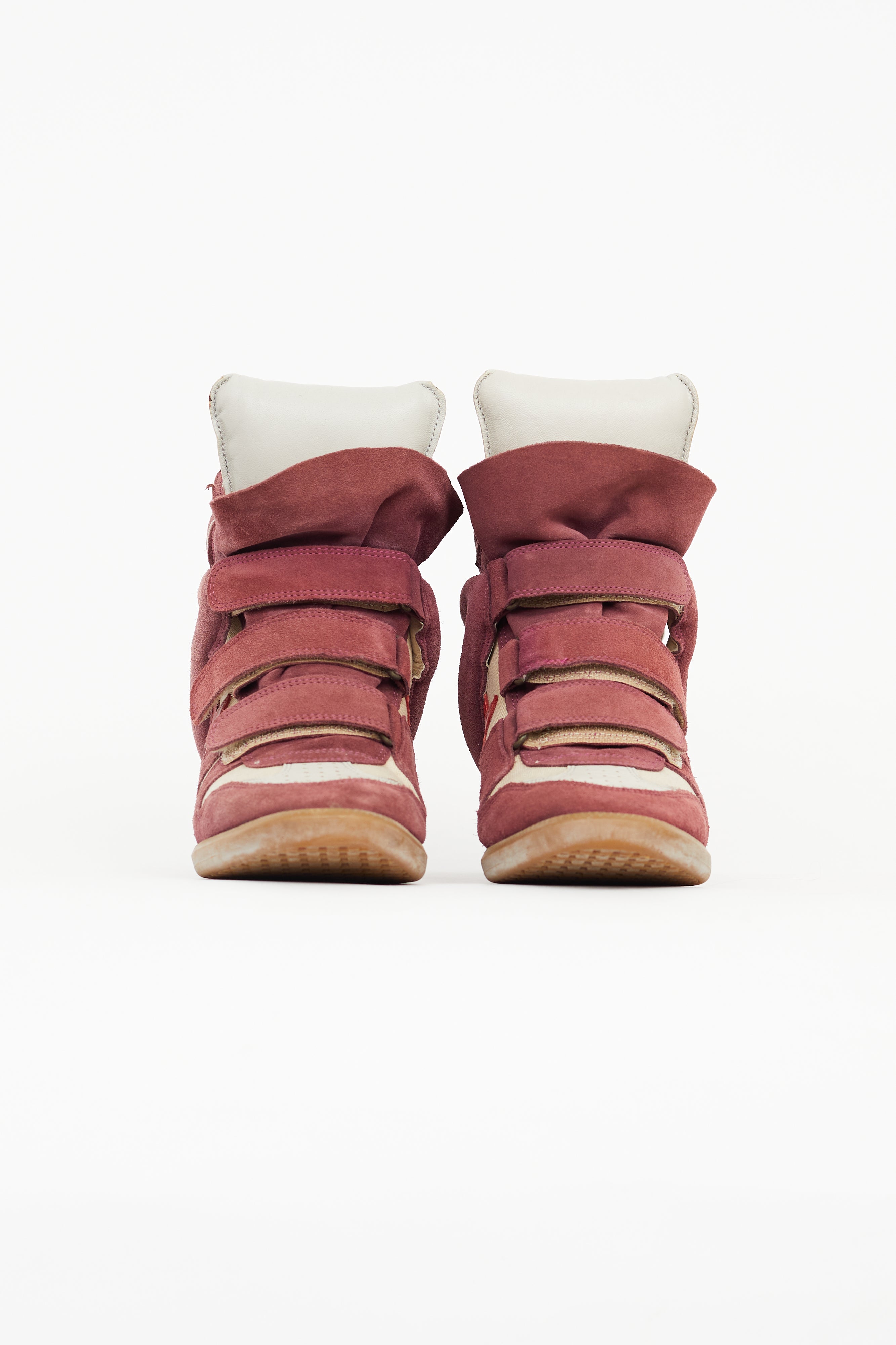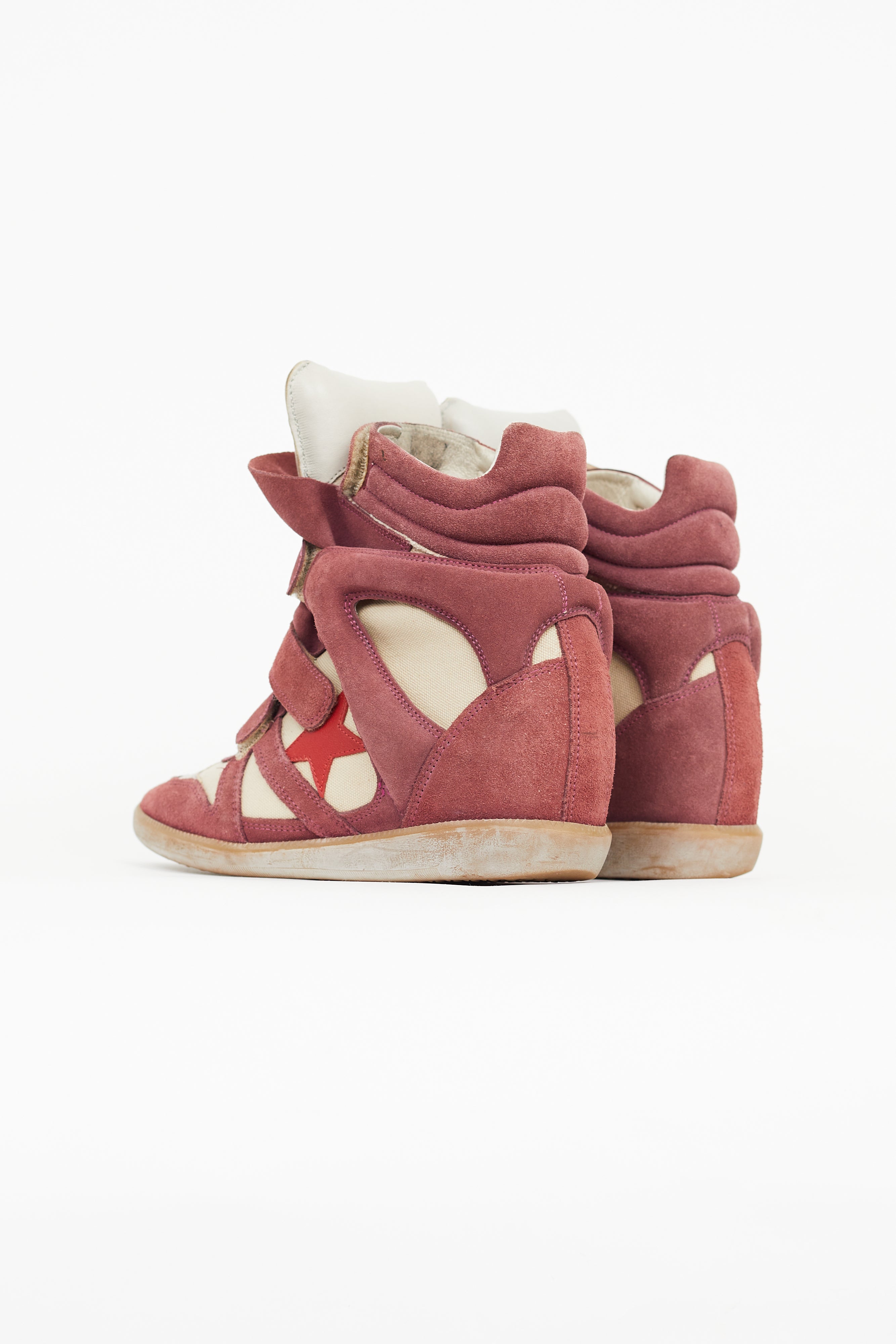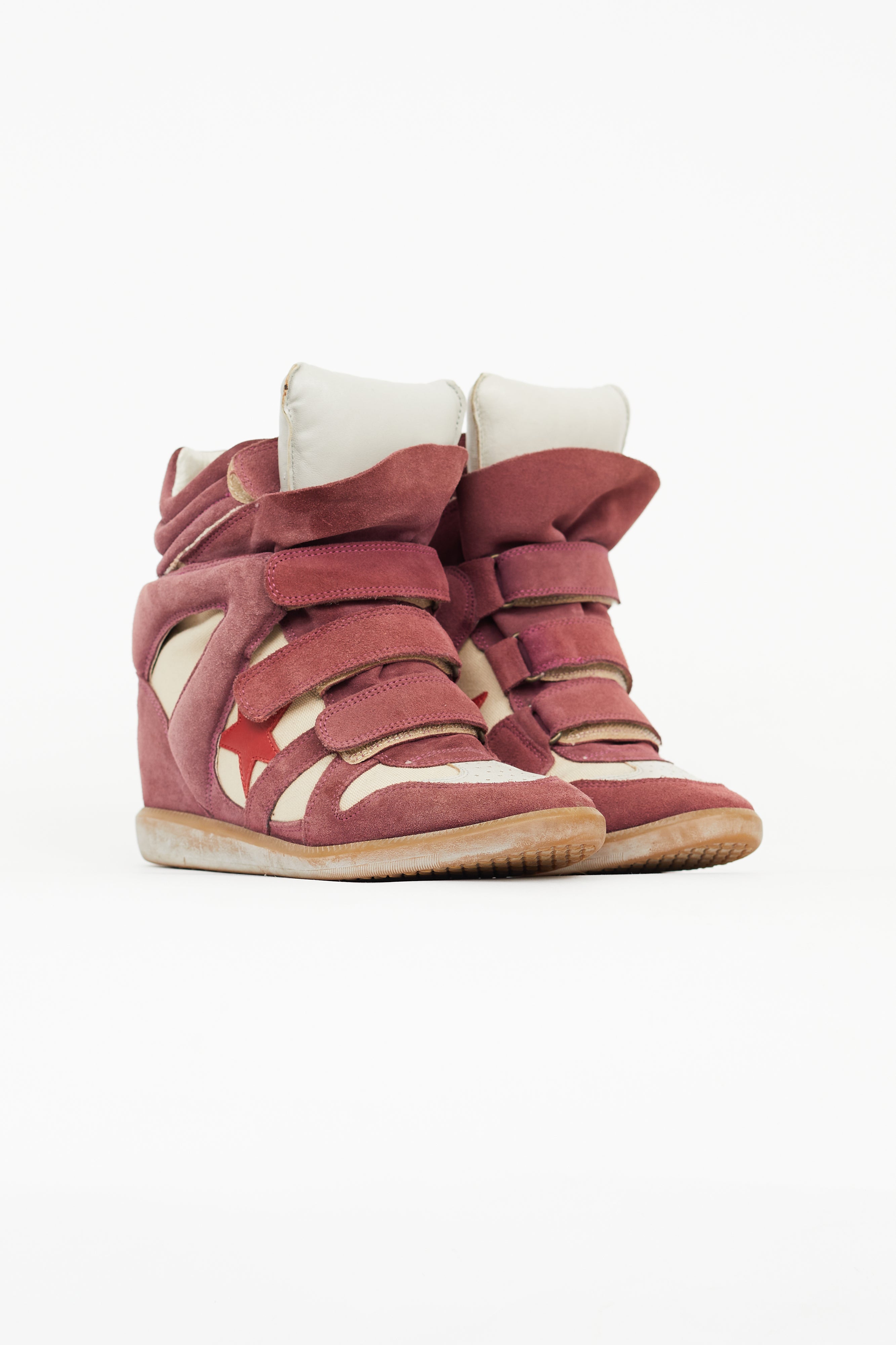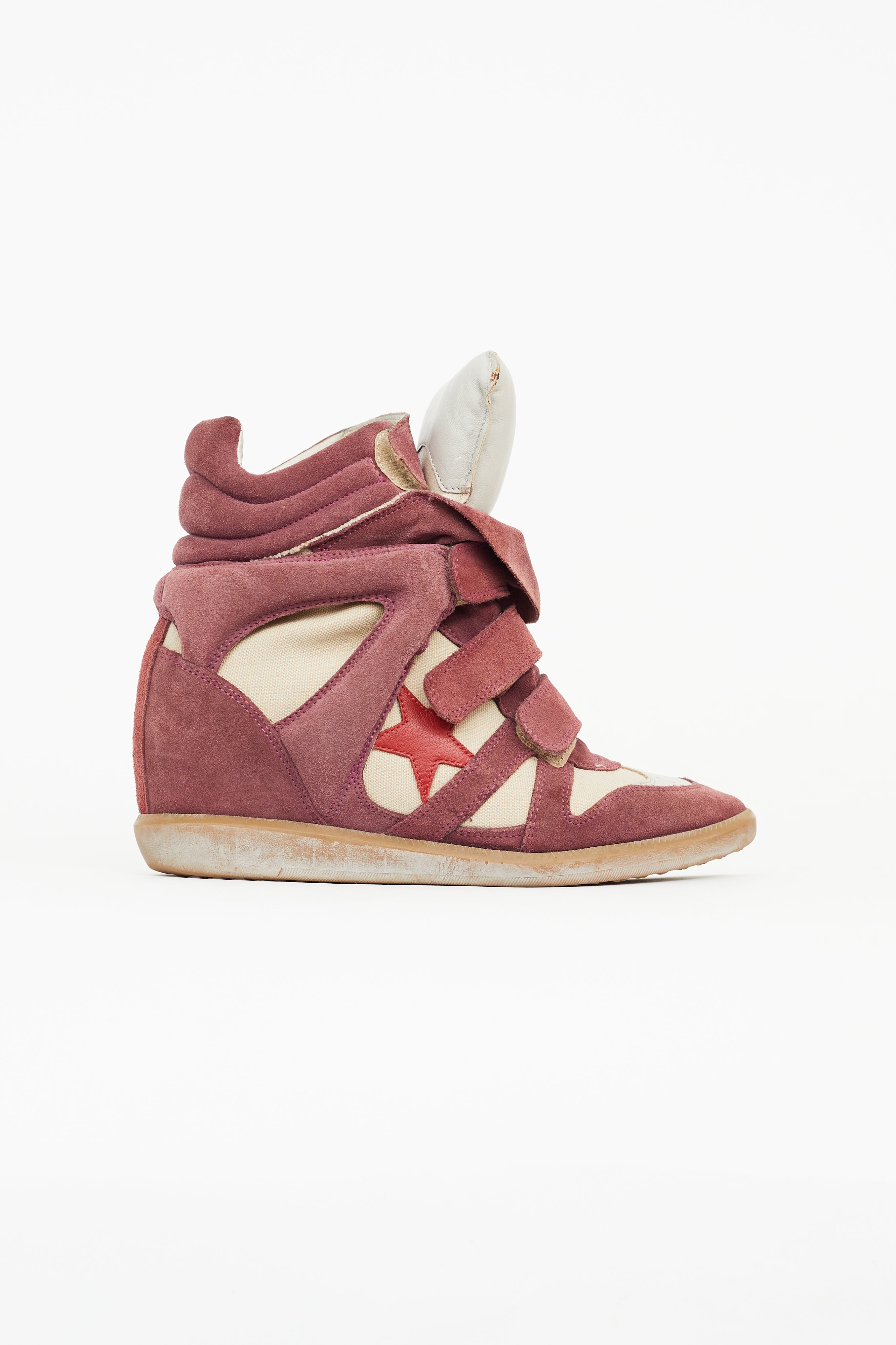 Pre-owned Isabel Marant burgundy Bayley sneaker wedge featuring rounded toe, three Velcro straps at vamp, padded leather tongue, beige nylon upper, burgundy suede trim, red leather star at side, and concealed wedge heel.