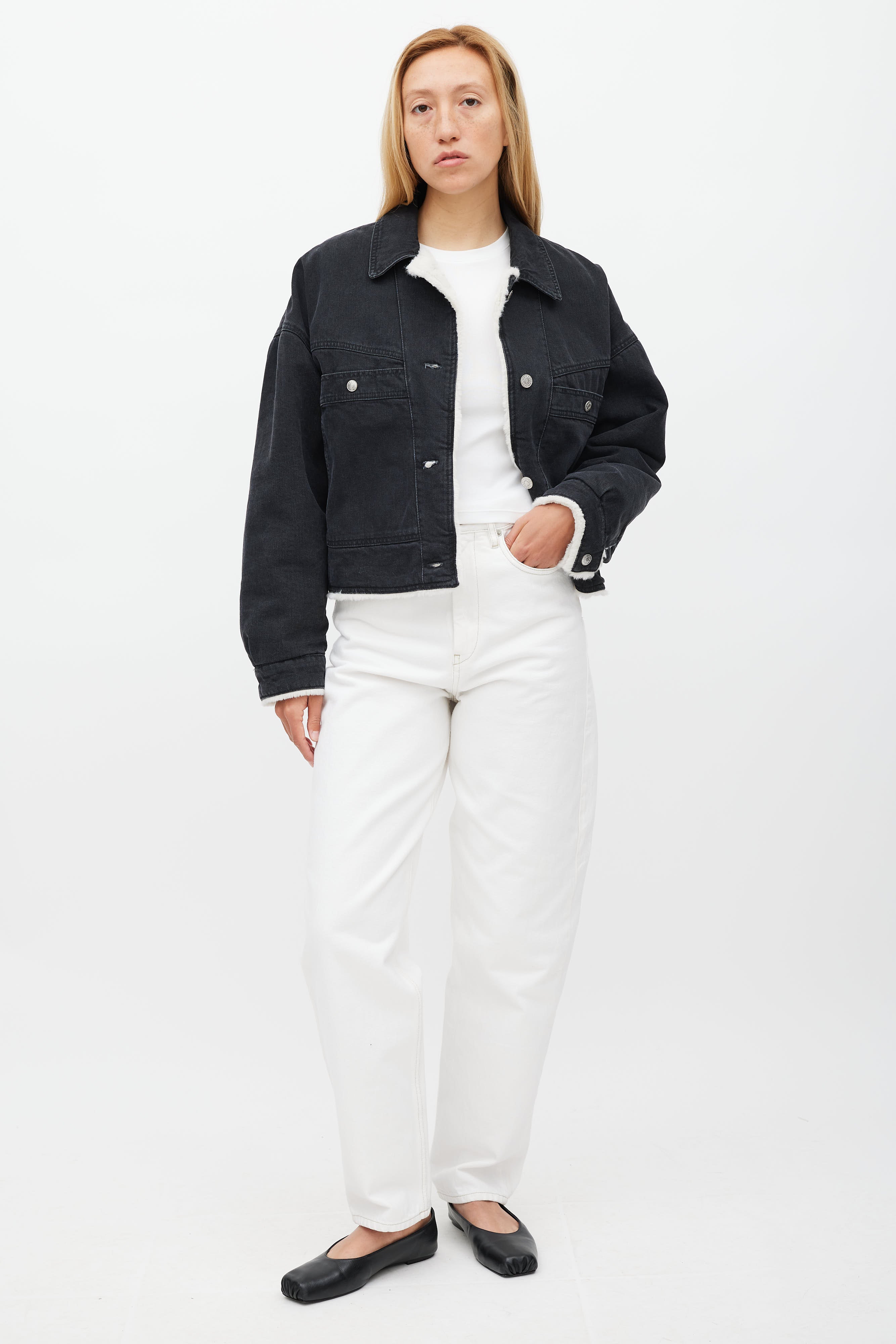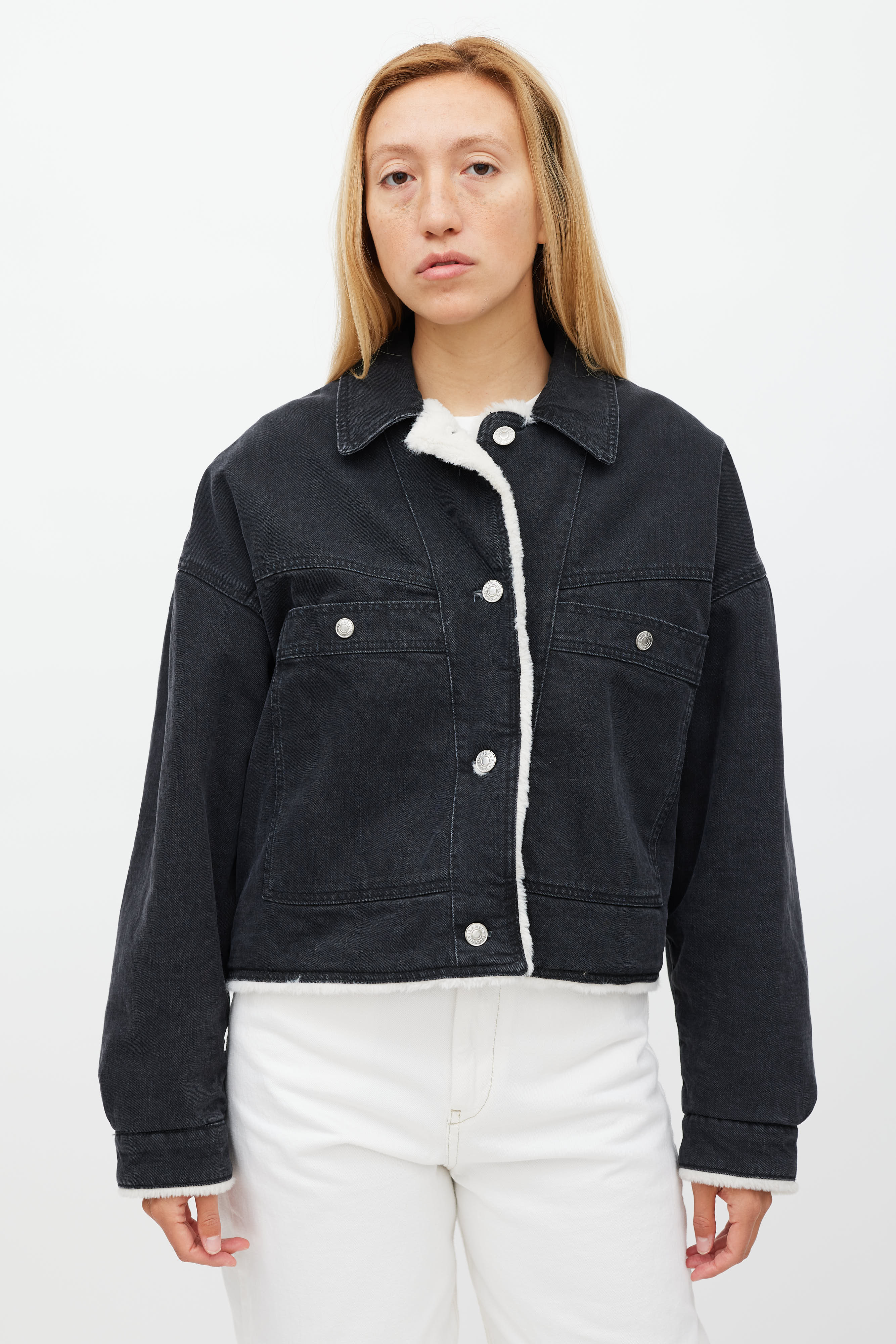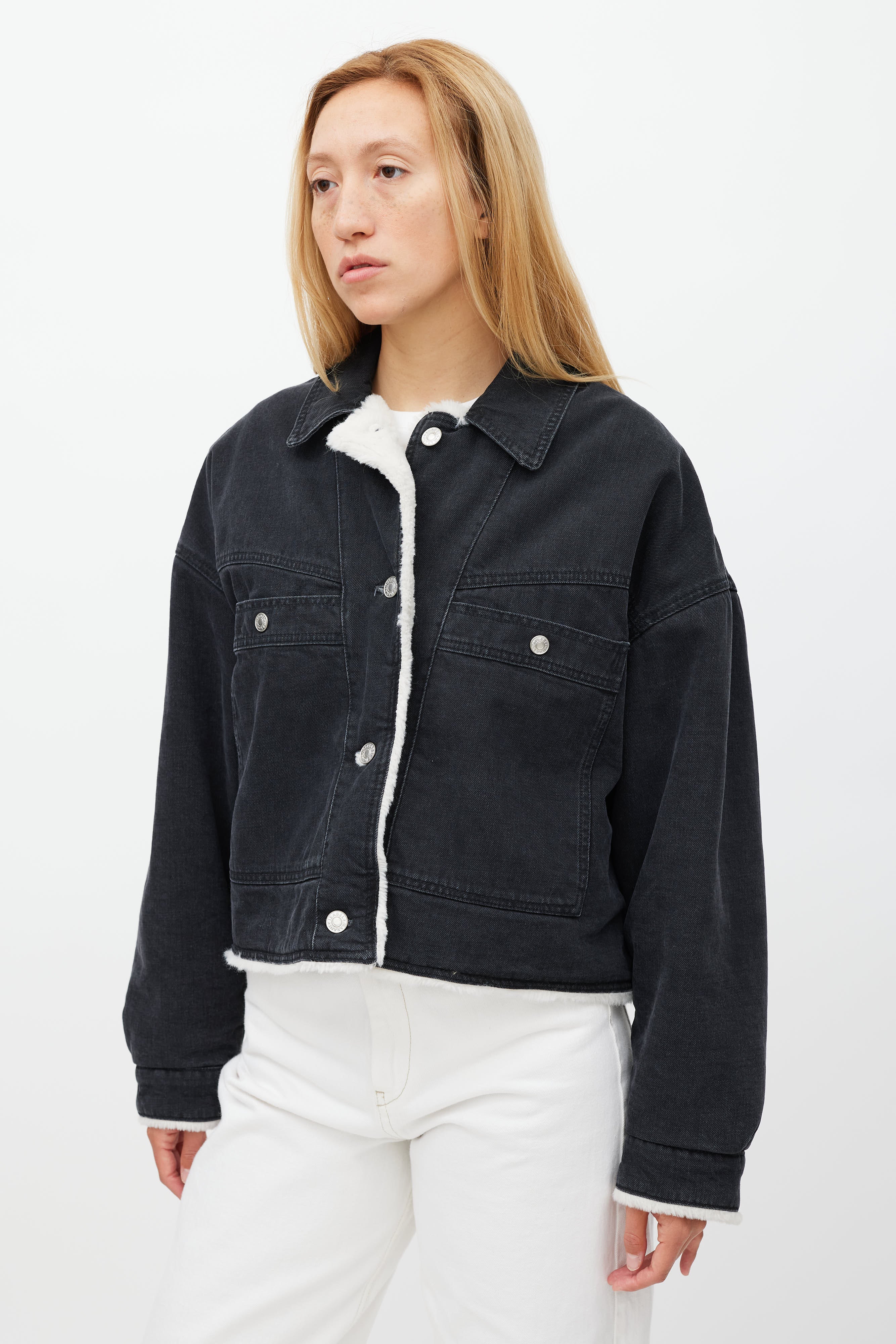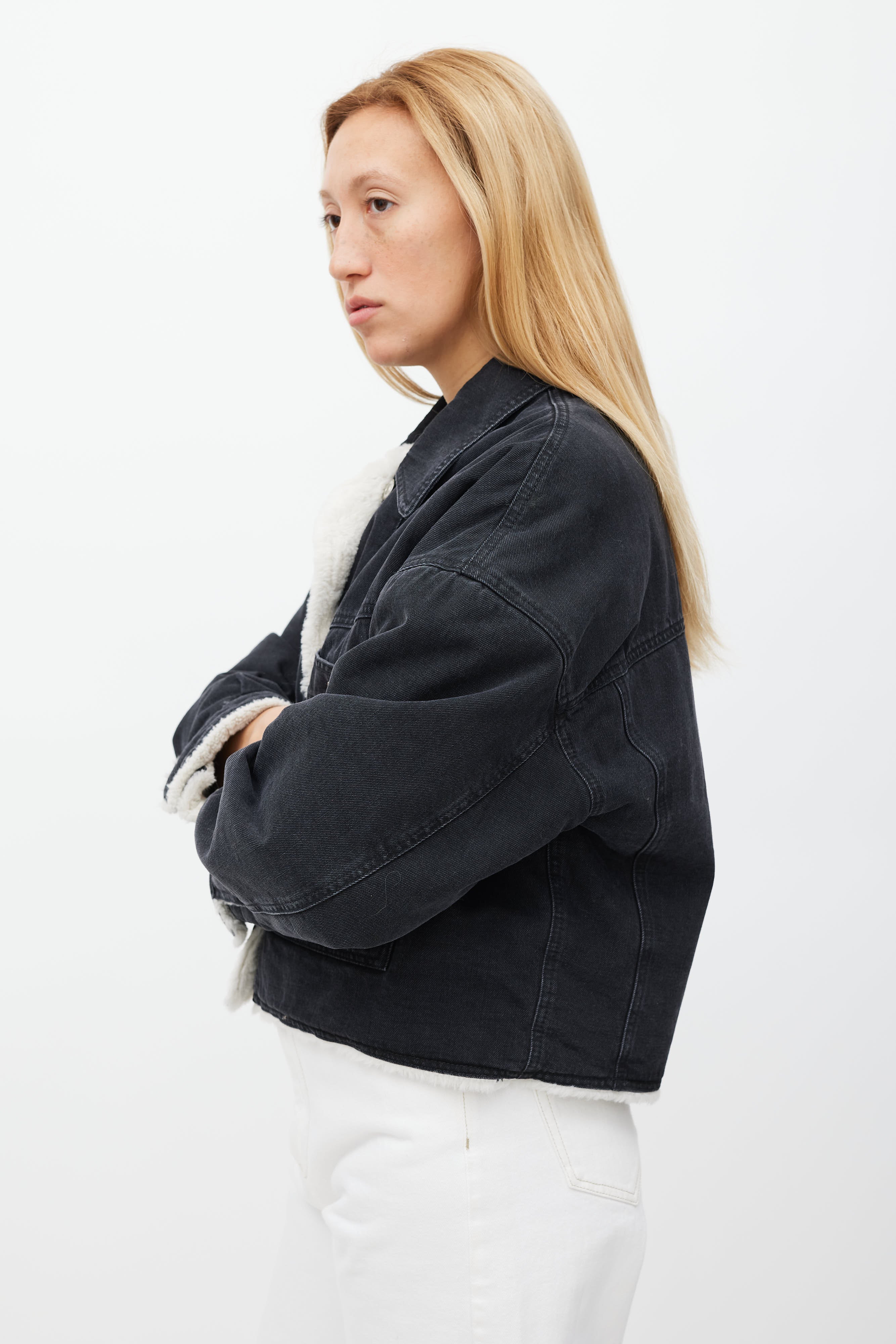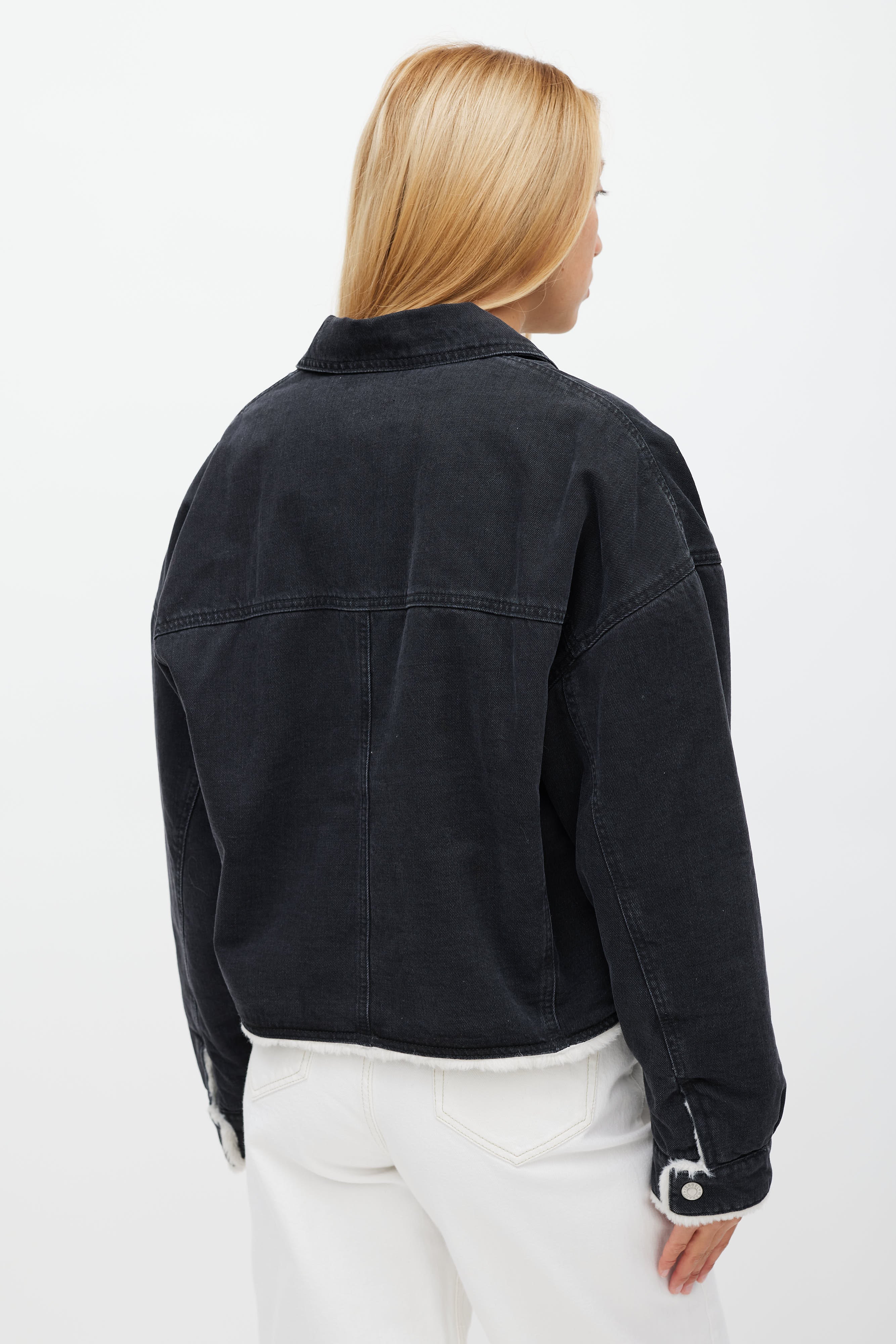 Pre-owned Isabel Marant washed black Paoleta denim jacket featuring button up front, classic collar, two oversized chest pockets, buttoned cuffs, and white shearling lining.