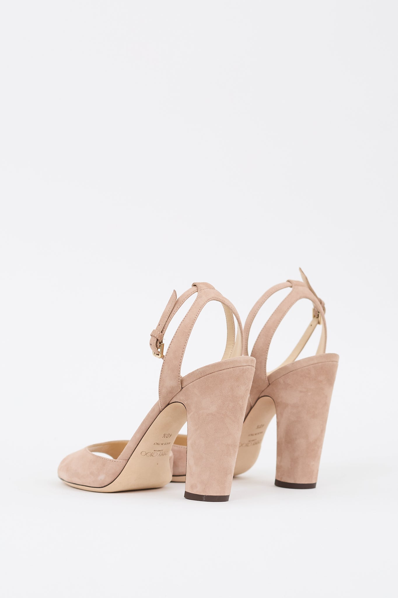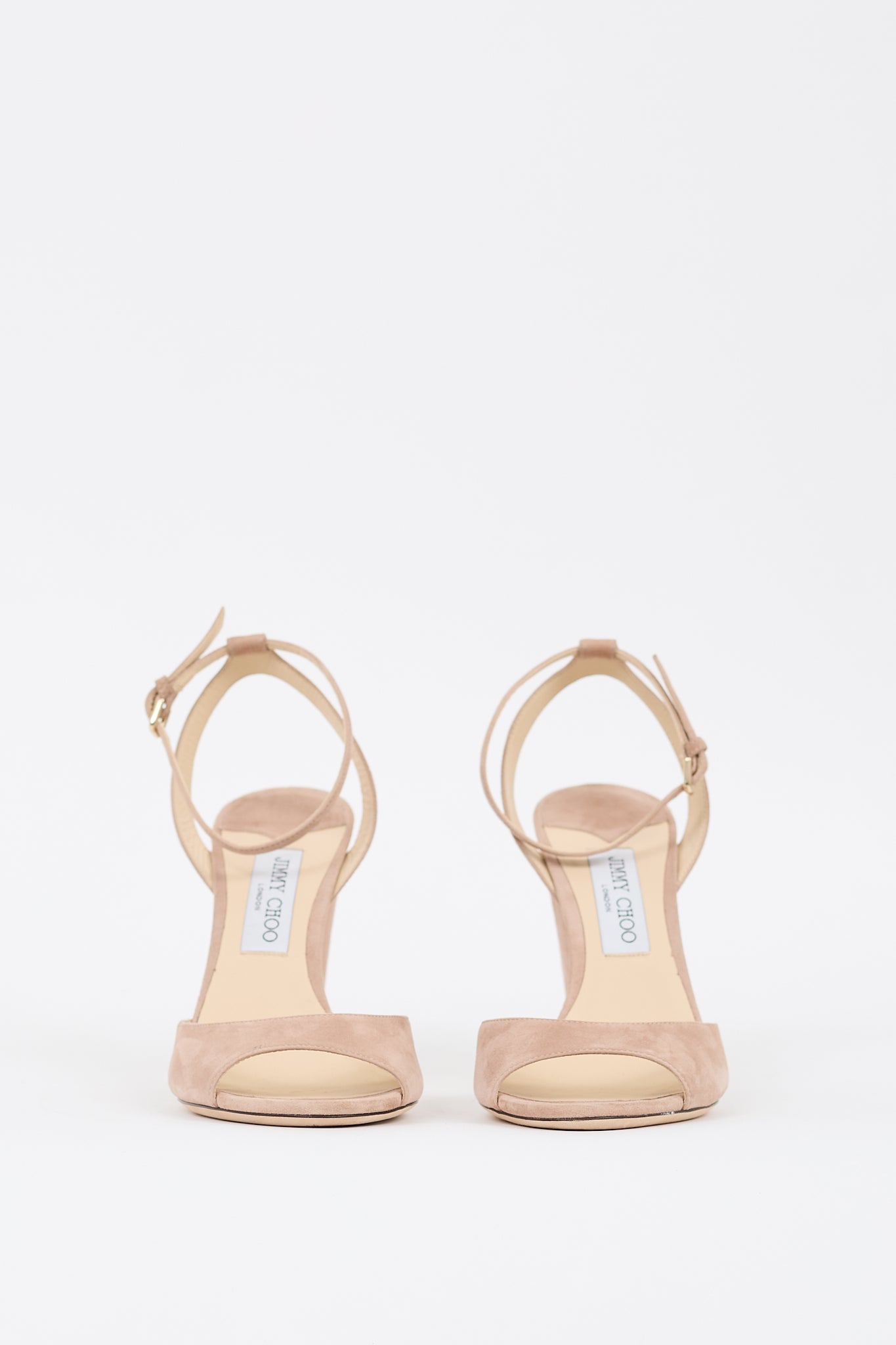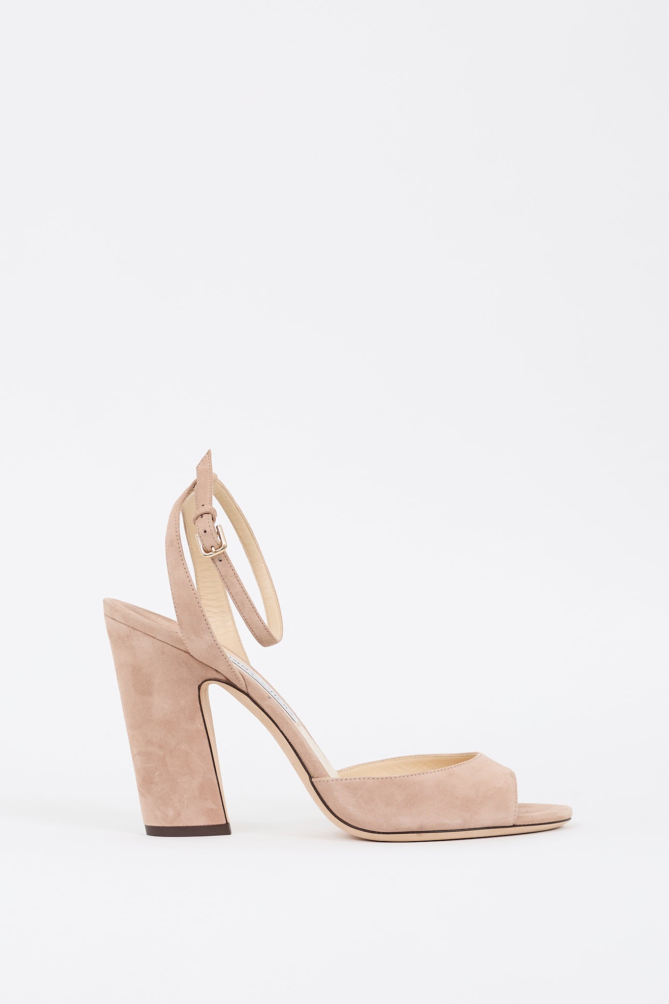 Pre-owned Jimmy Choo beige suede Miranda 85 heels featuring open rounded toe, strap across vamp, adjustable ankle strap with gold tone buckle closure, and covered block heel.
