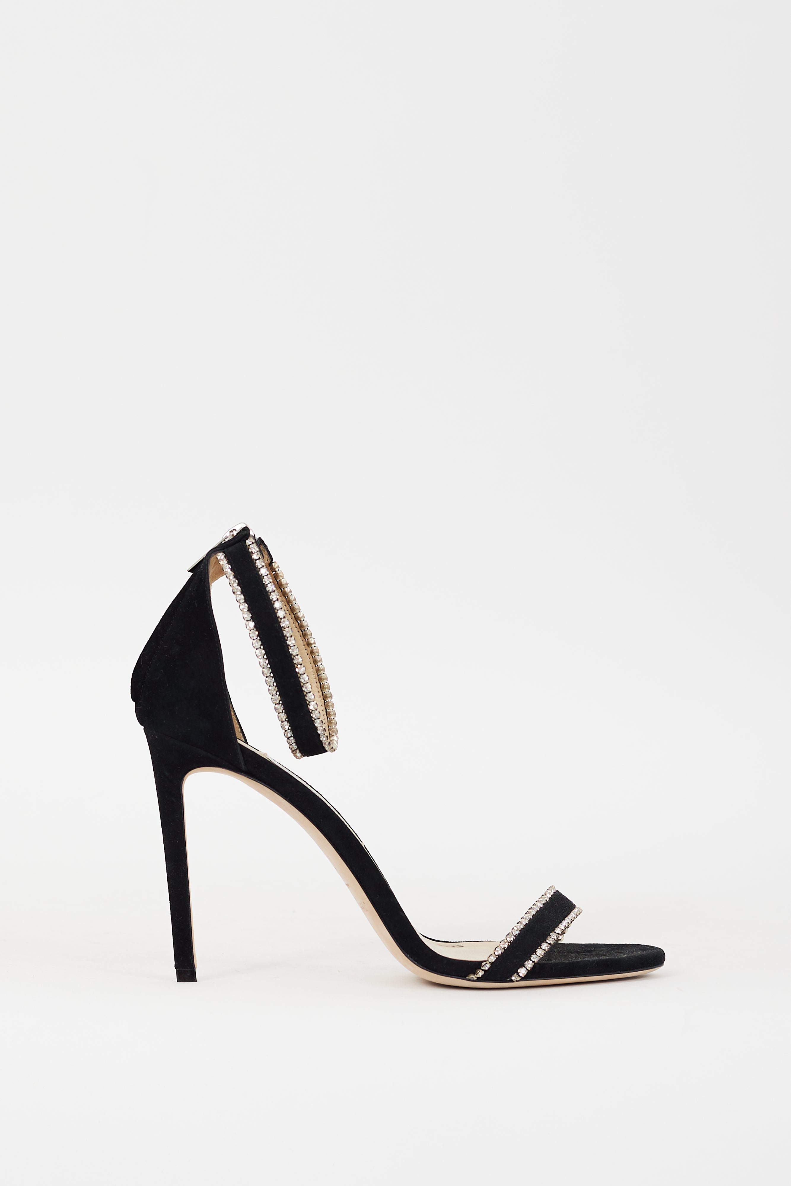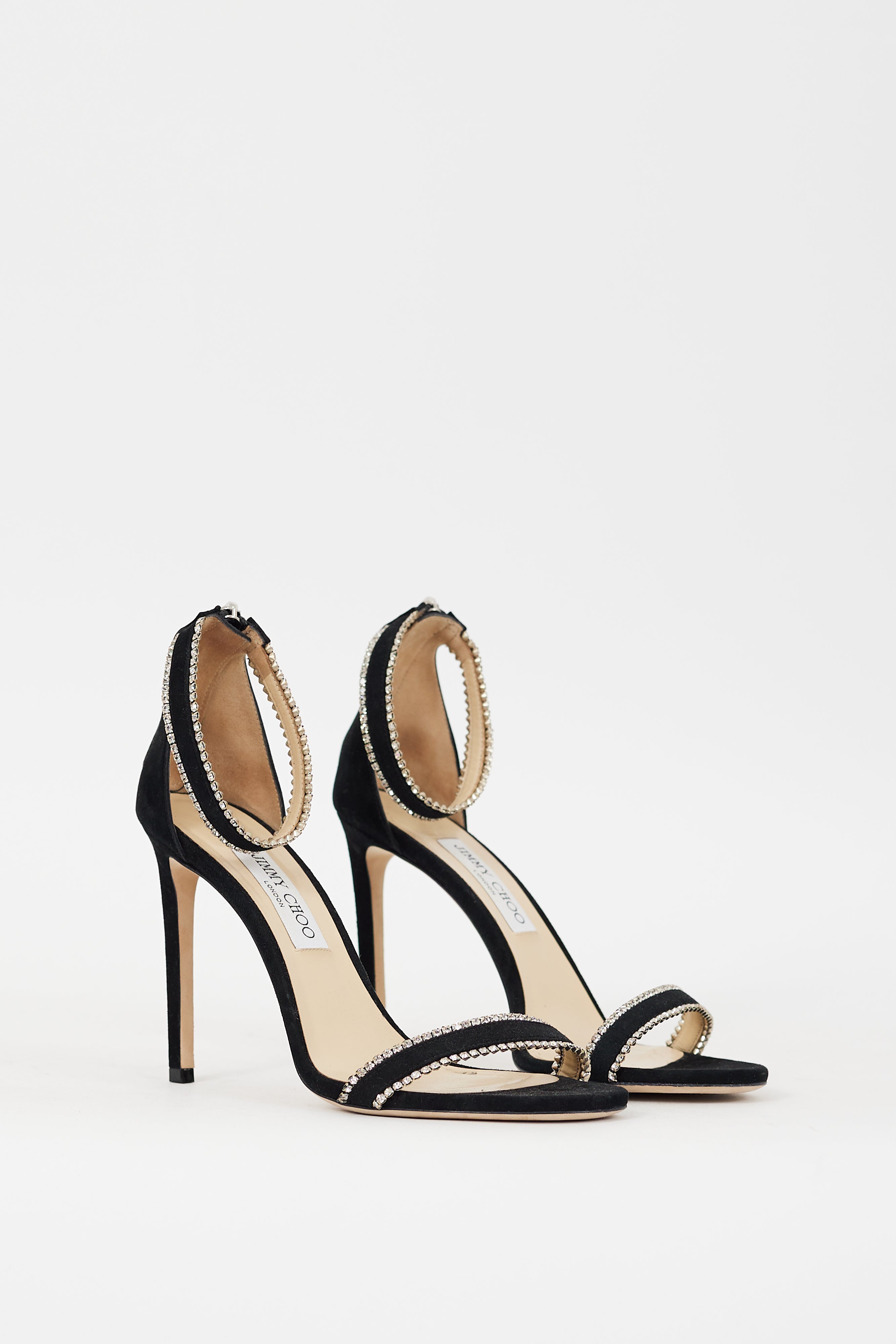 Pre-owned Jimmy Choo black suede Dochas 100 heels featuring an open rounded toe, strap across vamp, ankle strap, crystal trim throughout, back zip closure, and covered stiletto heel. Comes with original dust bag.