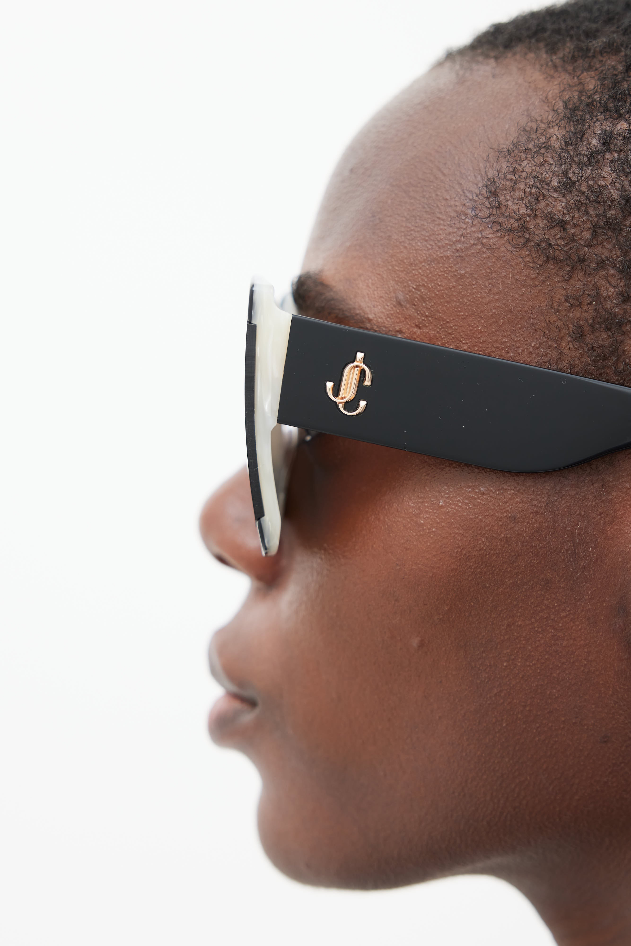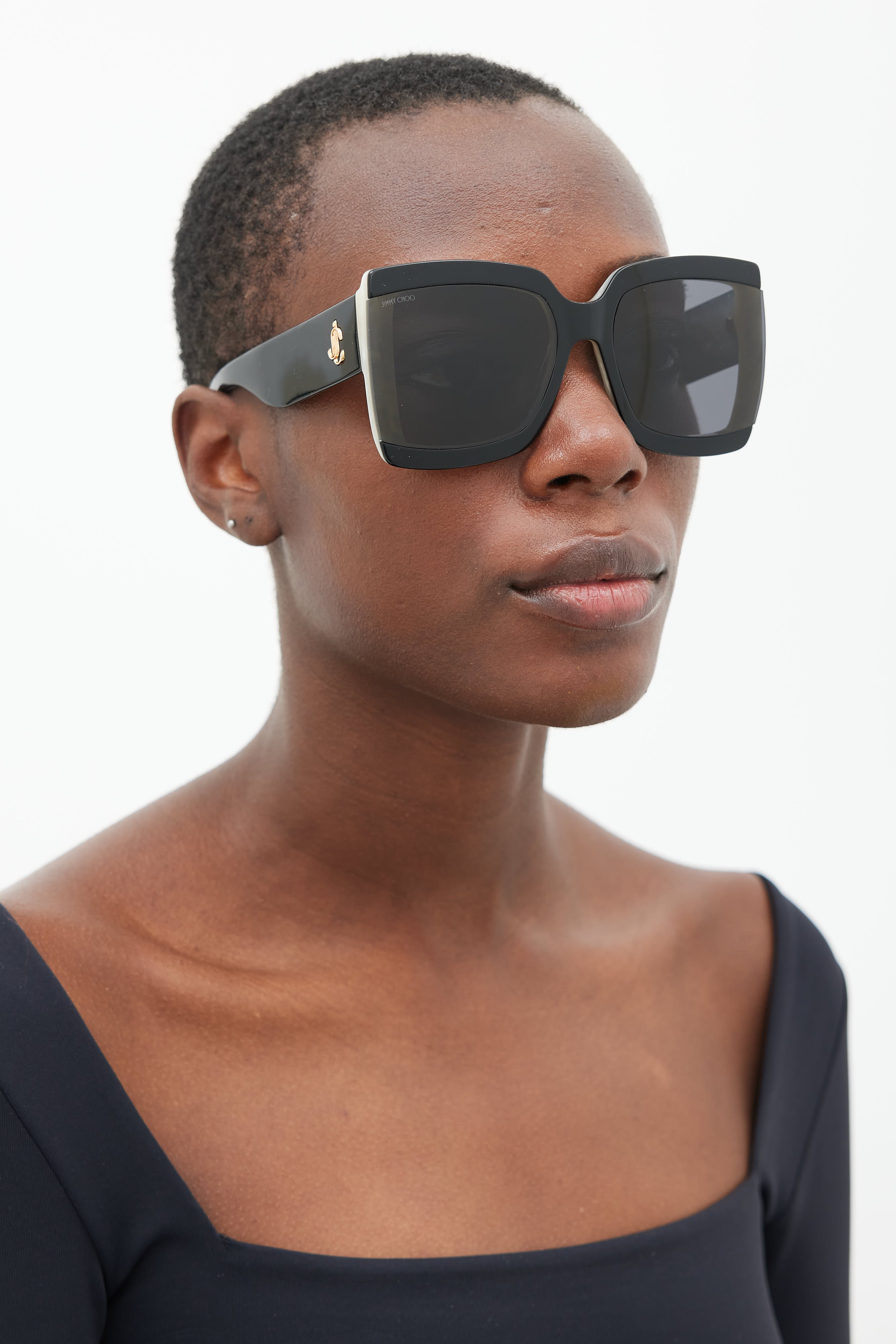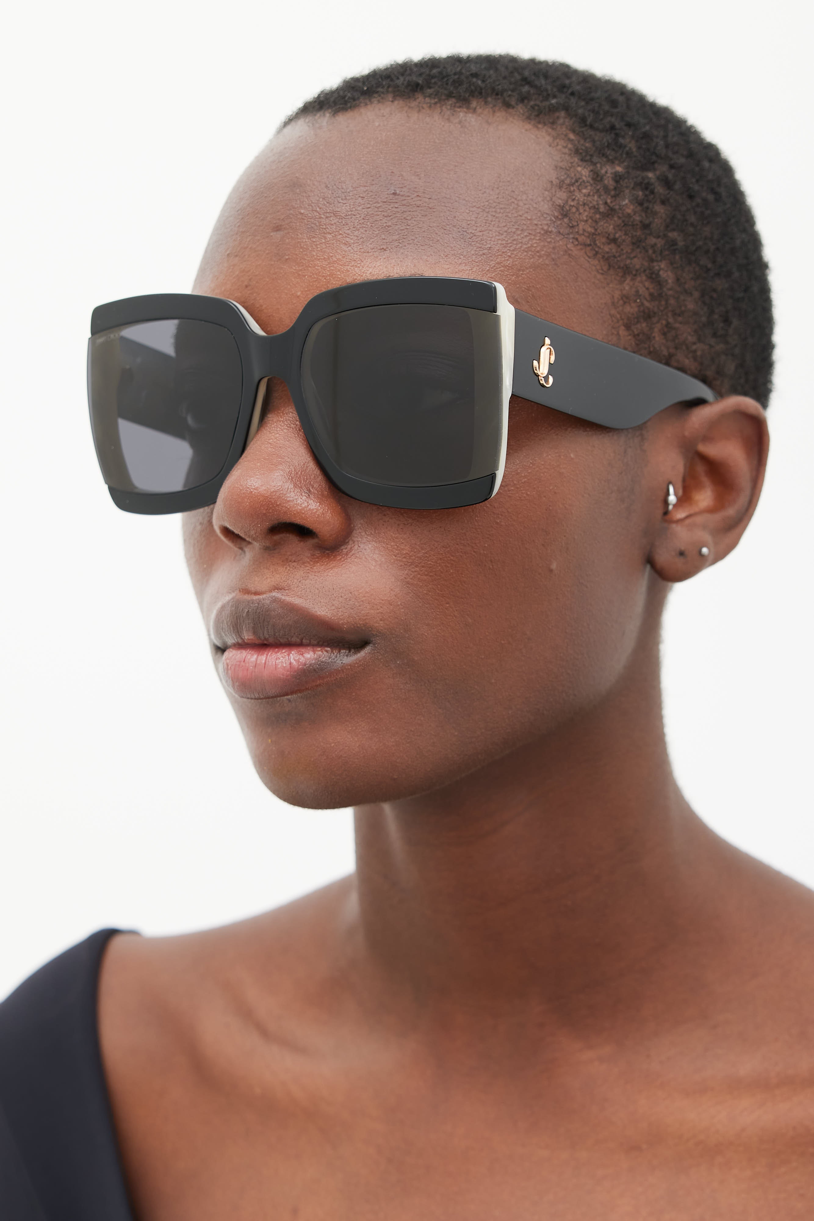 Pre-owned Jimmy Choo Renee sunglasses featuring a square frame with a black acetate exterior and white pearlescent interior, semi rimless grey lenses, and gold tone monogram logo decal at temple. Comes with case.