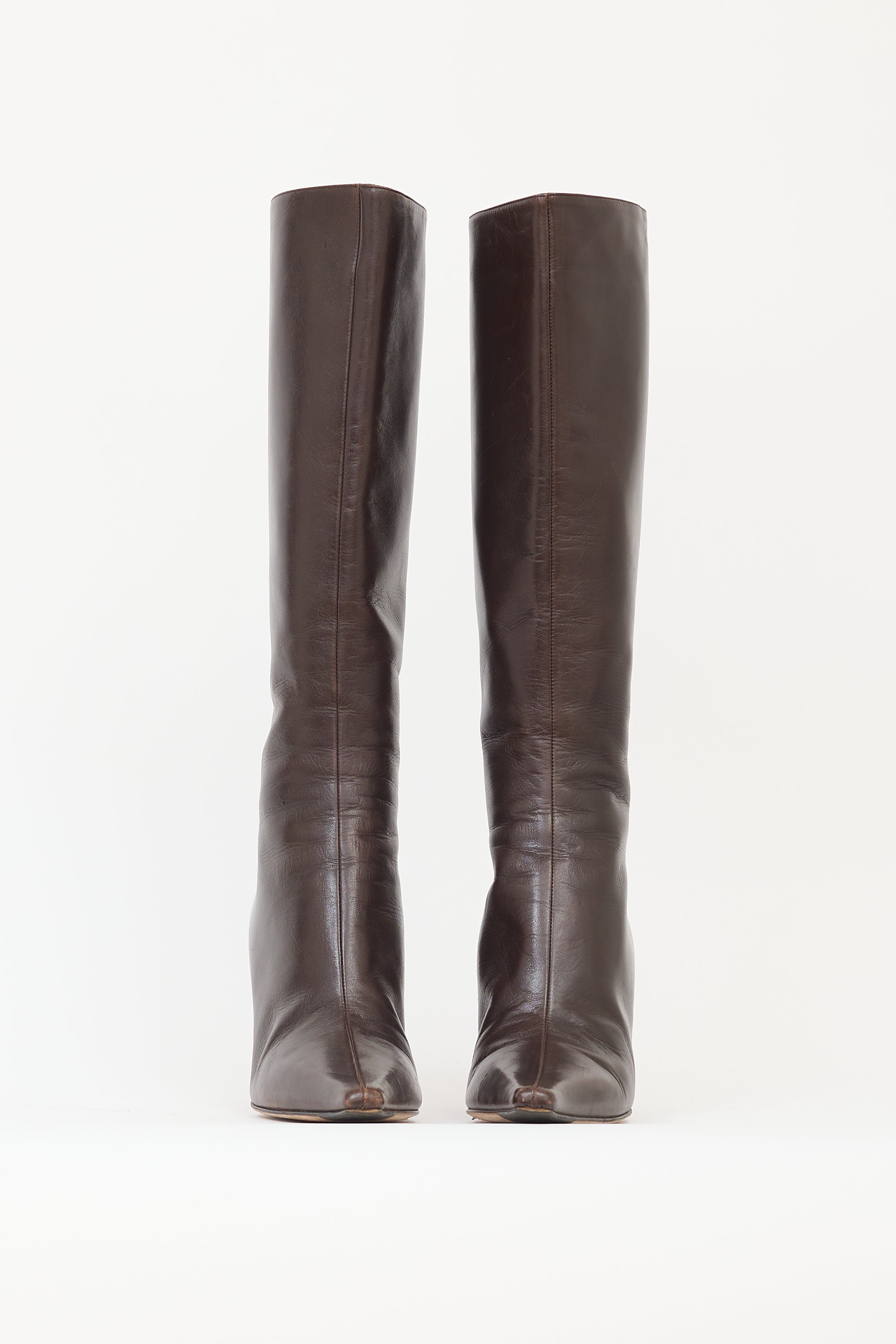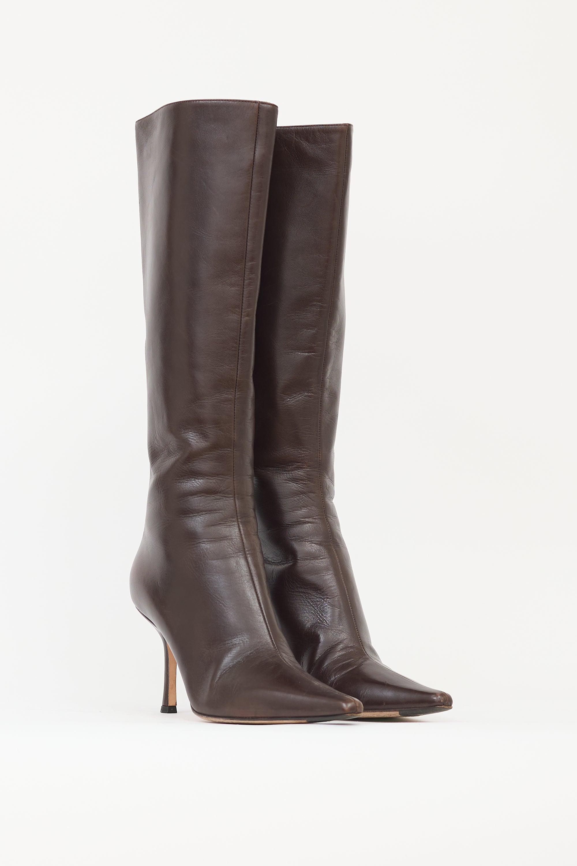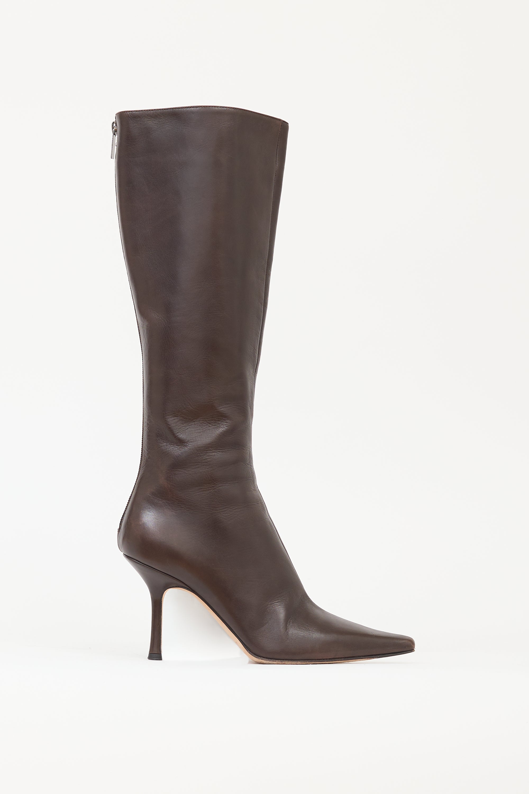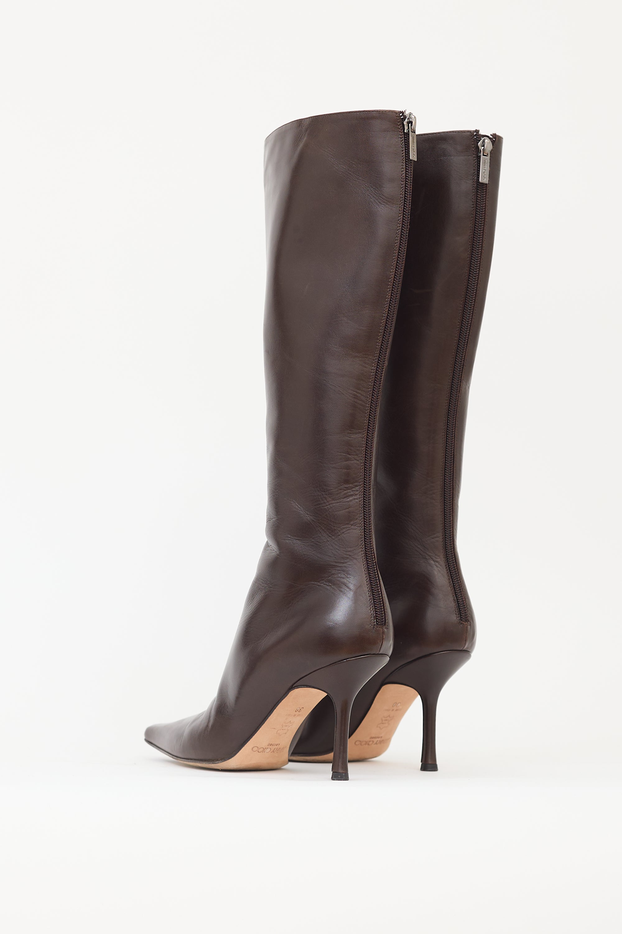 Pre-owned Jimmy Choo brown leather Agathe 85 knee high boots featuring pointed toe, tonal back zip closure, covered stiletto heel, and pull on entry.