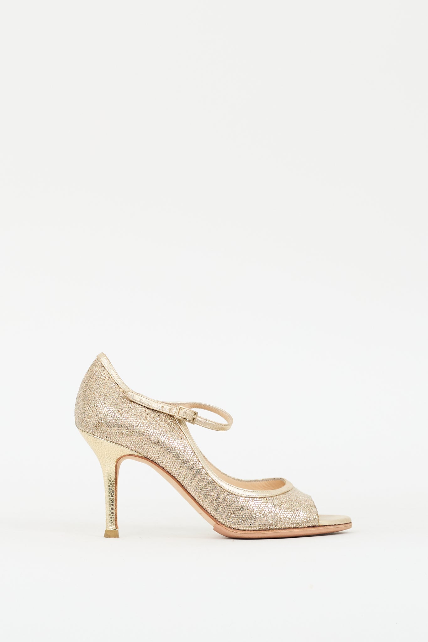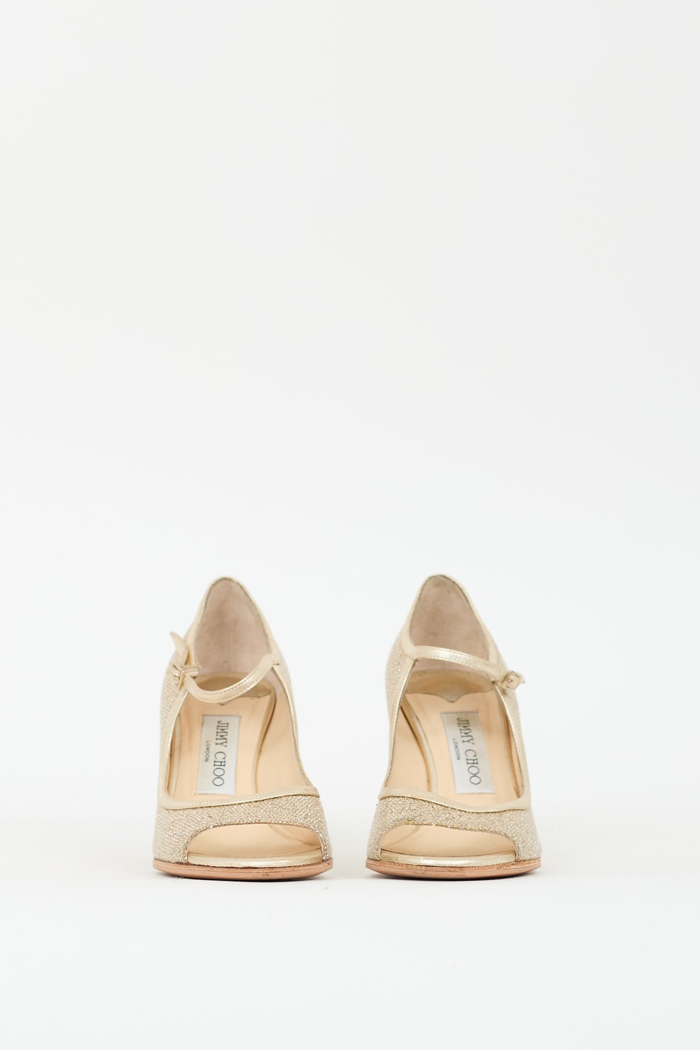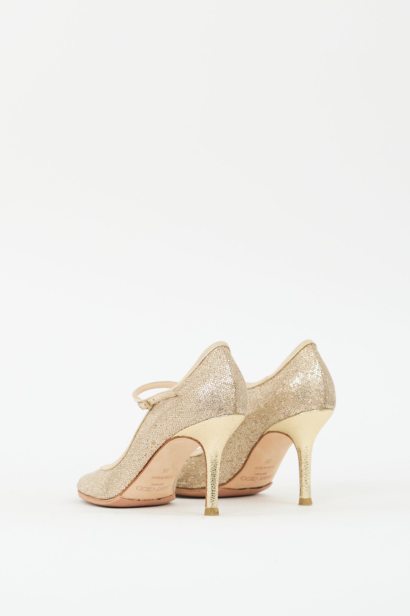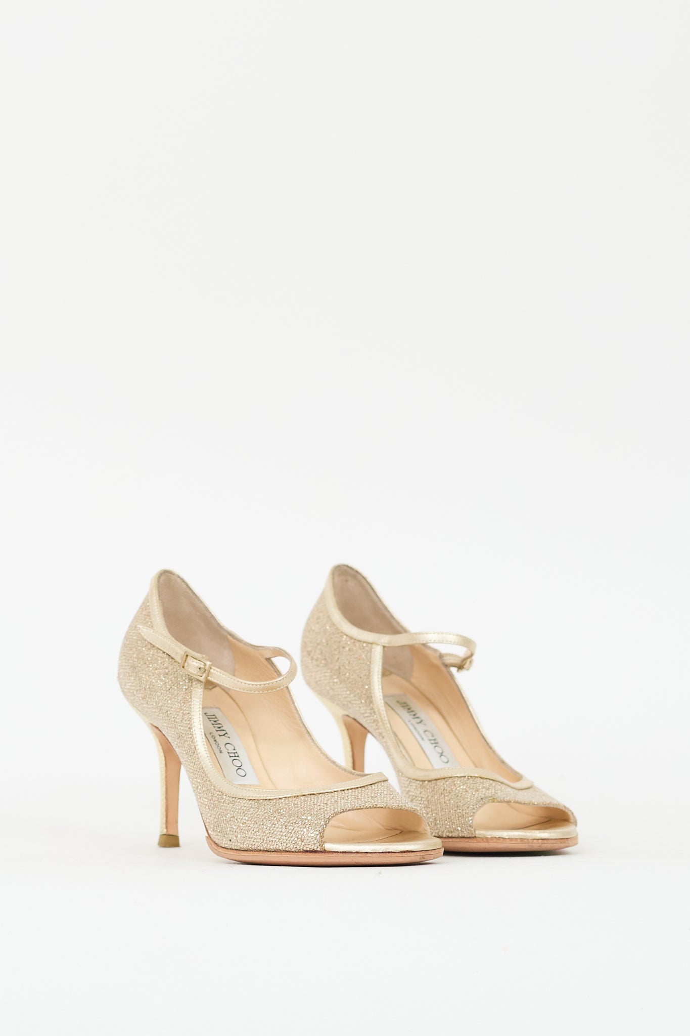 Pre-owned Jimmy Choo gold leather pumps featuring rounded peep toe, glitter upper, leather trim, adjustable ankle strap with buckle closure, and covered heel.
