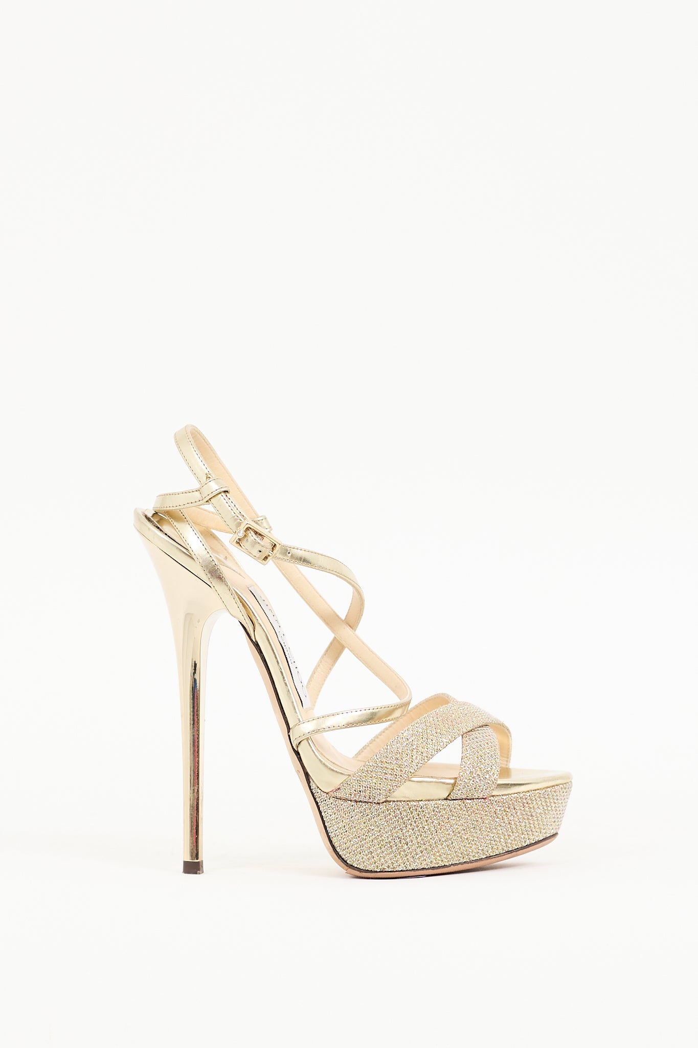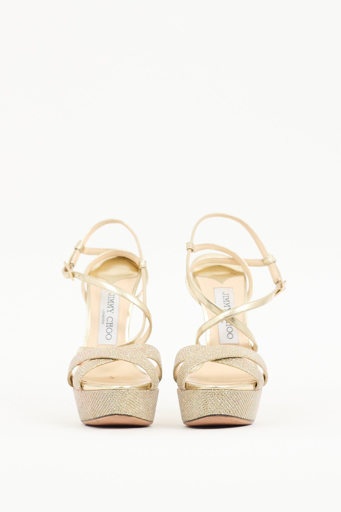 Pre-owned Jimmy Choo gold Liddie 145 sparkly heels featuring an open almond toe, criss cross straps across vamp, thin criss cross straps across instep with adjustable ankle, covered platform, and mirrored stiletto heel.