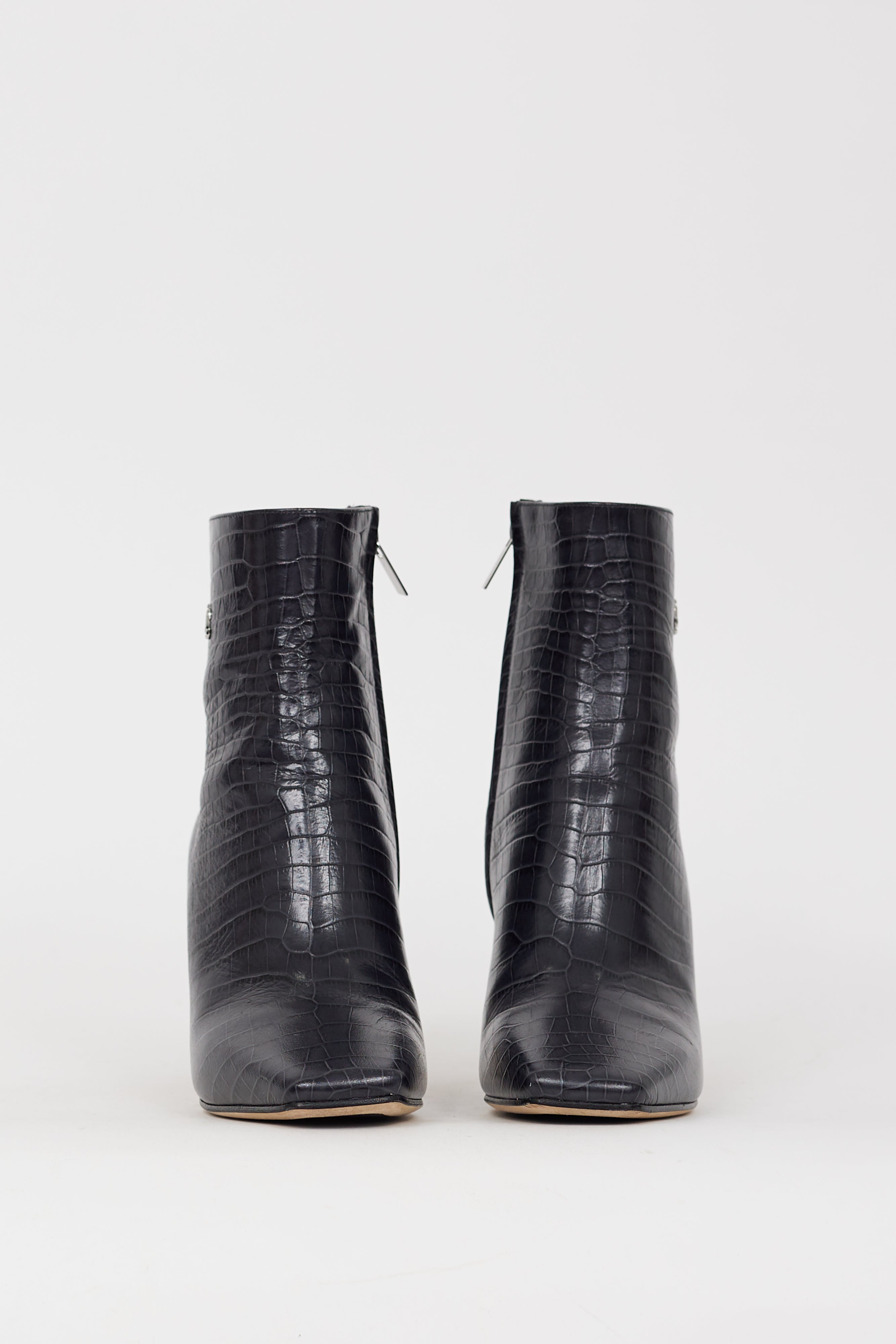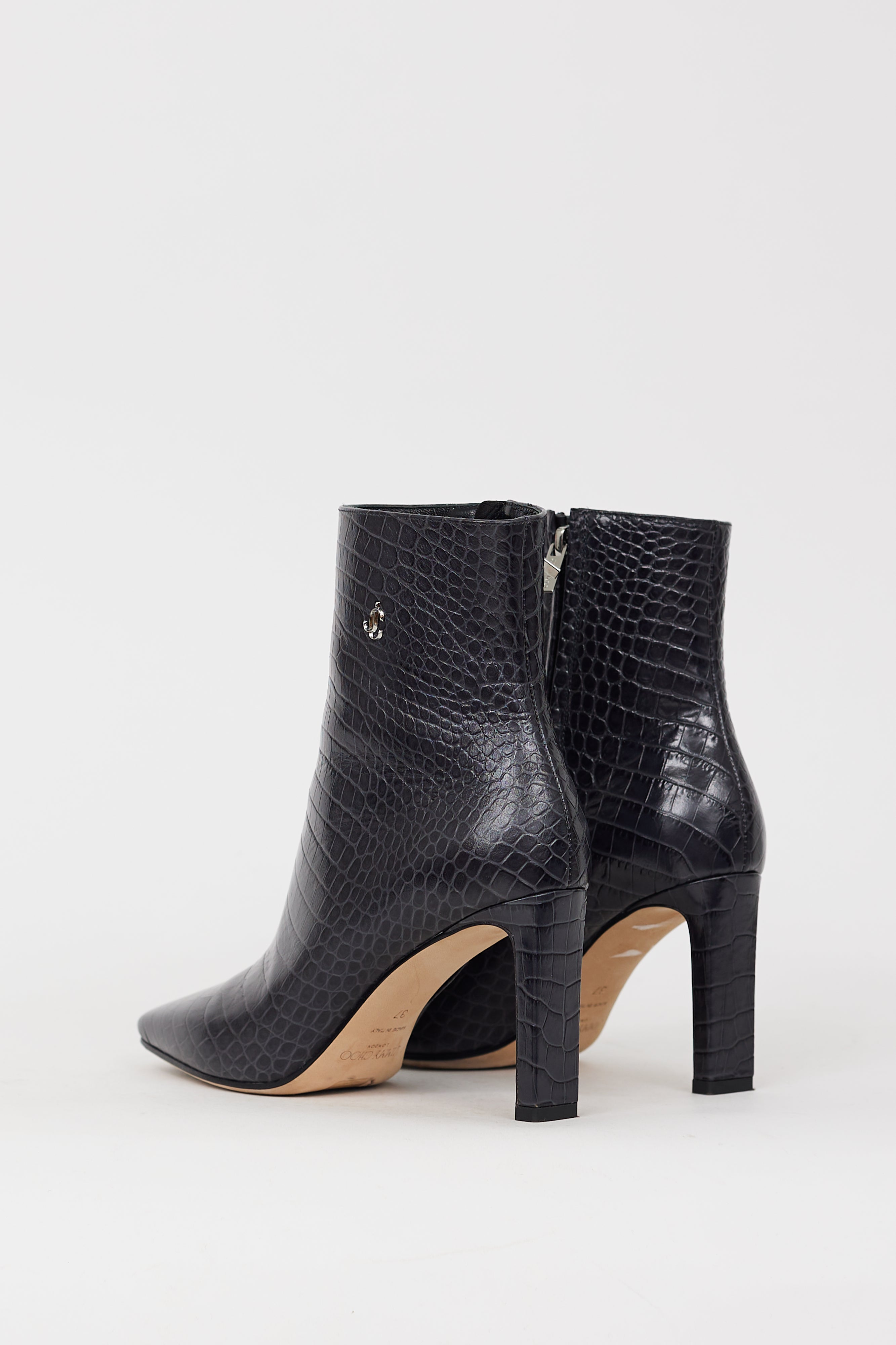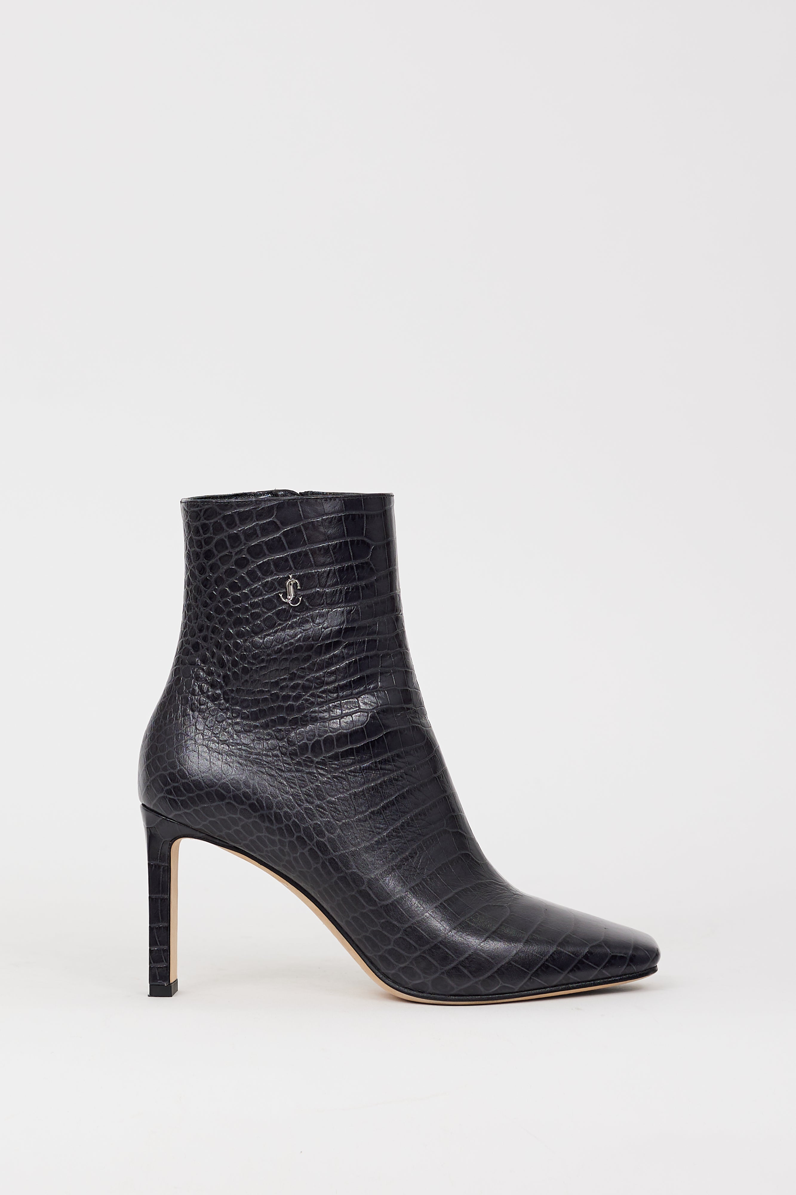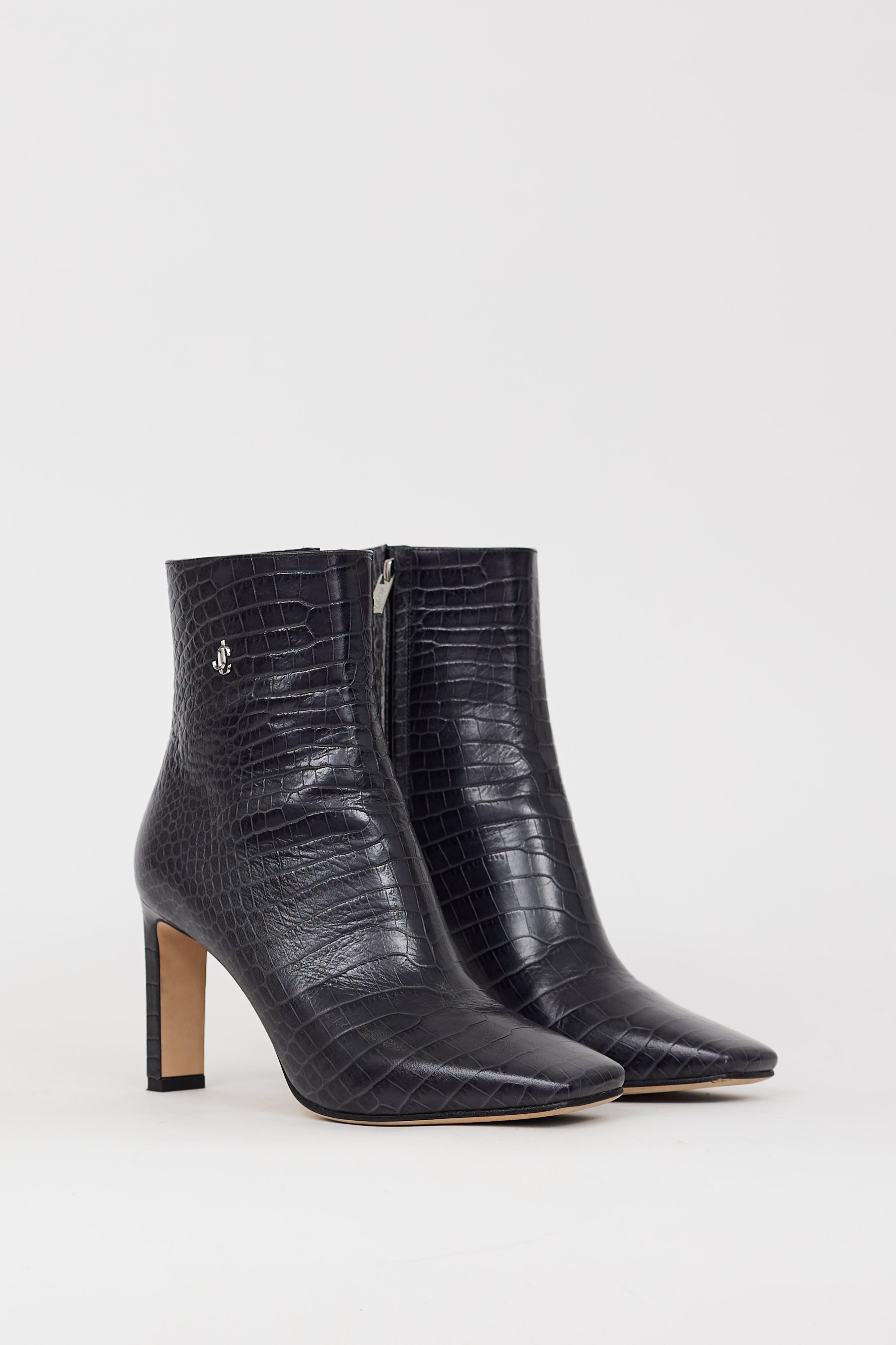 Pre-owned Jimmy Choo navy Minori boots featuring square toe, croc effect upper, zip closure at inner side, silver tone JC logo at outer side, and slim block heel. Comes with original dust bag.