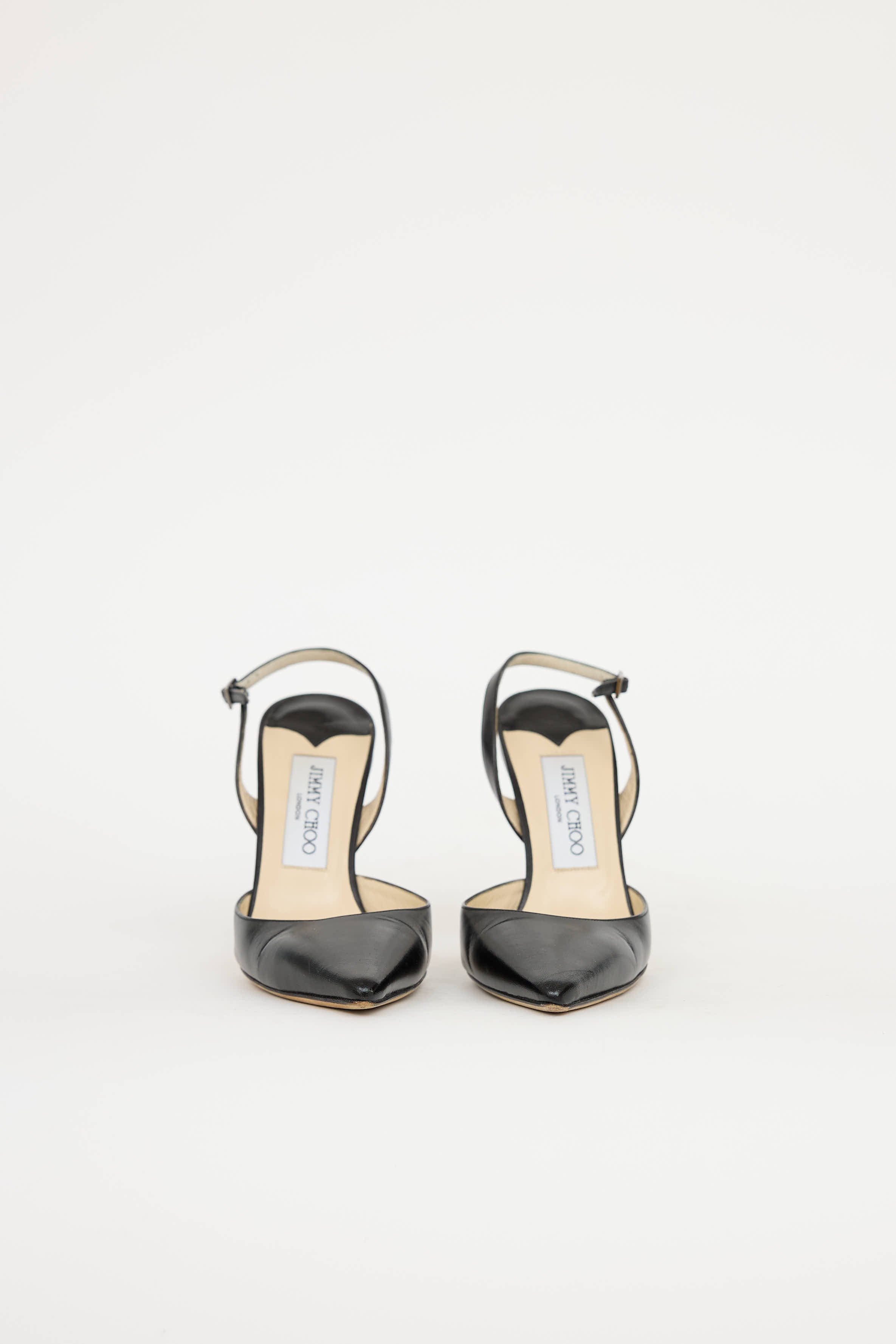 Pre-owned Jimmy Choo black leather Pointy slingback heel featuring a pointed toe, adjustable ankle strap, and wrapped stiletto heel.