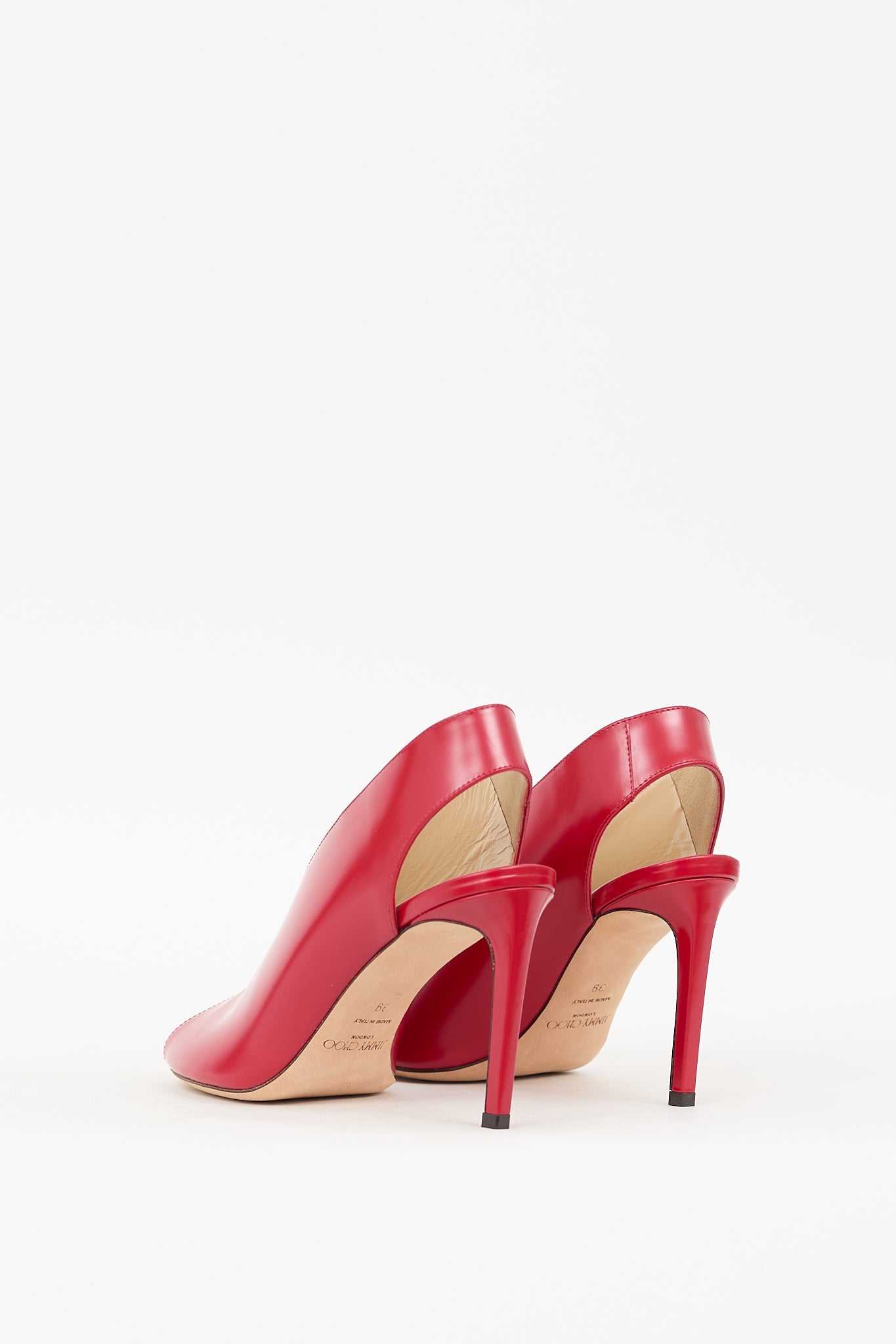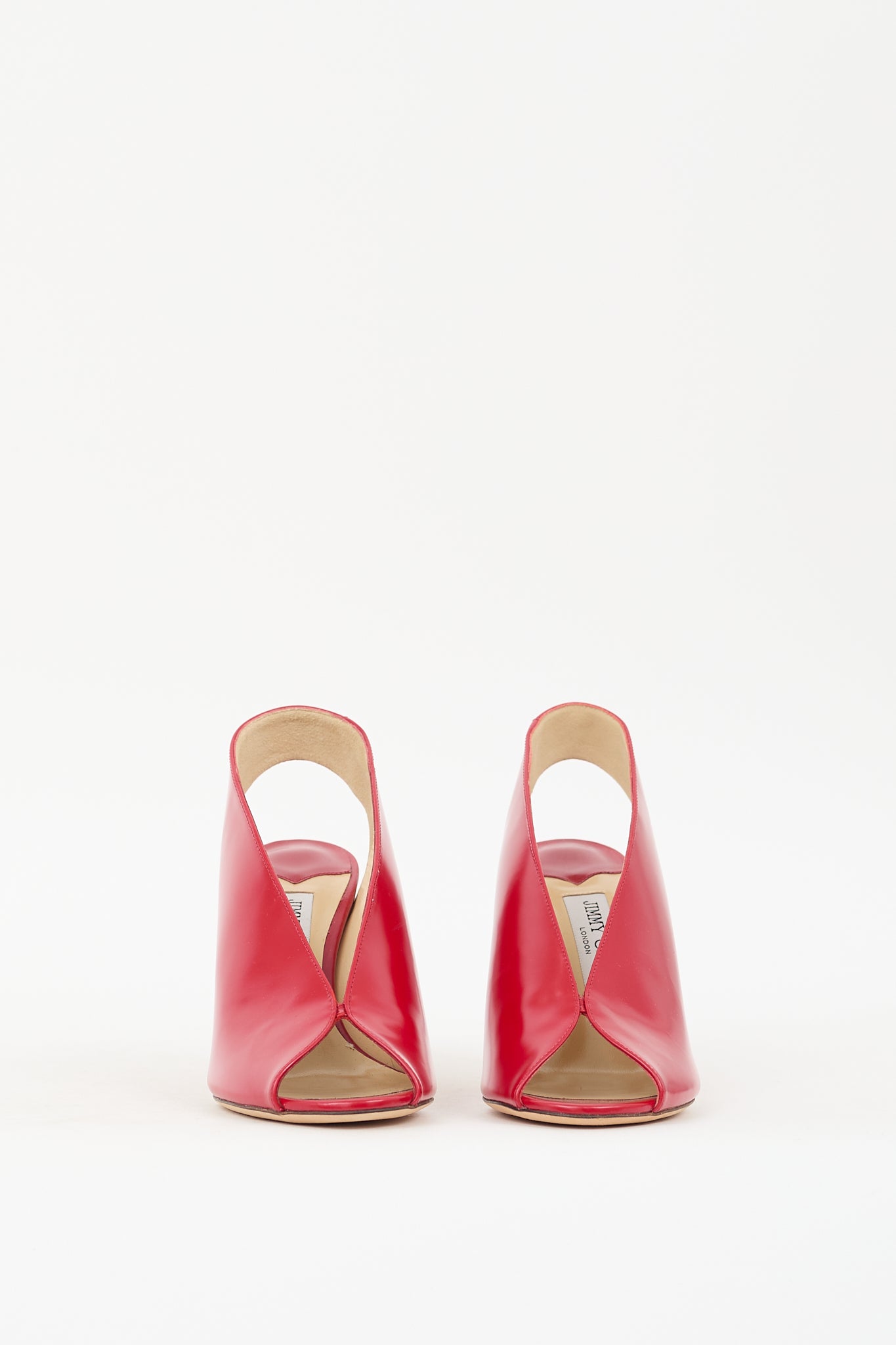 Pre-owned Jimmy Choo red leather Shar 85 pumps featuring rounded peep toe, split V topline, wide leather slingback strap and covered stiletto heel. Comes with original box and dust bag.