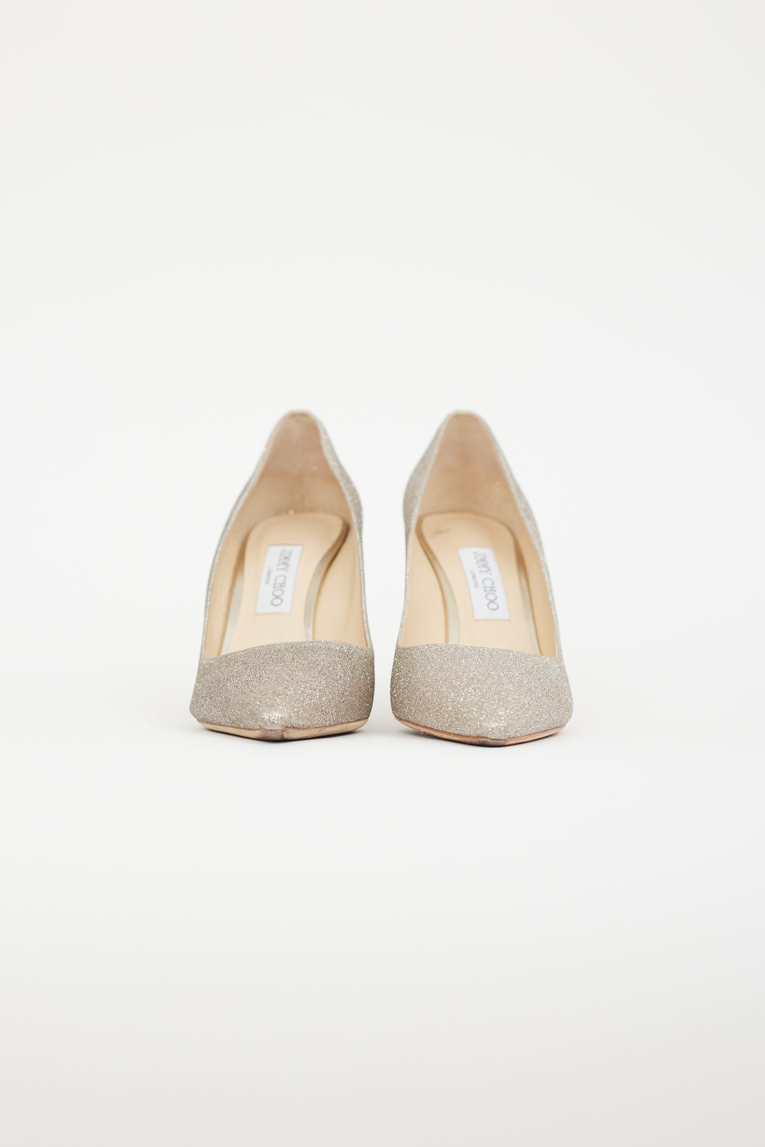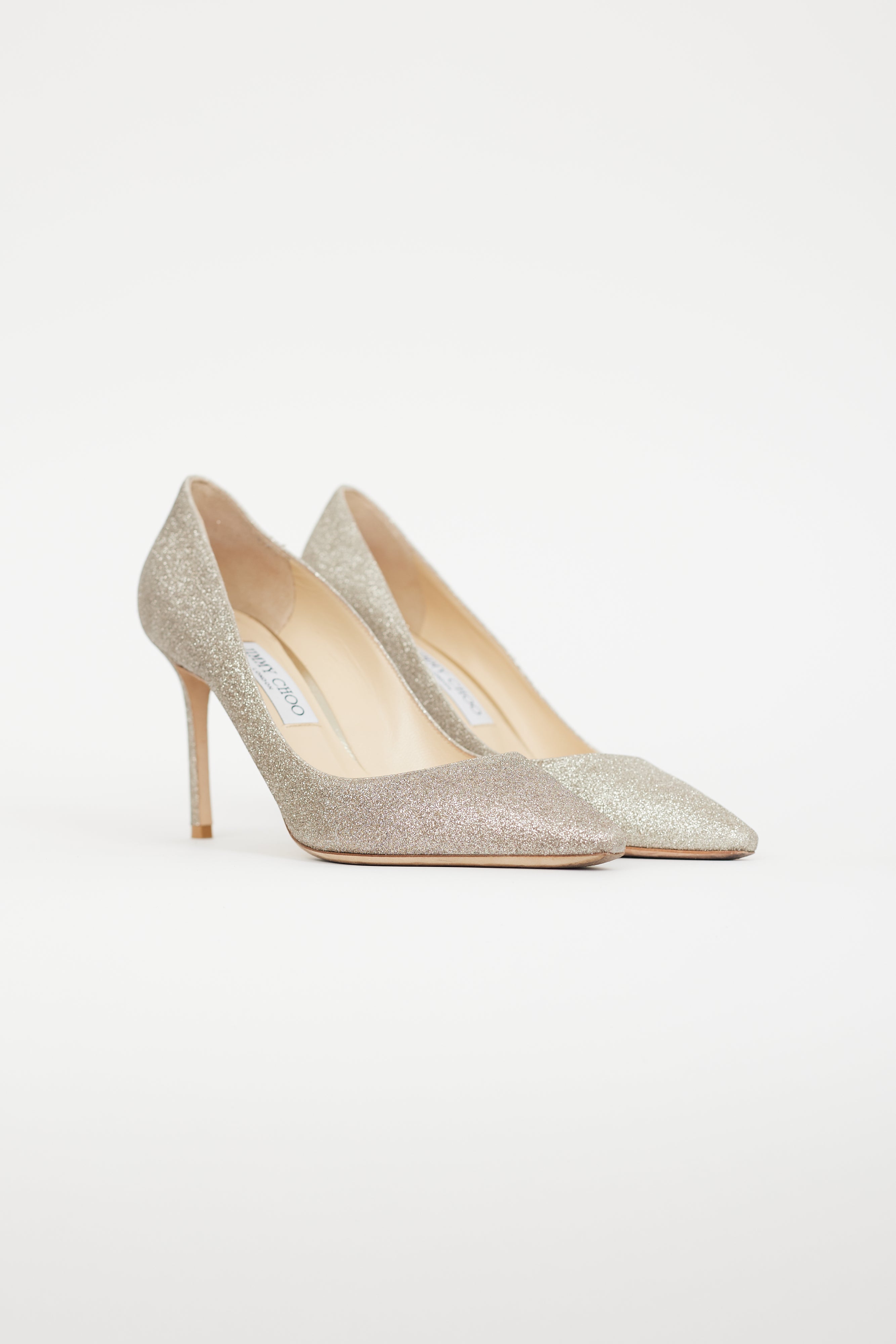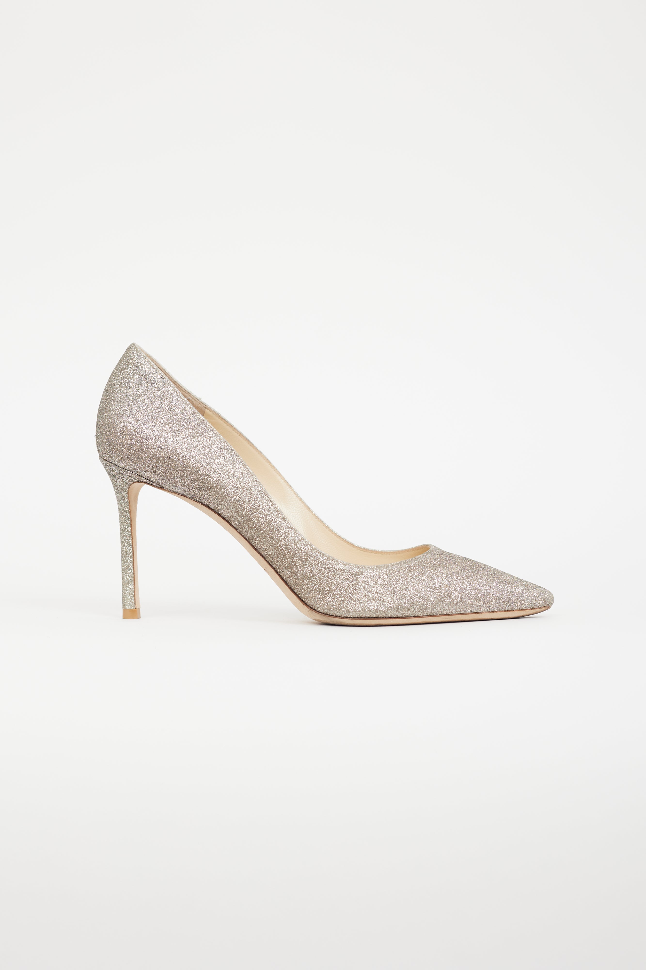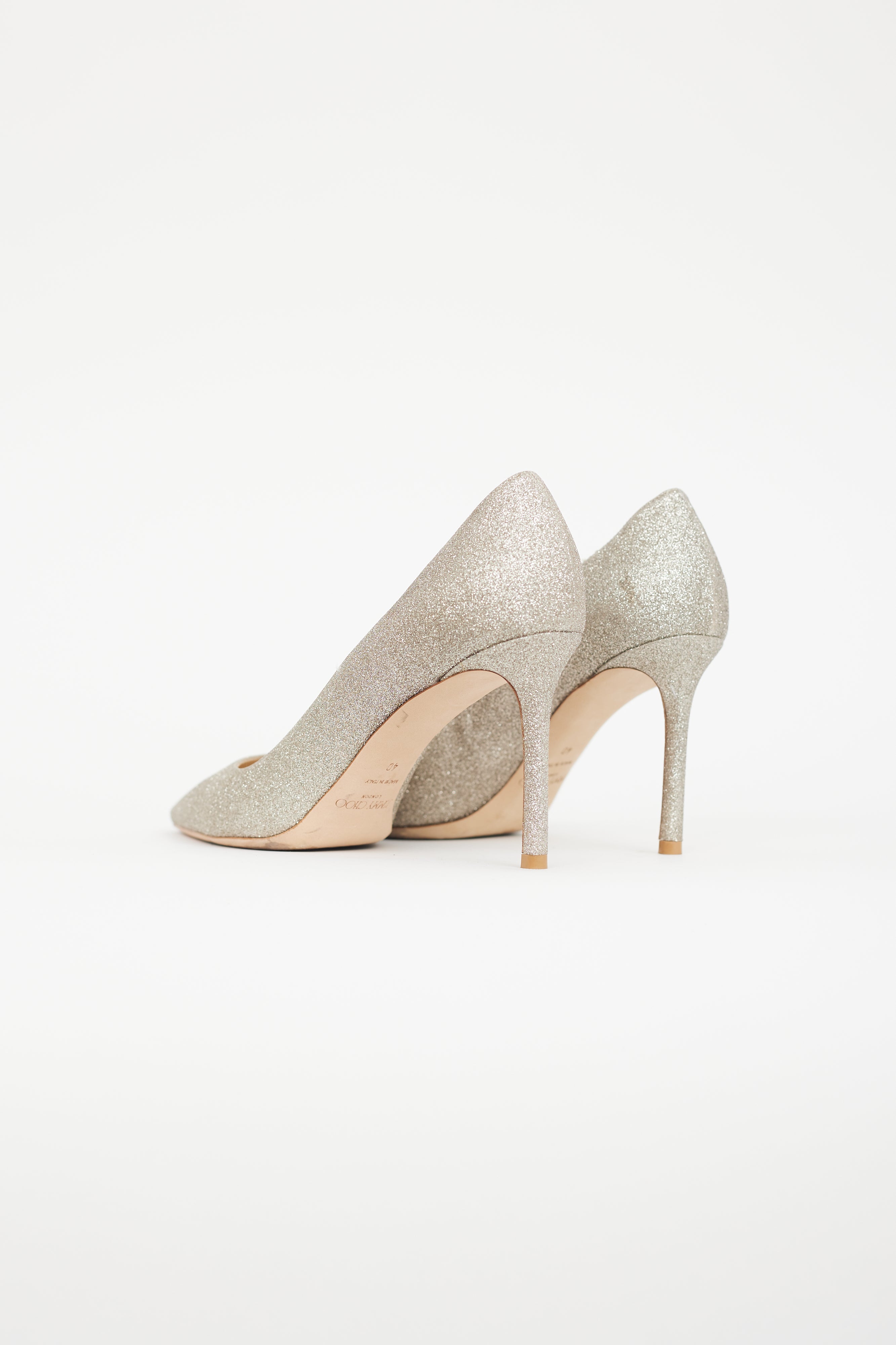 Pre-owned Jimmy Choo silver Romy 85 heels featuring glitter detailing throughout, pointed toe, and wrapped stiletto heel. Comes with original dust bag.