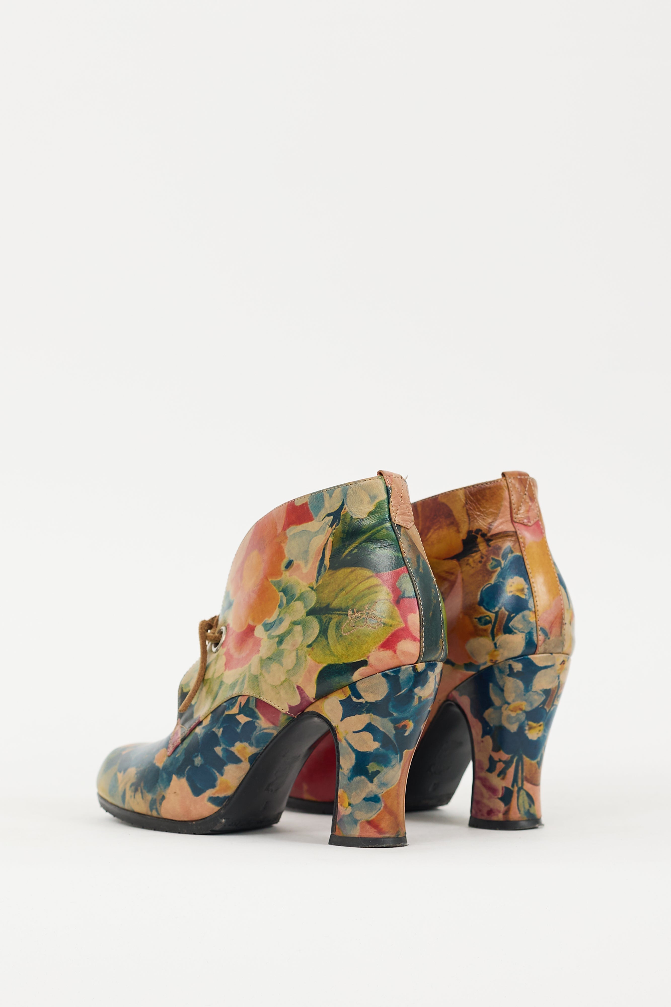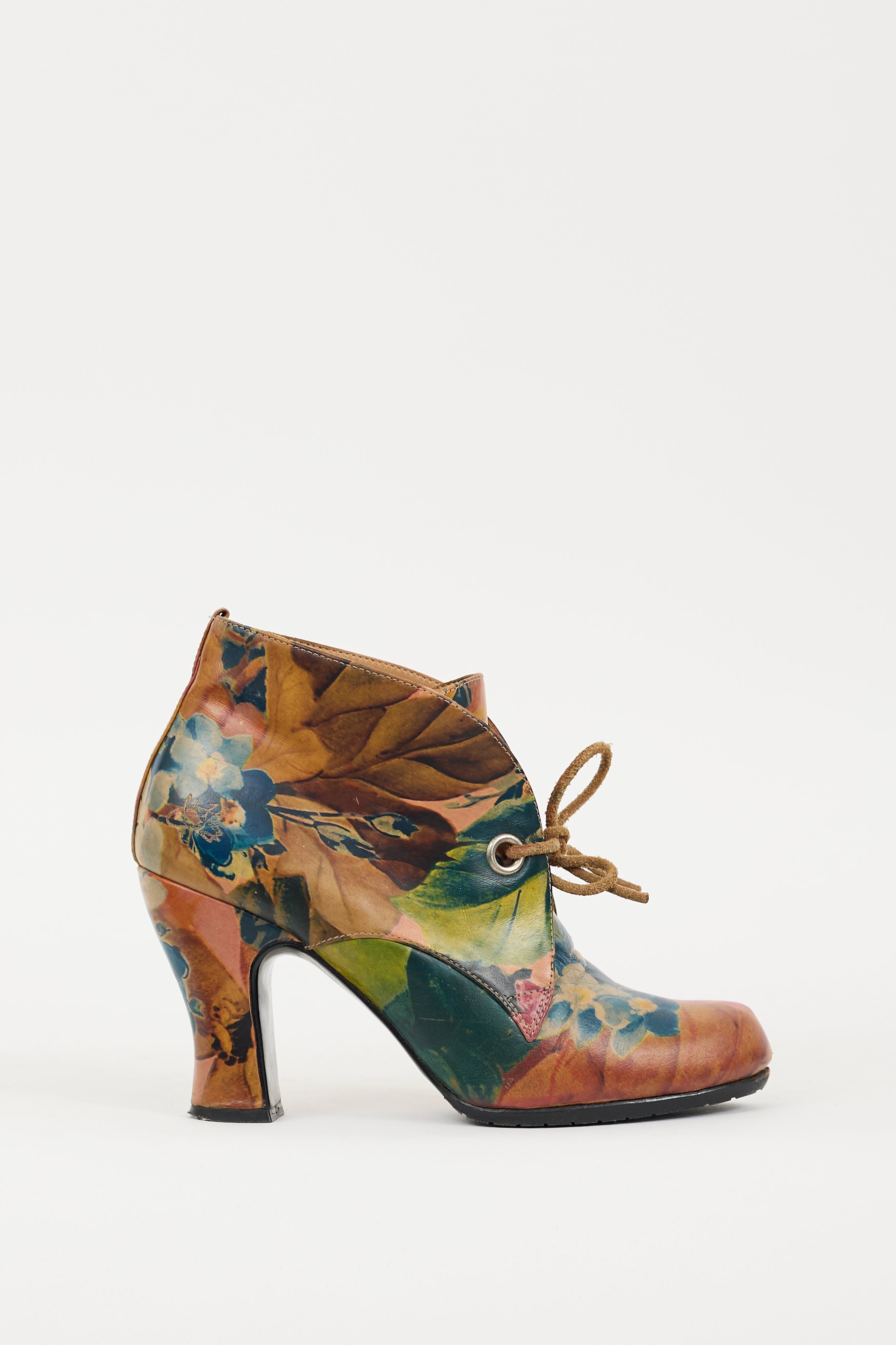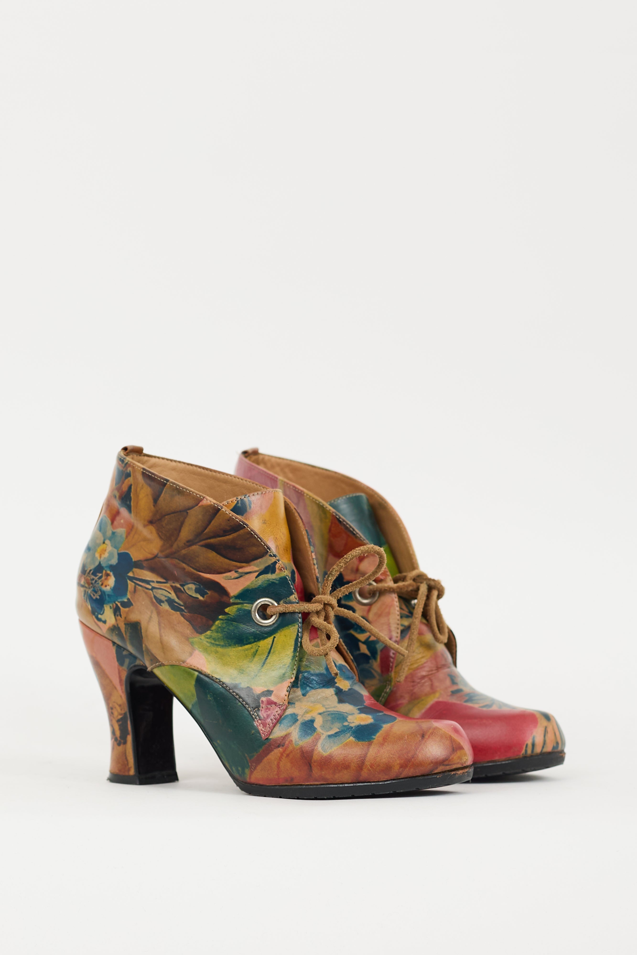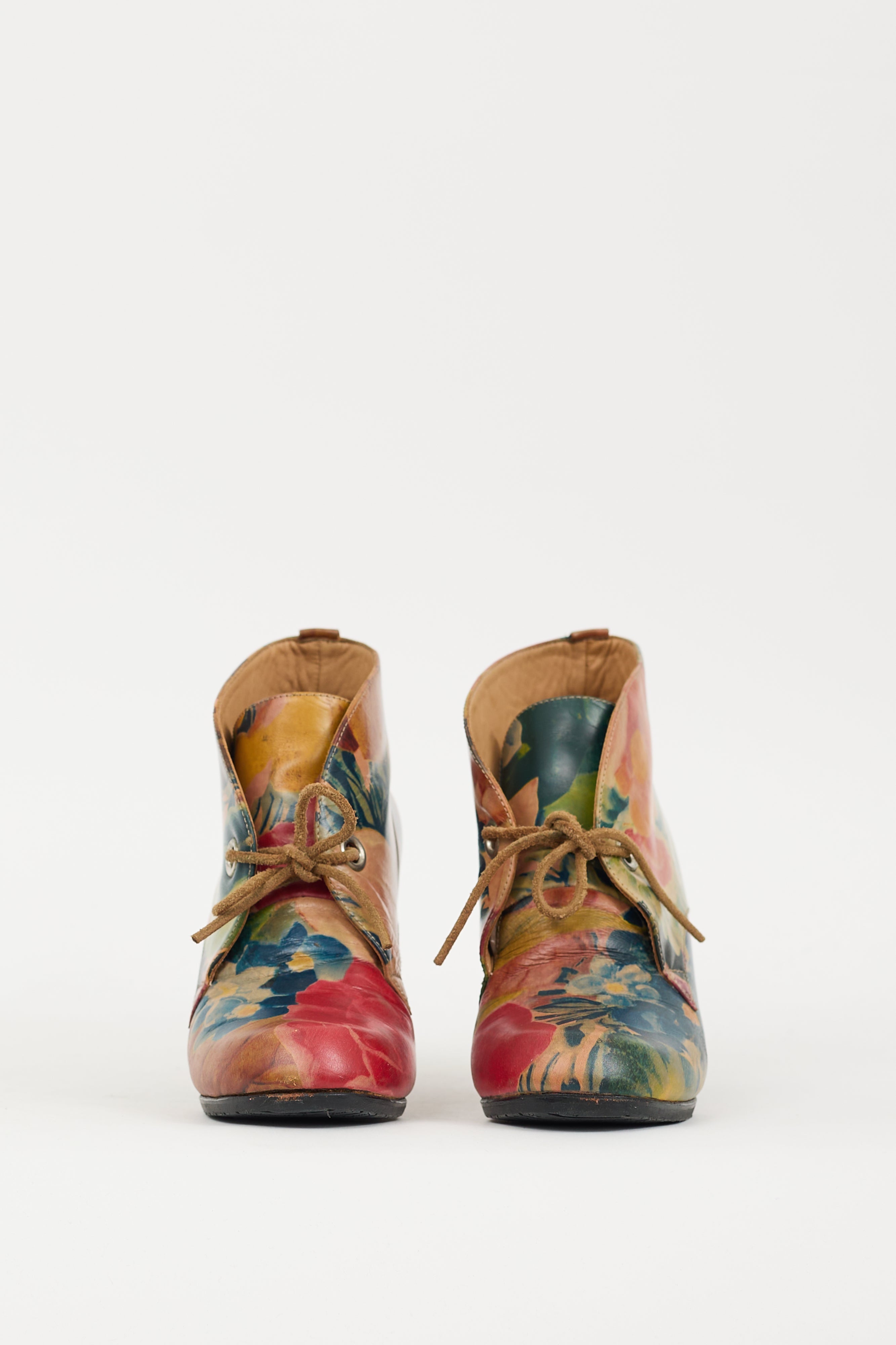 Pre-owned John Fluevog multicolour leather boots featuring floral print, rounded toe, lace up front, and covered block heel.